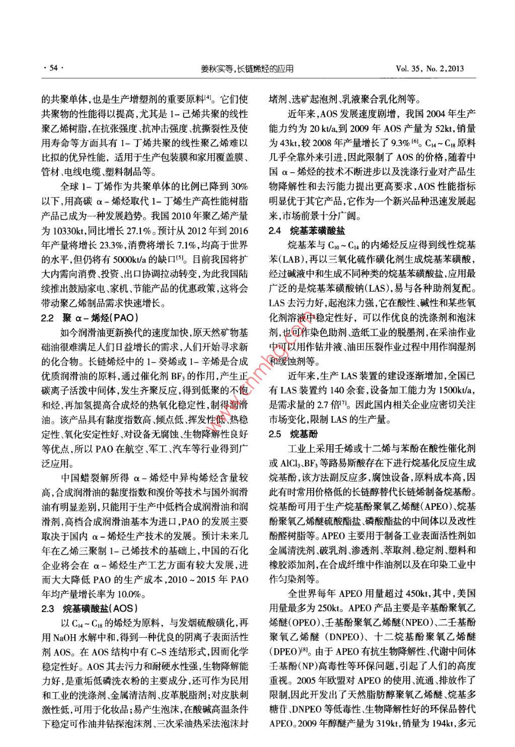 化學(xué)與黏合2013年第35卷第2期CHEMISTRY AND ADHESION●53●長(zhǎng)鏈烯烴的應(yīng)用*姜秋實(shí),趙萌,劉姝”(遼寧石油化工大學(xué),遼寧撫順113001)摘要:概述了長(zhǎng)鏈烯烴的生產(chǎn)工藝,石蠟裂解和低碳烯烴齊聚。詳述了長(zhǎng)鏈烯烴的應(yīng)用,可生產(chǎn)烯烴共聚體、潤(rùn)滑油、表面活性劑油田化學(xué)品等。通過對(duì)它們需求量和生產(chǎn)能力數(shù)據(jù)進(jìn)行分析,得出國(guó)內(nèi)外對(duì)長(zhǎng)鏈烯烴需求量日益增大,開發(fā)生產(chǎn)長(zhǎng)鏈烯烴具有重要意義。關(guān)鍵詞:長(zhǎng)鏈烯烴;應(yīng)用;生產(chǎn)工藝中圖分類號(hào):TQ 221.2文獻(xiàn)標(biāo)識(shí)碼:A文章編號(hào):1001-0017(2013)02-0053-04The Application of Long Chain OlefinsJIANG Qiu- shi, ZHAO Meng and IIU Shu(Liaoning SHIHUA Universily, Fushun 113001, China)Abstract:An overview of the production process of long chain olefins, parafn cracking and low - -carbon olefin oligomerization was given. Theapplications of long chain olefins were detailed, such as producing olefin copolymer, lubricants, surfactants and oil field chemicals, etc. Through thedata analysis of demand for long chain olefins and production capacity, it was concluded that the demand for long chain olefins at home and abroadwas increasing; the development and production of long chain olefins had a great significance.Key words: Long chain olefins; application; production process高純度1-辛烯,所以到目前為止,高純度1-辛烯產(chǎn)前言品的生產(chǎn)在國(guó)內(nèi)仍屬空白,必須依靠進(jìn)口解決。長(zhǎng)鏈烯烴(高碳烯烴)是指分子含有5個(gè)以上碳1長(zhǎng)鏈烯烴的工業(yè)生產(chǎn)原子和-個(gè)碳-碳雙鍵的脂肪族烴,其通式為C.H2"。根據(jù)雙鍵位置不同分為端烯( a -烯烴)和內(nèi)烯烴。長(zhǎng)獲得長(zhǎng)鏈烯烴的途徑有石蠟裂解、低碳烯烴齊鏈烯烴廣泛應(yīng)用于石油化工輕工紡織、冶金及醫(yī)藥、聚、烷烴脫氫工藝、烷烴催化裂解、煤化工抽提、烯烴農(nóng)藥等方面。二聚和歧化、內(nèi)烯烴異構(gòu)法等,工業(yè)上主要采用前兩2008年全球長(zhǎng)鏈烯烴總生產(chǎn)能力達(dá)到種方法。4384k/a,2009年達(dá)到4534kt/a,2010 年約為蠟裂解法通常以脫油的Cx~ Cxo或Cxo~Cao石蠟4914k/a,生產(chǎn)裝置主要集中在北美.歐洲、南非和日餾份為原料,也可采用含油蠟,在500 ~ 6009C下高溫本等發(fā)達(dá)國(guó)家和地區(qū)。目前長(zhǎng)鏈烯烴的消費(fèi)市場(chǎng)同樣裂解,自由基反應(yīng),靠C- C鏈的斷裂產(chǎn)生鏈的引發(fā)集中在北美、西歐等發(fā)達(dá)地區(qū),例如北美市場(chǎng),2006產(chǎn)物,得到Co~ Cxo烯烴。年線性a -烯烴的消費(fèi)量為1595kt, 到2011年增長(zhǎng)低碳烯烴齊聚生產(chǎn)長(zhǎng)鏈烯烴,具有線性程度高、到1825kt2。碳數(shù)分布窄、產(chǎn)品質(zhì)量好及分離費(fèi)用低等優(yōu)點(diǎn),產(chǎn)品.目前,我國(guó)生產(chǎn)長(zhǎng)鏈烯烴的裝置較少,現(xiàn)主要分是Ca~ Cxo含偶數(shù)碳的烯烴。布于中國(guó)石化燕山分公司(5.2k/a, 1-己烯)和中國(guó)石油大慶石化分公司(0.5kt/a,1-己烯)B。2007 年6月2長(zhǎng)鏈烯烴的應(yīng)用在燕山石化開車成功,打破了國(guó)外對(duì)1-己烯的市場(chǎng)壟斷的境況,2008年10月,大慶石化應(yīng)用此技術(shù)建2.1聚乙烯共聚單體設(shè)的0.5kt/a 1-己烯工業(yè)試驗(yàn)裝置投料試車,同年11長(zhǎng)鏈烯烴中1-己烯和1-辛烯,是生產(chǎn)線性低月生產(chǎn)出高純度的優(yōu)質(zhì)1-己烯。由于蠟裂解得不到密度聚乙烯(LLDPE)和高密度聚乙烯(HDPE)中重要收稿日期:2012-11-07*基金項(xiàng)目:遼寧省重大科技計(jì)劃項(xiàng)目,Co烯烴疊合生產(chǎn)高碳烯烴關(guān)鍵技術(shù)開發(fā)(編號(hào):201106180)。作者簡(jiǎn)介:姜秋實(shí)(1986-),女,遼寧撫順人,碩士研究生,研究方向?yàn)橄N齊聚。**通訊聯(lián)系人.●54.姜秋實(shí)等,長(zhǎng)鏈烯烴的應(yīng)用Vol. 35, No. 2,2013的共聚單體,也是生產(chǎn)增塑劑的重要原料[4。它們使堵劑、選礦起泡劑乳液聚合乳化劑等。共聚物的性能得以提高,尤其是1-己烯共聚的線性近年來,A0S發(fā)展速度劇增,我國(guó)2004年生產(chǎn)聚乙烯樹脂,在抗張強(qiáng)度、抗沖擊強(qiáng)度抗撕裂性及使能力約為20 kVa,到2009年AOS產(chǎn)量為52kt,銷量用壽命等方面具有1-丁烯共聚的線性聚乙烯難以為43kt,較2008年產(chǎn)量增長(zhǎng)了9.3% 161。Cu~ C1g原料比擬的優(yōu)異性能,適用于生產(chǎn)包裝膜和家用覆蓋膜、幾乎全靠外來引進(jìn),因此限制了AOS的價(jià)格,隨著中管材.電線電纜、塑料制品等。國(guó)a-烯烴的技術(shù)不斷進(jìn)步以及洗滌行業(yè)對(duì)產(chǎn)品生全球1-丁烯作為共聚單體的比例已降到30%物降解性和去污能力提出更高要求,AOS性能指標(biāo)以下,用高碳x-烯烴取代1-丁烯生產(chǎn)高性能樹脂明顯優(yōu)于其它產(chǎn)品,它作為一個(gè)新興品種迅速發(fā)展起產(chǎn)品已成為-種發(fā)展趨勢(shì)。我國(guó)2010年聚乙烯產(chǎn)量來,市場(chǎng)前景十分廣闊。為10330kt,同比增長(zhǎng)27.1%。預(yù)計(jì)從2012年到20162.4 烷基苯磺酸鹽年產(chǎn)量將增長(zhǎng)23.3%,消費(fèi)將增長(zhǎng)7.1% ,均高于世界烷基苯與Cro~ C14的內(nèi)烯烴反應(yīng)得到線性烷基的水平,但仍將有5000kt/a 的缺口(5。目前我國(guó)將擴(kuò)苯(LAB),再以三氧化硫作磺化劑生成烷基
