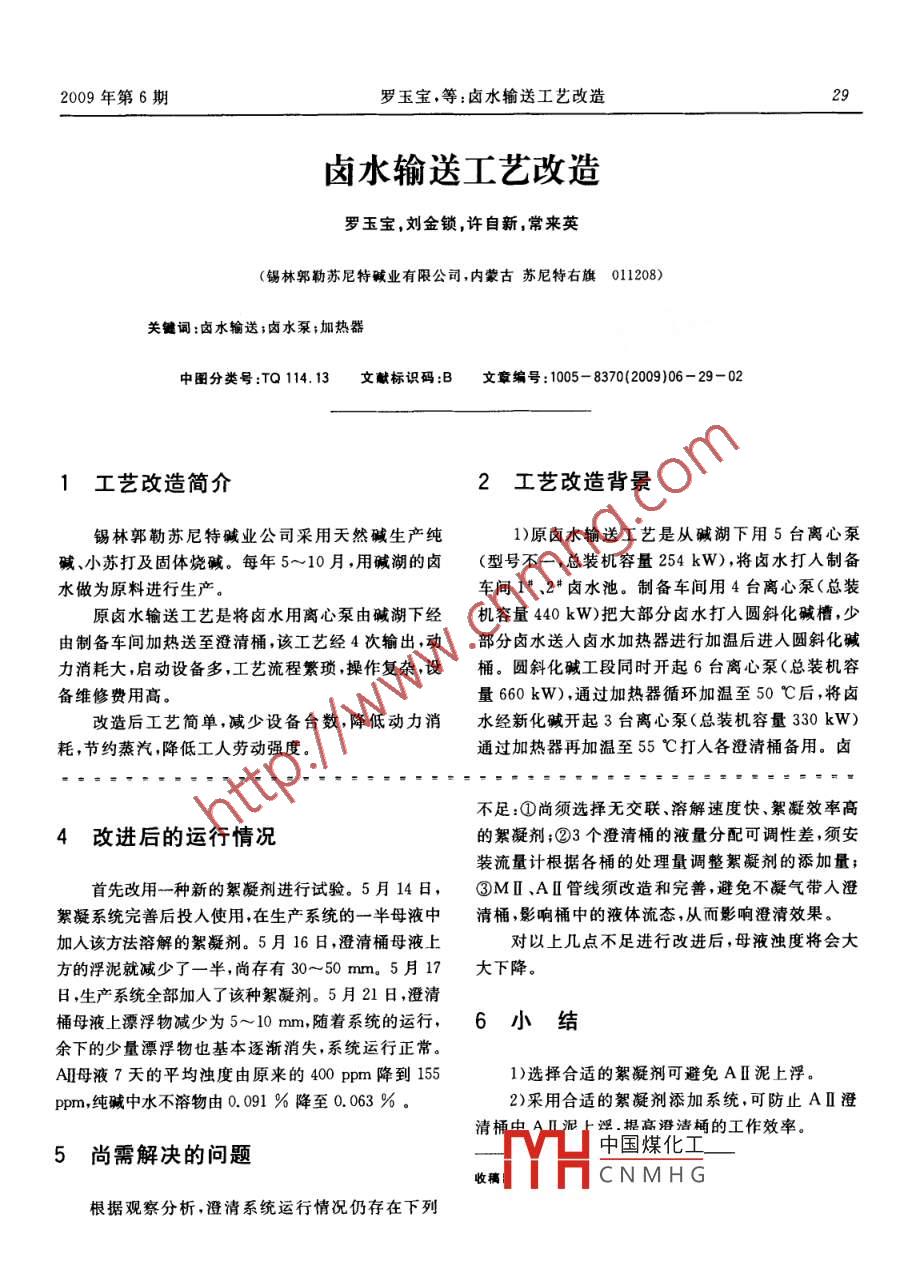 2009年第6期羅玉寶,等:鹵水輸送工藝改造鹵水輸送工藝改造羅玉寶,劉金鎖,許自新,常來英(錫林郭勒蘇尼特堿業(yè)有限公司,內(nèi)蒙古蘇尼特右旗011208)關鍵詞:鹵水輸送;鹵水泵;加熱器圖分類號:TQ114.13文獻標識碼:B文章編號:1005-8370(2009)06-29-021工藝改造簡介2工藝改造背景錫林郭勒蘇尼特堿業(yè)公司采用天然堿生產(chǎn)純1)原鹵水輸送工藝是從堿湖下用5臺離心泵堿、小蘇打及固體燒堿。每年5~10月,用堿湖的鹵(型號不一,總裝機容量254kW),將鹵水打入制備水做為原料進行生產(chǎn)車間1*、2*鹵水池。制備車間用4臺離心泵(總裝原鹵水輸送工藝是將鹵水用離心泵由堿湖下經(jīng)機容量440kW把大部分鹵水打入圓斜化堿槽,少由制備車間加熱送至澄清桶,該工藝經(jīng)4次輸出,動部分鹵水送入鹵水加熱器進行加溫后進入圓斜化堿力消耗大,啟動設備多,工藝流程繁瑣操作復雜,設桶。圓斜化堿工段同時開起6臺離心泵(總裝機容備維修費用高。量660kW),通過加熱器循環(huán)加溫至50℃后,將鹵改造后工藝簡單,減少設備臺數(shù),降低動力消水經(jīng)新化堿開起3臺離心泵(總裝機容量330kW)耗,節(jié)約蒸汽,降低工人勞動強度通過加熱器再加溫至55℃打入各澄清桶備用。鹵不足:①尚須選擇無交聯(lián)、溶解速度快、絮凝效率高4改進后的運行情況的絮凝劑;②3個澄清桶的液量分配可調(diào)性差,須安裝流量計根據(jù)各桶的處理量調(diào)整絮凝劑的添加量首先改用一種新的絮凝劑進行試驗。5月14日,③MⅢ、AⅡ管線須改造和完善,避免不凝氣帶人澄絮凝系統(tǒng)完善后投入使用在生產(chǎn)系統(tǒng)的一半母液中清桶影響桶中的液體流態(tài),從而影響澄清效果。加入該方法溶解的絮凝劑。5月16日,澄清桶母液上對以上幾點不足進行改進后,母液濁度將會大方的浮泥就減少了一半,尚存有30~50mm。5月17大下降。日,生產(chǎn)系統(tǒng)全部加入了該種絮凝劑。5月21日,澄清桶母液上漂浮物減少為5~10mm,隨著系統(tǒng)的運行,6小結(jié)余下的少量漂浮物也基本逐漸消失,系統(tǒng)運行正常。A母液7天的平均濁度由原來的400ppm降到1551)選擇合適的絮凝劑可避免AⅡ泥上浮。ppm,純堿中水不溶物由0.091%降至0.063%。2)采用合適的絮凝劑添加系統(tǒng),可防止AⅡ澄清桶中淫.提高澄潛桶的工作效率5尚需解決的問題中國煤化工收稿CNMHG根據(jù)觀察分析,澄清系統(tǒng)運行情況仍存在下列30純堿工業(yè)水從堿湖下輸送至制備車間澄清桶用泵總裝機容量逐漸增高,為提高鹵水濃度及溫度,采取深層取液方1684kW,動力消耗大。式,這樣不僅可減少結(jié)晶造成泵的流量降低,還可延2)原工藝用生蒸汽通過預熱器加溫鹵水,蒸汽長鹵水使用周期,延長天然堿礦石資源服務年限。消耗大:鹵水通過圓斜化堿鹵水預熱器(300m3/h左右)用蒸汽加溫后進入化堿桶。預熱后的鹵水用生4技術(shù)改造應用情況蒸汽通過圓斜化堿2組、新化堿1組加熱器加溫,消耗蒸汽總量100t/h,將鹵水從10℃提高至55℃。2007年,對鹵水輸送工藝進行技術(shù)改造后經(jīng)過3)原工藝堿湖下鹵水泵由于受當時條件所限,1年多的運行,結(jié)果如下:使用干燥尾汽余熱加溫,泵體安裝高于鹵水池,泵進口管上安裝底閥,在氣溫能夠?qū)Ⅺu水溫度由原來的15℃提高到25℃,通過較低時,鹵水在底閥上結(jié)晶堵塞,制約鹵水的供應串聯(lián)3組加熱器可將鹵水溫度提高到55℃,鹵水流量量能夠達到900m3/h,完全可以滿足生產(chǎn)要求,使用回收尾汽對鹵水進行加溫的工藝,節(jié)約蒸汽1.83技術(shù)改造內(nèi)容萬t,節(jié)約了煤耗同時減少CO2排放。使用DFSS200-520(1)A泵后,每年可節(jié)約用1)設備選型:原工藝所用離心泵屬渣漿泵,效率電393萬kW·h,同時減少CO2排放。每年減少設低、動力消耗大并且揚程低,采用多級遞提使用,造備維修費用50萬元成工序繁多,操作復雜,設備數(shù)量多。如將鹵水泵的改造后,增加生產(chǎn)冷凝水回收量,緩解了以往熱流量和揚程提高,滿足鹵水的使用量及澄清桶至堿電車間生產(chǎn)用水緊張的局面。湖落差,直接將鹵水從堿湖輸送至澄清桶,既可減少設備用量,又可節(jié)約用電量。5經(jīng)濟效益和社會效益經(jīng)過多方考查,選用3臺DFSS200-520(1)A泵(開2備1),此泵流量為606m3/h,揚程71m,電工藝改造后,按鹵水每年夏季使用6個月(有效機200kW,總裝機容量400kW安裝在堿湖下。用生產(chǎn)且按150天計),每度電0.36元,操作工月工資改造后的泵把鹵水從鹵水池直接打入制備車間加熱1000元/人計器(串聯(lián)4組將溫度提高到55℃)后進入澄清桶。節(jié)電:(1684-400)×85%X24×150×0.36由原來18臺泵運行改為2臺泵運行,功率由1684=141萬元/akW,改為400kW,改造后由每班8名操作工減少至節(jié)蒸汽:5×24×150×60=108萬元/a每班2名人員工資:(8-2)×4×1000×6=14.4萬元/a2)鹵水預熱器改造后,采用化堿3組加熱器的減少維修費用:50萬元尾汽為熱源對鹵水進行預熱。然后串聯(lián)化堿3組加當年效益合計:313.4萬元/a熱器,將鹵水溫度提到55℃。耗汽總量為95t/h而且在節(jié)電、節(jié)汽的同時,減少了CO2排放,延較改造前可節(jié)約蒸汽5t/h長了天然堿資源的服務年限。3)將泵安裝于低于鹵水液面高度,降低泵吸入口的高度,鹵水池中鹵水濃度及溫度分布至上而下收稿日期:208-12-18專利名稱:一種新型制堿用的結(jié)晶器本發(fā)明公開了一種新型制堿用的結(jié)晶器,它包專利
