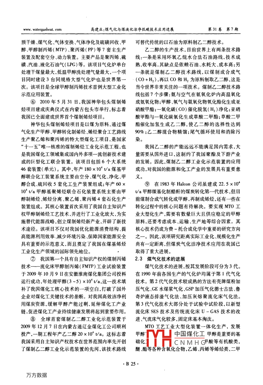 第31卷第7期煤氣與熱力Vol.31 No.7 .2011年7月CAS & HEATJul. 2011煤氣化與煤液化潔凈低碳技術(shù)應(yīng)用進(jìn)展高建業(yè)(沙鋼集團(tuán)沙桐化學(xué)有限公司,江蘇泰興225400)摘要:論述了煤氣化、煤液化、一碳化學(xué)等潔凈煤技術(shù)的開發(fā)與應(yīng)用的進(jìn)展,探討了發(fā)展方向。關(guān)鍵詞:煤液化; 煤氣化; - -碳化學(xué);煤炭轉(zhuǎn)化; 潔凈煤技術(shù)中圖分類號(hào): TU996文獻(xiàn)標(biāo)識(shí)碼: B文章編號(hào): 1000 - 4416(2011)07 -0B22 -06Application Progress in Low Carbon Technologies: CoalGasification and Coal LiquefactionGAO JianyeAbstract: The development and application of clean coal technologies, such as coal gasification,coal liquefaction and C chemistry are described. Their development directions are discussed.Key words: coal liquefaction; coal gasification; C chemisty; coal conversion; clean coaltechnology從20世紀(jì)70年代中期開始,世界石油能源緊產(chǎn)中起的作用很有限,只有少量的脂肪族化合物以張,供不應(yīng)求,價(jià)格飚升猛漲。30年間石油價(jià)格由石油化學(xué)原料生產(chǎn)。1925 年,美國(guó)生產(chǎn)的這些化合每桶10余美元漲至2008年的每桶140美元。從20物中,以石油為原料的部分只占0.1%。世紀(jì)80年代初,各國(guó)政府和專家就以新的觀點(diǎn)來評(píng)當(dāng)前,世界上礦物質(zhì)燃料儲(chǔ)量與消費(fèi)量之間比價(jià)煤作為化工原料和能源的重要性。煤炭對(duì)于“貧例失調(diào)。全球年均石油消費(fèi)量約286.16x10*桶/油、少氣、富煤”的中國(guó)而言,是主要的化石能源。年,大大超過了每年發(fā)現(xiàn)的儲(chǔ)量,開采速度與消費(fèi)量隨著社會(huì)經(jīng)濟(jì)持續(xù)高速發(fā)展,全球?qū)μ娲ぴ霞芭c每年發(fā)現(xiàn)的儲(chǔ)量之間不相適應(yīng),下世紀(jì)可能導(dǎo)和替代能源的需求越發(fā)迫切,節(jié)能減排是大勢(shì)所致石油和天然氣耗用殆盡。目前,西方國(guó)家正面臨趨1-5)。使用潔凈煤技術(shù)生產(chǎn)的煤化工產(chǎn)品不僅成著必須采用其他能源(煤能源或燃料乙醇等)來代本相對(duì)較低,而且對(duì)于中國(guó)減輕燃煤造成的環(huán)境污替正在廣泛應(yīng)用的石油能源的問題。染,降低中國(guó)對(duì)進(jìn)口石油的依賴有著重大意義。地球上煤的總儲(chǔ)量(按能量計(jì))大約超過石油潔凈煤技術(shù)是指煤炭從開發(fā)到利用全過程中,儲(chǔ)量的 20倍,在1985年時(shí)估計(jì)約有I1.5x10”t標(biāo)旨在減少污染排放與提高利用效率的加工、燃燒、轉(zhuǎn)準(zhǔn)燃料,按當(dāng)時(shí)開采水平,預(yù)計(jì)地球儲(chǔ)藏的煤可供開化及污染控制等高新技術(shù)的總稱。利用潔凈煤技術(shù)采450年,天然氣為50年,石油為45年。2009年初生產(chǎn)化工產(chǎn)品及工農(nóng)業(yè)用原材料,受到廣泛重視。英國(guó)石油公司( BP)發(fā)表的報(bào)告指出:2008年中國(guó)本文從煤氣化技術(shù)和煤液化技術(shù)進(jìn)行分析。的煤炭消費(fèi)占世界煤炭總消費(fèi)的43% ,是世界各國(guó)1從長(zhǎng)遠(yuǎn)來看煤是最可靠的化工原料燃料消“中國(guó)煤化工某炭消費(fèi)加快的速度估E指出,目前世界150年前,有機(jī)化學(xué)曾經(jīng)就是煤炭化學(xué)。第二已探明THCNM.H蒲,按2008年的次世界大戰(zhàn)前,石油化學(xué)原料在有機(jī)化學(xué)產(chǎn)品的生產(chǎn)量或年均石油消費(fèi)量計(jì)算夠用43年,天然氣夠用.B 22.www. watergasheat. corm高建業(yè):煤氣化與煤液化潔凈低碳技術(shù)應(yīng)用進(jìn)展第31卷第7期60年。但從宏觀看,石油開采技術(shù)不斷進(jìn)步,將會(huì)醇,再經(jīng)甲醇制烯烴的潔凈煤技術(shù)的工藝路線正引大幅提高油田產(chǎn)量,而勘探技術(shù)的進(jìn)步又會(huì)發(fā)現(xiàn)更起國(guó)內(nèi)外越來越多專家和企業(yè)家的興趣。多的石油儲(chǔ)量。2.2.1水煤漿 氣化技術(shù)應(yīng)用我國(guó)是天然氣需求增長(zhǎng)最快的國(guó)家,中國(guó)天然①九五期間 ,兗礦集團(tuán)與國(guó)內(nèi)高校、科研機(jī)構(gòu)氣2008年消費(fèi)增長(zhǎng)了15. 8%。資料顯示,我國(guó)探合作,開發(fā)完成了規(guī)模為22 Vd的多噴嘴水煤漿氣明的天然氣儲(chǔ)量不足世界總量的1%,預(yù)測(cè)2020年化爐中試裝置,并進(jìn)行了考核試驗(yàn)。結(jié)果表明:有效天然氣消費(fèi),缺口為(400-600) x10* m/a。目前氣體質(zhì)量分?jǐn)?shù)達(dá)83%,碳轉(zhuǎn)化率>98%,分別比相我國(guó)天然氣供應(yīng)也比較緊張。同條件下的德士古生產(chǎn)裝置高1.5% ~ 2.0%、煤的儲(chǔ)量可以滿足下一世紀(jì)對(duì)煤炭增加的需2.0% ~3. 0% ;煤耗、氧耗均比德士古法低7%。該要,潛力很大。資料顯示,我國(guó)已探明煤炭?jī)?chǔ)量達(dá)成果標(biāo)志中國(guó)自主開發(fā)的先進(jìn)氣化技術(shù)取得突破性10405 x10* t。2008年我國(guó)煤炭產(chǎn)量達(dá)28x10*t,進(jìn)展。煤炭在能源結(jié)構(gòu)中比例占70%以上。2009 年我國(guó)②南京化學(xué)工業(yè)園區(qū)某公司以EM +PC模式對(duì)進(jìn)口石油的依賴度達(dá)到51.3%。因此,從長(zhǎng)遠(yuǎn)來(EP為設(shè)計(jì)、采購(gòu)總承包,PC為采購(gòu)、施工總承包),看,煤是最可靠的能源基礎(chǔ)和化工原料。從煤中可采用GE水煤漿加壓氣化技術(shù)及Linde低溫甲醇洗以制取幾乎所有必要的有機(j