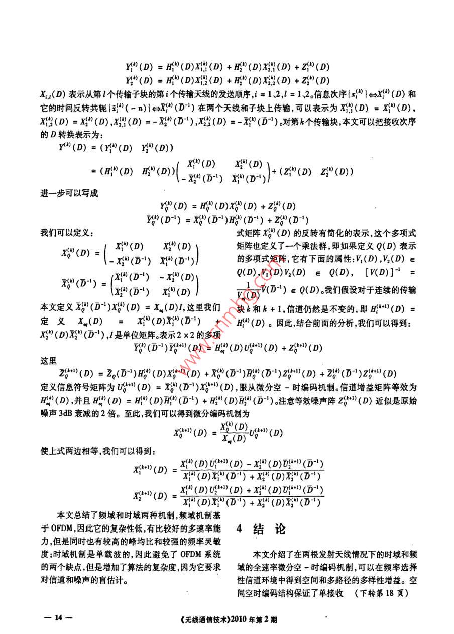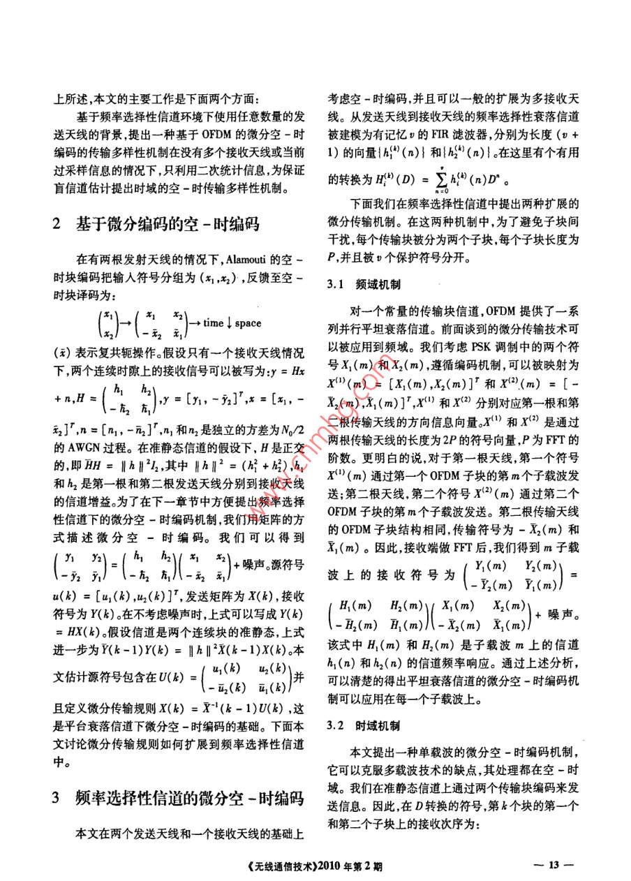 淺析頻率選擇性信道中的微分空時(shí)編碼張延(西北政法大學(xué)信息網(wǎng)絡(luò)中心,西安710063)摘要:本文介紹了兩種空-時(shí)傳輸機(jī)制,通過(guò)在頻率選擇性衰落信道上使用兩根傳輸天線,來(lái)得到全速率和全分集非相干性。第一種機(jī)制結(jié)合了頻域的OFDM微分空一時(shí)分組編瑪;第二種機(jī)制采用微分反時(shí)空-時(shí)分組編碼,這樣可以保證在不需要當(dāng)前過(guò)采樣或多根接收天線的情況下保證盲信道估計(jì)。關(guān)鍵詞:盲估計(jì);微分空時(shí)編碼;衰落信道;碼間干擾;多天線編碼中圖分類(lèi)號(hào):TN91.22文獻(xiàn)標(biāo)識(shí)碼:A文章編號(hào):1003-8329(2010)02001203Discussion on Differential Space-Time Coding in Frequency-Selective ChannelsZHANG TiNetwork Information Center, Nothwest University of Politics& Law, Xian 710063, China)Abstract This paper introduces two space-time transmission schemes which allow full -rate andfull-diversity noncoherent communications using two transmit antennas over fading frequency-se-lective channels. The first scheme operates in the frequency domain where it combines differentialAlamouti space-time block-coding(STBC)with OFDM. The second scheme operates in the timedomain and employs differential time-reversal STBC to guarantee blind channel identifiability with-out the need for temporal oversampling or multiple receive antennasKey words: blind identification; differential space-time coding; fading channels; intersymbol in-terference: multiple antenna coin以前的相關(guān)工作主要是在平坦衰落環(huán)境下考察1概述兩根或更多天線的微分空一時(shí)編碼機(jī)制、分組的微分編碼機(jī)制,以及頻率選擇性信道下的相干的空空時(shí)編碼因?yàn)槠湓跓o(wú)線通信中極大的提高了傳時(shí)編碼機(jī)制。本文主要是針對(duì)任意數(shù)量傳輸天線和輸速率所以得到了廣泛的關(guān)注。在頻率選擇性信頻率選擇性信道環(huán)境下的微分空-時(shí)編碼道上使用N個(gè)發(fā)送天線和M個(gè)接收天線需要被盲估計(jì)技術(shù)能夠消除傳輸中的訓(xùn)練符號(hào)。只基估計(jì)的信道參數(shù)有MM(v+1),是有限脈沖響應(yīng)信于沒(méi)有多個(gè)接收天線二次統(tǒng)計(jì)信息的FIR信道的估道階數(shù)的上界。高階的頻率訓(xùn)練伴隨著信道估計(jì)的計(jì)是不可能的,因?yàn)閬G失了相位信息。本文提出的成本增加以及在快速時(shí)變環(huán)境中訓(xùn)練質(zhì)量的下降,微分空-時(shí)編碼使基于只使用符號(hào)空間采樣的單接因此非相干的機(jī)制需要轉(zhuǎn)換。收天線的二次統(tǒng)計(jì)信息的盲信道估計(jì)變得可能。綜·作者簡(jiǎn)介:張題(1981-)男陜西西安人,在職研究生西北政法大學(xué)信息網(wǎng)絡(luò)中心網(wǎng)絡(luò)實(shí)驗(yàn)管理員主要研究方向?yàn)闊o(wú)線通信,計(jì)算機(jī)網(wǎng)絡(luò)?!稛o(wú)線通信技術(shù)》2010年第2期上所述,本文的主要工作是下面兩個(gè)方面:考慮空-時(shí)編碼,并且可以一般的擴(kuò)展為多接收天基于頻率選擇性信道環(huán)境下使用任意數(shù)量的發(fā)線。從發(fā)送天線到接收天線的頻率選擇性衰落信道送天線的背景提出一種基于OFDM的微分空-時(shí)被建模為有記憶u的FIR濾波器,分別為長(zhǎng)度(編碼的傳輸多樣性機(jī)制在沒(méi)有多個(gè)接收天線或當(dāng)前1)的向量h“(n)}和h2(n)}在這里有個(gè)有用過(guò)采樣信息的情況下,只利用二次統(tǒng)計(jì)信息,為保證盲信道估計(jì)提出時(shí)域的空-時(shí)傳輸多樣性機(jī)制。的轉(zhuǎn)換為(D)=∑(n)D。下面我們?cè)陬l率選擇性信道中提出兩種擴(kuò)展的2基于微分編碼的空-時(shí)編碼微分傳輸機(jī)制。在這兩種機(jī)制中,為了避免子塊間干擾每個(gè)傳輸塊被分為兩個(gè)子塊每個(gè)子塊長(zhǎng)度為在有兩根發(fā)射天線的情況下, alamouti的空-P,并且被u個(gè)保護(hù)符號(hào)分開(kāi)時(shí)塊編碼把輸入符號(hào)分組為(x,x2),反饋至空一3.1頻域機(jī)制時(shí)塊譯碼為:xx2)→tme↓ space對(duì)一個(gè)常量的傳輸塊信道,OFDM提供了一系x2 2,列并行平坦衰落信道。前面談到的微分傳輸技術(shù)可(x)表示復(fù)共軛操作。假設(shè)只有一個(gè)接收天線情況以被應(yīng)用到頻域。我們考慮FK調(diào)制中的兩個(gè)符下兩個(gè)連續(xù)時(shí)隙上的接收信號(hào)可以被寫(xiě)為=m號(hào)x(m)和X1(m),遵循編碼機(jī)制可以被映射為(,2)-0x:(,x(m,點(diǎn)(m)x幫x中分別對(duì)應(yīng)第根第元2],n=[n1,-2]r,n和n2是獨(dú)立的方差為M/2二根傳輸天線的方向信息向量。X(1)和X(是通過(guò)的AWCN過(guò)程。在準(zhǔn)靜態(tài)信道的假設(shè)下,H是正交兩根傳輸天線的長(zhǎng)度為2P的符號(hào)向量P為FFT的的,即m=目hB2,其中h2=(+6),高1階數(shù)。更明白的說(shuō),對(duì)于第一根大線,第二個(gè)行號(hào)和h2是第一根和第二根發(fā)送天線分別到接收天線的信道增益。為了在下一章節(jié)中方便提出頻率選擇送;第二根天線第二個(gè)符號(hào)x(2(m)通過(guò)第二個(gè)性信道下的微分空一時(shí)編碼機(jī)制,我們用矩陣的方OFDM子塊的第m個(gè)子載波發(fā)送。第二根傳輸天線式描述微分空-時(shí)編碼。我們可以得到的OFDM子塊結(jié)構(gòu)相同傳輸符號(hào)為-x2(m)和x1(m)。因此接收端做FFT后,我們得到m子載Y1 Y2h,h2馬馬)+噪聲源符號(hào)波上的接收符號(hào)
