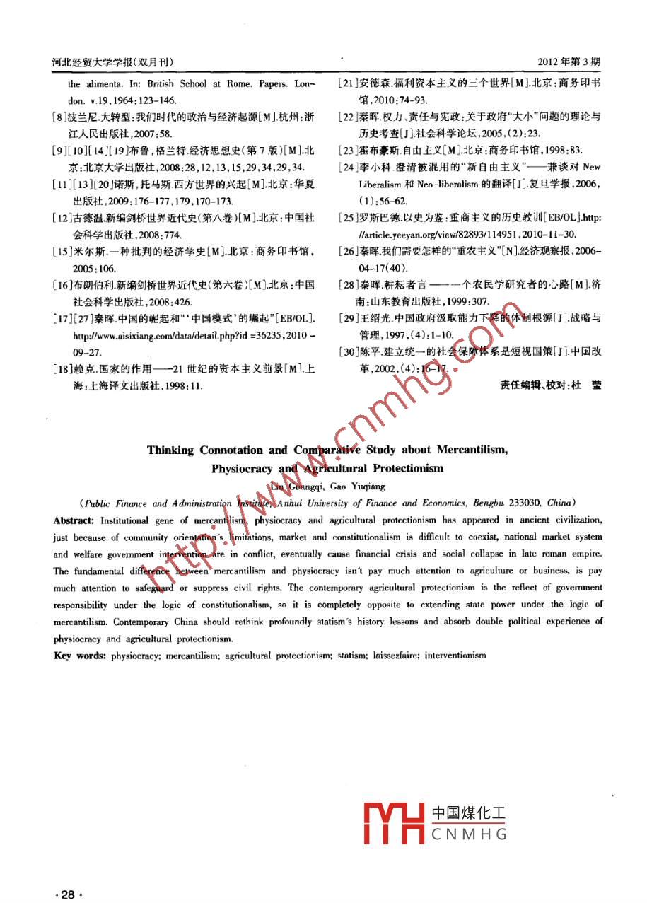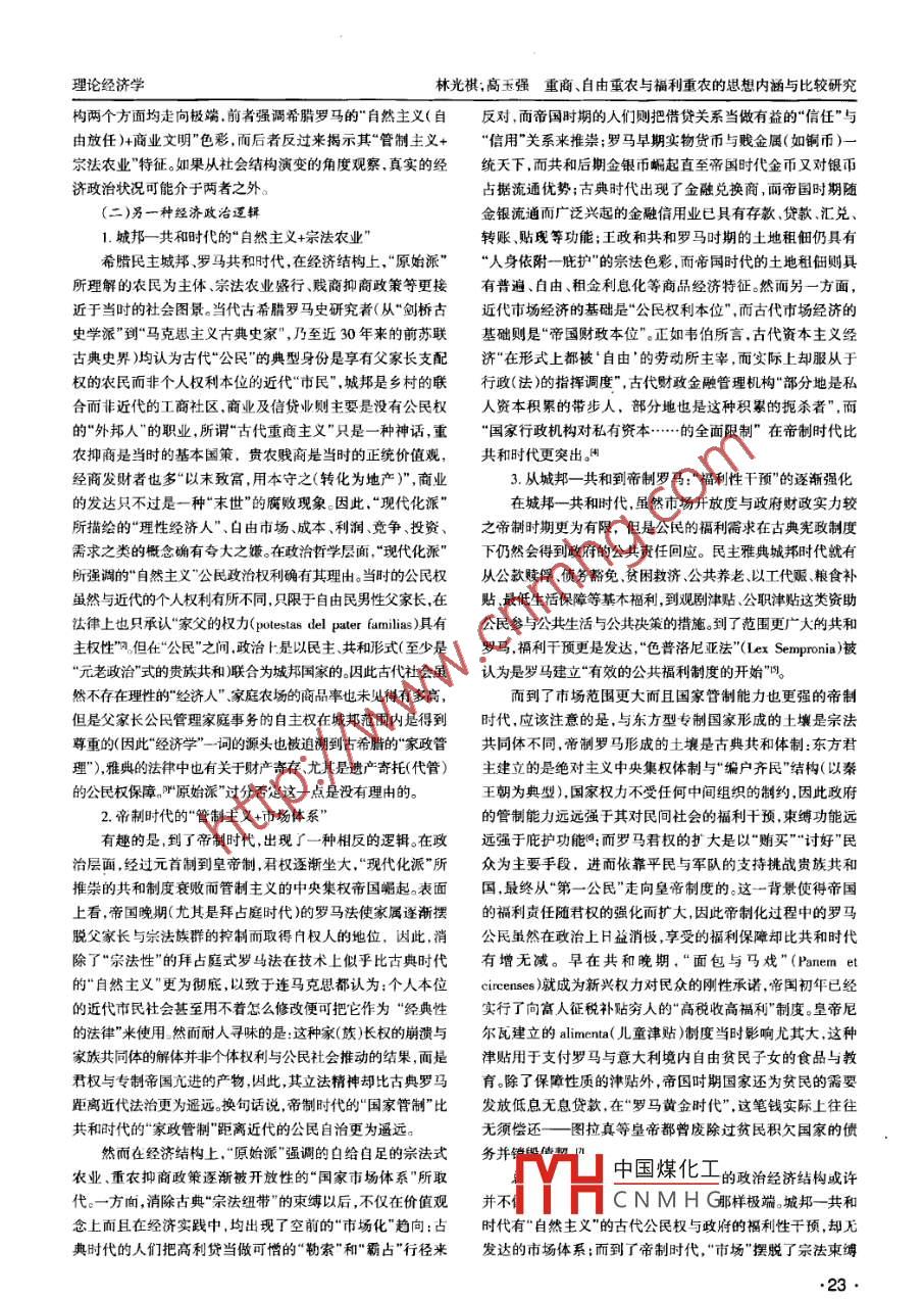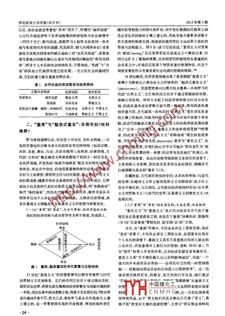2012年5月河北經(jīng)貿(mào)大學(xué)學(xué)報May 2012第3卷第3期Journal of Hebei University of Economics and BusinessVoL 33 No. 3●理論經(jīng)濟(jì)學(xué)重商、自由重農(nóng)與福利重農(nóng)的思想內(nèi)涵與比較研究“經(jīng)濟(jì)一社會史”的綜合分析框架林光祺,高玉強安徽財經(jīng)大學(xué)財政與公共管理學(xué)院,安徽蚌埠23030)摘要:重商主義、自由重農(nóng)主義與福利重農(nóng)主義背后的管制、放任與干預(yù)邏輯早已在古代希臘羅馬文明中出現(xiàn),只是囿于當(dāng)時的“共同體本位”結(jié)枃,因此市場與憲政難以并存、國家市場體系與福利性政府干預(yù)互為扦格,最終造成帝國晚期的財政危機與社會崩漬。中世紀(jì)晚期的重商主義與近代魁奈式自由重農(nóng)主義的分歧其實并不在于重視商業(yè)還是重視農(nóng)業(yè)之別,而在于重視“管制民權(quán)、放任國(官)權(quán)”還是重視“保障民權(quán)、限制國(官)權(quán)”之別。當(dāng)代的福利重農(nóng)政策是憲政主義邏輯下大政府責(zé)任的體現(xiàn),因此與前憲政時代重商體系下約大政府弄權(quán)截然有別。當(dāng)代中國應(yīng)反思管制主義的歷史教訓(xùn),吸取自由重農(nóng)主義與福利重農(nóng)主義的雙重政治經(jīng)驗。關(guān)鍵詞:重農(nóng)主義;重商主義;福利重農(nóng)主義;國家統(tǒng)制;自由放任;福利干預(yù)中圖分類號:FU1文獻(xiàn)標(biāo)識碼:A文章編號:1007-2101(2012)03-0022-07西歐近代早期魁奈式的 physiocracy思想,經(jīng)濟(jì)學(xué)界通譯理論邏輯上各執(zhí)一端,在學(xué)界輪流稱大的為“重農(nóng)主義”,源出古希臘語,由 physio(自然的)+"cray(一)“現(xiàn)代化派”與“原始派”之爭(支配、統(tǒng)治)綴合而成,政治哲學(xué)的含義是“自然主義、讓自早期居于主流地位的是“現(xiàn)代化派”,當(dāng)時的西方人反感由主導(dǎo)”。另外一種相反的主張 mercantilism譯為“重商主中世紀(jì)而追慕現(xiàn)代性,把希臘羅馬尊為近代文明之根而為它義”,實際上是強調(diào)“國家管制”而當(dāng)代的發(fā)達(dá)民主國家則流涂上“準(zhǔn)資本主義"色彩:在經(jīng)濟(jì)結(jié)構(gòu)方面表現(xiàn)為商品市場發(fā)行一種新的“福利重農(nóng)主義”,其內(nèi)容不僅是給農(nóng)民更多的自達(dá)、自由貿(mào)易盛行以及古代企業(yè)家的進(jìn)取精神;在政治哲學(xué)層由經(jīng)營權(quán),而且要求政府對農(nóng)民、農(nóng)業(yè)提供更多的福利保護(hù)。面則表現(xiàn)為自由放任為本、工具理性早熟個體權(quán)利優(yōu)先與近三種思想不僅反映了不同時代條件下產(chǎn)業(yè)結(jié)構(gòu)調(diào)整的各種代資本主義的區(qū)別僅在于勞工更不自由技術(shù)水平更低而已國路,更重要的是,它們背后所對應(yīng)的三種政府類型(集權(quán)政人在“五四”以后接受的主要就是這種觀點。“二戰(zhàn)"以后由于府、有限政府、責(zé)任政府)及其運行邏輯(管制、放任、干預(yù))尤“現(xiàn)代性的反思”成為一種國際潮流,因此現(xiàn)實中人們對“后現(xiàn)其耐人尋味。本文嘗試運用“經(jīng)濟(jì)一社會史”的綜合分析框代社會”(據(jù)說它將是一個“技術(shù)高度發(fā)達(dá)的中世紀(jì)式的社架,以經(jīng)濟(jì)結(jié)構(gòu)和政治哲學(xué)作為兩維結(jié)合歷史社會學(xué)的理會”)的期待使他們在自己心目中塑造了一個“中世紀(jì)式”的想類型分析與比較研究,追溯三種思想在古典政治經(jīng)濟(jì)結(jié)構(gòu)羅馬,一個全然不同于啟蒙時代到工業(yè)化時代人們所設(shè)想的中的某些基因研究它們在中世紀(jì)晚期以及近代化過程中的“西方傳統(tǒng)”"“原始派”轉(zhuǎn)而主導(dǎo)學(xué)界。與“現(xiàn)代化派”截然相不同表現(xiàn),進(jìn)而揭示三者的本質(zhì)差異同時,回答上述問題,反,他們眼中的希臘羅馬是個典型的“宗法農(nóng)民社會”:在經(jīng)對于當(dāng)代中國的經(jīng)濟(jì)社會轉(zhuǎn)型或許可以提供一些啟濟(jì)結(jié)構(gòu)方面不再是商品市場發(fā)達(dá)而是以宗法農(nóng)業(yè)為本,不再管制、放任、干預(yù)的制度先祖是自由貿(mào)易盛行而是以自然經(jīng)濟(jì)主導(dǎo),不再是古代企業(yè)家的進(jìn)取精神而是個體小農(nóng)的自給自足;在政治哲學(xué)層面也不是古代希臘羅馬社會的政治經(jīng)濟(jì)結(jié)構(gòu)中就已經(jīng)出現(xiàn)了白自由放任為本而是宗法管制盛行,不是工具理性早熟而是原由放任、國家管制與福利干預(yù)等要素,古史研究界非常著名始思維充斥,不是個體權(quán)利優(yōu)先而是個人義務(wù)至上。的“現(xiàn)代化派”與“原始派”之爭①就是以上述概念為依據(jù)在總而言之,“現(xiàn)代化派”與“原始派”在政治哲學(xué)與經(jīng)濟(jì)結(jié)收稿日期:2012-03-09基金項目:200年度國家杜會科學(xué)基金項目(U9CJY063);2010年度國家項目(2010SK227)T凵中國煤化工液著教素作者簡介:林光褀(1979-),男,安撒懷遠(yuǎn)人,安徽財經(jīng)大學(xué)財政與公共CNMHG化、經(jīng)濟(jì)一社會史比較等;高玉強(1980~),男,山東肢南人,安微財經(jīng)大學(xué)財政與公共管理學(xué)院副教授,經(jīng)濟(jì)學(xué)博士,碩士生導(dǎo)師,研究方向為財政理論與管理。理論經(jīng)濟(jì)學(
