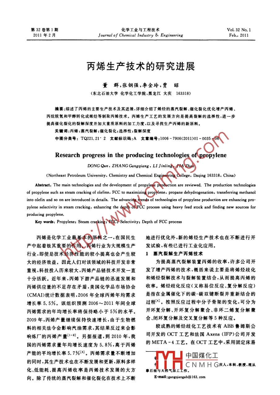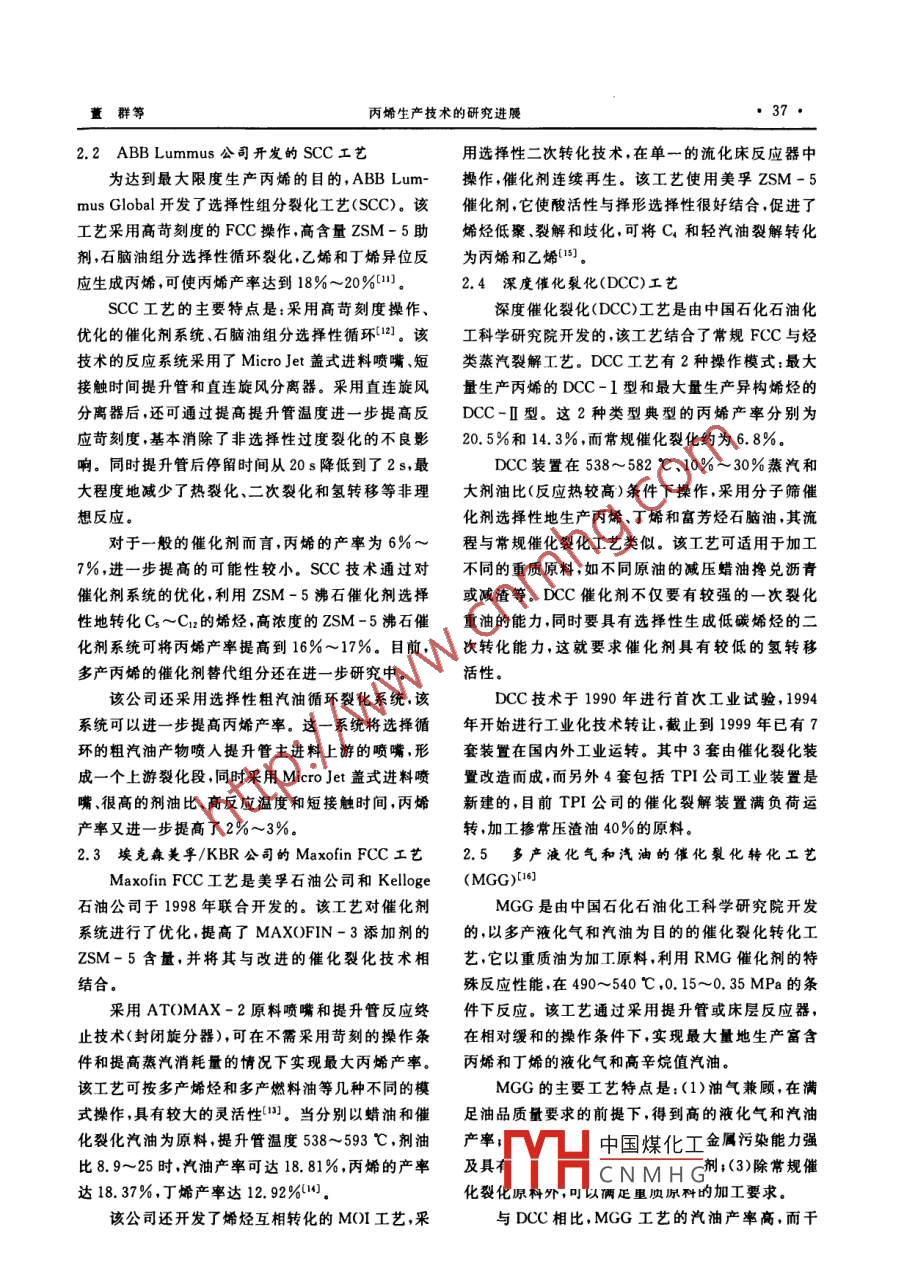 第32卷第1期化學(xué)工業(yè)與工程技術(shù)Vol 32 No. 12011年2月Journal of Chemical Industry &. EngineeringFeb.,2011丙烯生產(chǎn)技術(shù)的研究進(jìn)展董群,張鋼強(qiáng),李金玲,賈昭(東北石油大學(xué)化學(xué)化工學(xué)院,黑龍江大慶163318)摘要:綜述了丙烯的主要生產(chǎn)技術(shù)及其進(jìn)展詳細(xì)介紹了烯烴的蒸汽裂解、催化裂化優(yōu)化增產(chǎn)丙烯丙烷脫氫和甲醇轉(zhuǎn)化成烯烴等制取丙烯技術(shù)。丙烯生產(chǎn)工藝的發(fā)展方向是提高裂解的選擇性,進(jìn)一步提高催化裂化的裂解深度并加大重質(zhì)原料的加工力度,以及尋找生產(chǎn)丙烯的新原料關(guān)鍵詞:丙烯;蒸汽裂解;催化裂化;選擇性;裂解深度中圖分類號(hào):TQ221.21·2文獻(xiàn)標(biāo)識(shí)碼:A文章編號(hào):1006-7906(2011)01-0035-06Research progress in the producing technologies of propyleneDONG Qun, ZHANG Gangqiang, LI Jinling, JIA ZhaoNortheast Petroleum University, Chemistry and Chemical Engineering College, Daqing 163318, China)Abstract: The main technologies and the development of propylene production are reviewed. The production technologiesof propylene such as steam cracking of olefins, FCC to maximizing propylene, propane dehydrogenation, transferring methanolinto olefin and so on are introduced in details. the advancing trends of technologies of propylene production are enhancing pro-pylene selectivity in steam cracking, enhancing the depth. of FCC process using heavy feed stock and finding new sources forKey words: Propylene: Steam cracking: FCC, Selectivity Depth of FCC process丙烯是化學(xué)工業(yè)最基本的原料之一,在國(guó)民生地進(jìn)行優(yōu)化外,新的烯烴生產(chǎn)技術(shù)也在不斷進(jìn)行開(kāi)產(chǎn)中起著極其重要的作用。丙烯行業(yè)為大規(guī)模生產(chǎn)發(fā)試驗(yàn),有些已進(jìn)行工業(yè)化應(yīng)用。行業(yè),即使是技術(shù)經(jīng)濟(jì)性能的較小提高也會(huì)產(chǎn)生較1蒸汽裂解生產(chǎn)丙烯技術(shù)大的經(jīng)濟(jì)效益。因此人們對(duì)該領(lǐng)域的科技開(kāi)發(fā)非常為提高蒸汽裂解裝置丙烯的收率,許多公司開(kāi)重視,科技投人歷來(lái)較大,丙烯產(chǎn)品鏈技術(shù)開(kāi)發(fā)一直發(fā)了增產(chǎn)丙烯的技術(shù),概括來(lái)說(shuō)主要是將烯烴歧化十分活躍。近年來(lái)丙烯下游產(chǎn)品鏈的迅速發(fā)展和和烯烴裂解技術(shù)與裂解裝置結(jié)合,從而提高丙烯的丙烯供應(yīng)量的不足存在矛盾,美國(guó)化學(xué)品市場(chǎng)協(xié)會(huì)收率。烯烴歧化反應(yīng)(又稱易位反應(yīng)、復(fù)分解反應(yīng))(CMAI)統(tǒng)計(jì)數(shù)據(jù)表明2006年全球丙烯年均需求是指在金屬催化下的碳-碳雙鍵斷裂并重新結(jié)合的增長(zhǎng)率5.5%該組織預(yù)測(cè)2006~2011年間全球過(guò)程。按照反應(yīng)過(guò)程中分子骨架的變化,可分為丙烯需求的年均增長(zhǎng)率將保持略小于5%的水平。開(kāi)環(huán)復(fù)分解、開(kāi)環(huán)復(fù)分解聚合、非環(huán)二烯復(fù)分解聚2009年,丙烯產(chǎn)量繼續(xù)保持快速增長(zhǎng),由于生物燃合閉環(huán)復(fù)分解及交又復(fù)分解等5種反應(yīng)料的相關(guān)法令會(huì)影響汽油需求,其結(jié)果反過(guò)來(lái)會(huì)影較成熟的烯烴歧化工藝技術(shù)有ABB魯姆斯公響煉廠的丙烯產(chǎn)量1-。另?yè)?jù)報(bào)道,到2010年,我司開(kāi)發(fā)的OCT工藝和法國(guó) Axens(FP)公司開(kāi)發(fā)國(guó)的丙烯需求量年均增長(zhǎng)速度為5.8%,高于丙烯的META-4工藝。在OCT工藝中,采用固定床易產(chǎn)能的平均增長(zhǎng)率5.7%。丙烯需求量不斷增加中國(guó)煤化工的同時(shí),其生產(chǎn)技術(shù)也在不斷發(fā)展和更新,原料多樣CNMHG慶人,本科教授現(xiàn)從化、低能耗、提高丙烯收率是丙烯技術(shù)發(fā)展的大方事石油與天向。除了傳統(tǒng)的蒸汽裂解和催化裂化在技術(shù)上不斷Ermall: gangqiangab@ 163, co36·化學(xué)工業(yè)與工程技術(shù)2011年第32卷第1期位反應(yīng)器,以乙烯和丁烯為原料。催化劑促使乙烯分子的C和C烯烴,生成的長(zhǎng)鏈烴進(jìn)一步在β位和2-丁烯反應(yīng)生成丙烯同時(shí)使1-丁烯異構(gòu)化為斷裂。理論上,催化裂化產(chǎn)物應(yīng)該含有大量的丙烯,2-丁烯。將反應(yīng)產(chǎn)物分餾得到高純度聚合級(jí)丙烯,但丙烯的實(shí)際產(chǎn)率并沒(méi)有預(yù)期的高。這是由于在提乙烯和丁烯循環(huán)使用。該工藝對(duì)丙烯的選擇性大于升管以及沉降器的稀相中發(fā)生的二次反應(yīng)飽和或破98%正丁烯的轉(zhuǎn)化率為85%~92%。乙烯和丁烯壞了烯烴,其中最為嚴(yán)重的是氫轉(zhuǎn)移反應(yīng)實(shí)際上影進(jìn)料可來(lái)自蒸汽裂解裝置或煉油廠,丁烯也可來(lái)自響烯烴產(chǎn)率的很多副反應(yīng)都與氫轉(zhuǎn)移反應(yīng)有關(guān)乙烯二聚{5。因此,為了多產(chǎn)丙烯,FCC技術(shù)應(yīng)強(qiáng)化裂化反應(yīng),抑目前,世界范圍內(nèi)利用烯烴歧化反應(yīng)制備丙烯制氫轉(zhuǎn)移反應(yīng)并已工業(yè)化的工藝有 ABB Lummus公司所持有的近年來(lái),世界各石化公司通過(guò)優(yōu)化催化劑和操OCT-C4歧化反應(yīng)工藝,共有3套工業(yè)裝置在運(yùn)行作條件,已經(jīng)使煉廠有效地提高了丙烯的產(chǎn)量。中,其中1套由日本三菱株式會(huì)社于208年投Fcc裝置提高丙烯收率