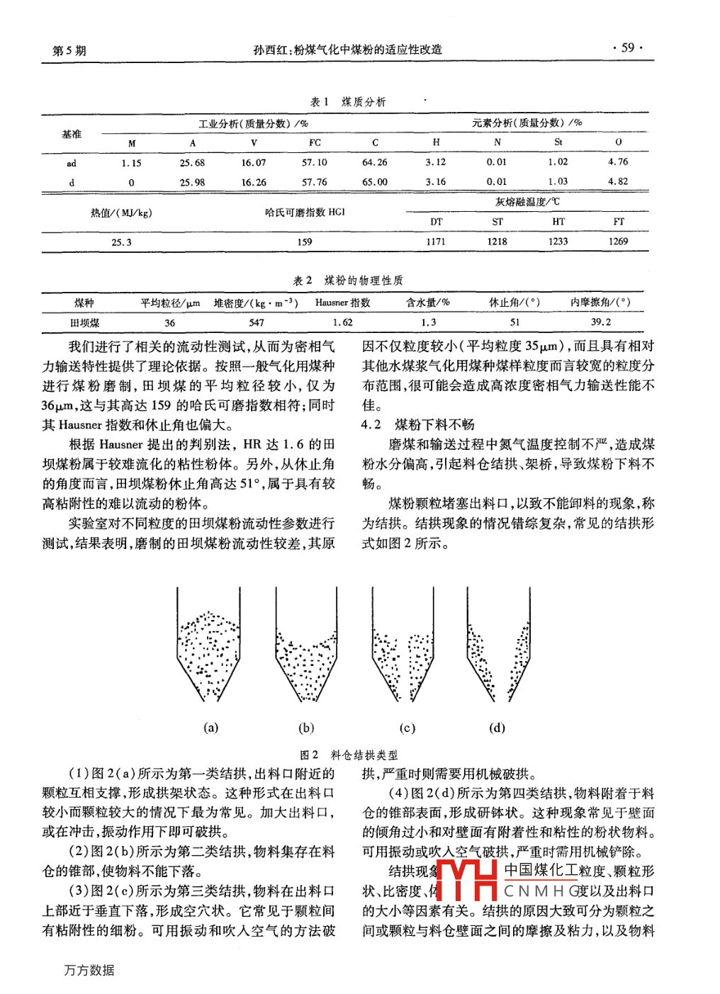 第5期孫西紅:粉煤氣化中煤粉的適應(yīng)性改造●57●y,生產(chǎn)與應(yīng)用y粉煤氣化中煤粉的適應(yīng)性改造孫西紅(兗州煤業(yè)鄂爾多斯能化有限公司,內(nèi)蒙古達(dá)拉特旗,014300)摘要:簡(jiǎn)述了田壩煤在中試試燒過(guò)程中由于煤粉性質(zhì)和粒徑分布引起的一些問(wèn)題,分析原因,介紹了改造方法和效果。關(guān)鍵詞:煤粉粒徑;粉煤氣化;煤粉輸送中圖分類(lèi)號(hào):TQ531文獻(xiàn)標(biāo)識(shí)碼:B文章編號(hào):1008 -021X(2012)05 -00S7 -04The Adaptability Reformation of CoalParticle at the Process of Pulverized - coal GasifierSUN Xi - hong( Yanzhou Coal Ordos Chemical Co. ,Ltd. ,Dalate 014300 ,China)Abstract : Introduced the issues created by coal particle properties about and coal particle size distributionduring the test bum at pilot plant test phase for the coal made in tianba,analysed the reasons of the issuesmentioned above , recommended the transforming method and effect.Key words:coal particle size ;pulverized - coal gasifier; pulverized coal transfer水煤漿氣化及煤化工國(guó)家工程研究中心日處理合適的煤粉經(jīng)氮?dú)鈹y帶進(jìn)人粗分分離器,完成煤粉煤30t的粉煤氣化中試裝置包含完整的煤粉磨制與的粒度篩選,粒度不合格的煤粉返回磨機(jī),粒度合格輸送單元、氣化單元、氣體凈化單元和渣水處理單的煤粉隨氮?dú)膺M(jìn)入第一分離器,完成煤粉與氮?dú)獾脑?。中試裝置進(jìn)行過(guò)多個(gè)煤種的試燒工作,其中貴分離,煤粉進(jìn)人低壓煤粉罐,氮?dú)饨?jīng)過(guò)第三分離器凈州田壩煤在煤粉磨制、輸送、人氣化爐流量穩(wěn)定性等化后排放。方面與其他試燒過(guò)的煤種差異較大,原有制粉輸送煤粉輸送單元是煤粉連續(xù)不斷地加壓工作過(guò)系統(tǒng)生產(chǎn)出的煤粉不滿(mǎn)足氣化反應(yīng)要求,煤粉輸送程。低壓煤粉槽中的煤粉間斷進(jìn)人中間罐,然后由存在不穩(wěn)定情況,經(jīng)過(guò)幾次改造,煤粉粒度過(guò)細(xì)和流氮?dú)鈹y帶進(jìn)入第二分離器,分離出的氮?dú)饨?jīng)第四分量不穩(wěn)的情況已基本消除。離器凈化后排放,煤粉進(jìn)入煤粉鎖斗,煤粉鎖斗在接1中試裝置煤粉制 備與輸送系統(tǒng)流程收煤粉時(shí)是常壓,當(dāng)煤粉加滿(mǎn)罐后,關(guān)閉閥門(mén),經(jīng)氮煤粉制備單元是進(jìn)行煤粉的磨制工作,粒度合氣充壓并 與發(fā)料罐壓力相等后,再將煤粉送人加料格的原煤由煤場(chǎng)經(jīng)汽車(chē)送至現(xiàn)場(chǎng),將煤和氣化助熔罐。加料罐始終保持--定料位,才能向氣化爐持續(xù)劑按比例摻混,原料經(jīng)皮帶運(yùn)輸機(jī)、斗提機(jī),送人原供料或進(jìn)行煤粉循環(huán)。制粉與輸送系統(tǒng)流程圖如圖煤槽,再經(jīng)螺旋計(jì)量給料機(jī)送人球磨機(jī),原煤在此被1所示。磨制成粉,同時(shí)進(jìn)人磨機(jī)的還有熱氮?dú)?磨機(jī)中粒度中國(guó)煤化工收稿日期:2012-04 -20作者簡(jiǎn)介:孫西紅( 1982- -) ,女,陜西扶風(fēng)人,助理工程師,一直從事氣流床氣.MHCNMHG山東化工●58●SHANDONG CHEMICAL INDUSTRY2012年第41卷引風(fēng)機(jī)分離,器二y分離分離器三,器四器一低壓煤粉罐粉煤煤粉風(fēng)鎖斗選器原煤計(jì)量中間罐磨機(jī)I 給料罐氮?dú)鈭D1制粉與輸送 系統(tǒng)流程圖2煤粉的基本性質(zhì)料的接觸角度可分為刮削和壓剝兩類(lèi)。2.1 煤粉的粒徑與粒度分布(1)刮削煤粉顆粒是構(gòu)成煤粉的基本單位。煤粉的許多煤粉顆粒以--定角度沖擊材料之后,以其動(dòng)能.性質(zhì)都由顆粒的大小及分布狀態(tài)所決定。粒徑或粒刮削材料。度都是表征粉煤所占空間范圍的代表性尺寸。對(duì)單(2)壓剝個(gè)顆粒,常用粒徑來(lái)表示幾何尺寸的大小;對(duì)顆粒煤粉顆粒以近乎垂直的角度沖擊材料,對(duì)材料群,則用平均粒度來(lái)表示。造成磨損。材料不同,其受到?jīng)_擊后磨損的情況也(1)粒徑不同。硬質(zhì)脆性材料受到?jīng)_擊后,由于局部產(chǎn)生裂以粉粒的長(zhǎng)度尺寸來(lái)表示粒度時(shí),該尺寸稱(chēng)為紋而剝損;延性材料受到?jīng)_擊后,產(chǎn)生局部壓人變粒徑。形,多次反復(fù)后材料剝落;另外,延性材料也會(huì)因受(2)平均粒度到?jīng)_擊局部升溫而粘附于煤粉顆粒上,從而使材料平均粒度是對(duì)煤粉粒度大小的描述,可用粒徑剝落受損。的算術(shù)平均值來(lái)表示,如下式所示:2.4粘附( 凝聚)性質(zhì)煤粉顆粒與其他粉?;蛭矬w表面之間存在相互D、=一End;吸引的作用力,主要包括有分子間力、靜電力等,因(3)粒度分布而在氣力輸送過(guò)程中,粉粒往往會(huì)粘附在管壁、器壁粒度分布通常是指某-粒徑或某-粒徑范圍的以及機(jī)體表面上,或是煤粉顆粒間相互凝聚成團(tuán),影顆粒在整個(gè)粉體中所占比例,有區(qū)間分布和累計(jì)分響輸送過(guò)程的順利進(jìn)行。布兩種形式,區(qū)間分布又稱(chēng)為微分分布或頻率分布,3輸送和試燒過(guò)程中出現(xiàn)的主要煤粉問(wèn)題它表示一系列粒徑區(qū)間中顆粒的百分含量。累計(jì)分(1)煤粉給料罐底部結(jié)拱、架橋;布也叫積分分布,它表示小于或大于某粒徑顆粒的(2)煤粉鎖斗到給料罐下料不暢;百分含量??捎煤?jiǎn)單的表格、繪圖和函數(shù)形式表示(3)循環(huán)氣量控制較難;顆粒群粒徑的分布狀態(tài)。(4)煤粉流量不穩(wěn)定,波動(dòng)較大,導(dǎo)致煤粉流量2.2 