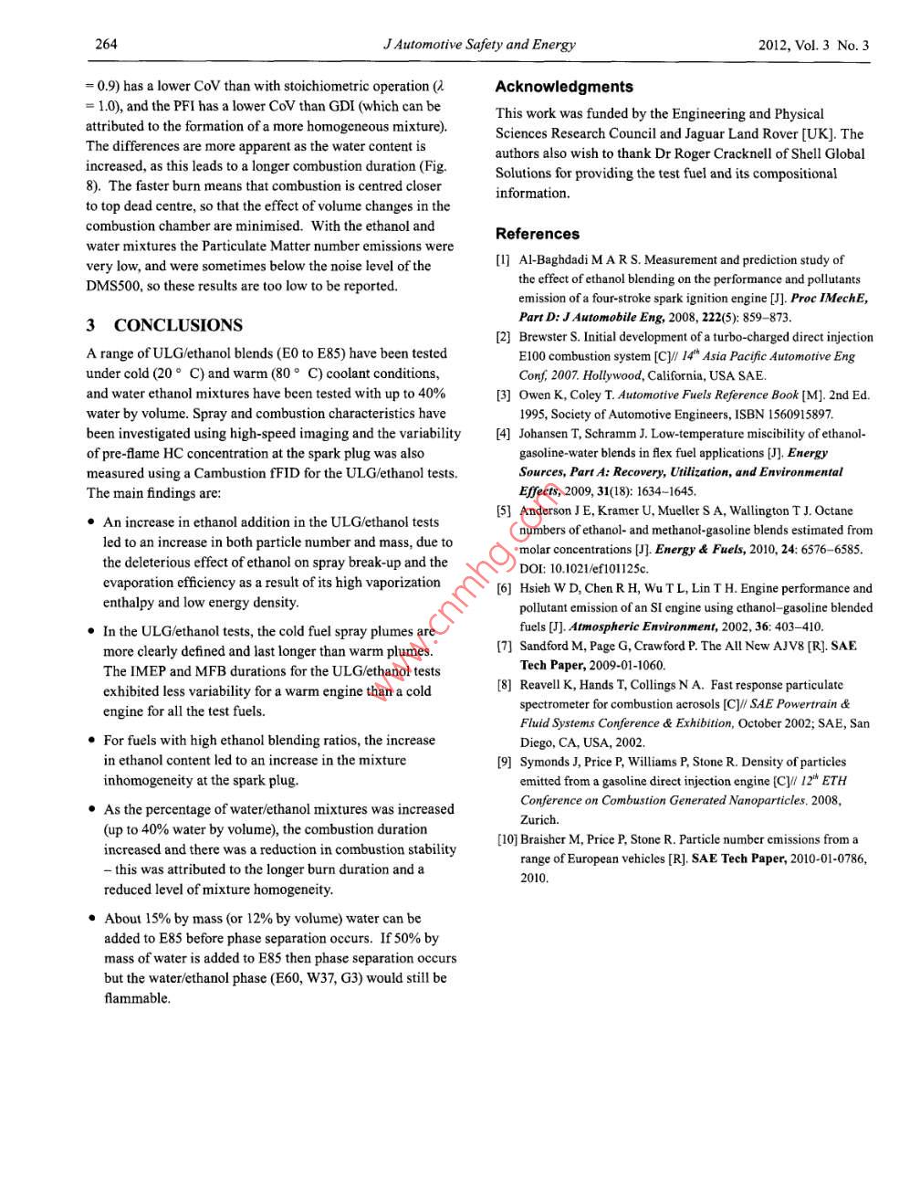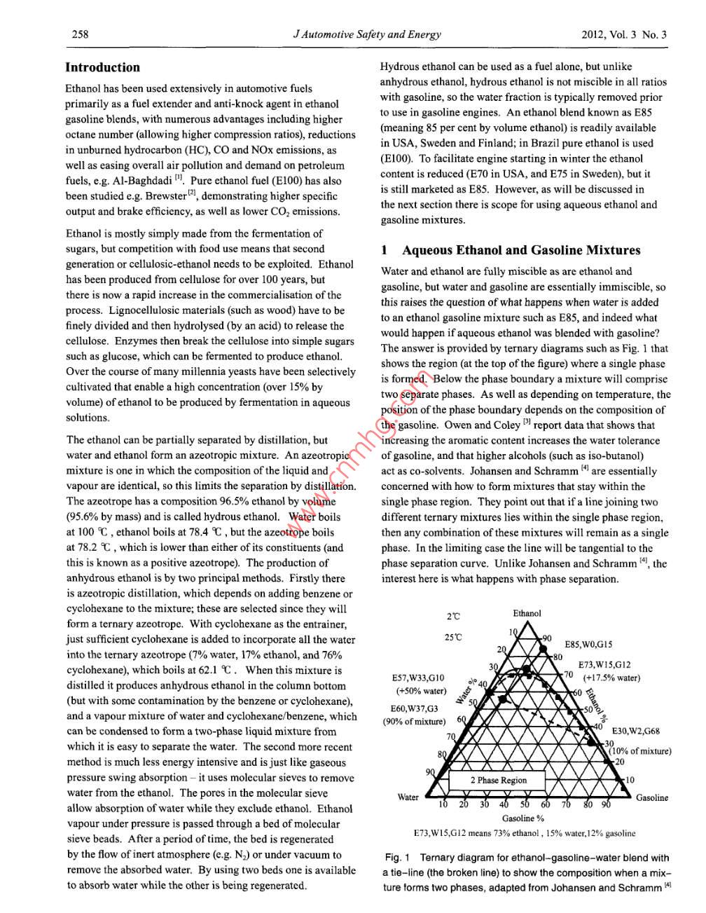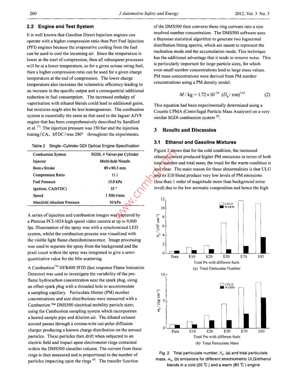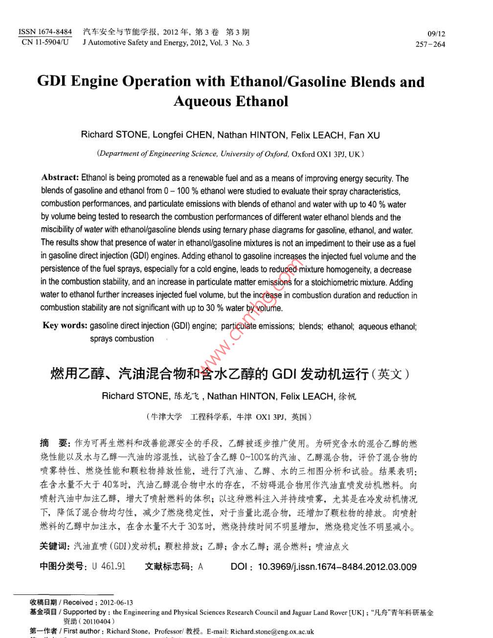 SN1674-8484汽車安全與節(jié)能學(xué)報,2012年,第3卷第3期09/12CN 11-5904/U J Automotive Safety and Energy, 2012, Vol 3 No. 3257-264GDI Engine Operation with Ethanol/Gasoline Blends andAqueous EthanolRichard STONE, Longfei CHEN, Nathan HINTON, Felix LEACH, Fan XU(Department of Engineering Science, University of Oxford, Oxford OXI 3PJ, UK)Abstract: Ethanol is being promoted as a renewable fuel and as a means of improving energy security. Theblends of gasoline and ethanol from 0-100% ethanol were studied to evaluate their spray characteristics,combustion performances, and particulate emissions with blends of ethanol and water with up to 40% waterby volume being tested to research the combustion performances of different water ethanol blends and themiscibility of water with ethanol/gasoline blends using ternary phase diagrams for gasoline, ethanol, and water.The results show that presence of water in ethanol/gasoline mixtures is not an impediment to their use as a fuelin gasoline direct injection(GDI)engines. Adding ethanol to gasoline increases the injected fuel volume and theersistence of the fuel sprays, especially for a cold engine, leads to reduced mixture homogeneity, a decreasein the combustion stability and an increase in particulate matter emissions for a stoichiometric mixture. Addingwater to ethanol further increases injected fuel volume, but the increase in combustion duration and reduction incombustion stability are not significant with up to 30 water by volumeKey words: gasoline direct injection(GDI)engine; particulate emissions; blends; ethanol; aqueous ethanolsprays combustion燃用乙醇、汽油混合物和含水乙醇的GD|發(fā)動機運行(英文)Richard STONE,陳龍飛, Nathan HINTON, Felix LEACH,徐帆(牛津大學(xué)工程科學(xué)系,牛津OX13PJ,英國)摘要:作為可再生燃料和改善能源安全的手段,乙醇被逐步推廣使用。為研究含水的混合乙醇的燃燒性能以及水與乙醇一汽油的溶混性,試驗了含乙醇0~100%的汽油、乙醇混合物,評價了混合物的噴霧特性、燃燒性能和顆粒物排放性能,進行了汽油、乙醇、水的三相圖分析和試驗。結(jié)果表明:在含水量不大于40%時,汽油乙醇混合物中水的存在,不妨礙混合物用作汽油直噴發(fā)動機燃料。向噴射汽油中加注乙醇,增大了噴射燃料的體積;以這種燃料注入并持續(xù)噴霧,尤其是在冷發(fā)動機情況下,降低了混合物均勻性,減少了燃燒穩(wěn)定性,對于當(dāng)量比混合物,還增加了顆粒物的排放。向噴射燃料的乙醇中加注水,在含水量不大于30%時,燃燒持續(xù)時間不眀顯增加,燃燒穩(wěn)定性不明顯減小。關(guān)鍵詞:汽油直噴(Gu〕發(fā)動機;顆粒排放;乙醇;含水乙醇;混合燃料;噴油點火中圖分類號:U461.91文獻標(biāo)志碼:ADO:10.3969/ssn.1674-84842012.03.009收稿日期/ Received:2012-06-13基金項目/ Supported by: the Engineering and Physical Sciences Research Council and Jaguar Land Rover [UK];“凡舟”青年科研基金資助(20110404)第一作者/ First author: Richard Stone, Professor教授。E-mail: Richard, stone@ leng. Ox.acuk258J Automotive Safety and Energy2012,Vol.3No.3IntroductionHydrous ethanol can be used as a fuel alone, but unlikeEthanol has been used extensively in automotive fuelsanhydrous ethanol, hydrous ethanol is not miscible in all ratiosprimarily as a fuel extender and anti-knock agent in ethanolwith gasoline, so the water fraction is typically removed priorgasoline blends, with numerous advantages including higherto use in gasoline engines. An ethanol blend known as E85octane number (allowing higher compression ratios), reductions(meaning 85 per cent by volume ethanol) is readily availablein unburned hydrocarbon(HC), CO and NOx emissions, asin USA, Sweden and Finland; in Brazil pure ethanol is usedwell as easing overall air pollution and demand on petroleum(E100). To facilitate engine starting in winter the ethanolfuels, e.g. Al-Baghdadi. Pure ethanol fuel(E100) has alsocontent is reduced (E70 in USA, and E75 in Sweden), but itbeen studied e.g. Brewster, demonstrating higher specificis still marketed as E85. However, as will be discussed inoutput and brake efficiency, as well as lower CO, emissionsthe next section there is scope for using aqueous ethanol andgasoline mixturesEthanol is mostly simply made from the fermentation ofsugars, but competition with food use means that second1 Aqueous Ethanol and Gasoline Mixturesgeneration or cellulosic-ethanol needs to be exploited. Ethanol Water and ethanol are fully miscible as are ethanol andhas been produced from cellulose for over 100 years, butthere is now a rapid increase in the commercialisation of thegasoline, but water and gasoline are essentially immiscible, soprocess. Lignocellulosic materials(such as wood) have to behis raises the question of what happens when water is addedfinely divided and then hydrolysed(by an acid) to release theto an ethanol gasoline mixture such as E85, and indeed whatwould happen if aqueous ethanol was blended with gasoline?cellulose. Enzymes then break the cellulose into simple sugars The answer is provided by ternary diagrams such as Fig. I thatuch as glucose, which can be fermented to produce ethanol.Over the course of many millennia yeasts have been selectivelyhows the region(at the top of the figure)where a single phasecultivated that enable a high concentration(over 15% byis formed. Below the phase boundary a mixture will comprisevolume)of ethanol to be produced by fermentation in aqueouswo separate phases. As well as depending on temperature, thesolutionsposition of the phase boundary depends on the composition ofthe gasoline. Owen and Coley report data that shows thatThe ethanol can be partially separated by distillation, butincreasing the aromatic content increases the water tolerancewater and ethanol form an azeotropic mixture. An azeotropic of gaso