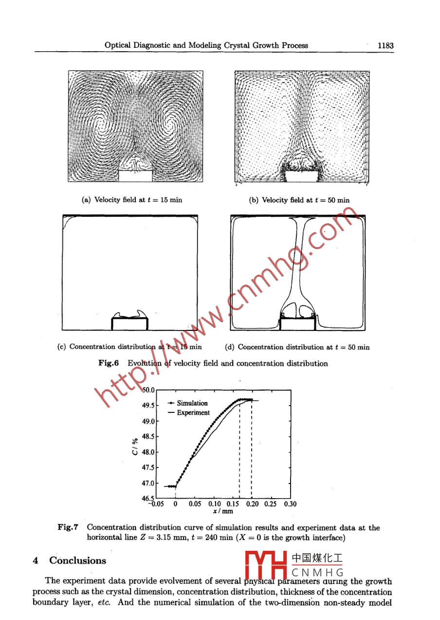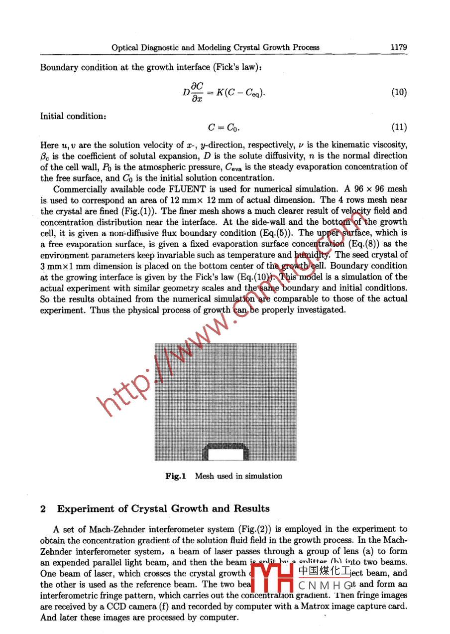 Applied Mathematics and Mechanics (English Edition), 2006, 27()177 -1184⑥Editorial Committee of Appl. Math. Mech, ISSN 0253 4827OPTICAL DIAGNOSTIC AND MODELING SOLUTIONGROWTH PROCESS OF SODIUM CHLORATE CRYSTALS *WANG Tao (王濤),DUAN Li (段俐)(National Microgravity Laboratory, Institute of Mechanics, Chinese Academy of Sciences,Beijing 10080, P. R. China)(Communicated by HU Wen. rui)Abstract: Both a real time optical interferometric experiment and a numerical sim-ulation of two- dimension non-steady state model were employed to study the growthprocess of aqueous sodium chlorate crystals. The parameters such as solution concen-tration distribution, crystal dimensions, growth rate and velocity field were obtained byboth experiment and numerical simulation. The infuence of earth gravity during crystalgrowth process was analyzed. A reasonable theory model corresponding to the presentexperiment is advanced. The thickness of concentration boundary layer was investigatedespecially. The results from the experiment and numerical simulation match well.Key words: crystal growth; interferometry; numerical simulation; concentration bound-ary layerChinese Library Classification: 07812000 Mathematics Subject Classification: 74N05; 74N25Digital Object Identifter(DOI): 10.1007/s 10483 006-0904-1IntroductionCrystal growth is a procedure of phase changing. It is infuenced by kinds of physicalphenomena. Since structure details of crystal growth process from either melt or solution arestill not fully understood, a complete convincing theory model is not advanced by now. Thequality and shape of crystals in growth process are known to be affected by many factors, suchas impurities, steps bunching, and the transport process of difusion and convection. Furthermore there is a lttle diference in microgravity condition between that in terrestrial gravity. So,more and more researches in this field are carried out to discover the physical essentials and toimprove the growth model.According to the larger crystal scale, ground-based inorganic crystal growth experimentis much more facile for optical observing than that of protein crystal. And the experimentshave obtained many significant results. Onuma and Tsukamoto developed the phase shift opticinterface method with high resolution[1,2), and Duan et al. improved it to show the concentrationtransferl3- 5]. This Mach-Zehnder interferometry system can be used for real time observation ofconcentration field and velocity field. Then experiment data are processed by an image processsystem to obtain the crystal growth rate and the thickness of concentration boundary layer.In this paper, a same Mach- Zehnder interferometry system is employed to observe the growthprocess of NaClO3 crystals.Modeling the process of crystal growth is an attra中國煤化工,only dynam-icists but also geologists, biologist (especially in biostrMHC N M H Gts[6-i0]. Many* Received Nov.1, 2005; Revised Jun.1, 2006Project supported by the National Natural Science Foundation of China (No.10432060)Corresponding author DUAN Li, Associate Professor, Doctor, E mail: duanli@imech.ac.cn1178WANG Tao and DUAN Ligrowth procedures in diferent environments including melt growth, solution growth and Va-por diffusion are widely discussed recentlyl7 -9,11. In present paper, a two-dimension linearconvection-diffusion model is advanced如match the aqueous NaClO3 crystallization exper-iment. The crystallization experiment and the numerical simulation are both discussed inpresent paper to obtain the mechanical essentials of the growth process under earth gravity.According to the experiment results, the reasonability of the growth model is validated.1 Theoretical Analysis and ModelThe terrestrial crystal growth process is inevitably affected by earth gravity. The gradient ofsolution concentration brings on layer deposition, which turns into buoyancy convection underearth gravity. As the crystal growth process is affected by the buoyancy convection, it may causecrystal defects in dimension, integrality, optical uniformity, etc. The process of crystal growth isconsidered as a combination of the bulk transport and the interface kineticsl6,10,12. In the bulktransport procedure solute is transported to the growth interface from the bulk, while in theinterface kinetics procedure the solute on the growth interface moves to the kinks to enter thecrystal lattice. Bulk transport is controlled by the difference of bulk concentration C and surfaceconcentration Cs, and interface kinetics is driven by the difference of surface concentration Cand equilibrium concentration Ceq. The two procedures couple to conduct the whole growthprocess. In extreme situation of absolute bulk transport surface concentration approach toequilibrium concentration: Cs→Ceq, while in the opposite absolute interface kinetics situationCg→Cl6,8,10]. A simplified two-dimensional model is employed to simulate the non steadyprocess of the terrestrial crystal growth in Boussinesq approximation. A coordinate systemwhich fixed on the upper crystal surface is considered. The process is governed by the followingequations[67,10I:8u、 8v= 0,(1)8x 838u)u8P-+ v(2)Ht'的y8路+影),0v 8u .. 8v__ 8P82v開+u元+"可=- 8+(02+ 82) -gBc(C-Co),(3)oC、 8C. 8C182C 82C\+u+Ua=D0x2+oy)(4)Boundary conditions at the crystal growth cell wall:8C(5)anu|r=-a,a=0,v|x=-a,a=0.(6)Boundary conditions at the solution-atmosphere interface (free interface):中國煤化工P= Po,(7)C = Ceva,MYHCNMHGv|y=l= 0.(9)Optical Diagnostic and Modeling Crystal Growth Process1179Boundary condition at the growth interface (Fick's law):D咖= K(C -C).(10)Initial condition;C=Co..(11)Here u, U are the solution velocity of x,y-direction, respectively, v is the kinematic viscosity,βc is the cofficient of solutal expansion, D is the solute difusivity, n is the normal directionof the cell wall, P is the atmospheric pressure, Ceva is the steady evaporation concentration ofthe free surface, and Co is the initial 