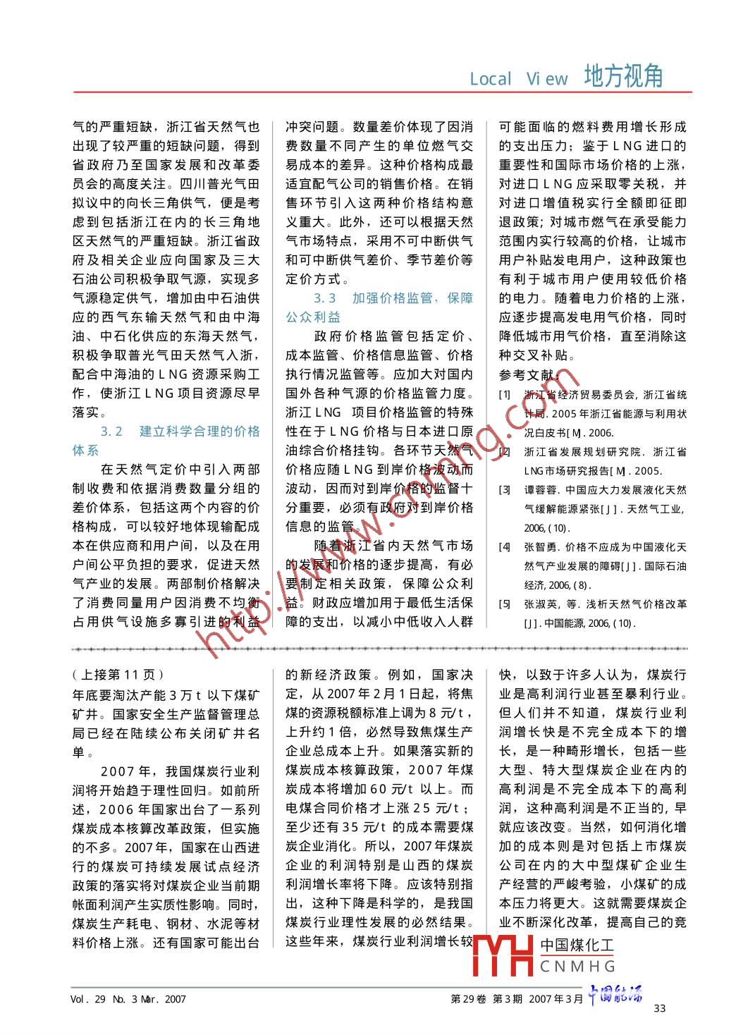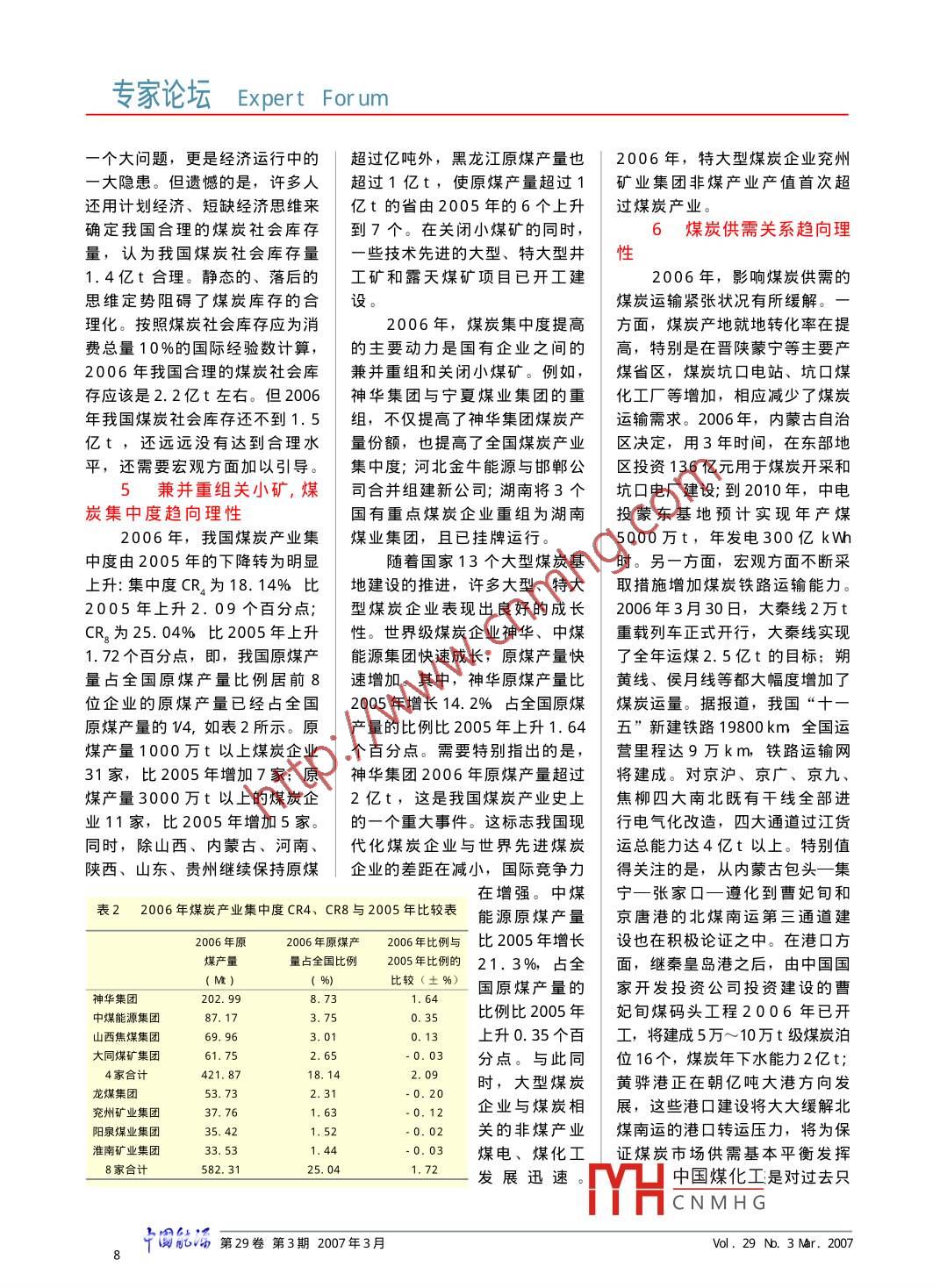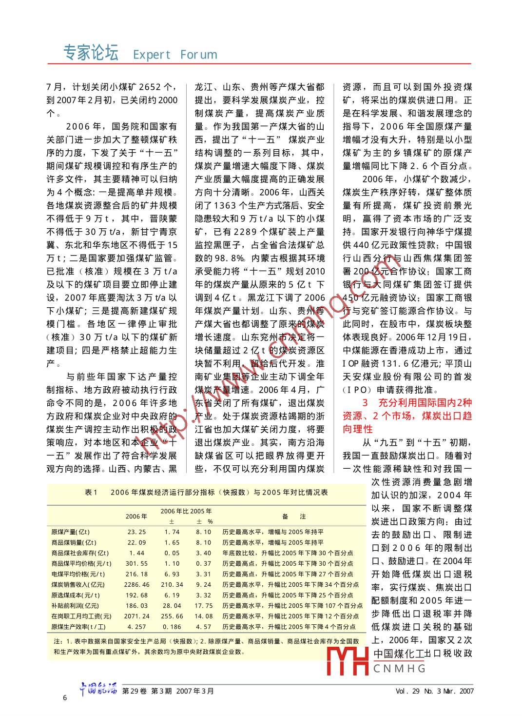 Expert For um專家論壇2006年煤炭經(jīng)濟(jì)運(yùn)行評析潘偉爾.(國家煤礦安全監(jiān)察局調(diào)度中心,北京100713)摘要:“十一五”開局的2006年,煤炭經(jīng)濟(jì)運(yùn)行“開門紅”。煤炭供應(yīng)保證了國家經(jīng)濟(jì)和社會發(fā)展的需求,產(chǎn)量、銷量、庫存、價格變化幅度都不大,煤礦安全生產(chǎn)狀況明顯好轉(zhuǎn),成本向合理化方向變化,煤炭經(jīng)濟(jì)平穩(wěn)增長。特別是國家出臺了一系列煤炭新政策:開始煤炭可持續(xù)發(fā)展政策試點(diǎn),擴(kuò)大煤炭有償使用試點(diǎn)和調(diào)整煤炭進(jìn)出口稅率等。這些新政策為“十-五”的煤炭經(jīng)濟(jì)發(fā)展提出了科學(xué)發(fā)展、和諧發(fā)展的方向和路徑。以此為標(biāo)志,我國煤炭經(jīng)濟(jì)進(jìn)入理性調(diào)整期,2007年煤炭經(jīng)濟(jì)運(yùn)行將在理性調(diào)整中取得新成效。關(guān)鍵詞:煤炭;經(jīng)濟(jì)運(yùn)行;評析中圖分類號: F407. 21文獻(xiàn)標(biāo)識碼: A文章編號: 1003- 2355( 2007) 03- 0005- 07Abstract: The year of 2006as the first year for the 11th Five- Year P| an has wi tnessed the vi gor ousbegi nni ng on econonnc oper ati onof coal industry. It was denonstrat ed by howthe coal supply net the denandof nati onal econoninc andsoci al devel opnent, the out put-sal es andstockvol une as well as the pri ce renai nedstabl e, coal ni ne saf ety turnedfor the bett er noti ceabl y and the sound i ncrenent of coal econony VBS achi evedwiththe rati onal cost. Inparti cul ar, the central governnent has al ready pr onal gatedaseri es of newpolici esoncoal industryincI udi ng pilot spot for pol i cy inpl enent ati on of sust ai nabl e devel opnent, and outstretchprogramof coal use ina payablevey, as well as adj ustnent ontaxationof coal inport andexport etc. AII ofthosepolicieswll bri ng forvardthe ori ent ati onand course of sci entific and har noni ous devel opnent for coali ndustry, whi ch heral ds the begi nni ng of a rati onal adj ustnent of coal econony. The year of 2007will achi evenewpr ogr ess inthe econonc operati onof coal i ndustry.Key words: coal; econoninc operat i on; anal ysi S1煤炭供應(yīng)滿足國家需約1.8億t的情況下,煤炭供應(yīng)“十五”期間特別是2003、要,煤炭經(jīng)濟(jì)運(yùn)行平穩(wěn)增長保證了國民經(jīng)濟(jì)和社會發(fā)展的2004年,在煤炭嚴(yán)重供不應(yīng)求我國煤炭供需關(guān)系由2005需要。這是近幾年煤礦生產(chǎn)和鐵的市場刺激下,-些地方上了不年的緩和轉(zhuǎn)向2006年的基本平路運(yùn)輸、港口轉(zhuǎn)運(yùn)能力都增加的少小煤礦,一些已經(jīng)關(guān)閉的小煤衡。其主要表現(xiàn)是主要用煤行業(yè)可喜收獲。與此同時,煤炭經(jīng)濟(jì)礦也死灰復(fù)燃。2005年9月,國沒有出現(xiàn)2005年那樣的煤炭供應(yīng)運(yùn)行平穩(wěn)增長,主要經(jīng)濟(jì)指標(biāo)如家整頓礦業(yè)開發(fā)秩序,煤炭產(chǎn)業(yè)緊張局面,煤炭社會庫存沒有下表1所示。作為重點(diǎn)整頓對象。特別是降。2006 年我國GDP增速大大超2006年煤炭經(jīng)濟(jì)運(yùn)行的良2005年以來,安全生產(chǎn)監(jiān)管部過國家8%的目標(biāo),高達(dá)10.7%好表現(xiàn)得益于相關(guān)方面近幾年,門不斷加大關(guān)閉非法小煤礦力主要用煤行業(yè)火電、粗鋼、水特別是2006年科學(xué)發(fā)展、和諧度。從2005年8月到2006年6泥、化肥產(chǎn)品產(chǎn)量繼續(xù)保持高速發(fā)展觀的實(shí)踐月,全國共關(guān)閉煤礦5931個,淘增長,特別是電煤需求激增。在2煤炭生產(chǎn)由無序趨向汰非法和落后煤炭生產(chǎn)能力1.1全年煤炭需求量比2005年增加有序億t;從2006年7月到2007年收稿日期: 2007- 03- 01作者簡介:潘偉爾,博士,教授級高級工程師,高級經(jīng)濟(jì)師。中國煤化工MHCNMHGVol. 29 Nb. 3Nar. 2007第29卷第3期2007年3月中圓能潘.專家論壇Expert For um7月,計劃關(guān)閉小煤礦2652個,龍江、山東、貴州等產(chǎn)煤大省都資源,而且可以到國外投資煤到2007年2月初,已關(guān)閉約2000提出,要科學(xué)發(fā)展煤炭產(chǎn)業(yè),控礦,將采出的煤炭供進(jìn)口用。正制煤炭產(chǎn)量,提高煤炭產(chǎn)業(yè)質(zhì)是在科學(xué)發(fā)展、和諧發(fā)展理念的2006年,國務(wù)院和國家有量。作為我國第-產(chǎn)煤大省的山指導(dǎo)下,2006年全國原煤產(chǎn)量;關(guān)部門進(jìn)-步加大了整頓煤礦秩西,提出了“十一五”煤炭產(chǎn)業(yè)增幅才沒有大升,特別是以小型序的力度,下發(fā)了關(guān)于“十一五”結(jié)構(gòu)調(diào)整的一系列目標(biāo),其中,煤礦為主的鄉(xiāng)鎮(zhèn)煤礦的原煤產(chǎn)期間煤礦規(guī)模調(diào)控和有序生產(chǎn)的煤炭產(chǎn)量增速大幅度下降、煤炭量增幅同比下降2.6個百分點(diǎn)。許多文件,其主要精神可以歸納產(chǎn)業(yè)質(zhì)量大幅度提高的正確發(fā)展2006年,小煤礦個數(shù)減少,為4個概念:-是提高單井規(guī)模。方向十分清晰。2006年,山西關(guān)煤炭生產(chǎn)秩序好轉(zhuǎn),煤礦整體質(zhì)各地煤炭資源整合后的礦井規(guī)模閉了1363個生產(chǎn)方式落后、安全量有所提高,煤礦投資前景光不得低于9萬t,其中,晉陜蒙隱患較大和9萬t/a以下的小煤明,贏得了資本市場的廣泛支不得低于30萬t/a,新甘寧青京礦,已有2289個煤礦裝上產(chǎn)量持。國家開發(fā)銀行向神華寧煤提冀、東北和華東地區(qū)不得低于15監(jiān)控黑匣子,占全省合法煤礦