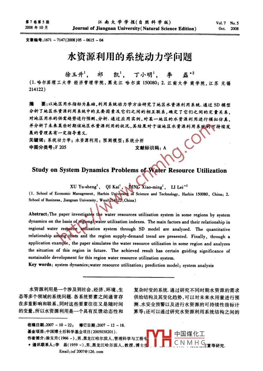 第7卷第5期江南大學(xué)學(xué)報(bào)(自然科學(xué)版)No 5008年10月Journal of Jiangnan University( Natural Science Edition)文章編號(hào):1671-7147(2008)05-0615-04水資源利用的系統(tǒng)動(dòng)力學(xué)問題徐玉升,祁凱,丁小明,李磊”2(1.哈爾濱理工大學(xué)經(jīng)濟(jì)管理學(xué)院,黑龍江哈爾濱150080;2.江南大學(xué)商學(xué)院,江蘇無錫214122)摘要:以地區(qū)用水指標(biāo)為基礎(chǔ),利用系統(tǒng)動(dòng)力學(xué)方法研究了地區(qū)水資源利用系統(tǒng).通過SD模型分析了地區(qū)水資源利用系統(tǒng)中的主要因素及它們之間的相互聯(lián)系,確定了它們之間的定量關(guān)系,對地區(qū)用水的供需趨勢進(jìn)行預(yù)測、分析.通過應(yīng)用實(shí)例,對某一地區(qū)的水資源利用進(jìn)行模擬仿真,并分析了未來某些時(shí)期該地區(qū)水資源利用的狀況,其結(jié)果對于該地區(qū)水資源利用系統(tǒng)的可持續(xù)發(fā)展的管理具有一定指導(dǎo)意義關(guān)鍵詞:系統(tǒng)動(dòng)力學(xué);水資源利用;預(yù)測模型;系統(tǒng)分析中圖分類號(hào):F205文獻(xiàn)標(biāo)識(shí)碼:AStudy on System Dynamics Problems of Water Resource UtilizationXU Yu-sheng, QI Kai, DING Xiao-ming, LI Lei2(1. School of Economic Management, Harbin University of Science and Technology, Harbin 150080, China: 2.School of Business, Jiangnan University, Wuxi 214122, China)Abstract: The paper investigates the water resources utilization system in some regions by systemon the basis of regional water utilization indexes. The main factors and their relationship inregional water resource utilization system through SD model are analyzed. The quantitativerelationship among them and the region supply-demand trend are presented. Finally, through aapplication example, the paper simulates the water resource utilization in some region and analyzesthe situation of this region in future. The achieved result has certain guiding significance ofsustainable development for this region water resource utilization systemKey words: system dynamics; water resource utilization; prediction model; system analysis水資源利用是一個(gè)涉及到社會(huì)、經(jīng)濟(jì)、環(huán)境、生復(fù)雜時(shí)變的系統(tǒng)通過研究不同時(shí)期水資源的需求態(tài)等多個(gè)領(lǐng)域的系統(tǒng)問題各系統(tǒng)要素之間通常存供給結(jié)構(gòu)及其變化趨勢,可以對未來水用量進(jìn)行預(yù)在多重影響和聯(lián)系,同時(shí)這些要素往往又是隨時(shí)間測、水安全預(yù)警以及進(jìn)行水資源的可持續(xù)性指標(biāo)計(jì)的變量所以水資源利用是一個(gè)具有反饋動(dòng)態(tài)性和算等還可以通過研究水資源利用系統(tǒng)結(jié)構(gòu)之間的收稿日期:2007-10-22;修訂日期:200-12-18基金項(xiàng)目:中國博士后科學(xué)基金項(xiàng)目(2005038201)中國煤化工作者簡介:徐玉升(1966-),男黑龍江哈爾濱人,管理科學(xué)與工程章通訊聯(lián)系人:李磊(1959-),男,黑龍江哈爾濱人,教授博士生CNMHG置等研究Email:inf2007@126.com616江南大學(xué)學(xué)報(bào)(自然科學(xué)版第7卷相互影響關(guān)系,對以后的水資源利用作出規(guī)劃和結(jié)水子系統(tǒng)S3和污水回用子系統(tǒng)S等用數(shù)學(xué)表達(dá)式構(gòu)性調(diào)整等.正是基于這種思想,文中采用系統(tǒng)動(dòng)表示地區(qū)水資源利用系統(tǒng):力學(xué)的方法,結(jié)合我國水利主要指標(biāo)對地區(qū)水資源s={S1,S2,S3,S4利用進(jìn)行系統(tǒng)分析,并建立了系統(tǒng)動(dòng)力學(xué)模型地區(qū)水資源利用系統(tǒng)中,水資源的使用量一般包括兩個(gè)部分,即需水量和耗水量.人口用水子系1研究方法統(tǒng)中,人口數(shù)量和人均用水量是其最主要的兩個(gè)影系統(tǒng)動(dòng)力學(xué)是以微分方程為理論工具,分析研響因素,人口數(shù)量又與自然增長率和遷移率等有究信息反饋系統(tǒng)的學(xué)科口.系統(tǒng)動(dòng)力學(xué)最突出的特關(guān),而人均用水則跟地區(qū)的水資源量和經(jīng)濟(jì)發(fā)展水點(diǎn)是能夠處理高階層、非線性多重反饋復(fù)雜時(shí)變平等問題有關(guān);工業(yè)用水子系統(tǒng)中,涉及到的系統(tǒng)問題,采取定性與定量相結(jié)合的研究方法業(yè)產(chǎn)值用水量、工業(yè)產(chǎn)值、工業(yè)耗水率等有關(guān)問題在對問題進(jìn)行分析時(shí),強(qiáng)調(diào)系統(tǒng)動(dòng)態(tài)和反饋,并使農(nóng)業(yè)子系統(tǒng)中為了和統(tǒng)計(jì)年鑒以水資源公報(bào)中的三者結(jié)合起來同時(shí)強(qiáng)調(diào)系統(tǒng)的機(jī)構(gòu)決定系統(tǒng)的功用水指標(biāo)相統(tǒng)一,文中主要考察了灌溉用水,其中能23).對于系統(tǒng)問題,特別是復(fù)雜的大系統(tǒng)來說農(nóng)村人口用水和畜牧用水在人口子系統(tǒng)中體現(xiàn);污利用系統(tǒng)動(dòng)力學(xué)的觀點(diǎn)和思想進(jìn)行研究往往非?!に赜米酉到y(tǒng)中,包括污水排放量污水回用量、環(huán)有效,系統(tǒng)動(dòng)力學(xué)已經(jīng)廣泛地應(yīng)用到包括水資源保投資等問題在內(nèi)的各個(gè)領(lǐng)域5需要說明的是,地區(qū)水資源利用系統(tǒng)SD模型在系統(tǒng)動(dòng)力學(xué)中微分方程組描述了系統(tǒng)各狀是以實(shí)際的水資源利用為基礎(chǔ)建立的,但畢竟不是態(tài)變量的變化率(流率)對個(gè)狀態(tài)變量(流位變量實(shí)際系統