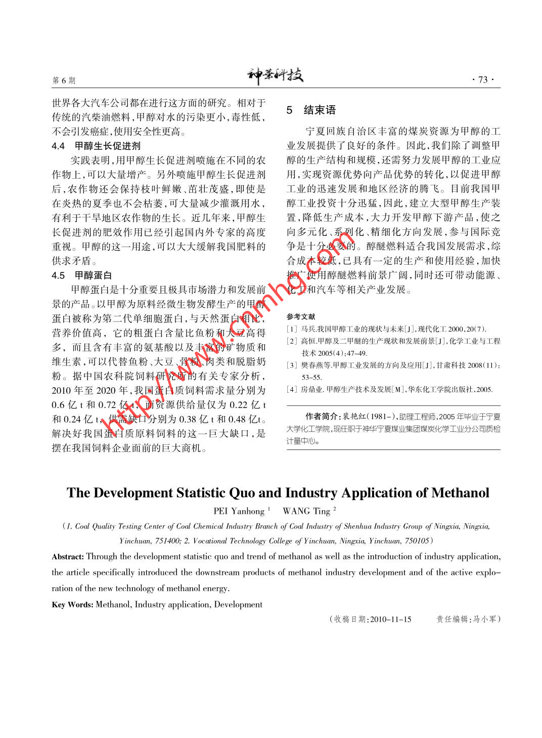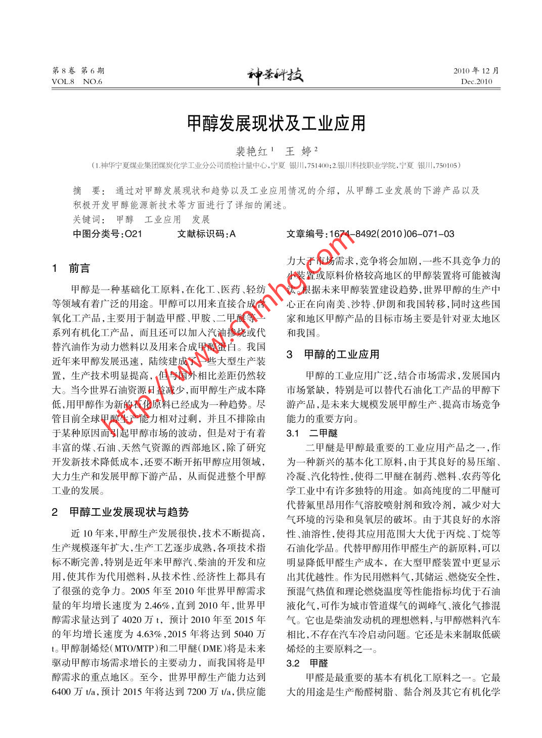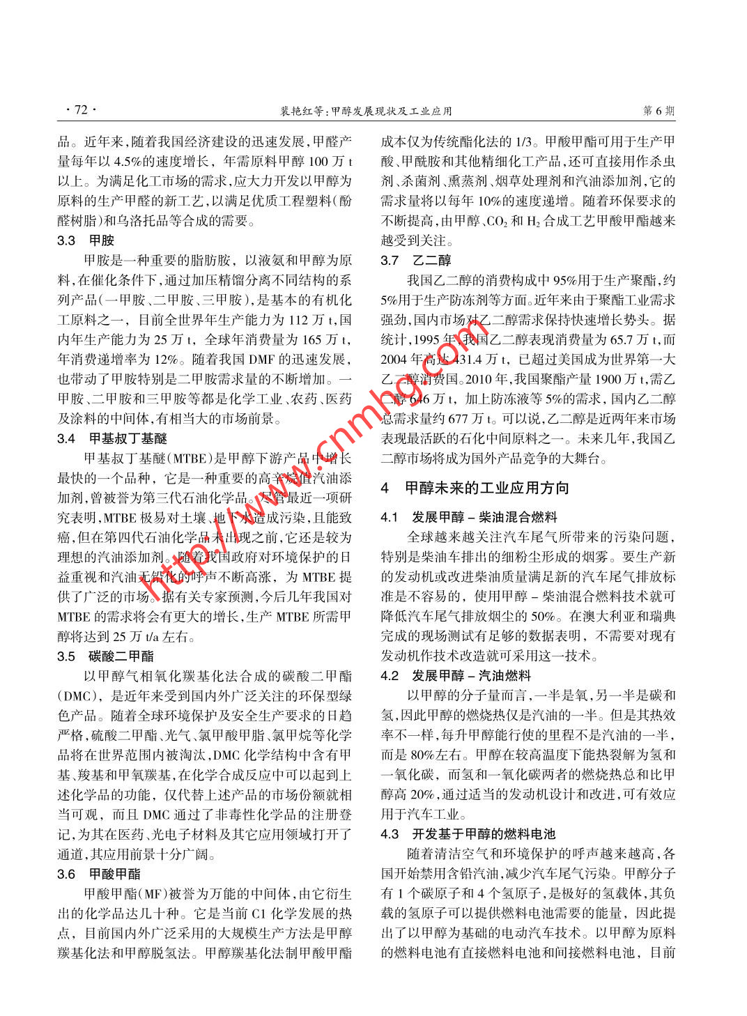 第8卷第6期神蕭科技2010年12月VOL8 NO.6Dec.2010甲醇發(fā)展現(xiàn)狀及工業(yè)應(yīng)用裴艷紅1王婷2(1.神華寧夏煤業(yè)集團(tuán)煤炭化學(xué)工業(yè)分公司質(zhì)檢計(jì)量中心,寧夏銀川,751400;2.銀川科技職業(yè)學(xué)院, 寧夏銀川,750105)摘要:通過對甲醇發(fā)展現(xiàn)狀和趨勢以及工業(yè)應(yīng)用情況的介紹,從甲醇工業(yè)發(fā)展的下游產(chǎn)品以及積極開發(fā)甲醇能源新技術(shù)等方面進(jìn)行了詳細(xì)的闡述。關(guān)鍵詞:甲醇工業(yè)應(yīng)用發(fā)展中圖分類號:021文獻(xiàn)標(biāo)識碼:A文章編號:1674-8492(2010 )06- -071-03力大于市場需求,競爭將會加劇,一些不具競爭力的.1前言小裝置或原料價(jià)格較高地區(qū)的甲醇裝置將可能被淘甲醇是--種基礎(chǔ)化工原料,在化工、醫(yī)藥、輕紡汰。根據(jù)未來甲醇裝置建設(shè)趨勢,世界甲醇的生產(chǎn)中等領(lǐng)域有著廣泛的用途。甲醇可以用來直接合成含心正在向南美、沙特、伊朗和我國轉(zhuǎn)移,同時(shí)這些國氧化工產(chǎn)品,主要用于制造甲醛、甲胺、二甲醚等- -家和地區(qū)甲醇產(chǎn)品的目標(biāo)市場主要是針對亞太地區(qū)系列有機(jī)化工產(chǎn)品,而且還可以加入汽油摻燒或代和我國。替汽油作為動力燃料以及用來合成甲醇蛋白。我國.3甲醇的工業(yè)應(yīng)用近年來甲醇發(fā)展迅速,陸續(xù)建成了- .些大型生產(chǎn)裝置,生產(chǎn)技術(shù)明顯提高,但與國外相比差距仍然較甲醇的工業(yè)應(yīng)用廣泛,結(jié)合市場需求,發(fā)展國內(nèi)大。當(dāng)今世界石油資源日益減少,而甲醇生產(chǎn)成本降市場緊缺,特別是可以替代石油化工產(chǎn)品的甲醇下低,用甲醇作為新的石化原料已經(jīng)成為- -種趨勢。盡游產(chǎn)品,是未來大規(guī)模發(fā)展甲醇生產(chǎn)、提高市場競爭管目前全球甲醇生產(chǎn)能力相對過剩,并且不排除由能力的重要方向。于某種原因而引起甲醇市場的波動,但是對于有著3.1二甲醚豐富的煤、石油、天然氣資源的西部地區(qū),除了研究二甲醚是甲醇最重要的工業(yè)應(yīng)用產(chǎn)品之--,作開發(fā)新技術(shù)降低成本,還要不斷開拓甲醇應(yīng)用領(lǐng)域,為-.種新興的基本化工原料,由于其良好的易壓縮、大力生產(chǎn)和發(fā)展甲醇下游產(chǎn)品,從而促進(jìn)整個(gè)甲醇冷凝、汽化特性,使得二甲醚在制藥燃料.農(nóng)藥等化工業(yè)的發(fā)展。學(xué)工業(yè)中有許多獨(dú)特的用途。如高純度的二甲醚可代替氟里昂用作氣溶膠噴射劑和致冷劑,減少對大2甲醇工業(yè)發(fā)展現(xiàn)狀與趨勢氣環(huán)境的污染和臭氧層的破壞。由于其良好的水溶近10年來,甲醇生產(chǎn)發(fā)展很快,技術(shù)不斷提高,性、油溶性,使得其應(yīng)用范圍大大優(yōu)于丙烷、丁烷等生產(chǎn)規(guī)模逐年擴(kuò)大,生產(chǎn)工藝逐步成熟,各項(xiàng)技術(shù)指石油化學(xué)品。代替甲醇用作甲醛生產(chǎn)的新原料,可以標(biāo)不斷完善,特別是近年來甲醇汽、柴油的開發(fā)和應(yīng)明顯降低甲醛生產(chǎn)成本,在大型甲醛裝置中更顯示用,使其作為代用燃料,從技術(shù)性、經(jīng)濟(jì)性上都具有出其優(yōu)越性。作為民用燃料氣,其儲運(yùn)、燃燒安全性,了很強(qiáng)的競爭力。2005年至2010年世界甲醇需求預(yù)混氣熱值和理論燃燒溫度等性能指標(biāo)均優(yōu)于石油量的年均增長速度為2.46%,直到2010年,世界甲液化氣,可作為城市管道煤氣的調(diào)峰氣、液化氣摻混醇需求量達(dá)到了4020萬t,預(yù)計(jì)2010年至2015年氣。它也是柴油發(fā)動機(jī)的理想燃料,與甲醇燃料汽車的年均增長速度為4.63% ,2015年將達(dá)到5040萬相比,不存在汽車?yán)?啟動問題。它還是未來制取低碳t。甲醇制烯烴( MTO/MTP )和二甲醚( DME )將是未來烯烴的主要原料之一。驅(qū)動甲醇市場需求增長的主要?jiǎng)恿?,而我國將是?3.2 甲醛醇需求的重點(diǎn)地區(qū)。至今,世界甲醇生產(chǎn)能力達(dá)到甲醛是最重要的基本有機(jī)化工原料之-一。 它最6400萬ta,預(yù)計(jì)2015年將達(dá)到7200萬t/a,供應(yīng)能大的用途 是生產(chǎn)酚醛樹脂、黏合劑及其它有機(jī)化學(xué).●72●裴艷紅等:甲醇發(fā)展現(xiàn)狀及工業(yè)應(yīng)用第6期品。近年來,隨著我國經(jīng)濟(jì)建設(shè)的迅速發(fā)展,甲醛產(chǎn)成本僅為傳統(tǒng)酯化法的1/3。甲酸甲酯可用于生產(chǎn)甲量每年以4.5%的速度增長,年需原料甲醇100萬t酸、甲酰胺和其他精細(xì)化工產(chǎn)品,還可直接用作殺蟲以上。為滿足化工市場的需求,應(yīng)大力開發(fā)以甲醇為劑、殺菌劑、熏蒸劑、煙草處理劑和汽油添加劑,它的原料的生產(chǎn)甲醛的新工藝,以滿足優(yōu)質(zhì)工程塑料(酚需求量將以每年10%的速度遞增。隨著環(huán)保要求的醛樹脂)和烏洛托品等合成的需要。不斷提高,由甲醇.CO2和H2合成工藝甲酸甲酯越來3.3 甲胺越受到關(guān)注。甲胺是- -種 重要的脂肪胺,以液氨和甲醇為原3.7乙二醇料,在催化條件下,通過加壓精餾分離不同結(jié)構(gòu)的系我國乙二醇的消費(fèi)構(gòu)成中95%用于生產(chǎn)聚酯,約列產(chǎn)品(一甲胺、二甲胺、三甲胺),是基本的有機(jī)化5%用于生產(chǎn)防凍劑等方面。近年來由于聚酯工業(yè)需求工原料之一,目前全世界年生產(ch