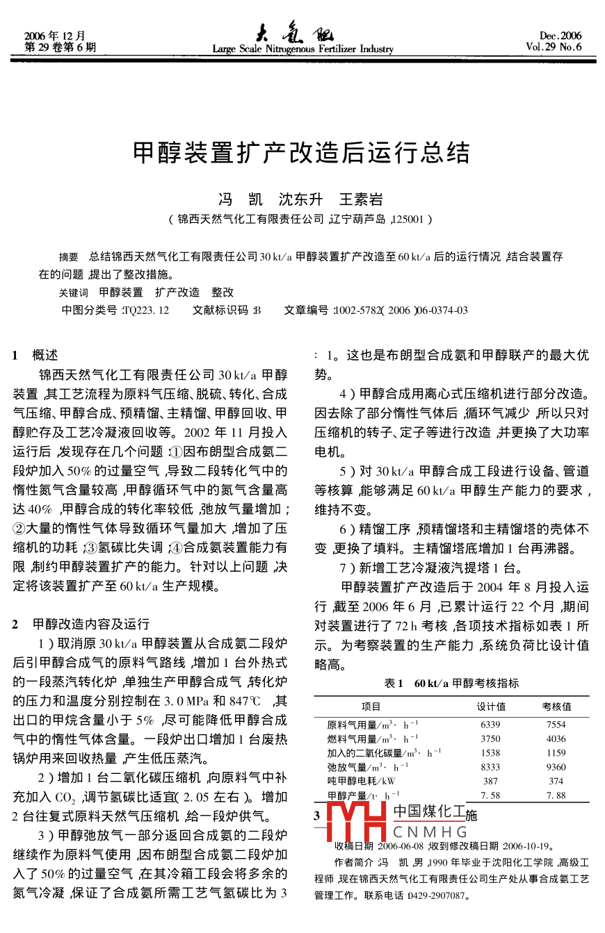 甲醇裝置擴產改造后運行總結
