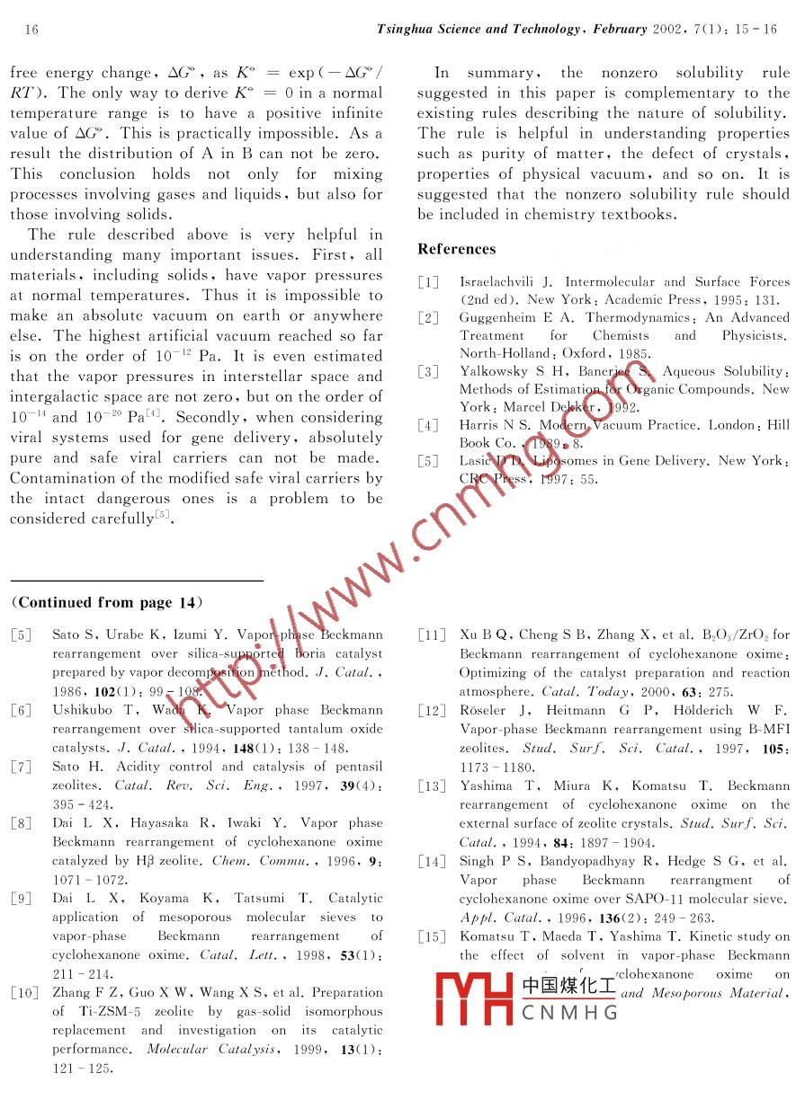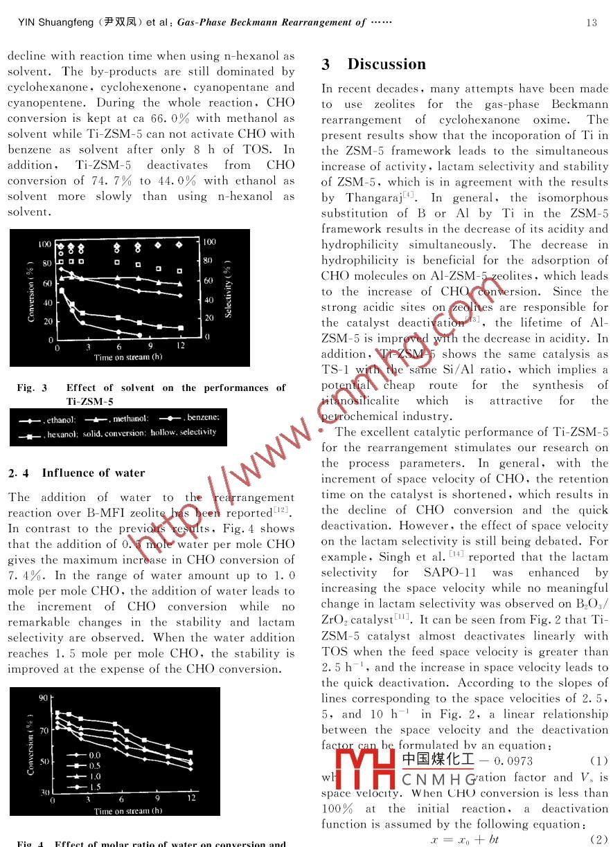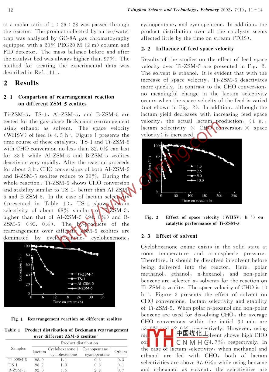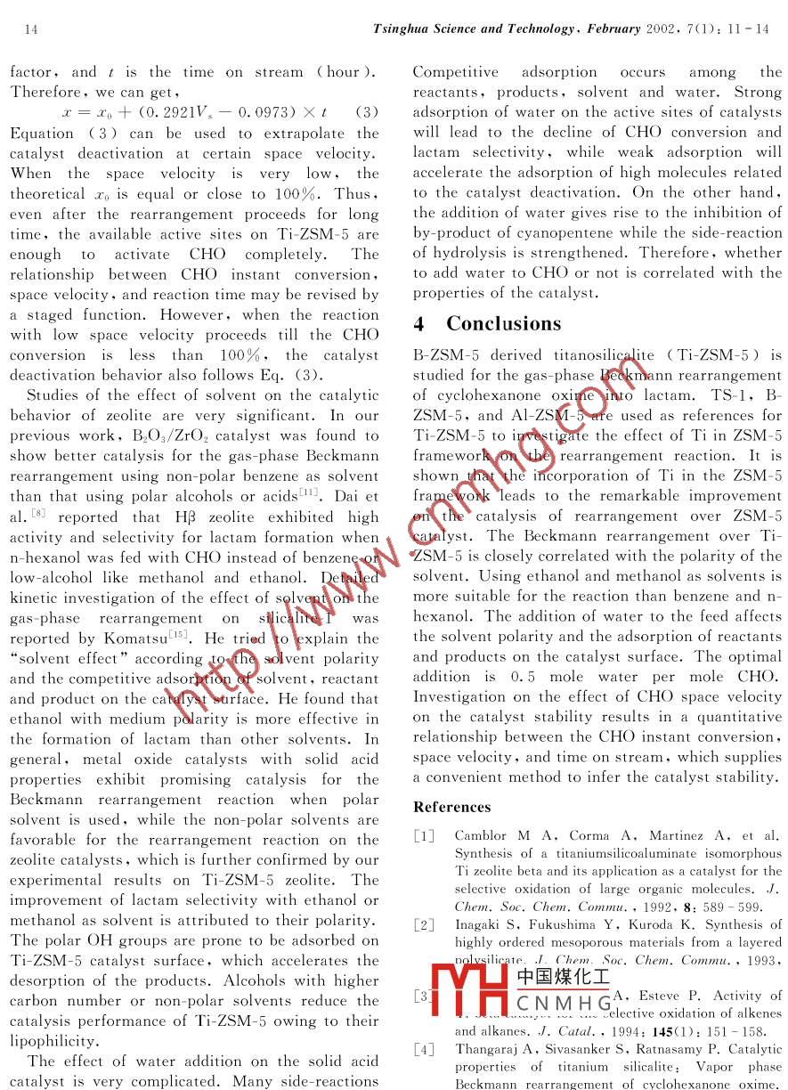 TSINGHUA SCIENCE AND TECHNOLOGYISSN 1007-0214 03/21pp11 - 14Volume 7,Number 1,F(xiàn)ebruary 2002Gas-Phase Beckmann Rearrangement of CyclohexanoneOxime over B-ZSM-5 Derived Titanosilicalite .YIN Shuangfeng (尹雙鳳)**,ZHANG Fazhi ( 張法智),XU Boqing (徐柏慶)State Key Laboratory of C, Chemical Technology, Department of Chemistry .Tsinghua University, Beijing 100084, ChinaAbstract: Four different ZSM-5 zeolites are tested for the gas- phase Beckmann rearrangement ofcyclohexanone oxime (CHO) into lactam. B ZSM-5 derived titanosilicalite (Ti-ZSM-5) exhibits catalyticperformances comparable to hydrothermally synthesized titanosilicalite (TS- 1),much better than B ZSM-5 andAl-ZSM-5. The effect of reaction conditions (solvent, feed space velocity, and water) on the catalyticperformance of Ti-ZSM-5 is studied. It is found that a quantitative relationship exists among the feed spacevelocity, the reaction time, and the CHO constant conversion. Ethanol or methanol as solvent shows higheractivity,lactam selectivity, and stability than benzene and n _hexanol. The addition of water to therearrangement with a maximum amount of 1. 0 mole per mole CHO results in the increase of CHO conversionwhile no meaningful changes in lactam selectivity and stability are observed.Key words :titanosilicalite; gas _phase Beckmann rearrangement; cyclohexanone oxime ; lactam; B. ZSM-5zeolitetitanosilicalite by allowing TiCl4 gas to react withIntroductionB- ZSM-5 zeolite is reported here, and theDue to its remarkable catalysis, titanosilicalite hasrearrangement reaction over the titanosilicalite isattractedconsiderableattentionTitano-investigated.silicalite-1prepared by hydrot hermal synthesis[4exhibits much better catalytic performance for the1 Experimentalgas- phaseBeckmannrearrangementofA sample of Ti-ZSM-5 (molar ratio of Si/Ti= 97)cyclohexanone oxime ( CHO ) into lactam thanwas prepared by allowing TiCl4 gas to react with B-other solid catalysts, such as silicalite-1[4], B2O3/ZSM-5 zeolite. Standard titanosilicalite designatedZrO2[5],Ta2O./SiO.0], HZSM-57, Hβ[8], andas TS-1 with the same molar Si/Ti ratio as Ti-HMCM-41[9. However, it is surprising that only .ZSM-5 washydrothermally synthesized usingtwo papers have been published on the researchtetrapropylammonium hydroxide as a templatingaboutthereactionusingagent. The detailed preparation was described intitanosilicalites as catalysts. In addition,it is veryRef. [10]. Fourier- transform-infrared (FT-IR ),expensive to synthesize titanosilicalite usingultra-violet-visible ( UV-Vis ),andX-raydiffraction ( XRD ) techniques confirmed thelocation of Ti of Ti-ZSM-5 or TS-1 in theagent.A cheap and simple method for the synthesis of7SM5 rorlite. For facilitating theinv中國煤化工ionof Ti,Al-ZSM-5(rMYHCNM H G) and B ZSM-5 (molarReceived: 2001-04-04, revised: 2001-05-28ratio of Si/B = 10 ) zeolites were prepared by* Supported by the Foundations for Basic Research ofhydrot hermalsynt hesis.Tsinghua University and of China Petrochemicalrearrangement of CHO was carried out at 380CCompanyunder atmospheric pressure in a downflow,vertical* * Towhr*數(shù)雅pondence should be addressed. E mailtubular Pyrex reactor. The catalyst loading wasaddress: 4402@ 263. net.0.125 g. A mixture of CHO, solvent and nitrogen12Tsinghua Science and Technology, February 2002,7(1): 11- 14at a molar ratio of 1 : 26 : 28 was passed throughcyanopentane,and cyanopentene. In addition, ththe reactor. The product collected by an ice/waterproduct distribution over all the catalysts seemstrap was analyzed by GC- 8A gas chromatographyaffected little by the time on stream (TOS).equipped with a 20% PEG20 M (2 m) column and2.2 Influence of feed space velocityFID detector. The mass balance before and afterthe catalyst bed was always higher than 97%. TheResults of the studies on the effect of feed spacemethod for treating the experimental data wasvelocity over Ti- ZSM-5 are presented in Fig. 2.described in Ref. [11].The solvent is ethanol. It is evident that with theincrease of space velocity, Ti-ZSM-5 deactivates2Results .more quickly. In contrast to the CHO conversion ,1o meaningful change in the lactam selectivity2. 1Comparison of rearrangement reactionoccurs when the space velocity of the feed is variedon different ZSM-5 zeolites(not shown in Fig. 2). In addition, although theTi-ZSM-5,TS-1,Al-ZSM-5,and B ZSM-5 arelactam yield decreases with increasing feed spacetested for the gas-phase Beckmann rearrangementvelocity,the actual lactam production, (i. e.using ethanol as solvent.‘ The space velocitylactam selectivity X CHO conversion X space(WHSV) of feed is 4.5 h'. Figure 1 presents thevelocity) is increased.time course of these catalysts. TS-1 and Ti-ZSM-5100with CHO conversion no less than 82. 0% can lastfor 33 h while Al-ZSM-5 and B- ZSM-5 zeolites8Ideactivate very rapidly. After the reaction proceedsfor about 3 h, CHO conversions of both Al -ZSM-56Mand B ZSM-5 zeolites reduce to 30%. During thewhole reaction, Ti- ZSM-5 shows CHO conversionand stability similar to TS-1, better than Al-ZSM-5 and B -ZSM-5. In the case of lactam selectivity0 10015X 250Time on streamn h( presented in Table 1 ),TS-1 shows lactamselectivity of about 98% similar to Ti-ZSM-5,higher than that of Al-ZSM-5 (94. 0%) and B-Fig. 2Effect of space velocity ( WHSV,h-1) onZSM-5( 92. 0%). The by-products of thecatalytic performance of Ti ZSM-5rearrangement over different ZSM-5 zeolites aredominated by cyclohexanone, cyclohexenone ,2.3 Effect of solventCyclohexanone oxime exists in the solid state atroom temperature andatmosphericpressure. .Therefore, it should be dissolved in solvent beforebeing delivered into the reactor. Here, polar40Ti-ZSM-5methanol,ethanol, n-hexanol, and non-polarTS-Ibenzene are selected as solvents for the reaction onAl ZSM-5B-ZSM-5Ti-ZSM-5 zeolite. The space velocity of CHO is 10121826h-'. Figure 3 presents the effect of solvent onTime on stream (h)CHO conversions, lactam selectivity and stabilityof Ti-ZSM