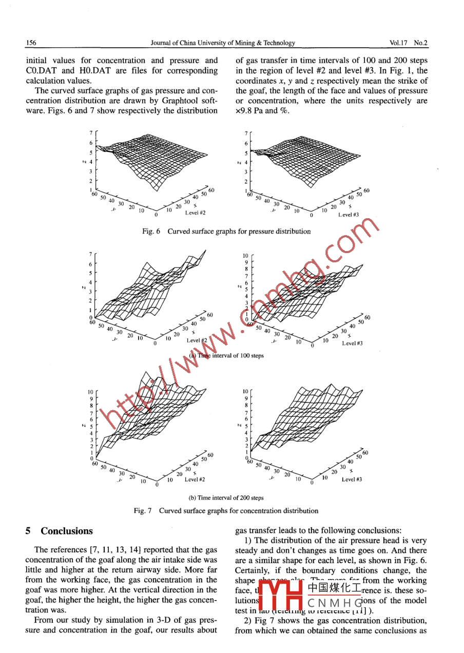Jun. 2007Joural of China University of Mining & TechnologyVol.17 No.2Available online at www.sciencedirect.comSCIENCE*@o)DIRECT.J China Univ Mining & Technol 2007, 17(2): 0152 - 0157.Study of 3-D Numerical Simulation forGas Transfer in the Goaf of the Coal MiningWU Zheng-yan, JIANG Shu-guang, HE Xin-jian, WANG Lan-yun, LIN Bai quanSchool of Mining and Safety Engineering, China University of Mining & Technology, Xuzhou, Jiangsu 221008, ChinaAbstract: In order to simulate field distribution rules, mathematical models for 3-D air flows and gas transfer in thegoaf of the coal mining are established, based on theories of permeability and dynamic dispersion through porous media.A gas dispersion equation in a 3-D ficld is calculated by use of numerical method on a weighted upstream multi-elementbalance. Based on data of an example with a U type ventilation mode, surface charts of air pressure distribution and gasconcentration are drawn by Graphtoo software. Finally, a comparison between actually measured results in the modeltest and the numerical simulation results is made to proves the numerical implementation feasible.Key words: 3D numerical simulation of gas transfer in the goaf; air pressure distribution in the goaf; weighted upstreammulti-element balance numerical simulation methodCLC number: TD 712.5distributions degenerate into 2-D space. But most1 Introductionquestions cannot actually be regarded as 2-D spaceproblems. Therefore, some scholars have made someAt present, studies on gas distribution in the goafefforts in the study of 3-D steady flow seepage andof the coal mining largely rely on sketchy estimationgas concentration distributions', but few examplesby setting some gas measuring points in a goaf or byhave been reported.model test in the laboratory. But these two methodsIn numerical solutions for advection-diffusionare not very useful, which need a lot of time and ef-equations, there are some computational methods,fort. With the development of computer technology,such as the traditional Galerkin finite element methodthe numerical simulation method has become a majorand finite difference method. The Galerkin finiteresearch method for gas transfer.element method is based on the principle of variation,In the aspect of the theoretical analyses, manysuch as principle of minimum potential energy andscholars have gradually come to realize that the es-principle of virtual work. Finite difference methods insence of gas tansfer and gas concentration distribu-the unit network, such as a triangle network, aretion in the goaf is that matter moves and diffuses in abased on an integral conservation law. With advec-porous medium and they can analyze it qualitativelytion as leader, there are bad numerical oscillations, In the early 1960's, Shi-ning Zhou was the firstwhen these methods are applied. S. V. Patankar sug-to apply Darcy's law to the gas flow in the coal seams.gested that there were some falsehood numerical OS-Later air flow in the goaf was regarded as a 2-D,cillations in some numerical methods when the Pecletsteady and incompressible potential energy flow andnumber is comparatively large. Herich and Zienki-a flow field distributions were obtained by analyticalwicz gave a windward numerical solution to elimi-methods. For more complicated geometric boundaries,nate falsehood numerical oscillations. Sun and Yehnumerical examples were obtained by finite element(1983) advanced a weighted upstream method basedmethods. These days empirical and semi empiricalon a multi-element balance to add an upstream weightformulas of gas dispersion and distribution laws arefunction directly to the basis sets, which made thebeing developed5 o0. The above studies are all basedwindw:中國煤化工popular and con-on ideal cases where air flows and gas concentrationvenientReceived 13 June 200; accepted 10 November 2006YHCNMHGProjects 50534090 and 50674090 supported by the National Natural Science Foundation of China and 2005CB221503 by the National Key Basic ResearchDevelopment Program (973 Program)Corresponding author. Tel: +86 516 83885156; E-mnail adress: wzy. 1998@ 163.comWU Zheng-yanetalStudy of 3-D Numerical Simulation for Gas Transfer in the Goaf of the Coal Mining153To simulate more truthfully the laws of air flowsaC。+1a =div(DgradC,)-v . gradC。(2)and gas transfers, we established a 3-D mathematicalmodel of an unstable, compressible and multicom-where C。 is the concentration of the a component,ponent air flow and gas transfer, based on the data ofIa the source or sink of the a component, D the dy-model test in lab by Jiang (1994) and Jiang and Wangnamic dispersion coefficient tensor of flow force, V(1995)911. Our numerical research on the multi-the average flow velocity when air is flowing andcomponent gas transfer model is developed by av=q/n.weighted upstream multi-element balance method.The initial condition is that C。 =Cao(x, y, z).The first class boundary condition is that, if the2 Mathematical Model of Gas Transfer inconcentration in the boundary of the goaf is given,the Goafthen Ca =Can(xy,z,D).The second class boundary condition is that, if theDarcy's classical law is the basic start to studyconcentration dispersion flux of the a componentflows in porous media, and the Fick's diffusion lawin the boundary of the goaf is given, thendeals with the fluid hydrodynamic dispersion.- - DgradCa=f(x, y,Z, [).2.1 Establishment of air flow equation in theThe third class boundary condition is that, if thegoafflux of the a component of air in part of the bounda-Air flow in the goaf obeys approximately Darcy'sries of the goaf is given, then ( DgradC。- vCa )nlinearlaw. Connected with conservation of mass, the= f2(x,y,z,1).Navier- Stokes equation based on the theory of seep-In Eq. (1), the two parameters K and n must to beage is as follows:determined, both of which are functions of space co-pdiv(Kgradp)= nap+W(1)ordinates. K = kpg/u. k is the percolation rate in thegoaf andk = k(x, y, z) is a constant 