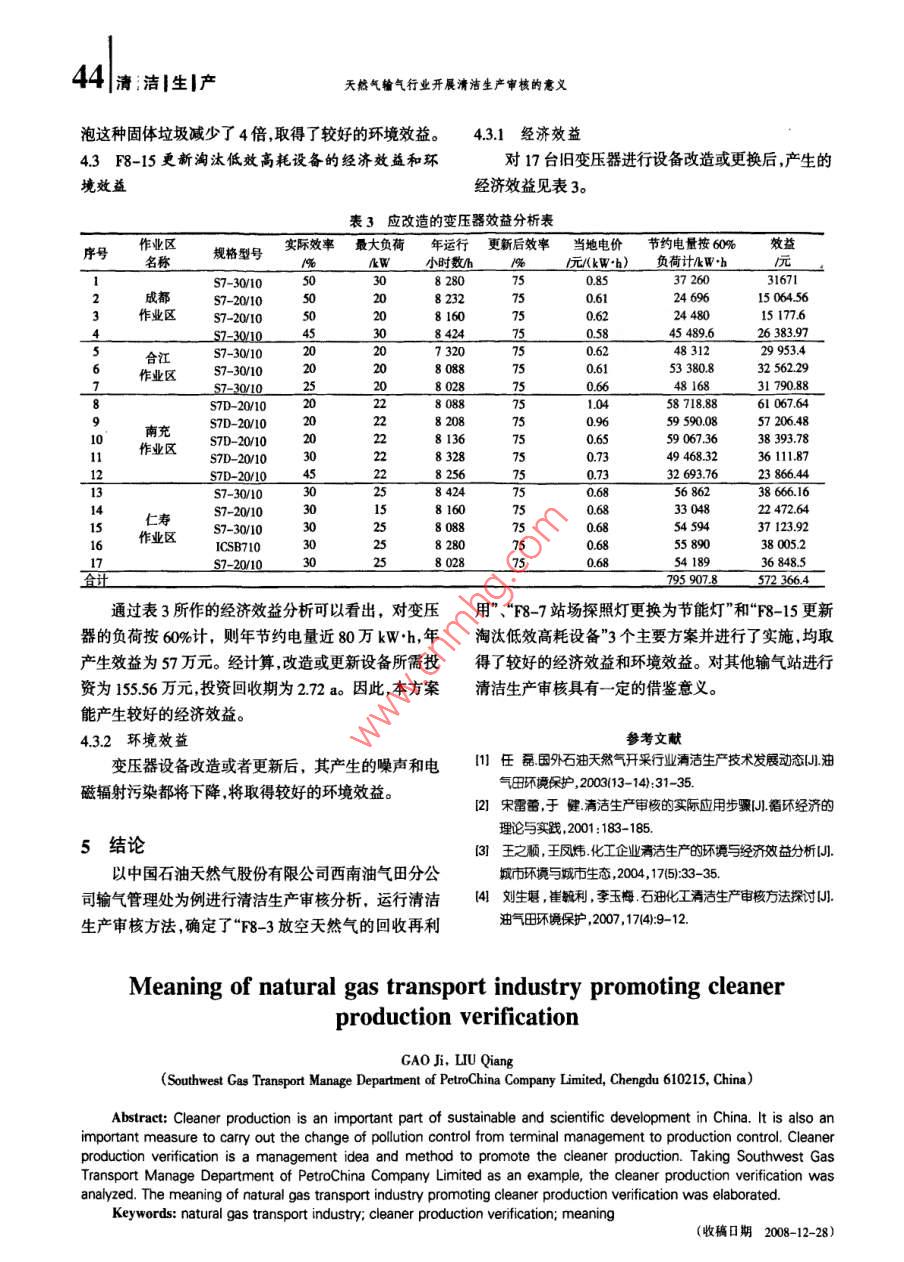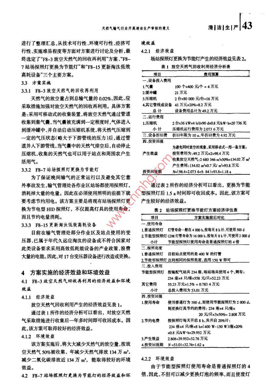 42|清清生|產(chǎn)天然氣輸氣行業(yè)開展清潔生產(chǎn)審核的意義天然氣輸氣行業(yè)開展清潔生產(chǎn)審核的意義高冀,劉強(qiáng)(西南油氣田分公司輸氣管理處,四川成都610215)摘要:清潔生產(chǎn)是我國持續(xù)發(fā)展和科學(xué)發(fā)展的一項(xiàng)重要內(nèi)容,也是實(shí)現(xiàn)我國污染控制重點(diǎn)曲末端治理向生產(chǎn)過程控制轉(zhuǎn)變的重要措施,而“清潔生產(chǎn)審核”是推行清漕生產(chǎn)的一科管理思路和方瀆。以中國石油天然氣股份有限公司西南油氣田分公司輸氣管理處為例進(jìn)行清潔生產(chǎn)審核分析,闡迷天然氣榆氣行業(yè)開展清潔生產(chǎn)審核的意義。關(guān)鍵詞:天然氣榆氣行業(yè);清潔生產(chǎn)審核;意義中圖分類號(hào):X38文獻(xiàn)標(biāo)志碼:A文章編號(hào):16740912200903-004203清潔生產(chǎn)與清潔生產(chǎn)審核的概念規(guī)范以及公司相關(guān)文件和資料,開展審核工作。清潔生產(chǎn)包含了兩個(gè)全過程控制:即生產(chǎn)全過程3清潔生產(chǎn)審核的過程控制和產(chǎn)品整個(gè)生命周期全過程控制。對(duì)前者而言清輸氣管理處開展清潔生產(chǎn)審核工作主要分以下步潔生產(chǎn)的目的是節(jié)約原材料和能源,淘汰有毒有害的驟(1)審核重點(diǎn)的確立及審核;(2)方案的產(chǎn)生與篩原材料,并在全部非產(chǎn)品物料和廢物離開生產(chǎn)過程以選;(3)方案實(shí)施前,盡最大可能減少它們的排放量和毒性;對(duì)后者而3.1審核重點(diǎn)的確立及審核言清潔生產(chǎn)旨在減少產(chǎn)品整個(gè)生命周期過程中(從原輸氣管理處下設(shè)7個(gè)輸氣作業(yè)區(qū)和6個(gè)后服單料的提取到產(chǎn)品的最終處置)對(duì)人類和環(huán)境的影響。位,涉及到96座輸配氣站點(diǎn)和138座閥室閥井。對(duì)“清潔生產(chǎn)審核”是推行清潔生產(chǎn)的一種管理思路和方各作業(yè)站點(diǎn)在輸氣過程中各個(gè)主要廢棄物產(chǎn)生源,從法,其對(duì)象是現(xiàn)有生產(chǎn)裝置和生產(chǎn)過程方案對(duì)生產(chǎn)過天然氣的管理和指標(biāo)監(jiān)測輸氣過程控制、技術(shù)工藝程中從原材料使用到生產(chǎn)的每個(gè)環(huán)節(jié)、每個(gè)崗位進(jìn)行設(shè)備維護(hù)和更新資源能源的使用、廢棄物、管理和員審定有意識(shí)地尋找污染產(chǎn)生的“地點(diǎn)”和“原因”,并提工等8個(gè)方面分析浪費(fèi)產(chǎn)生原因,最后決定將合江作出可行的解決方案也稱“污染預(yù)防審核或污染預(yù)防評(píng)業(yè)區(qū)的納溪站作為審核的重點(diǎn)區(qū)域,充分運(yùn)用清潔生價(jià)”。對(duì)于不進(jìn)行改造的現(xiàn)有產(chǎn)品和裝置結(jié)合物料衡產(chǎn)方法發(fā)現(xiàn)其資源能源流失的環(huán)節(jié)找出資源能源浪算、能量衡算實(shí)施清潔生產(chǎn)審核采取減污措施加強(qiáng)費(fèi)的主要原因,查找輸氣過程、作業(yè)區(qū)管理站場維護(hù)生產(chǎn)管理,可以減少污染物的產(chǎn)生量和排放量。以及廢棄物排放等方面存在的問題,為清潔生產(chǎn)方案的產(chǎn)生提供了依據(jù)2天然氣輸氣行業(yè)開展清潔生產(chǎn)審核的目的32方案的產(chǎn)生與篩選為進(jìn)一步控制廢氣、廢水、廢渣對(duì)周圍環(huán)境的影通過審核小組的宣傳動(dòng)員、組織座談發(fā)動(dòng)全處廣響提高企業(yè)的輸氣效率降低輸氣中資源能源消耗、大職工參與,同時(shí)結(jié)合項(xiàng)目專家組的建議從天然氣的天然氣損失,減輕污染壓力,提升企業(yè)的競爭力和品管理和指標(biāo)監(jiān)測、輸氣過程控制、技術(shù)工藝、設(shè)備維護(hù)位依據(jù)《中華人民共和國清潔生產(chǎn)促進(jìn)法》、《清潔生和更新、資源能源的使用、廢棄物、管理和員工等8個(gè)產(chǎn)審核暫行辦法》和相關(guān)的國家標(biāo)準(zhǔn)、行業(yè)標(biāo)準(zhǔn)及技術(shù)方面出發(fā)共提出了155條方案。審核小組對(duì)這些方案作者簡介:高冀(1956-),男,江蘇蘇州人,助理工程師,主要從事油氣田環(huán)境保護(hù)工作。天然氣輸氣行業(yè)開展清潔生產(chǎn)審核的意義清|潔|生產(chǎn)43進(jìn)行了整理匯總,從技術(shù)可行性、環(huán)境可行性、經(jīng)濟(jì)可境效益行性、實(shí)施難易程度等方面對(duì)方案進(jìn)行討論及分析,最421經(jīng)濟(jì)效益終選定了“F8-3放空天然氣的回收再利用”方案、“F8-場站探照燈更換為節(jié)能燈產(chǎn)生的經(jīng)濟(jì)效益見表2。7站場探照燈更換為節(jié)能燈”和“F8-15更新淘汰低效表1放空天然氣回收利用經(jīng)濟(jì)分析表高耗設(shè)備”三個(gè)主要方案。項(xiàng)目33方案實(shí)施設(shè)備投人費(fèi)用1氣囊00個(gè)×400元個(gè)=4萬元33,1F8-3放空天然氣的回收再利用2緩沖罐21萬元天然氣的放空量占到總輸氣量的002%,因此,應(yīng)3壓縮機(jī)2臺(tái)×80000元冶臺(tái)=16萬元采取措施加強(qiáng)對(duì)放空天然氣的回收再利用。具體方案4其它管線或設(shè)備41萬元×20%=82元是:采用可移動(dòng)式的收集裝置將放空天然氣通過管道總計(jì)設(shè)備費(fèi)用總計(jì)為492萬元二、運(yùn)行費(fèi)用收集到集氣囊,當(dāng)氣囊被充滿到一定程度時(shí)氣體進(jìn)入1壓縮機(jī)2臺(tái)×36kW×4M90d08元kWh=20736元到緩沖罐中,