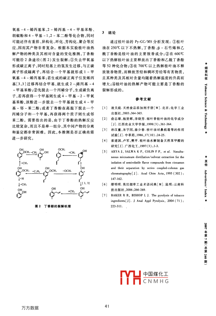桂葉油熱解產(chǎn)物的GC/MS分析煙草科技→98吳億勤2,楊柳,孟昭宇,陸舍銘,緡明明,朱洪友21.紅塔煙草(集團(tuán))有限責(zé)任公司技術(shù)中心,云南省玉溪市紅塔大道118號6531002.云南大學(xué)化學(xué)科學(xué)與工程學(xué)院,昆明市翠湖北路2號650091關(guān)鍵詞:桂葉油;熱解;氣相色譜/質(zhì)譜摘要:采用GC/MS法分析了在250、300、400、500、600700、800和900℃下桂葉油的熱解產(chǎn)物并用歸一化法進(jìn)行了定量。結(jié)果表明:①桂葉油在250℃以下不熱解,丁香酚、β一石竹烯和乙酰丁香酚是桂葉油的主要致香成分;②600℃以下桂葉油主要釋放出丁香酚和乙酰丁香酚等52種化合物;③00℃以上桂葉油不釋放致香物質(zhì),而釋放芳烴和稠環(huán)芳烴等有害物質(zhì),且其種類及相對含量均隨著熱解溫度的升高而增大;④桂葉油的熱解產(chǎn)物可能主要是丁香酚裂解形成的中圖分類號:TS264.3文獻(xiàn)標(biāo)識碼:B文章編號:1002-0861(2007)07-0036-06Analysis of Pyrolysis Products of Cinnamon Leaf Oil by Gas Chromatography/Mass Spec.trometerWU YI-QIN(1, 2),YANG LIU(1), MENG ZHAO-YU(), LU SHE- MING(1), MIAO MINGMING(1), and ZHU HONG-YOU(2)1. R&D Center of Hongta Tobacco( Group) Co., Ltd, Yuxi 653100, Yunnan, China2. College of Chemical Science and Engineering, Yunnan University, Kunming 650091, ChinaKeywords: Cinnamon leaf oil; Pyrolysis; GC/MSAbstract: At 250, 300, 400, 500, 600, 700, 800 and 900C, the pyrolysis products of cinnamonleaf oil were analyzed by gas chromatography/mass spectrometry, and the relative content of thepyrolysis products were also calculated by normalization method. The results indicated that:I)cinnamon leaf oil was not pyrolysised at 250C, and released out of flavor substances, such aseugenol, B-caryophyllene and aceteugenol; 2 )under 600C, 52 pyrolysis products were releasedfrom the essence; 3 )above 700C, no flavor was found in the pyrolysis products. Furthermore, withthe raise of pyrolysis temperature, harmful substances were released, such as aromatic, polycyclic年第期⌒總第aromatic hydrocarbons; and the category and relative content of them increased with the tempera-ture; 4)the pyrolysis products of cinnamon leaf oil were mainly possible came from eugenol期作者簡介:吳億勤(1980-),云南大學(xué)化學(xué)科學(xué)與工程學(xué)院在讀碩士研究生,研究方向:香精香料品控技術(shù)體系。Emai:wuyin-5l7@tom.com電話:0877-2968271收稿日期:2006-12-28責(zé)任編輯:劉立全E-mail:llq@tobaccoinfo.com.cn電話:037167672637中國煤化工CNMHG桂葉油具有典型的桂葉特征香氣,在煙草行溫程序:50℃(5mi0°C/mn,900(5mim);分流業(yè)中常用作煙用添加劑。俞志雄2等分析了比:100:1;接口溫度:250℃;電離(EI)能量:70eV;桂葉油的化學(xué)成分,發(fā)現(xiàn)其主要成分為丁香酚離子源溫度:190℃;質(zhì)量掃描范圍:40~400amu。孫漢董(、崔建國“、 JAYATILAKA等也都對桂采用NST02和 WILEY7標(biāo)準(zhǔn)質(zhì)譜庫檢索法葉油進(jìn)行了研究,但將熱解氣相色譜/質(zhì)譜法(PyCC/MS)用于桂葉油熱解產(chǎn)物分析尚未見報道。定性,峰面積歸一化法定量。因此,采用PyGC/Ms法分析了桂葉油在不同溫2結(jié)果與討論度下的熱解產(chǎn)物,旨在為桂葉油在卷煙中的應(yīng)用2.1熱解溫度對桂葉油熱解產(chǎn)物的影響提供參考。由圖1和表1看出:①桂葉油在220℃直接1材料與方法進(jìn)樣與其在250℃、300℃下的熱解產(chǎn)物的總離子★煙草科技流圖(TC)和鑒定結(jié)果基本一致,在這3種溫度1.1材料Clarus500氣相色譜質(zhì)譜聯(lián)用儀(美國下,出現(xiàn)最大峰的保留時間(RT)為21.92min,質(zhì)PerkinElmer公司),配備NS02和WEY7標(biāo)準(zhǔn)譜檢測為丁香酚,其相對含量高達(dá)76.66%,加上質(zhì)譜庫; Projector Il熱裂解儀(澳大利亞SGE公阝-石竹烯(RT23.7lmin)和乙酰丁香酚(Rr司);桂葉油(華寶香精香料有限公司)。26.04min),共約占95.44%,只有丁香酚甲醚為1.2熱解與分析Hoffman名單6中的有害物質(zhì)。說明在250和用液體進(jìn)樣器吸取0.5L桂葉油,加入已調(diào)300℃下桂葉油沒有發(fā)生明顯的熱解,丁香酚、B好預(yù)定溫度的裂解爐中,于He中分別在250石竹烯和乙酰丁香酚是其主要成分;②400和300400500600700800和900℃下進(jìn)行熱裂500℃下熱解產(chǎn)物中的主要組分仍是丁香酚,裂解解,裂解產(chǎn)物直接導(dǎo)入氣相色譜/質(zhì)譜聯(lián)用儀成分不復(fù)雜,400℃下丁香酚和β-石竹烯開始明(GC/MS)中進(jìn)行分離鑒定。另取0.5μL桂葉油顯減少但直至500℃,其熱解產(chǎn)物增加不多;③直接進(jìn)行CC/MS分析,進(jìn)樣口溫度20℃,其它600℃下丁香酚的相對含量由50℃下的680%煙草化條件同下降為4.76%,說明該成分在600℃時發(fā)生大量裂裂解爐壓力:1.10MPa;色譜柱: PE-Elite 5-MS解,另外2種主要成分β-石竹烯和乙酰丁香酚(30mx0.25mmi.d.x0.25μmd.f.)熔融石英毛也所剩無幾,而RT為21.13min的最大峰經(jīng)檢細(xì)管柱;進(jìn)樣口溫度:250℃;載氣:He(純度索為1-甲氧基-4-烯丙基苯,其相對含量為99.999%,1mL/min(起始柱頭壓624kPa);升16.63%,可能是由丁香酚(2-甲氧基-4-烯丙00副噸灰要⊥年第期⌒總第保留時間(min)TH中國煤化工CNMHG圖1桂葉油在220℃直接進(jìn)樣(a)、250(b)、600(c)和900℃37基苯酚)脫甲氧基后再獲得一個甲基而形成的。外,還出現(xiàn)了4種稠環(huán)芳烴:菲、4,5-亞甲基菲、苯除異戊二烯和丁香酚甲醚外,從600℃開始出現(xiàn)并[ghi]熒蒽和苯并[j熒蒽;⑥900℃下基本上無苯及其衍生物,但其相對含量較低,最高僅為致香物質(zhì),其熱解產(