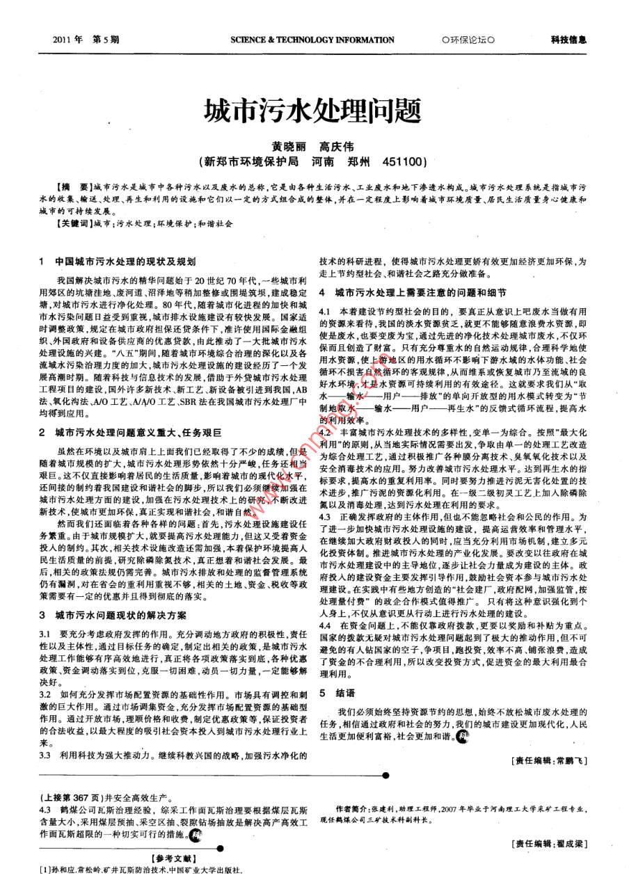2011年第5期SCIENCE TECHNOLOGY INFORMATIONO環(huán)保論壇O科技信息城市污水處理問題黃曉麗高慶偉(新鄭市環(huán)境保護局河南鄭州451100)【擴要】城市污水是城市中各種污水以及廢水的總稱,它是由各種生活污水、工業(yè)廢水和地下滲透水構(gòu)成。城市污水處理系統(tǒng)是指城市污水的收集、榆送、處理、再生和利用的設(shè)施和它們以一定的方式組合成的整體,并在一定程度上影響著城市環(huán)境質(zhì)量、居氏生活質(zhì)量身心健康和城市的可持續(xù)發(fā)展?!娟P(guān)鍵詞】城市;污水處理;環(huán)境保護;和諧社會1中國城市污水處理的現(xiàn)狀及規(guī)劃技術(shù)的科研進程,使得城市污水處理更嬌有效更加經(jīng)濟更加環(huán)保,為我國解決城市污水的精華問題始于20世紀70年代,一些地市和走上節(jié)約型杜會、和諧社會之路充分做準備用郊區(qū)的坑塘洼地、廢河道、沼澤地等稍加整修或圍堤筑壩建成穩(wěn)定4城市污水處理上需要注意的問題和細節(jié)塘,對城市污水進行凈化處理。80年代隨著城市化進程的加快和城41本著建設(shè)節(jié)約型杜會的目的,要真正從意識上吧廢水當做有用市水污染問題日益受到重視,城市排水設(shè)施建設(shè)有較快發(fā)展。國家適時調(diào)整政策,規(guī)定在城市政府擔保還貸條件下,準許使用國際金融組的資源來看待我國的淡水資源貧乏,就更不能夠隨意浪費水資源,即織、外國政府和設(shè)備供應(yīng)商的優(yōu)惠貸款由此推動了一大批城市污水使是廢水,也要變廢為寶通過先進的凈化技術(shù)處理城市廢水,不僅環(huán)處理設(shè)施的興建。“八五期間,隨著城市環(huán)境綜合治理的深化以及各保而且創(chuàng)造了財富。只有充分尊重水的自然運動規(guī)律,合理科學(xué)地使用水資源,使上游地區(qū)的用水循環(huán)不影響下展高潮時期。隨科技與信息技術(shù)的發(fā)展,借助于外貸城市污水處理循環(huán)不損害自然循環(huán)的客觀規(guī)律,從而維系或恢復(fù)城市乃至流城的良法氧化溝法、AO工藝、MAO工藝SBR法在我國城市污水處理廠中水—輸水—一用戶—排放”的單向開放型的用水模式轉(zhuǎn)變?yōu)椤肮?jié)均得到應(yīng)用制地取水—輸水—用戶—再生水”的反饋式循環(huán)流程,提高水的利用效率。2城市污水處理問題意義重大、任務(wù)艱巨42豐富城市污水處理技術(shù)的多樣性,變單一為綜合。按照”最大化利用”的原則,從當?shù)貙嶋H情況需要出發(fā),爭取由單一的處理工藝改造雖然在環(huán)境以及城市肩上上面我們已經(jīng)取得了不少的成績但是為綜合處理工藝,通過積極推廣各種膜分離技術(shù)、臭氧氧化技術(shù)以及隨著城市規(guī)模的擴大城市污水處理形勢依然十分嚴峻,任務(wù)還相當安全消毒技術(shù)的應(yīng)用。努力改善城市污水處理水平。達到再生水的指還間接的制約著我國建設(shè)和諧社會的腳步,所以我們必須繼續(xù)加強在術(shù)進步,推廣污泥的資源化利用。在一級二級初靈工藝上加入除磷除城市污水處理方面的建設(shè),加強在污水處理技術(shù)上的研究,不斷改進氮以及消毒處理達到污水處理在利用的要求。新技術(shù),使城市更加環(huán)保,真正實現(xiàn)和諧社會,和諧自然然而我們還面臨著各種各樣的問題:首先,污水處理設(shè)施建設(shè)任43正確發(fā)揮政府的主體作用但也不能忽略社會和公民的作用。為了進一步加快城市污水處理設(shè)施的建設(shè),提高運營效率和管理水平,務(wù)繁重。由于城市規(guī)模擴大就要提高污水處理能力但這又受著資金在繼續(xù)加大政府財政投人的同時,應(yīng)當充分利用市場機制建立多元投入的制約。其次,相關(guān)技術(shù)設(shè)施改造還需加強本著保護環(huán)境提高人化投資體制。推進城市污水處理的產(chǎn)業(yè)化發(fā)展。要改變以往政府在城后,相關(guān)的政策法規(guī)仍需完。城市污水排放和處理的監(jiān)督管理系統(tǒng)府投入的建設(shè)資金主要發(fā)揮引導(dǎo)作用鼓勵杜會資本參與城市污水處仍有漏澗,對在省會的重利用重視不夠,相關(guān)的土地資金、稅收等政理建設(shè)。在實踐中有些地方創(chuàng)造的“社會建廠,政府配網(wǎng)加強監(jiān)管按策需要有一定的優(yōu)惠并且得到徹底的落實。處理量付費”的政企合作模式值得推廣。只有將這種意識強化到個3城市污水問題現(xiàn)狀的解決方案人身上,不僅從意識更從行動上進行污水處理的建設(shè)31要充分考慮政府發(fā)揮的作用。充分調(diào)動地方政府的積極性責任國家的撥款無疑對城市污水處理問題起到了極大的推動作用,但不可性以及主體性,通過目標任務(wù)的確定制定出相關(guān)的政策是城市污水避免的有人鉆國家的空子,爭項目,跑投資效率不高、鋪張浪費,造成處理工作能夠有序高效地進行真正將各項政策落實到底各種優(yōu)惠了資金的不合理利用,所以改變投資方式促進資金的最大利用最合政策、資金調(diào)動落實到位克服一切困難,動員一切力量,一定能夠解理利用決好。32如何充分發(fā)揮市場配置資源的基礎(chǔ)性作用。市場具有調(diào)控和刺5結(jié)語激的巨大作用。通過市場調(diào)集資金,充分發(fā)揮市場配置資源的基礎(chǔ)型我們必須始終堅持資源節(jié)約的思