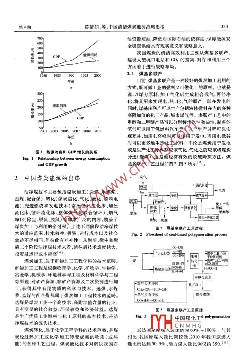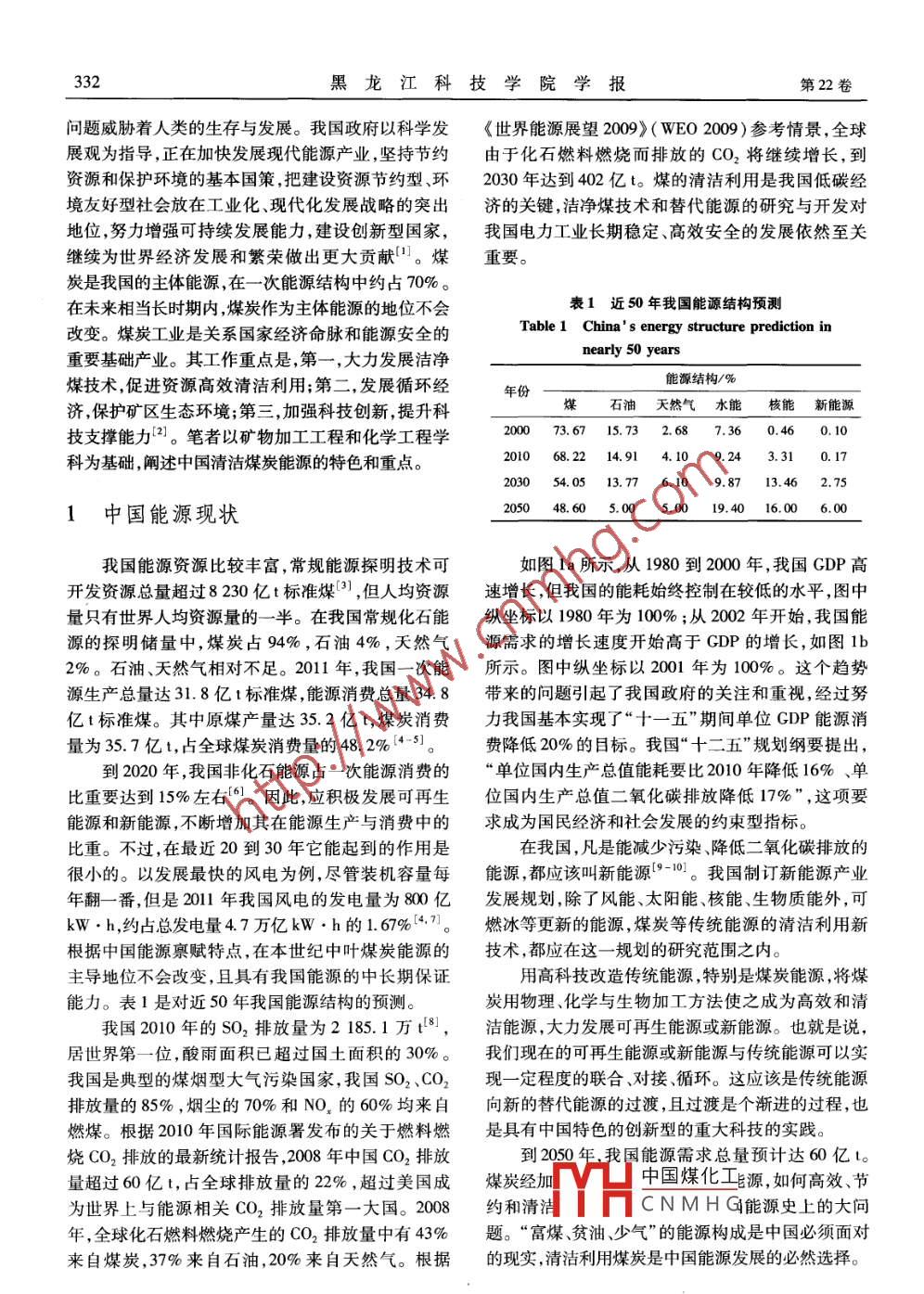 第22卷第4期黑龍江科技學(xué)院學(xué)報(bào)Vol. 22 No.42012年7月Journal of Heilongjiang Institute of Science & TechnologyJuly 2012文章編號(hào):1671-0118(2012)04- 0331-06中國(guó)清潔煤炭能源戰(zhàn)略思考陳清如(中國(guó)礦業(yè)大學(xué)化工學(xué)院,江蘇徐州21116)摘要:根據(jù)中國(guó)能源資源的國(guó)情,闡述煤炭能源的高效清潔利用仍然是我國(guó)能源研究領(lǐng)域城的重中之重。以礦物加工工程和化學(xué)工程學(xué)科為基礎(chǔ),論述我國(guó)清潔煤炭能源的特點(diǎn)以及煤炭的加工和轉(zhuǎn)化技術(shù),指出高效煤炭加工利用的新技術(shù)、新工藝必須納入新能源規(guī)劃的考慮范圍之內(nèi)。傳統(tǒng)的煤加工與煤轉(zhuǎn)化理論和技術(shù)面臨著嚴(yán)峻的挑戰(zhàn)。煤基多聯(lián)產(chǎn)是符合我國(guó)國(guó)情的煤炭清潔高效利用新技術(shù)系統(tǒng),是最經(jīng)濟(jì)有效的方法。建設(shè)大型坑口電站是當(dāng)前資源配置最優(yōu)化、最經(jīng)濟(jì)、最潔凈能源的戰(zhàn)略。二段干法選煤的灰分<8% ,硫分<5% ,該技術(shù)既可用于新建電廠也適用于老廠改造。關(guān)鍵詞:能源;煤炭;清潔高效利用;戰(zhàn)略中圖分類號(hào):TK01 :TD94文獻(xiàn)標(biāo)志碼: AConsideration of clean coal energy strategy in ChinaCHEN Qingru( School of Chemical Engineering & Technology, University of Mining & Technology,Xuzhou 221116, China)Abstract:The clean and ffcient utilization of coal energy remains the most important in energy re-search field, as is determined by the energy resources conditions of China. The new energy plan is domina-ted by novel process and technology designed for clean and efficient utilization of coal. As the traditionaltheory and technology of coal processing and coal conversion are confronted with serious challenges, coal-based poly-production represents the new technical system of the efficient and clean use of coal, which ap-plies to China ' s conditions. It follows that the construction of the pithead power plant forms the optimized ,most cost-effective and cleanest energy strategy. The two-stage dry separation capable of ash of less than8% and sulfur of less than 5% is suited to newly built power plants and to upgrading the old ones.Key words :energy ; coal; high. eficient and clean utilization; strategy欣逢黑龍江科技學(xué)院建校65周年慶典,藉此文熱烈祝賀。學(xué)科建設(shè)是大學(xué)建設(shè)與發(fā)展的基礎(chǔ)。大學(xué)的建設(shè)與發(fā)展依靠學(xué)科建設(shè)的特色和重點(diǎn)。根據(jù)其歷史基礎(chǔ)和傳承,黑龍江科技學(xué)院發(fā)展也要有煤炭資源與能源學(xué)科的特色和重點(diǎn)。此文僅以礦物加工工程和化學(xué)工程學(xué)科為基礎(chǔ),闡明了中國(guó)清潔煤炭能源的特色和重點(diǎn)。能源是人類賴以生存的基礎(chǔ)。人類在享受能源系列無(wú)法避免的能源安全挑戰(zhàn)。能源短缺、資源爭(zhēng)帶來(lái)的經(jīng)濟(jì)發(fā)展、科技進(jìn)步等利益的同時(shí),也遇到一奪以及過度中國(guó)煤化工不、環(huán)境污染等YHCNMHG收稿日期: 2012 -06 -01作者簡(jiǎn)介:陳清如(1926-),男,浙江省杭州人,中國(guó)工程院院士,教授、博士生導(dǎo)師,研究方向:選礦理論與選礦工程研究,E-mail:whfeumt@ 126. com。332黑龍江科技學(xué)院學(xué)報(bào)第22卷問題威脅著人類的生存與發(fā)展。我國(guó)政府以科學(xué)發(fā)《世界能源展望2009》( WEO 2009)參考情景,全球展觀為指導(dǎo),正在加快發(fā)展現(xiàn)代能源產(chǎn)業(yè),堅(jiān)持節(jié)約由于化石燃料燃燒而排放的CO2將繼續(xù)增長(zhǎng),到資源和保護(hù)環(huán)境的基本國(guó)策,把建設(shè)資源節(jié)約型、環(huán)2030年達(dá)到402億t。煤的清潔利用是我國(guó)低碳經(jīng)境友好型社會(huì)放在工業(yè)化、現(xiàn)代化發(fā)展戰(zhàn)略的突出濟(jì)的關(guān)鍵,潔凈煤技術(shù)和替代能源的研究與開發(fā)對(duì)地位,努力增強(qiáng)可持續(xù)發(fā)展能力,建設(shè)創(chuàng)新型國(guó)家,我國(guó)電力工業(yè)長(zhǎng)期穩(wěn)定、高效安全的發(fā)展依然至關(guān)繼續(xù)為世界經(jīng)濟(jì)發(fā)展和繁榮做出更大貢獻(xiàn)[”。煤重要。炭是我國(guó)的主體能源,在一次 能源結(jié)構(gòu)中約占70%。在未來(lái)相當(dāng)長(zhǎng)時(shí)期內(nèi),煤炭作為主體能源的地位不會(huì)表1近50年我國(guó)能源結(jié)構(gòu)預(yù)測(cè)Table 1 China' s energy structure prediction in改變。煤炭工業(yè)是關(guān)系國(guó)家經(jīng)濟(jì)命脈和能源安全的nearly 50 years重要基礎(chǔ)產(chǎn)業(yè)。其工作重點(diǎn)是,第一,大力發(fā)展?jié)崈裟茉唇Y(jié)構(gòu)/%煤技術(shù),促進(jìn)資源高效清潔利用;第二,發(fā)展循環(huán)經(jīng)年份煤石油 天然氣水能核能新能源濟(jì),保護(hù)礦區(qū)生態(tài)環(huán)境;第三,加強(qiáng)科技創(chuàng)新,提升科技支撐能力2]。筆者以礦物加工工程和化學(xué)工程學(xué)200073.67 15.73 2.68 7.36 0.46 0. 10科為基礎(chǔ),闡述中國(guó)清潔煤炭能源的特色和重點(diǎn)。201068.22 14.91 4. 109.24 3. 310. 17203054.0513.776.109.8713.462.751中國(guó)能源現(xiàn)狀2050 48.60 5.00 5.00 19.40 16.00 6.00我國(guó)能源資源比較豐富,常規(guī)能源探明技術(shù)可如圖1a所示,從1980到2000年,我國(guó)GDP高開發(fā)資源總量超過8230億t標(biāo)準(zhǔn)煤[3],但人均資源速增長(zhǎng),