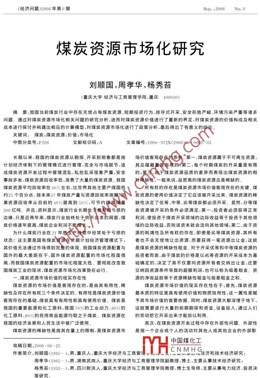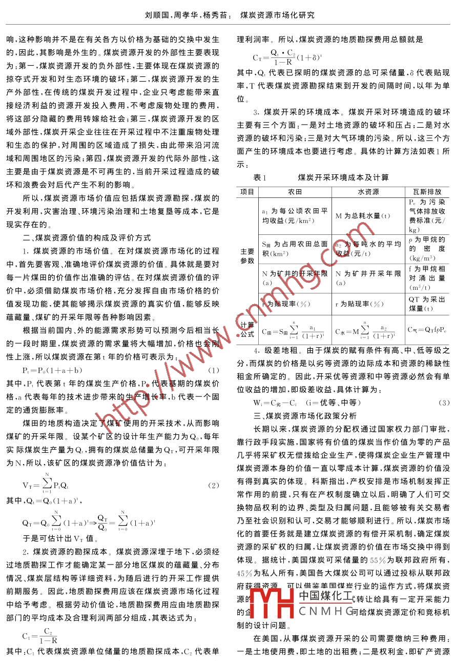 《經(jīng)濟(jì)問(wèn)題》2006年第9期Sep. ,2006No.9.煤炭資源市場(chǎng)化研究劉順國(guó),周孝華,楊秀苔(重慶大學(xué)經(jīng)濟(jì)與工商管理學(xué)院,重慶 400030)摘要:我國(guó)當(dāng)前煤炭行業(yè)中存在無(wú)償占有煤炭資源、短期投資行為、掠奪式開(kāi)采、安全形勢(shì)嚴(yán)峻、環(huán)境污染嚴(yán)重等諸多問(wèn)題。通過(guò)對(duì)煤炭資源市場(chǎng)化相關(guān)問(wèn)題的研究分析,進(jìn)而對(duì)煤炭資源價(jià)值進(jìn)行了重新的界定,對(duì)煤炭資源的價(jià)值構(gòu)成及相關(guān)成本進(jìn)行探討并構(gòu)建出相應(yīng)的計(jì)算模型,對(duì)煤炭資源市場(chǎng)化進(jìn)行了政策分析,最后得出了有意義的結(jié)論。關(guān)鍵詞:煤炭;煤炭資源;價(jià)值;市場(chǎng)化中圖分類號(hào):F206文獻(xiàn)標(biāo)識(shí)碼:A文章編號(hào):1004- 972X (206)09 - 0002 - 03長(zhǎng)期以來(lái),我國(guó)的煤炭資源從勘探、開(kāi)采到銷(xiāo)售都是按場(chǎng)價(jià)值客觀存在的條件。第一,煤炭資源屬于不可再生資源,計(jì)劃經(jīng)濟(jì)體制下的管理模式進(jìn)行管理,完全與市場(chǎng)脫節(jié),造其總蘊(yùn)藏量是有限的;第二,每個(gè)時(shí)期煤炭的開(kāi)采量是有限成煤炭資源開(kāi)發(fā)過(guò)程中管理混亂,私挖亂采現(xiàn)象嚴(yán)重,安全的;第三,由于煤炭資源品質(zhì)的差異而表現(xiàn)出煤炭資源的相事故多發(fā),煤炭資源回收率低,浪費(fèi)了大量的煤炭資源。我國(guó)對(duì)稀缺性,-般來(lái)說(shuō),品質(zhì)高的煤炭資源總是稀缺的。煤炭資源平均回收率在40%左右,比世界其他主要產(chǎn)煤國(guó)低所有權(quán)的存在是煤炭資源市場(chǎng)價(jià)值客觀存在的關(guān)鍵。煤約25個(gè)百分點(diǎn)。按未來(lái)17年煤炭產(chǎn)量與資源回收率測(cè)算,如炭資源的使用價(jià)值決定了它應(yīng)該被開(kāi)采出來(lái)。煤炭資源的稀果資源回收率從目前的40%提高到50%,可節(jié)約煤炭?jī)?chǔ)量缺性決定了優(yōu)等、中等、劣等煤炭都必須開(kāi)采。顯然,分等煤200億噸。并且,資料顯示,煤炭行業(yè)長(zhǎng)期處于微利和虧損的炭資源被開(kāi)采的條件必須滿足:第一,投資者必須獲得正常邊緣,只是近兩年來(lái),煤炭行業(yè)始終處于供不應(yīng)求的局面,煤利潤(rùn),使投資于煤炭開(kāi)采領(lǐng)域的邊際收益等于投資于其他領(lǐng)炭?jī)r(jià)格逐年提高,煤炭企業(yè)利潤(rùn)不斷增長(zhǎng)。域的邊際收益,否則該資本就會(huì)流向其他領(lǐng)域;第二,由于資為什么煤炭行業(yè)在21年的生產(chǎn)經(jīng)營(yíng)中經(jīng)常處于虧損的.源的耗竭性及所有權(quán)的存在,即使是劣等煤炭資源,其所有狀態(tài)?這主要是國(guó)有煤炭資源在長(zhǎng)期計(jì)劃經(jīng)濟(jì)管理模式下,者也不會(huì)無(wú)償?shù)刈尦鲑Y源,而要獲得一筆資源出讓金,這就其價(jià)值無(wú)法通過(guò)市場(chǎng)得到完整的體現(xiàn)。我國(guó)煤炭資源配置與是煤炭資源的稀缺性租金。對(duì)于開(kāi)采優(yōu)等和中等煤炭資源的國(guó)外的最大差距在于:國(guó)外煤炭資源配置的市場(chǎng)化程度很投資者而言,由于煤炭的價(jià)格是以劣等資源的開(kāi)采成本為基高,而我國(guó)煤炭資源配置的市場(chǎng)化程度太低。要徹底改變我礎(chǔ)確定的,決定了其不僅要向資源所有者交納出讓金,還要國(guó)煤炭工業(yè)的現(xiàn)狀,煤炭資源市場(chǎng)化改革勢(shì)在必行。交納因資源條件導(dǎo)致的超額利潤(rùn),也可以稱為級(jí)差租金。資一、煤炭資源市場(chǎng)價(jià)值的現(xiàn)實(shí)存在性源的凈收益就等于資源稀缺性租金與級(jí)差租金之和。煤炭資源的市場(chǎng)價(jià)值是客觀存在的,是由其有用性、稀煤炭資源市場(chǎng)價(jià)值的現(xiàn)實(shí)存在性在于:首先,煤炭資源缺性及存在所有權(quán)三個(gè)條件決定的。有用性是煤炭資源價(jià)值最本質(zhì)的特征是具有使用價(jià)值和物質(zhì)效用性,這-屬性是賦客觀存在的基礎(chǔ),煤炭具有有用性即具有使用價(jià)值。煤炭是予其市場(chǎng)價(jià)值的首要依據(jù)。同時(shí),煤炭資源大都深埋于地下,我國(guó)的重要能源和化工原料,我國(guó)70%的工業(yè)動(dòng)力、60%的這就需要進(jìn)行大量的前期勘探和資金、設(shè)備投入,通過(guò)人們化工原料、80%的民用商品能源均取之于煤炭。煤炭資源在的勞動(dòng)把它開(kāi)采出來(lái)才能加以利用。我國(guó)的經(jīng)濟(jì)發(fā)展和人民生活中被廣泛使用。其次,在煤炭資源開(kāi)發(fā)過(guò)程中存在外部性問(wèn)題。外部性煤炭資源的稀缺性是指其在量上的限制,是煤炭資源市是指一個(gè)企業(yè)或個(gè)人的活動(dòng)對(duì)其他人或其他企業(yè)的外部影中國(guó)煤化工收稿日期:2006-06-25作者簡(jiǎn)介:劉順國(guó)(1965- ).男,重慶人,重慶大學(xué)經(jīng)濟(jì)與工商管,MH.CNMHG經(jīng)濟(jì)和技術(shù)經(jīng)濟(jì)研究;周孝華(1965- -).男,湖南武崗人,重慶大學(xué)經(jīng)濟(jì)與工商管理學(xué)院副教授,博士,主要從事技術(shù)經(jīng)濟(jì)研究;楊秀苔(1933- -).男,四川射洪人,重慶大學(xué)經(jīng)濟(jì)與工商管理學(xué)院教授,博士生導(dǎo)師,主要從事電力經(jīng)濟(jì)、投資決.策