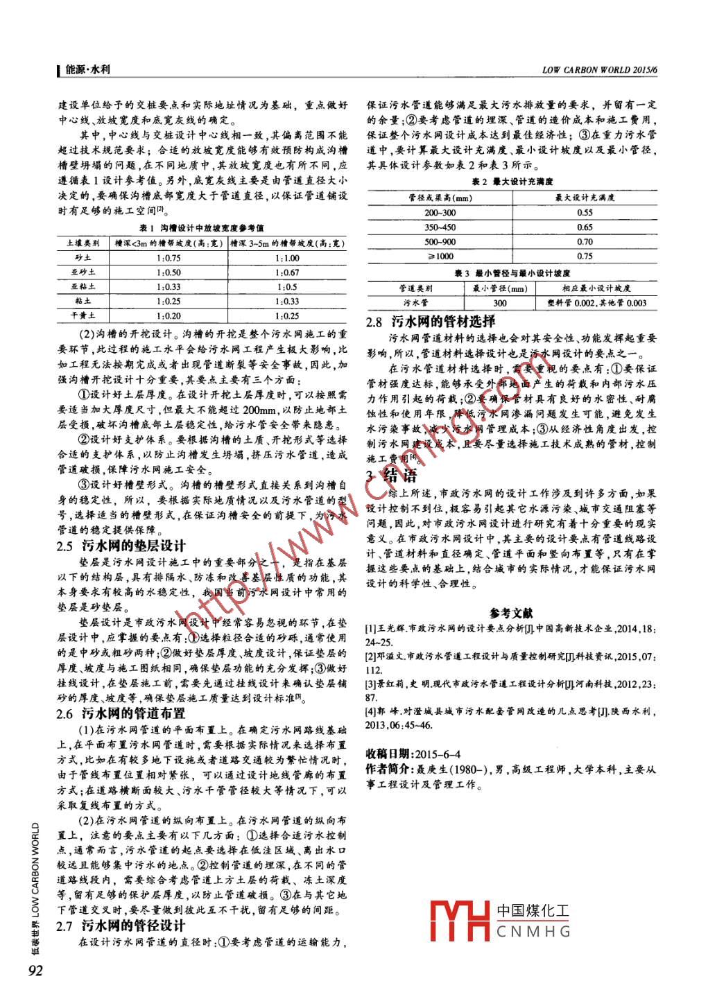 LOW CARBON WORLD 201516能源.水利|市政污水網(wǎng)的設(shè)計要點分析聶庚生(重慶同望水利水電工程設(shè)計有限公司,重慶市渝北區(qū)401 120)[摘要]污水網(wǎng)是城市基礎(chǔ)設(shè)施建設(shè)的重要組成部分,對于城市污水排放、環(huán)境美化有著重要影響,因此,必須做好污水網(wǎng)的設(shè)計。在市政污水網(wǎng)設(shè)計中,經(jīng)常遇到管道布置不合理.管徑選擇不恰當(dāng)?shù)葐栴},影響到污水網(wǎng)的排污效果。本文在介紹污水網(wǎng)設(shè)計問題的基礎(chǔ)上,對污水網(wǎng)設(shè)計要點進行分析,以提高市政污水網(wǎng)的設(shè)計水平,保證市政污水網(wǎng)功能的正常發(fā)揮。[關(guān)鍵詞]市政;污水網(wǎng);設(shè)計問題;設(shè)計要點[中圉分類號}rU992[文獻標(biāo)識碼]A[文章編號)2095. 206620151)17-0091-02近些年來,隨著城市化進程的不斷加快,城市人口數(shù)量不.在污水網(wǎng)設(shè)計之前,需要先做好相應(yīng)的信息收集工作,需斷增加,人們生產(chǎn)和生活產(chǎn)生的污水量日益增多,如何做好污要收集的信息 主要包括:①污水信息:污水的來源、總量、組成水的排放,已經(jīng)成為市政建設(shè)的重要內(nèi)容。污水網(wǎng)作為污水排成分等 ,以便于確定合適的污水收集點,保證整個目標(biāo)區(qū)城的放的主要途徑,其設(shè)計的合理與否會直接關(guān)系到污水的排放效污水不會 被遺漏;②原有地下管線信息:向相關(guān)部門了解地下果,因此,對污水網(wǎng)設(shè)計進行研究,有著十分重要的現(xiàn)實意義。管線的情況,在設(shè)計時,做到心中有數(shù),避免設(shè)計變更影響污1市政污水網(wǎng)設(shè)計存在的問題水網(wǎng)設(shè)計效果。通常而言,市政污水管道是與排水管道結(jié)合在一起的,是2.2污水網(wǎng)路線的設(shè)計排水管網(wǎng)絡(luò)的組成部分,在進行污水網(wǎng)設(shè)計時,要保證排水與污水網(wǎng)路線設(shè)計是整個設(shè)計的開始環(huán)節(jié),對于整個污水排污之間的協(xié)調(diào),且符合城市規(guī)劃的長期性要求,容易發(fā)生的網(wǎng)的排污效果有著至關(guān)重要的影響 ,在進行路線設(shè)計時,應(yīng)做問題主要體現(xiàn)在以下幾個方面:到以下幾點:1.1 管道問題(1)了解建設(shè)區(qū)域的地形地勢,在結(jié)合地形地勢的基礎(chǔ)上在部分污水網(wǎng)設(shè)計當(dāng)中,管道的設(shè)計與施工之間存在矛選擇合適的污水網(wǎng)路線,保證污水管道走向與地形趨勢相一盾,比如過于注重管道的組合方式,卻沒有考慮管道施工可能致,各個污水點的污水能夠在自重作用下實現(xiàn)自流,做到順坡給周邊交通帶來的不利影響,導(dǎo)致實際施工需要占用主要干.排水;同時,還要考慮長期發(fā)展的因素,不能為照顧某個點而道,影響到居民出行和城市交通順暢。另外,有很多設(shè)計對管加大整個污水網(wǎng)的埋設(shè)深度。道接口的重視明顯不足,并沒有明確規(guī)定接口形式,這也會給;(2)與周邊建筑物和原有管線協(xié)調(diào)。在選擇污水網(wǎng)線路時,既要照顧到周邊建筑物的污水排放,同時又要考慮原有地市政污水網(wǎng)帶來安全隱患。下管線的情況,根據(jù)地下管線分布的信息,選擇沒有其它管線1.2管材問題管道材料質(zhì)量會給污水網(wǎng)的安全性產(chǎn)生至關(guān)重要的影響,干擾的線路。同時,要盡量將污水網(wǎng)控制在人行道、綠化帶與但是,在一些市政污水網(wǎng)設(shè)計中,為了節(jié)省建設(shè)成本,并沒有實非機動車道區(qū)域內(nèi),避免選擇機動車道,以防止車輛行駛荷載際需求選擇合適管材,而是選用材料性能相對較低的管材,管過大造成污水管道破損。材本身的承載能力、環(huán)剛度等指標(biāo)達不到工程要求,導(dǎo)致后期2.3污水網(wǎng)的交樁設(shè)計運行中出現(xiàn)斷裂等問題,給污水網(wǎng)的功能發(fā)生帶來不良影響"。.交樁是指建設(shè)單位向施工單位交代軸線和水平控制點的過程,控制點的準(zhǔn)確與否會直接影響到整個污水網(wǎng)管道位置1.3施工問題市政污水網(wǎng)的施工有著嚴(yán)格的工藝要求,只有在科學(xué)、準(zhǔn).的準(zhǔn)確性,進而影響污水網(wǎng)的排污效果。在交樁設(shè)計當(dāng)中,每確的工藝指導(dǎo)下,才能保證污水網(wǎng)施工質(zhì)量達到相應(yīng)目標(biāo)。而.個交樁點都要勘測3次以上,以確保污水網(wǎng)各個施工關(guān)鍵點在一些污水網(wǎng)設(shè)計中,有部分施工設(shè)計存在不合理問題,比如的標(biāo)高、中心線等與設(shè)計要求相一致,為整個污水網(wǎng)的精準(zhǔn)度溝槽的回填與壓實處理不到位,可能會使管道下方?jīng)]有承載2.4污水網(wǎng)的溝槽設(shè)計奠定良好基礎(chǔ)。地基,引起管道斷裂;管道的連接接口密封性不夠,導(dǎo)致管道溝槽是污水網(wǎng)埋設(shè)的基礎(chǔ),會對污水網(wǎng)的水流走時產(chǎn)生發(fā)生滲漏,污水滲入到地下水中形成污染等。重要影響,所以,做好溝槽設(shè)計的控制十分必要。2市政污水網(wǎng)設(shè)計的要點分析(1)溝槽的放線設(shè)計。放線是保證溝槽位置與污水網(wǎng)線路.2.1污水情況了解設(shè)計尺寸、方向等對應(yīng)的重要措施,在進行放線設(shè)計時,要以則人工漿砌石擋墻無法承受鉆機的振動沖擊力,造成人為破排險加固措施方案