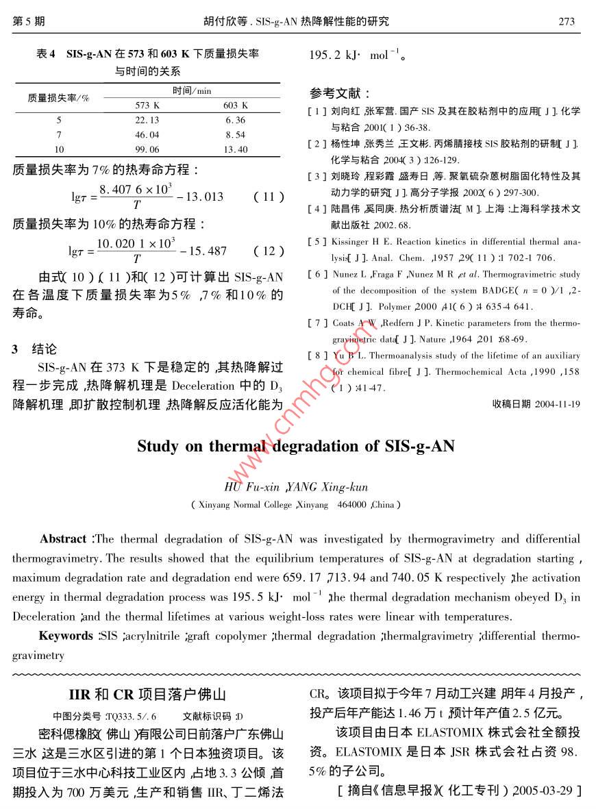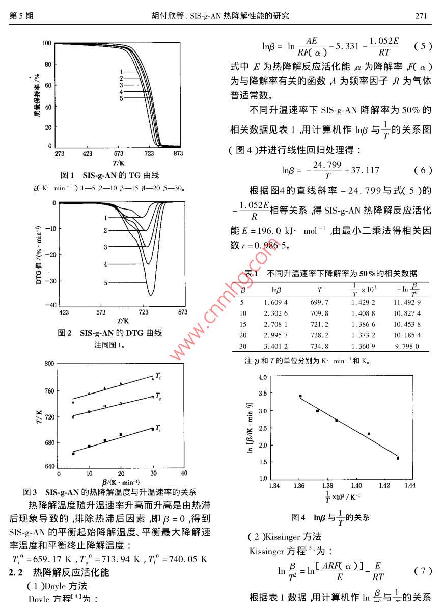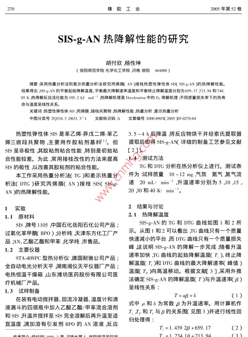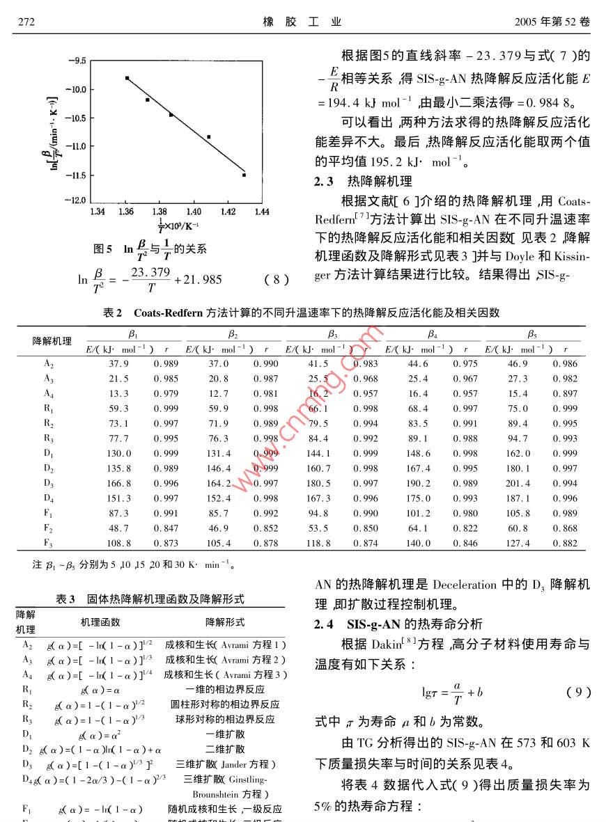 270橡膠工業(yè)2005年第52卷SIS-g-^AN熱降解性能的研究胡付欣楊性坤信陽師范學(xué)院化學(xué)化工學(xué)院河南信陽464000摘要棨用熱重分析法和差示熱重分析法研究丙烯膩(AN)接枝熱塑性彈性體SS(SIS-g-AN)的熱降解性能。結(jié)果得出;S-gAN的平衡起始降解溫度、平衡最大降解速率溫度和平衡終止降解溫度分別為659.1~713.94和74005K熱降解反應(yīng)活化能為195.2k·ml-熱降解機理是 Deceleration中的D3降解機理不同質(zhì)量損失率下的熱壽命與溫度呈線性關(guān)系關(guān)鍵詞熱塑性彈性體$S丙烯腈接枝共聚物熱降解性能熱重分析差示熱重分析中圖分類號TQ34.30631.3+1文獻標(biāo)識碼:文章編號1000-890X(2005050270404熱塑性彈性體SS是苯乙烯-異戊二烯-苯乙3.5~4h后降溫將反應(yīng)物烘干并經(jīng)索氏提取器烯三嵌段共聚物,主要用作膠粘劑基料。但提取后即得SS-g-AN(詳細的制備工藝參見文獻sIs呈非極性其膠粘劑粘合性能特別是初始粘[2]合性能較差。為此常用接枝改性的方法來提高14測試方法SS的極性似以改善其膠粘劑的粘合性能TG和DTG分析在熱分析儀上進行。測試條本工作采用熱重分析法(TG)和差示熱重分件為試樣質(zhì)量10-12mg氣氛氮氣氮氣流析法(DG)研究丙烯腈(AN)接枝SS(Ss速20ml:mn升溫速率分別為510,15,AN)的熱降解性能。2030和40Kmin-1實驗2結(jié)果與討論1.1原材料2.1熱降解溫度SIS牌號1105中國石化岳陽石化公司產(chǎn)品SISg-AN的TG和DTG曲線如圖1和2所過氧化苯甲戤BPO)分析純天津東方化工廠產(chǎn)示。從圖1和2可以看出TG曲線只有一個質(zhì)量品AN、乙酸乙酯和甲苯化學(xué)純市售品??焖贉p小的平臺而DTG曲線只有一個質(zhì)量損失1.2主要儀器峰這說眀SS-g-AN的降解一步完成著升溫STA409PC型熱分析儀德國耐馳公司產(chǎn)品速率加快,rG曲線的起始降解溫度(T)終止降全自動電光分析天平湖南湘儀天平儀器廠產(chǎn)品;解溫度7和DrG曲線的最大降解速率峰值)電熱恒溫干燥箱山東濰坊醫(yī)藥股份有限公司醫(yī)溫度T)向高溫移動。根據(jù)文獻3]采用外推療機械廠產(chǎn)品法確定SIS-g-AN的降解溫度(T)與升溫速率β)呈線性關(guān)系1.3試樣制備在裝有電動攪拌器、回流冷凝器、溫度計和滴液漏斗的四頸瓶中加入乙酸乙酯/甲苯混合溶劑式中a和b為常數(shù)B為升溫速率。用計算機作和SS升溫并攪拌至SS完全溶解后再升溫至適T和T與β的關(guān)系圖見圖3)并進行線性回宜溫度滴加溶有引發(fā)劑BPO的AN溶液,反應(yīng)歸處理得7=1.4392B+659.17(2第5期胡付欣等.SIS-g-AN熱降解性能的研究2711P=h、AE-5.3371.052E(5)RP a)式中E為熱降解反應(yīng)活化能α為降解率fα)為與降解率有關(guān)的函數(shù)A為頻率因子R為氣體普適常數(shù)。不同升溫速率下SIS-g-AN降解率為50%的相關(guān)數(shù)據(jù)見表1用計算機作lnB與的關(guān)系圖(圖4)并進行線性回歸處理得T/K24.799圖1SIS-gAN的TG曲線+37.117(6)RK·min1)1-52-103-15-205-30。根據(jù)圖4的直線斜率-24.799與式(5)的1:052E相等關(guān)系得SS"gAN熱降解反應(yīng)活化能E=196.0kJ·mol-由最小二乘法得相關(guān)因數(shù)r=0.9865表1不同升溫速率下降解率為50%的相關(guān)數(shù)據(jù)B1.6094699.71.429211.49292.3026709.810.8274T/K721.21.386610.4538圖2S-g-AN的DTG曲線202.9957728.21.3732注同圖1。734.81.36099.7980注和T的單位分別為K·min和K。T640L1.341361381.401421.44圖3SIS-g-AN的熱降解溫度與升溫速率的關(guān)系103/K熱降解溫度隨升溫速率升高而升高是由熱滯后現(xiàn)象導(dǎo)致的排除熱滯后因素,即β=0,得到圖4InB與的關(guān)系SIS-g-AN的平衡起始降解溫度、平衡最大降解速(2) KisSinger方法率溫度和平衡終止降解溫度T=659.17K,T=713.94K,T0=740.05KKissinger方程3為2.2熱降解反應(yīng)活化能InB-1[ARF a)] E(7)E(1) Doyle方法根據(jù)表1數(shù)據(jù)用計算機作B與1的關(guān)系272橡膠工業(yè)2005年第52卷95根據(jù)圖5的直線斜率-23.379與式(7)的層相等關(guān)系得SsAN熱降解反應(yīng)活化能E=194.4k}mol-由最小二乘法得=0.984可以看出兩種方法求得的熱降解反應(yīng)活化RR-11.0能差異不大。最后,熱降解反應(yīng)活化能取兩個值的平均值195.2kJ·mol2.3熱降解機理120根據(jù)文獻6]介紹的熱降解機理,用Co1341361381.40142144Redfern(方法計算出SS-g-AN在不同升溫速率圖5m號與的關(guān)系下的熱降解反應(yīng)活化能和相關(guān)因數(shù)見表2降解機理函數(shù)及降解形式見表3]并與 Doyle和 Kissin-B_23.379+21.985(8)ger方法計算結(jié)果進行比較。結(jié)果得出slsg表2 Coats- Redfern方法計算的不同升溫速率下的熱降解反應(yīng)活化能及相關(guān)因數(shù)降解機理B.B3E/ k. molE/(k] mol-)r E/( kJ. mol -)r E/( kJ. mol -)r E/( kJ. mol -)rA0.9890.99041.50.98346.90.98520,80.98725.50,9680.96727,30.9790.95715.40.8970.99873.10.99771.90.98979.50.99483.50.99189.40.995R0.99576.30.998840,9920.988D131.40.999144.10.999146.40.999160.70.998D364.20.99180.50.997190.20.989151.3152.40.998167,30,996175,0F185.70.9920.99001.20.980F20.84746.90.85253.50.8500.82260.80.868108.80.8730.878l18.80.874140.00.846127.40.882注B1-B分別為5104520和30K·minAN的熱降解機理是 Deceleration中的D3降解機表3固體熱降解機理函數(shù)及降解形式理即擴散過程控制機理。機理機理函數(shù)降解形式2.4SIS-g-AN的熱壽命分析A2g(a)=[-l(1-a)]2成核和生長 Avrami方程1)根據(jù)Dkn8方程高分子材料使用壽命與A3K(a)=[-l(1-a)]成核和生長( Avrami方程2)A4a)-[-l(1-a)]4成核和生長(Avmi方程3)溫度有如下關(guān)系R一維的相邊界反應(yīng)
