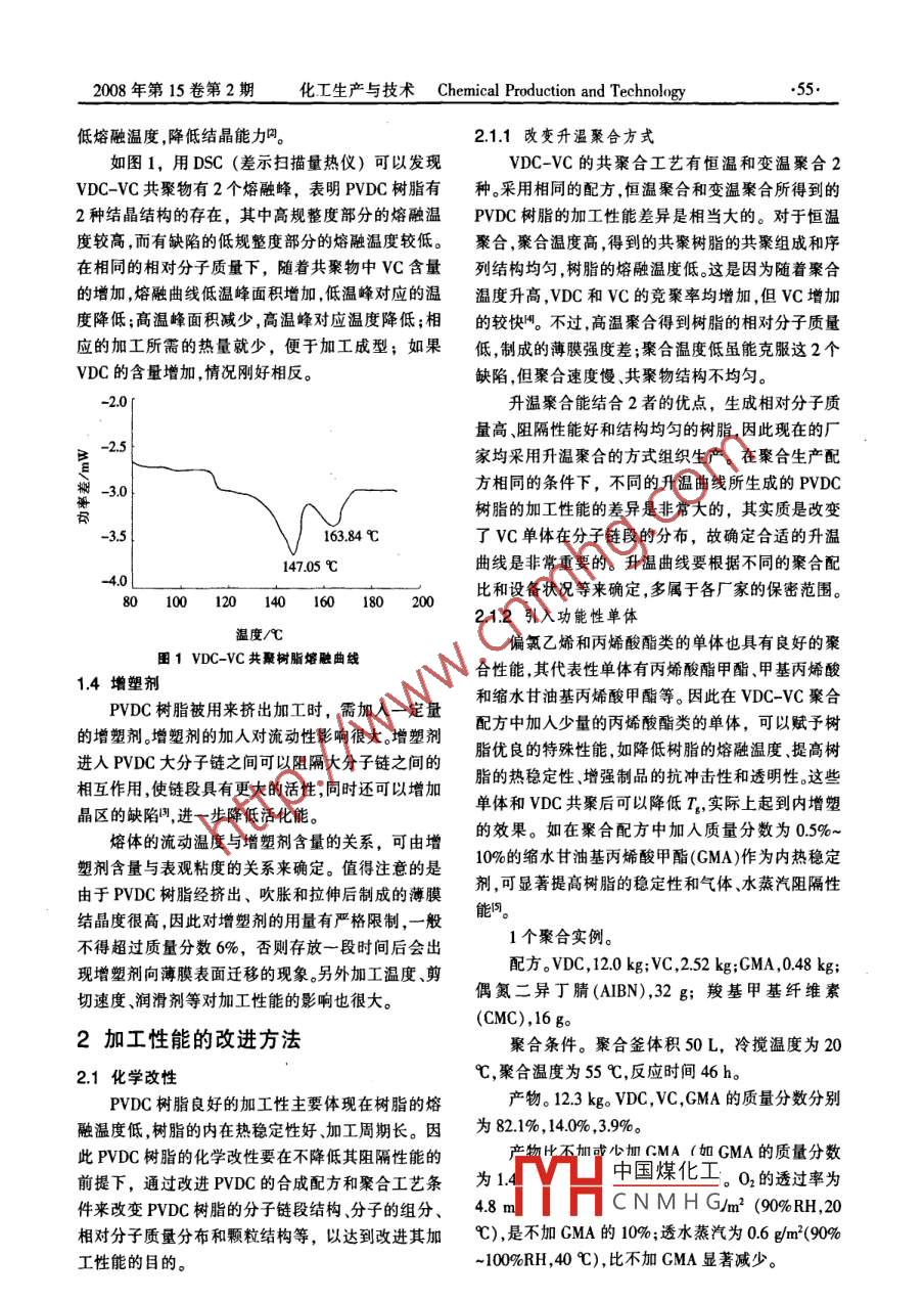 .54.周強等偏二氯乙烯-氯乙烯共聚樹脂加工性能的改進經(jīng)驗交流偏二氯乙烯-氯乙烯共聚樹脂加工性能的改進周強1徐輝2(1.浙江巨化股份有限公司電化廠,浙江衢州324004;2.鄭州寶藍包裝技術(shù)有限公司,鄭州450001)摘要針對聚偏二氯乙烯-氟乙烯(PVDC -VC)共聚樹脂加工性能較差的特點,分析了共聚物的組成、相對分子質(zhì)量及其分布顆粒結(jié)構(gòu)和增塑劑等因素對加工性能的影響,提出了改進其加工性能的化學和物理方法。認為應(yīng)縮短PVDC聚合反應(yīng)的時間,提高生產(chǎn)效率、降低成本,繼續(xù)提高加工過程的熱穩(wěn)定性和制成品的韌性,以提高競爭力。關(guān)鍵詞偏二氯乙烯-氯乙烯共聚樹脂;性能;加工;改性中圖分類號TQ325.3文獻標識碼A文章編號1006- 6829(2008)02-0054-04聚偏二氯乙烯(PVDC)及其共聚物的最大優(yōu)點Gibbs-Helmhole方程T=OH/△S,大分子間的作用是對眾多的氣體或蒸汽有很高的阻隔性,同時還具力以范德華力為主相對分子質(zhì)量大,分子間的作用有優(yōu)良的化學穩(wěn)定性、耐溶劑性和阻燃等-系列優(yōu)力大,△H就越大,故加工熔融溫度就越高,玻璃化良的物理和化學性能。在添加增塑劑、熱穩(wěn)定劑和潤轉(zhuǎn)變溫度T。就越高";而OS隨相對分子質(zhì)量的變滑劑的情況下,可加工成薄膜、板材和機械零件等,化較小或基本不變。被廣泛應(yīng)用到化工、輕工、包裝、紡織和汽車等領(lǐng)域。相對分子質(zhì)量分布對加工溫度的影響也相當PVDC的均聚物因其熔融和分解溫度十分接近,在大。平均相對分子質(zhì)量相同,相對分子質(zhì)量分布越實際生產(chǎn)中沒有應(yīng)用價值。已投人商業(yè)化生產(chǎn)的寬,低相對分子質(zhì)量部分起了內(nèi)增塑作用,降低了聚PVDC共聚物主要有3類,分別是偏二氯乙烯-氯乙合物熔體溫度。如美國DOW化學公司生產(chǎn)的牌號烯(VDC-VC) 共聚物、偏二氣乙烯-丙烯酸甲酯為Saran2032和Saran168樹脂,Saran2032 的相對分(VDC-MA)共聚物和偏二氯乙烯-丙烯腈(VDC-子量比Saran168大,但相對分子量分布較寬,其加AN)共聚物。國內(nèi)絕大部分廠家使用的PVDC樹脂工溫度反而比Saran168低5~7 C。都是共聚物,均采用擠出吹脹的方法來生產(chǎn)各種薄1.2 顆粒結(jié)構(gòu)膜,用于食品、藥品等包裝,本文所討論的均指懸浮法生產(chǎn)的PVDC樹脂的顆粒形態(tài)和結(jié)構(gòu)對VDC-VC共聚生成的PVDC樹脂。其加工的熔融和流動行為有一-定的影響。用電子掃PVDC樹脂由于氯含量高和結(jié)晶度高,因此熔描顯微鏡在放大2000倍的條件下觀察,樹脂應(yīng)該融溫度高熔融時間長,一般在175 C的條件下完全是不規(guī)則半透明的顆粒。樹脂的空隙率高、表面積熔融需5~10 min。熔體粘度大,流動性差;受熱易降大、細孔在顆粒內(nèi)部分布均勻,吸熱效率高、熔融時解,加工周期短;薄膜易變色,熱封強度低,彈性性能間短、易被剪切破碎,加工性能好。差。因此在滿足PVDC阻隔性能的前提下,改進1.3 共聚物的組成.PVDC樹脂的加工性能具有實際意義。PVDC樹脂是結(jié)晶聚合物,其結(jié)晶性能是影響薄膜吹脹工藝和制品力學性能的主要因素。VDC-1影響加工性能的主要因素VC的共聚屬于嵌段共聚,序列結(jié)構(gòu)是決定樹脂熔1.1相對分子質(zhì)量及其分布融結(jié)晶中國煤化工子結(jié)構(gòu)中主要起PVDC樹脂要保證其阻隔性能,因此相對分子到破壞!YHC N M H G的柔軟性。研究表質(zhì)量普遍較高,-般在80x10~-100x10。根據(jù)明 , vc在整個分子鏈中分布越有規(guī)則,越有助于降收稿日 期2008-02-282008年第15卷第2期化工生產(chǎn)與技術(shù)Chemical Production and Technology低熔融溫度,降低結(jié)晶能加。2.1.1改變升溫聚合方式如圖1,用DSC (差示掃描量熱儀)可以發(fā)現(xiàn)VDC-VC的共聚合工藝有恒溫和變溫聚合2VDC- _VC共聚物有2個熔融峰,表明PVDC樹脂有種。采用相同的配方,恒溫聚合和變溫聚合所得到的2種結(jié)晶結(jié)構(gòu)的存在,其中高規(guī)整度部分的熔融溫PVDC樹脂的加工性能差異是相當大的。對于恒溫度較高,而有缺陷的低規(guī)整度部分的熔融溫度較低。聚合,聚合溫度高,得到的共聚樹脂的共聚組成和序在相同的相對分子質(zhì)量下,隨著共聚物中VC含量列結(jié)構(gòu)均勻,樹脂的熔融溫度低.這是因為隨著聚合的增加,熔融曲線低溫峰面積增加,低溫峰對應(yīng)的溫溫度升高,VDC和VC的競聚率均增加,但VC增加度降低;高溫峰面積減少,高溫峰對應(yīng)溫度降低;相.的較快+。不過,高溫聚合得到樹脂的相對分子質(zhì)量應(yīng)的加工所需的熱量就少,便于加工成型;如果低,制成的薄膜強度差;聚合溫度低雖能克服這2個VDC的含量增加,情況剛好相反。缺陷,但聚合速度慢、共聚物結(jié)構(gòu)不均勻。升溫聚合能結(jié)合2者的優(yōu)點,生成相對分子質(zhì)量高、阻隔性能好和結(jié)構(gòu)均勻的樹脂,因此現(xiàn)在的廠2.5 t家均采用升溫聚合的方式組織生產(chǎn)。在聚合生產(chǎn)配方相同的條件下,不同的升溫曲線所生成的PVDC-3.0樹脂的加工性能的差異是非常大的,其實質(zhì)是改變-3.5163.84 C了VC單體在分子鏈段的分布,故確定合適的升溫147.05 C曲線是非常重要的。升溫曲線要根據(jù)不同的聚合配比和設(shè)備狀況等來確定,多屬于各廠家的保密范圍。80100120140 160 180 2002.1.2引入功能性單體溫度/心C偏氯乙烯和丙烯酸酯類的單體也