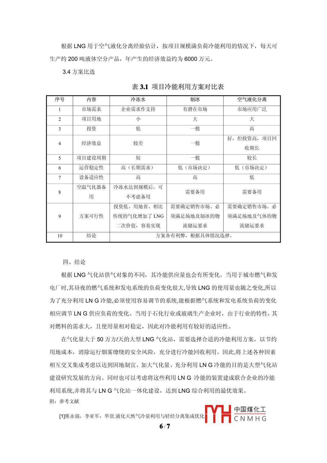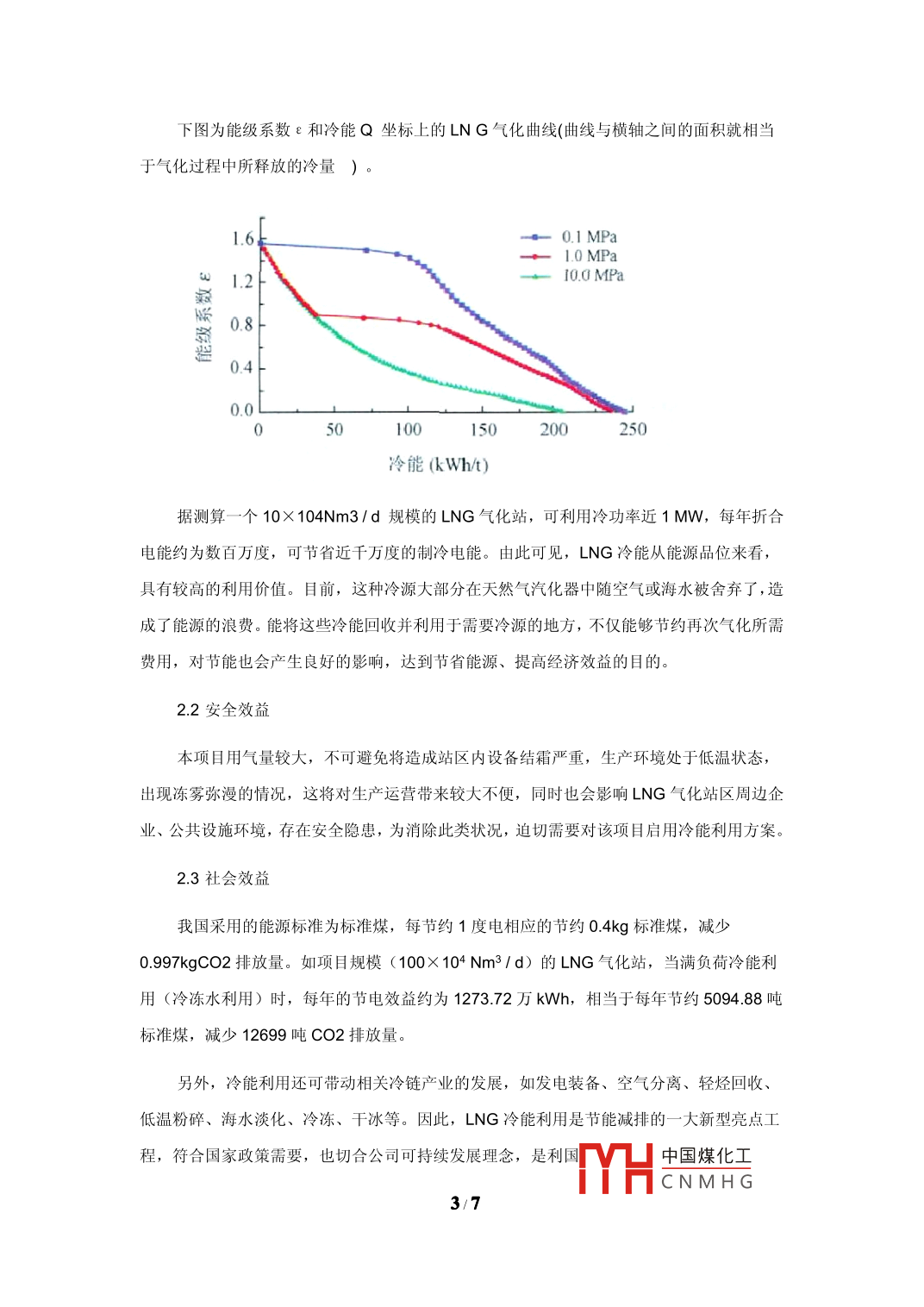大型LNG氣化站氣化工藝及冷能利用的探討王錦松中海石油福建新能源有限公司福建廈門361008中圖分類號(hào):P744.4文獻(xiàn)標(biāo)識(shí)碼:A文章編號(hào):摘要:天然氣是一種燃燒熱值高、潔凈、污染小的重要能源資源,深受各國(guó)的關(guān)注和歡迎。為了解決長(zhǎng)距離運(yùn)輸問(wèn)題,原產(chǎn)地的業(yè)主均要花費(fèi)大量的投資和能耗,把天然氣液化為L(zhǎng)NG再進(jìn)行運(yùn)輸,所以我們?cè)谝M(jìn)LNG時(shí),不僅引進(jìn)了清潔、高熱值的天然氣,同時(shí)也引進(jìn)了潛在于其中來(lái)之不易的冷能。通常LNG需要重新氣化成氣態(tài)的天然氣才能獲得利用,國(guó)內(nèi)LNG氣化站普遍采用空溫式氣化器對(duì)LNG進(jìn)行氣化,其好處是不用耗能可以完成LNG的氣化過(guò)程,但因空溫式氣化器占地面積大、投資金額大、生產(chǎn)過(guò)程霧氣彌漫等問(wèn)題而限制LNG氣化站的規(guī)模,同時(shí)LNG冷能隨著空溫式氣化器的熱交換而被舍棄在大氣中,造成能源的浪費(fèi)本文介紹了大型LNG氣化站氣化工藝選擇的優(yōu)劣,闡述各種不同氣化工藝對(duì)氣化站建設(shè)以及冷能利用的影響,重點(diǎn)探討冷能在冷凍水、制冰及空氣液化分離等方面的利用的分析對(duì)比,得出冷能利用方案的優(yōu)劣性,有利于LNG氣化站項(xiàng)目合理研究選擇氣化工藝并充分進(jìn)行冷能的利用關(guān)鍵詞:LNG氣化站氣化器冷能利用氣化工藝選擇以及對(duì)氣化站建設(shè)的影響氣化器熱源有自然熱源(空氣、海水)與人工熱源(熱水、蒸汽、電、冷凍水、冷媒)。利用自然熱源的氣化器體積較大,投資較大,運(yùn)行成本接近為零;利用人工熱源的氣化器體積較小,投資較小,運(yùn)行成本偏高。空溫式氣化器的連續(xù)工作時(shí)間一般為6~8小時(shí),如若超過(guò)8小時(shí),則出氣溫度會(huì)降低,長(zhǎng)時(shí)間使用,會(huì)導(dǎo)致氣化器結(jié)霜嚴(yán)重氣化效率降低,出口溫度達(dá)不到要求,需要另外備用一套切換使用,讓工作后氣化器進(jìn)行自然化霜。在夏季,熱交換充分,運(yùn)行情況良妤;在冬季或雨季,由于環(huán)境溫度或濕度的影響,氣化器氣化效果大大降低,影響氣化量和岀站氣溫度,同時(shí)氣化過(guò)程造成霧氣彌漫的情況,影響安全操作。中國(guó)煤化工CNMHG1/7空溫式氣化器由于體積過(guò)大或因冬季熱交換管結(jié)冰不能運(yùn)行,只適用于氣化量較小,氣溫比較高的地方例如氣化能力在50萬(wàn)方/天以上的大型氣化站,若采用空溫式氣化器作為L(zhǎng)NG氣化設(shè)備,其氣化站用地將達(dá)到30畝以上。而如果采用人工熱源氣化器,氣化站占地面積可以縮小到15畝以內(nèi)。在氣化站設(shè)計(jì)中,若采用空溫式氣化器為主、水浴式加熱器為輔,互為備用,這樣的設(shè)計(jì)有以下優(yōu)點(diǎn):1、節(jié)省約四分之一空溫式氣化器投資成本;2、節(jié)省一半空溫式氣化器的占地面積;3、在外界溫度條件許可情況下,投用空溫式氣化器,運(yùn)行成本接近為零;在有免費(fèi)熱源的情況下,投用水浴式氣化器,運(yùn)行成本相對(duì)較低,而且氣化能力明顯增加,同時(shí)可以解決冬季或陰雨天氣情況下空溫式氣化器嚴(yán)重結(jié)霜以及周邊霧氣彌漫而影響安全生產(chǎn)的問(wèn)題采用自然熱源的空溫式氣化器或海水水浴式氣化器,LNG冷能隨著氣化器的熱交換而被舍棄在大氣或海水中,造成能源的浪費(fèi)。采用人工熱源的氣化器,在用熱水、蒸汽和電等作為熱交換源時(shí),氣化站運(yùn)行成本較髙;而在用冷凍水、冷媒進(jìn)行熱交換時(shí),很大程度能夠?qū)NG潛在的冷能利用起來(lái),而且該部分冷能的利用價(jià)值相當(dāng)可觀。因此冷能利用在大型LNG氣化站中的利用,值得進(jìn)一步研究和推廣實(shí)施。、LNG冷能回收的意義和途徑LNG是由低污染天然氣經(jīng)過(guò)脫酸、脫水處理,通過(guò)低溫工藝?yán)鋬鲆夯傻牡蜏?62℃)的液體混和物,其密度大大地增加(約600倍),有利于長(zhǎng)距離運(yùn)輸。每生產(chǎn)一噸LNG的動(dòng)力及公用設(shè)施耗電量約為850kWh,而在LNG氣化站,一般又需將LNG通過(guò)氣化器氣化后使用,氣化時(shí)放出很大的冷量,其值大約為830kJ/kg(包括液態(tài)天然氣的氣化潛熱和氣態(tài)天然氣從儲(chǔ)存溫度復(fù)溫到環(huán)境溫度的顯熱)。這種冷能從能源品位來(lái)看,具有較高的利用價(jià)值,而其通常在天然氣氣化器中隨空氣或海水被舍棄了,造成了能源的浪費(fèi)。為此,通過(guò)特定的工藝技術(shù)利用LNG冷能,可以達(dá)到節(jié)省能源、提高經(jīng)濟(jì)效益的目的。2.1節(jié)省能源、提高經(jīng)濟(jì)效益LNG的液化費(fèi)用約占LNG總成本的30%,這30%的費(fèi)用通過(guò)冷源的方式蓄積在LNG中。通常LNG需要重新汽化成氣態(tài)的天然氣才能獲得利用,而當(dāng)LNG在1atm(1atm=0101325MPa)壓力下氣化時(shí),釋放出常溫氣體的冷量約220H二L中國(guó)煤化工根據(jù)氣化壓力的不同,LNG冷量有所不同CNMHG2/7下圖為能級(jí)系數(shù)ε和冷能Q坐標(biāo)上的LNG氣化曲線(曲線與橫軸之間的面積就相當(dāng)于氣化過(guò)程中所釋放的冷量)。-O1 MPa.O MPa1.2IOC MPa0.8040.00100150200250冷能(kWh/t)據(jù)測(cè)算一個(gè)10×104Nm3/d規(guī)模的LNG氣化站,可利用冷功率近1MW,每年折合電能約為數(shù)百萬(wàn)