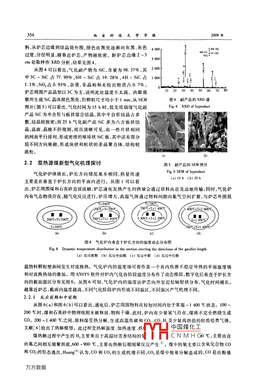 第29卷第3期西安科技大學學報Vol 29 No. 32009 45 A JOURNAL OF XI' AN UNIVERSITY OF SCIENCE AND TECHNOLOGYMay. 200文章編號:1672-9315(2009)03-0352-06雙熱源煤新型氣化機理研究田玉仙,王曉剛2,張亞平,吳敏煥',王喜蓮',強軍鋒!,田欣偉(1.西安科技大學理學院陜西西安710054;2.西安科技大學材料科學與工程學院陜西西安710054)摘要:以煤和石英砂為原料,在自制雙熱源煤新型氣化爐上實現(xiàn)了煤炭新型氣化,測試了氣化產(chǎn)物,從氣化原料的高溫結(jié)構(gòu)相變和氣化反應過程熱力學分析出發(fā),研究了煤新型氣化機理。結(jié)果表明:雙熱源煤新型氣化的產(chǎn)物除了富含Co的煤氣外,還包括大量SiC副產(chǎn)品,其晶相以3C-siC(77.99%)和6H-SiC(19.28%)為主,煤氣中可燃氣體濃度為86.9%~90.5%,產(chǎn)率5.0m3/h;氣化爐內(nèi)不同溫區(qū),煤氣產(chǎn)生原理不同,0~1400℃溫區(qū),煤氣主要來源于原料干燥和煤熱解反應,1400-2600℃溫區(qū),煤氣主要來源于多孔焦碳與SiO2a,S0O2s及中間產(chǎn)物Si0s的電熱還原反應,同時伴生副產(chǎn)品SiC;各氣化反應階段所產(chǎn)煤氣總量為該時刻所有溫區(qū)所產(chǎn)煤氣總和。關(guān)鍵詞:煤炭氣化;反應機理;多熱源;氣化爐;碳化硅中圖分類號:TQ53文獻標志碼:A中國是一個煤資源較為豐富的國家煤的年產(chǎn)量在10億t以上,在一次能源消費中占72%左右,其中大部分是直接燃燒用于電力工業(yè)和運輸行業(yè),不僅能源利用率低下,而且會釋放大量SO2,CO2,煙塵和NO,嚴重污染環(huán)境。以“煤氣化為基礎的多聯(lián)產(chǎn)技術(shù)”,是實現(xiàn)煤炭潔凈、高效開發(fā)與利用的途徑口。然而我國煤氣化比重較低,且整體氣化技術(shù)比較落后。開發(fā)新的煤炭氣化方法,盡快形成有自主知識產(chǎn)權(quán)的煤氣化技術(shù)迫在眉睫。課題組在多年從事煤炭潔凈轉(zhuǎn)化研究中,以煤、石英砂、電為基礎資源,在自行發(fā)明的雙熱源煤新型氣化爐上實現(xiàn)了煤的氣化,并得到了四高SiC副產(chǎn)品23。文中用雙熱源煤新型氣化法將陜北低變質(zhì)煙煤變成了富含CO煤氣,并結(jié)合原料的高溫結(jié)構(gòu)相變,從爐內(nèi)氣化反應過程熱力學出發(fā),研究了氣化機理。實驗表1煤質(zhì)分析Tab 1 Technical analysis of bituminous業(yè)分析/%(F C14.03實驗采用自行發(fā)明的雙熱源煤新型氣化爐(圖1),爐膛體積740mmx560mmx1140mm,裝料量約300kg,雙石墨矩形爐芯,尺寸為40mm×40mmx60mm,供電功率30~35kW,集氣裝置為自制高分子復合材料集氣罩,送電前集氣罩頂部距爐表580mm,實驗原料有石英砂和陜北低變質(zhì)煙煤。石英砂純度99%,粒度0~5mm,煤粒度0~4mm,煤質(zhì)分析見表1。按碳硅比067配料后球磨混合120mn直接裝爐氣化。煤氣由排氣管引出后直接燒掉。定時釆集煤氣,用中國煤化工璃轉(zhuǎn)子流量計CNMHG收稿日期:2008基金項目:國家自然科學基金項日(50174046作者簡介:田玉仙(1970-),女,重慶市人,副教授博士生,主要從事礦物加工利用研究第3期田玉仙等:雙熱源煤新型氣化機理研究353分別對氣體組分和氣流量進行分析用“U型”壓力計在線監(jiān)測爐壓,使之始終處于微正壓狀態(tài),用D/max-2400型X射線衍射儀測定副產(chǎn)品SC晶相,用掃描電鏡觀察SC的形貌。2結(jié)果與分析圖1實驗裝置2.1雙熱源煤新型氣化產(chǎn)物Fig. 1 Experimental apparatus表2煙煤全新料氣化后煤氣成分Tab2 Gas composition of new bituminous material時間/hCO,+ NH3Hz53,90.530.80.731.3一全新料培燒料焙燒料會新料12132345678910111213時間/h時間/h圖2焙燒原料對煤氣有效成分影響Fig. 2 The effect of roasting material on gas compositio(a)co(b)CO+H2(c)CO+H,+CH4雙熱源煤新型氣化產(chǎn)物有2種:主產(chǎn)品煤氣和副產(chǎn)品SiC.從表2可知,低變質(zhì)煙煤全新料氣化后所得煤氣主要由CO組成還含有一定量的H2,CH4以及微量的CO2,N2,O2NH3全新料氣化,整個氣化反應期間CO濃度介于475%E3.5612%,H2的濃度介于23.2%~31.3%,CH4的濃度介于61%6-8.1%,化工原料氣(CO0+H1)的濃度介于788%~81.24%,可燃性氣體濃度介于86.9%-90.5%。而采用焙燒料(原料先在1000℃下焙燒后再氣化)氣化(圖2),煤氣基本成時間h分不變,但其CO濃度比全新料法高,H2的濃度略有下降,煤氣有效組分濃度增加。可見氣化工藝對煤氣有效組成有較大圖335kW氣化爐煤氣產(chǎn)率Fig 3 Gas flux of 35 kW coal gasifier影響。圖3為微正壓下(平均爐壓32kPa)實測煤氣流量。中國煤化工流量在很短時間內(nèi)迅速升至穩(wěn)定值,反應中期變化較小整個氣化過程中煤穩(wěn)定性。如果氣化時采用“循環(huán)”生產(chǎn)模式,即至少4臺氣YHa氣產(chǎn)率有一定的CNMHG化、冷卻和拆爐過程在爐組內(nèi)4臺氣化爐上循環(huán)進行,即可實現(xiàn)煤氣的連續(xù)生產(chǎn)拆妒后發(fā)現(xiàn)爐芯外圍有一近似橢圓的結(jié)晶筒。用肉眼看,結(jié)晶筒中心是黑色疏松狀石墨,為爐芯材354西安科技大學學報2009年料,從爐芯邊緣到結(jié)晶筒外圍,顏色由黑亮逐漸向灰黑、灰色40a6H-SC過度,分層明顯越靠近爐芯,產(chǎn)物越致密。距爐芯邊緣2~34H-SC+3C-siCcm處取樣作XRD分析,結(jié)果見圖4。從圖4可以看出,氣化副產(chǎn)物為SC,含量為9837%,其200中3C-SC占7.99%,6H-SC占19.28%,4H-SiC占1001.1%,SiO2占0.93%,雜質(zhì)、非晶相和未檢出物質(zhì)占0.7%。爐芯周圍產(chǎn)品晶型以3C為主,說明此處溫度不太高。肉眼觀察所生成SC晶體顏色黑亮,但顆粒尺寸均小于1mm,從SEM圖4副產(chǎn)品