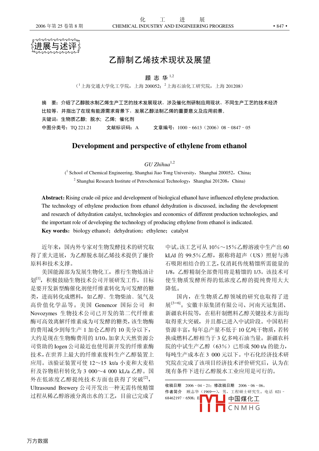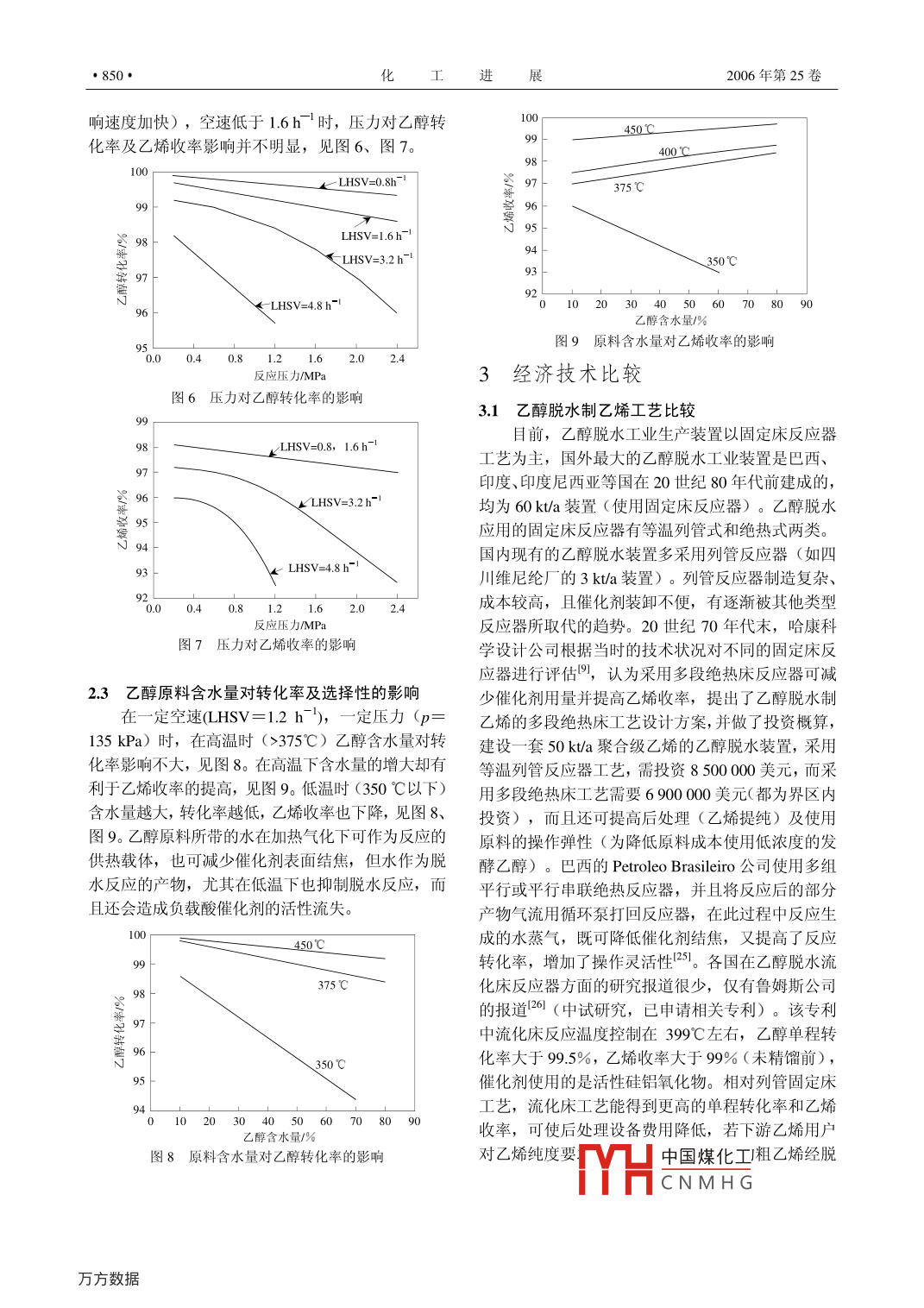 化工進(jìn)展2006年第25卷第8期CHEMICAL INDUSTRY AND ENGINEERING PROGRESS·847·進(jìn)展與述評(píng)乙醇制乙烯技術(shù)現(xiàn)狀及展望顧志華(1上海交通大學(xué)化工學(xué)院,上海200052;2上海石油化工研究院,上海201208)摘要:介紹了乙醇脫水制乙烯生產(chǎn)工藝的技術(shù)發(fā)展現(xiàn)狀,涉及催化劑研制應(yīng)用現(xiàn)狀、不同生產(chǎn)工藝的技術(shù)經(jīng)濟(jì)比較等,并指出了在現(xiàn)有能源需求背景下,發(fā)展乙醇法制乙烯的重要意義及應(yīng)用前景關(guān)鍵詞:生物質(zhì)乙醇;脫水;乙烯;催化劑中圖分類號(hào):TQ221.21文獻(xiàn)標(biāo)識(shí)碼文章編號(hào):1000-6613(2006)08-0847-0Development and perspective of ethylene from ethanolGU Zhihua.2School of Chemical Engineering, Shanghai Jiao Tong University, Shanghai 200052, China;Shanghai Research Institute of Petrochemical Technology, Shanghai 201208, China)Abstract: Rising crude oil price and development of biological ethanol have influenced ethylene productionThe technology of ethylene production from ethanol dehydration is discussed, including the developmentand research of dehydration catalyst, technologies and economics of different production technologies, andthe important role of developing the technology of producing ethylene from ethanol is indicatedKey words: biology ethanol; dehydration; ethylene; catalyst近年來(lái),國(guó)內(nèi)外專家對(duì)生物發(fā)酵技術(shù)的研究取中試。該工藝可從10%~15%乙醇溶液中生產(chǎn)出60得了重大進(jìn)展,為乙醇脫水制乙烯技術(shù)提供了廉價(jià)kLld的99,5%乙醇,據(jù)稱將超聲(US)照射與沸原料和技術(shù)支撐石吸附相結(jié)合的工藝,僅消耗傳統(tǒng)精餾所需能量的美國(guó)能源部為發(fā)展生物化工,推行生物煉油計(jì)1/⑧8,乙醇精制全部費(fèi)用將是精餾的1/3。該技術(shù)可劃口,積極鼓勵(lì)生物技術(shù)公司開展研發(fā)工作,目標(biāo)使生物質(zhì)發(fā)酵所得的低濃度乙醇的提純費(fèi)用大大是要開發(fā)新型酶催化劑使纖維素轉(zhuǎn)化為可發(fā)酵的糖降低。類,進(jìn)而轉(zhuǎn)化成燃料,如乙醇、生物柴油、氫氣及國(guó)內(nèi),在生物質(zhì)乙醇領(lǐng)域的研究也取得了進(jìn)高價(jià)值化學(xué)品等。美國(guó) Genencor國(guó)際公司和展3=。安徽豐原集團(tuán)有限公司、河南天冠集團(tuán)、Novozymes生物技術(shù)公司已開發(fā)的第二代纖維素新疆農(nóng)科院等,在秸稈制燃料乙醇關(guān)鍵技術(shù)方面均酶可高效離解纖維素成為可發(fā)酵的糖類,該生物酶取得重大突破,并且都已進(jìn)入中試階段。中國(guó)秸稈的費(fèi)用減少到每生產(chǎn)1加侖乙醇約10美分以下,資源豐富,每年總產(chǎn)量不低于10億噸干物質(zhì),若轉(zhuǎn)大約是現(xiàn)在生物酶費(fèi)用的/10加拿大天然資源公換成燃料乙醇相當(dāng)于3億多噸石油當(dāng)量。新疆農(nóng)科司資助的 logen公司最近也使用新開發(fā)的纖維素酶院的中試生產(chǎn)乙醇(63%)已形成500ta的能力,技術(shù),在世界上最大的纖維素廢料生產(chǎn)乙醇裝置上每噸生產(chǎn)成本在3000元以下。中石化經(jīng)濟(jì)技術(shù)研應(yīng)用。該驗(yàn)證裝置可使12~15kta小麥和大麥秸究院在完成了該項(xiàng)目經(jīng)濟(jì)技術(shù)評(píng)價(jià)研究后,認(rèn)為在稈及谷物秸稈轉(zhuǎn)化為3000~4000kLa乙醇。國(guó)現(xiàn)有條件下進(jìn)行乙醇脫水工業(yè)應(yīng)用是可行的外在低濃度乙醇提純技術(shù)方面也獲得了突破2Ultrasound Brewery公司開發(fā)出一種無(wú)需傳統(tǒng)精餾收稿日期2006-04-21:修改稿日期2006-06-06過(guò)程從稀乙醇溶液分離出水的工藝,目前已完成了作者簡(jiǎn)介顧志華(1969-),男,工程碩士研究生。電話02168462197-6508:E中國(guó)煤化工CNMHG·848·化工進(jìn)展2006年第25卷乙醇脫水制乙烯催化劑的研究應(yīng) Kojima等山研究發(fā)現(xiàn)氧化鋁中的堿金屬離子、硫用現(xiàn)狀鐵氧化物對(duì)催化脫水性能有很大影響,應(yīng)嚴(yán)格控制其含量,而添加元素周期表中Ⅱa、Ib、Ⅲa、Ⅳb乙醇在加熱催化條件下脫水生成氣態(tài)產(chǎn)物乙族元素的磷酸鹽,可制備出具有高轉(zhuǎn)化率及高選擇烯。該技術(shù)在工業(yè)裝置上獲取乙烯,是在20世紀(jì)性的乙醇脫水催化劑。目前已知的最有代表性的氧20年代之后,所使用的催化劑主要為活性氧化鋁,化鋁催化劑是 Holon科學(xué)設(shè)計(jì)公司開發(fā)的多元氧這是一個(gè)非均相的表面催化過(guò)程。1982年 Hassan 7化物催化劑(主要成分為Al2O3- MgO/sio2)。1981提出了乙醇在固體酸堿催化劑上反應(yīng)的催化機(jī)理,年哈康公司推出的代號(hào)為 Sydol的催化劑應(yīng)用在認(rèn)為乙醇首先吸附在催化劑表面的酸堿中心上并形時(shí)世界上最大的50kta的乙醇脫水裝置上,乙醇成吸附態(tài)化合物,然后吸附態(tài)中間產(chǎn)物脫水生成最單程轉(zhuǎn)化率97%~99%,乙烯選擇性968%,單終產(chǎn)物并恢復(fù)酸堿中心,但對(duì)具體反應(yīng)過(guò)程,目前程使用周期達(dá)8~12個(gè)月2,是當(dāng)時(shí)性能最好的仍存在爭(zhēng)論。乙醇脫水反應(yīng)在不同溫度下的主要產(chǎn)催化劑。之后又有許多研究者在活性氧化鋁基礎(chǔ)物是乙烯和乙醚。有的觀點(diǎn)認(rèn)為乙醇脫水生成乙烯、上改進(jìn)制備了各種催化脫水性能的催化劑,以適乙醚的過(guò)程是平行反應(yīn