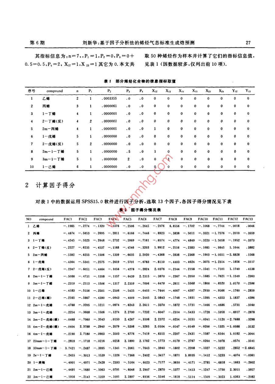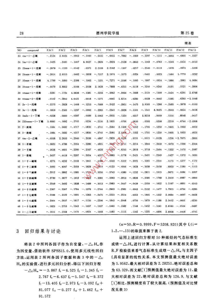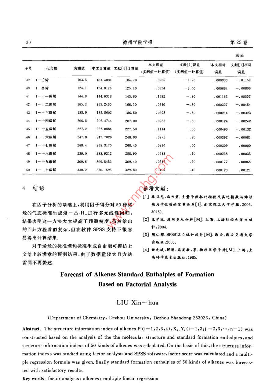 第25卷第6期德州學(xué)院學(xué)報(bào)Vol, 25,No.62009年12月Journal of Dezhou UniversityDec. ,2009基于因子分析法的烯烴氣態(tài)標(biāo)準(zhǔn)生成焓預(yù)測(cè)劉新華(德州學(xué)院化學(xué)系,山東德州253023)摘要:通過(guò)對(duì)烯烴分子結(jié)構(gòu)及其氣態(tài)標(biāo)準(zhǔn)生成燁實(shí)測(cè)數(shù)據(jù)的分析,建立了結(jié)構(gòu)信息指數(shù)P,(i=1,2,3.4),X.Y。(i=1,2;j=2.3...n-1),并計(jì)算了50種烯烴的信息指數(shù).在此基礎(chǔ)上利用SPSS軟件對(duì)信息指標(biāo)進(jìn)行因子分析,計(jì)算出因子得分,將因子當(dāng)作自變量給出多元回歸方程,并對(duì)50種烯烴的氣態(tài)標(biāo)準(zhǔn)生成焓進(jìn)行預(yù)測(cè),結(jié)果令人滿意.關(guān)鍵詞:因子分析;烯烴;多元線性回歸中圖分類號(hào): 0641文獻(xiàn)標(biāo)識(shí)碼: A文章編號(hào): 1004 - 9444(2009)06 - 0026 - 05坐標(biāo)系下畫點(diǎn)描圖,從圖像可以看出,直鏈烯烴的氣0引言態(tài)標(biāo)準(zhǔn)生成焰數(shù)據(jù)圖像基本是直線y=ax+b與曲線y=ael"疊加而成的,再結(jié)合對(duì)實(shí)驗(yàn)數(shù)據(jù)的分析,結(jié)構(gòu)性能關(guān)系的研究,一直是化學(xué)中一個(gè)十分筆者認(rèn)為烯烴的氣態(tài)標(biāo)準(zhǔn)生成焓(一OiH_)是由烯活躍的研究領(lǐng)域.多年來(lái),國(guó)內(nèi)外許多研究者作了大烴的碳原子個(gè)數(shù)n、結(jié)構(gòu)參數(shù)P1=雙鍵位置號(hào),P2量的研究工作,發(fā)展了許多根據(jù)分子結(jié)構(gòu)預(yù)測(cè)化合= EXP(-4.57n), Ps=單m基到雙鍵距離加m物性能的方法.這些方法大致可分為原子貢獻(xiàn)法.基基到中心距離,P=雙甲基mm到雙鍵距加雙基到團(tuán)貢獻(xiàn)法和化學(xué)鍵貢獻(xiàn)法三大類,單獨(dú)應(yīng)用這些方右端距,以及第i號(hào)碳上的單甲基(指該碳上只有一法計(jì)算的結(jié)果,往往使計(jì)算精度較差|-4;本文在對(duì)個(gè)甲基)信息Xn(i = 2,3,..n-1)、第j號(hào)碳上的.烯烴氣態(tài)標(biāo)準(zhǔn)生成焓的預(yù)測(cè)中,借鑒前人預(yù)測(cè)方法雙甲基(指該碳上聯(lián)有兩個(gè)甲基)信息Xx(j = 2,3,的思路,將這些方法綜合運(yùn)用,在引進(jìn)信息指數(shù)時(shí),",n- -1).第i號(hào)碳上的單乙基信息Yu(i = 3,4,既考慮到了化合物的原子貢獻(xiàn)因素,又考慮到了化.,n一2)以及第j號(hào)碳上的雙乙基信息Yz(j = 3,學(xué)鍵貢獻(xiàn)和基團(tuán)貢獻(xiàn)兩個(gè)因素,因而具有原子貢獻(xiàn)4.n-2))所決定的.其中X,Yg的取值如下定義法、基團(tuán)貢獻(xiàn)法和化學(xué)鍵貢獻(xiàn)法的優(yōu)點(diǎn),同時(shí)將因子(1當(dāng)?shù)趈號(hào)碳上接有單(雙)甲基時(shí)0其他分析這一-先進(jìn)的數(shù)據(jù)分析方法用在了烯烴氣態(tài)標(biāo)準(zhǔn)1當(dāng)?shù)趈號(hào)碳上接有單(雙)乙基時(shí)生成焓的預(yù)測(cè)上,大大提高了預(yù)測(cè)精度.例如:233mmm-1-丁烯,其隱氫圖為1基本思路與信息指標(biāo)的采集首先將直鏈烯烴的碳原子個(gè)數(shù)看作自變量,烯烴的氣態(tài)標(biāo)準(zhǔn)生成焓試驗(yàn)數(shù)據(jù)當(dāng)作因變量,在直角收稿日期: 2009-09 -22作者簡(jiǎn)介:劉新華(1956-).女,山東德州人,教授,主要從事結(jié)構(gòu)與物性關(guān)系方面的研究.第6期劉新華:基于因子分析法的烯烴氣態(tài)標(biāo)準(zhǔn)生成焓預(yù)測(cè)27其指標(biāo)信息為:n=7,,P1=1,P:=0,P.=0+取 50種烯烴作為樣本并計(jì)算了它們的指標(biāo)信息值,0.5=0.5,P.=2, Xz=1,Xx=1其它為0.本文共見(jiàn)表1 (因數(shù)據(jù)較多,僅列出前10項(xiàng)).表1部分烯烴化合物的僧息指標(biāo)取值compoundPP2PsP。XIz Xns XI XIis Xzs Xzu YI2_ YI3乙烯.0033555丙烯. 0000611-丁烯.0000010.02一丁烯(反)2m-丙烯. 00000101-戊烯.0000002-戊烯(反). 00000002m-1-丁烯3m-1-丁烯11一己烯.00000002計(jì)算因子得分對(duì)表1中的數(shù)據(jù)運(yùn)用SPSS15. 0軟件進(jìn)行因子分析,選取13個(gè)因子,各因子得分情況見(jiàn)下表表2因子得分情況表NO compoundFACI FAC2 FAC3FAC4 FAC5 .FAC6 FAC7 FAC8 FAC9 FACI0 FACIIFAC12 FAC131乙爛-.1985 -.2774 -.1320 -.1076 -.2506 -.2645 -.2976 6. 8556 -.1702 -.1068 -.7744 - .0018. 00462丙烯-.4674 -.5653 -.2695 -.2811 -.6166 -.7446 -. 8923 -.3838 -.5011 -.3321 -1.7576 -.2010 -.355931-丁螈-.4545 -.5525- -.2648 - -.2732 -.5969 -.7161-.8574 -.4774 -.4849 -.3220 -1.5058 - .1952 -.337342-T烯(反)-.2527 -.6235 -.4537 -.1168 -.4546 -.3203 1.9912 -.2516 -.2383 -.1685 -.9845 1.1644 .38885 2m-丙烯-5382 -.6255 -.1506 -.1339 -.6635 2.2020 -.4368 -.2838 -.236861一戊燔-.4364 - .5341 一.2575 一.2619 - .5701 - - .6783 -.8110 -.4403- -.4624 - .3075 . -1.2314 -.1856 -.31177 2-戊爝(反)- .2347 -.6051 -.4464 -.1056 -.4278 -.2824 2.0376 -.2144 -.2158 -.1541 -.7101 1.1740 .413882m-1-T烯9 3m-1-T烯-.2319 -.2513 -.1506 -.1317 2.2359 -.7696 -.6479 -.2611 -.5568 -.1800 -.8520 1.0170 -. 2596101一己烯-.4183 -.5156 -.2501 -.2506 -.5433 -.6403 -.7644 -. 4007 - .4397 -. 2930-.9566 -.1760 -. 285911 2-已燥(曬)-.2165 一.5867 -.4390 -.0943 -.4009 -.2445 2.0843 -.1748 -.1931 -.1395 -.4353 1.1837 . 43912 2m-1一成烯-.4788 -.3205 -.1211 -.0974 -.6243 2.2611 -.3370 -.1872 -.1731 - .1466 -.4686 .5731 .316013 3m-1-戊燔14 3m-2-戊媚(順) -.0468 -.7060 - .3543 .0150 2.4267 -.3106 2.2372 -.0254- .3151 -.0341 -.1120 -2.7688 .329815 4m-2-戊婦(贖) -.0404 2.3788 -.2940 -.2079 -.5208 -.3293 2.0104 -.0147 -.0149 -.0200 -.1325 -1.0588 .313216 4m-1-戊烯-.2190 2.7180 - .0903 -.3503 -.6776 - .7419-.8315 - .2207 - .2431 -.1587 -.6164 1.0182 -