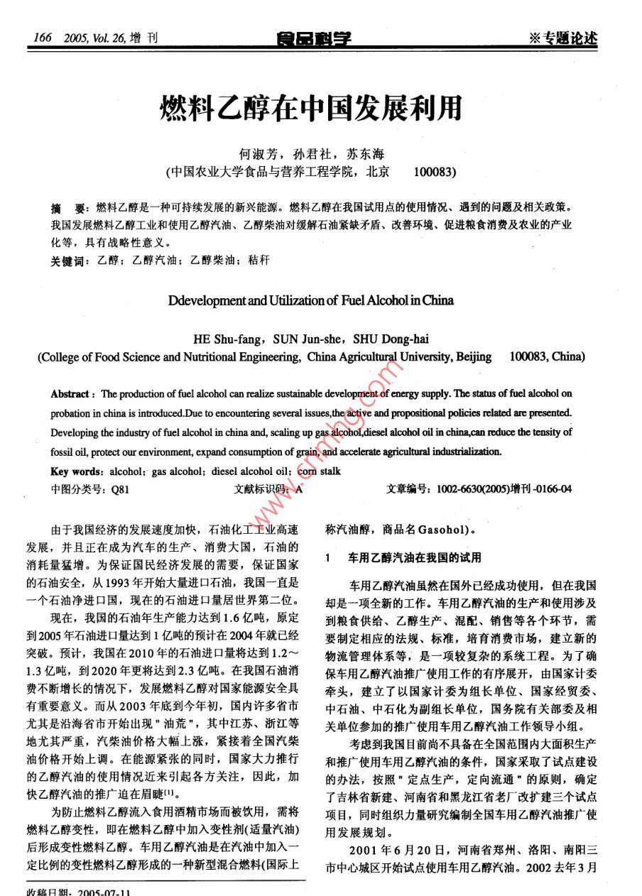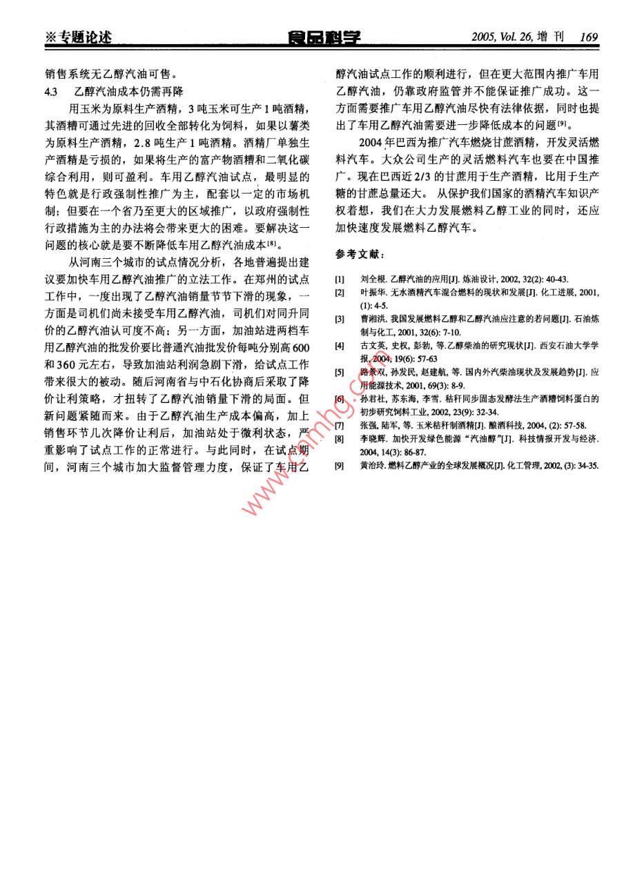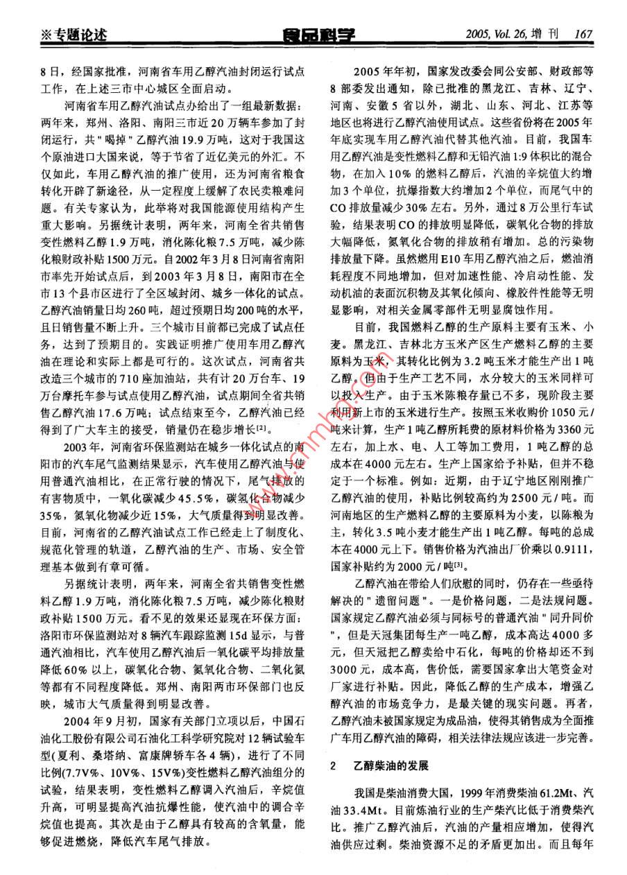 1662005,Vol.26,增刊食品學(xué)※專題論述燃料乙醇在中國(guó)發(fā)展利用何淑芳,孫君社,蘇東海(中國(guó)農(nóng)業(yè)大學(xué)食品與營(yíng)養(yǎng)工程學(xué)院,北京100083)摘要:燃料乙醇是一種可持續(xù)發(fā)展的新興能源。燃料乙醇在我國(guó)試用點(diǎn)的使用情況、遇到的問(wèn)題及相關(guān)政策。我國(guó)發(fā)展燃料乙醇工業(yè)和使用乙醇汽油、乙醇柴油對(duì)緩解石油緊缺矛盾、改善環(huán)境、促進(jìn)糧食消費(fèi)及農(nóng)業(yè)的產(chǎn)業(yè)化等,具有戰(zhàn)略性意義。關(guān)鍵詞:乙醇;乙醇汽油;乙醇柴油;秸稈 Ddevelopment and Utilization of Fuel Alcohol in China HE Shu-fang, SUN Jun-she, SHU Dong-hai (College of Food Science and Nutritional Engineering, China Agricultural University, Beijing 100083, China) Abstract: The production of fuel alcohol can realize sustainable development of energy supply. The status of fuel alcohol on probation in china is introduced. Due to encountering several issues, the active and propositional policies related are presented. Developing the industry of fuel alcohol in china and, scaling up gas alcohol,diesel alcohol oil in china,can reduce the tensity of fossil oil, protect our environment, expand consumption of grain, and accelerate agricultural industrialization. Key words: alcohol: gas alcohol: diesel alcohol oil: cor stalk中圖分類號(hào):Q81文獻(xiàn)標(biāo)識(shí)碼:A文章編號(hào):1002-6630(2005)增刊-0166-04由于我國(guó)經(jīng)濟(jì)的發(fā)展速度加快,石油化工工業(yè)高速稱汽油醇,商品名Gasohol)發(fā)展,并且正在成為汽車的生產(chǎn)、消費(fèi)大國(guó),石油的消耗量猛增。為保證國(guó)民經(jīng)濟(jì)發(fā)展的需要,保證國(guó)家車用乙醇汽油在我國(guó)的試用的石油安全,從1993年開始大量進(jìn)口石油,我國(guó)一直是車用乙醇汽油雖然在國(guó)外已經(jīng)成功使用,但在我國(guó)一個(gè)石油凈進(jìn)口國(guó),現(xiàn)在的石油進(jìn)口量居世界第二位。卻是一項(xiàng)全新的工作。車用乙醇汽油的生產(chǎn)和使用涉及現(xiàn)在,我國(guó)的石油年生產(chǎn)能力達(dá)到1.6億噸,原定到糧食供給、乙醇生產(chǎn)、混配、銷售等各個(gè)環(huán)節(jié),需到2005年石油進(jìn)口量達(dá)到1億噸的預(yù)計(jì)在2004年就已經(jīng)要制定相應(yīng)的法規(guī)、標(biāo)準(zhǔn),培育消費(fèi)市場(chǎng),建立新的突破。預(yù)計(jì),我國(guó)在2010年的石油進(jìn)口量將達(dá)到1.2~物流管理體系等,是一項(xiàng)較復(fù)雜的系統(tǒng)工程。為了確1.3億噸,到2020年更將達(dá)到2.3億噸。在我國(guó)石油消保車用乙醇汽油推廣使用工作的有序展開,由國(guó)家計(jì)委費(fèi)不斷增長(zhǎng)的情況下,發(fā)展燃料乙醇對(duì)國(guó)家能源安全具牽頭,建立了以國(guó)家計(jì)委為組長(zhǎng)單位、國(guó)家經(jīng)貿(mào)委、有重要意義。而從2003年底到今年初,國(guó)內(nèi)許多省市中石油、中石化為副組長(zhǎng)單位,國(guó)務(wù)院有關(guān)部委及相尤其是沿海省市開始出現(xiàn)"油荒,其中江蘇、浙江等關(guān)單位參加的推廣使用車用乙醇汽油工作領(lǐng)導(dǎo)小組。地尤其嚴(yán)重,汽柴油價(jià)格大幅上漲,緊接著全國(guó)汽柴考慮到我國(guó)目前尚不具備在全國(guó)范圍內(nèi)大面積生產(chǎn)油價(jià)格開始上調(diào)。在能源緊張的同時(shí),國(guó)家大力推行和推廣使用車用乙醇汽油的條件,國(guó)家采取了試點(diǎn)建設(shè)的乙醇汽油的使用情況近來(lái)引起各方關(guān)注,因此加的辦法,按照”定點(diǎn)生產(chǎn),定向流通的原則,確定快乙醇汽油的推廣迫在眉睫。了吉林省新建、河南省和黑龍江省老廠改擴(kuò)建三個(gè)試點(diǎn)為防止燃料乙醇流入食用酒精市場(chǎng)而被飲用,需將項(xiàng)目,同時(shí)組織力量研究編制全國(guó)車用乙醇汽油推廣使燃料乙醇變性,即在燃料乙醇中加入變性劑(適量汽油)用發(fā)展規(guī)劃。后形成變性燃料乙醇。車用乙醇汽油是在汽油中加入一2001年6月20日,河南省鄭州、洛陽(yáng)、南陽(yáng)三定比例的變性燃料乙醇形成的一種新型混合燃料(國(guó)際上市中心城區(qū)開始試點(diǎn)使用車用乙醇汽油。2002去年3月收稿日期200507-11※專題論述食品科學(xué)200,o.26增刊1678日,經(jīng)國(guó)家批準(zhǔn),河南省車用乙醇汽油封閉運(yùn)行試點(diǎn)2005年年初,國(guó)家發(fā)改委會(huì)同公安部、財(cái)政部等工作,在上述三市中心城區(qū)全面啟動(dòng)。8部委發(fā)出通知,除已批準(zhǔn)的黑龍江、吉林、遼寧、河南省車用乙醇汽油試點(diǎn)辦給出了一組最新數(shù)據(jù):河南、安徽5省以外,湖北、山東、河北、江蘇等兩年來(lái),鄭州、洛陽(yáng)、南陽(yáng)三市近20萬(wàn)輛車參加了封地區(qū)也將進(jìn)行乙醇汽油使用試點(diǎn)。這些省份將在2005年閉運(yùn)行,共喝掉”乙醇汽油19.9萬(wàn)噸,這對(duì)于我國(guó)這年底實(shí)現(xiàn)車用乙醇汽油代替其他汽油。目前,我國(guó)車個(gè)原油進(jìn)口大國(guó)來(lái)說(shuō),等于節(jié)省了近億美元的外匯不用乙醇汽油是變性燃料乙醇和無(wú)鉛汽油1:9體積比的混合僅如此,車用乙醇汽油的推廣使用,還為河南省糧食物,在加入10%的燃料乙醇后,汽油的辛烷值大約增轉(zhuǎn)化開辟了新途徑,從一定程度上緩解了農(nóng)民賣糧難問(