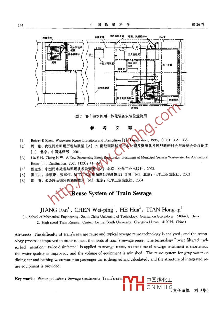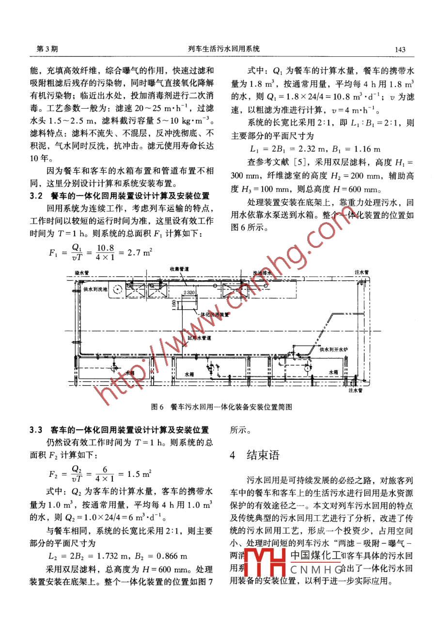 第26卷,第3期中國鐵道科學Vol.26 No.32005年5月CHINA RAILWAY SCIENCEMay, 2005文章編號: 1001-4632 (2005) 03-0141-04●成果簡報.列車生活污水回用系統(tǒng)江帆',陳維平',何華2,田紅旗2(1.華南理工大學機械工程學院,廣東廣州510640; 2. 中南大學高速列車研究中心,湖南長沙410075)摘要: 分析列車生活污水回用的難點及典型的污水回用工藝,對污水回用典型工藝進行改進。采用“兩濾-吸附一曝氣-兩消毒”污水回用工藝,使得污水處理時間縮短、出水水質(zhì)提高、占有空間減小。并就餐車的雜排水和客車的洗浴排水回用系統(tǒng)分別進行設計計算,給出一體化回用裝置結(jié)構(gòu)。關鍵詞:水污染;污水處理;列車生活污水;回用系統(tǒng)中團分類號: X731 .031文獻標識碼: B在長途旅行列車上,旅客使用過的水,污染雜于列車車輛的制造成本,設計污水回用系統(tǒng)時應平質(zhì)只占0.1%左右,比海水的3.5%少得多。污水.衡處理效果和制造費用的矛盾,達到污水回用與運經(jīng)過適當再生處理,可以重復利用“"。列車上供水行消耗的統(tǒng)一量的約80%變?yōu)樯钗鬯懦?,如果收集起來?.2列車生活污水回用水質(zhì)指標生處理后70%可以安全回用,就有列車上供水量2000年3月20日國務院令頒布了水污染防治的一半以上可以變成再生水。本文根據(jù)列車運行本法實施細則,其第21條明確規(guī)定:“生活飲用水地身的特點及用水的要求,研究適合列車應用的生活表水源一級保護區(qū)內(nèi)的水質(zhì)適用國家‘地表水環(huán)境污水回用工藝及裝備系統(tǒng),以節(jié)約珍貴的水資源。質(zhì)量標準’I類標準,二級保護區(qū)內(nèi)的水質(zhì)適用國家皿類標準。”I類標準中關于有機物綜合性指標1列車生活污水回用系統(tǒng)特點及技術(shù)有CODa,BOD3與高錳酸鹽指數(shù)(即耗氧量指標0OD),相應的限值是15, 3, 4 mg'L1。1.1 列車生活污水回用系統(tǒng)特點2列車生活污水回用工藝列車在鐵道線路.上不停地運行,受空間結(jié)構(gòu)、運行時間、制造成本的影響,使得列車生活污水回2.1污水回用典型工藝用具有一-定的難度,因此,設計合理的列車生活污.列車.上生活污水有三種形式:餐車上的雜排水回用系統(tǒng)應具有如下特點。水,旅客洗浴排水,大小便沖洗排水。針對這三類1)整個回用系統(tǒng)應緊湊。列車是-一個狹長體,污水回用的典型工藝[4)為:雜排水回用工藝流程如大部分空間用來承載旅客,而設備安裝空間很小,圖1所示;洗浴排水回用工藝流程如圖2所示;便必須采用處理空間小、質(zhì)量輕的設備體系。沖洗排水回用工藝流程如圖3所示。2)處理時間短。列車運行時間有限,為能及. 上述回用水處理工藝處理效果及出水水質(zhì)典型時迅速地將車上的生活污水進行回用處理,要選用值如表1所示。(或設計)工藝流程短的污水回用工藝。2.2列車生活污水回用工藝3)處理效益高。列車上污水回用的使用對象中國煤化工點,對污水回用系統(tǒng)是旅客,要求處理效果好、處理水質(zhì)高,另外,限的,MYHCN MH C面的改進:因為便收稿日期: 2004-06-04作者簡介:江帆(1974-),男,湖南慈利人,博士研究生。基金項目:廣東省科技攻關計劃(2003C34504)142中國鐵道科學第26卷沖洗排水回用處理工藝復雜,回用周期長,暫不對用同-套設施進行回用處理,使系統(tǒng)結(jié)構(gòu)緊湊。工其進行處理;而將雜排水與洗浴排水工藝合一,采藝流程如圖4所示。[凝聚劑C接觸氧化[雜排水了一最浮物過路著一砂也一[話性炭了便沖洗排水了一[接觸氧化了一[沉淀了一過雄C發(fā)聚劑[國用水]--- 加壓]←一[水池]國用水←C加壓]←水池[消毒劑]圖1雜排水回用工藝流程圖圖3便沖排水回用工藝流程圖| ,凝聚劑凝聚劑雜排水| 洗浴排水毛發(fā)過濾器矽雄一活性炭[粗過雄器纖維精館「洗俗排水FL[ 消毒劑清毒劑.圓用水 ]C 加壓上口水箱國用水加壓t水池圖4列車污水回用工藝流程圖圖2洗浴排水回用工藝流程圖表1處理效果及 出水水質(zhì)指標CODBOD3 .ABS色度細菌總數(shù)總大腸菌群水酒水質(zhì)/(mgLI) /(mg"L~1) /(mg*L"I) /(mg*L-I)度pH值1(個.mL-1) 1(個.mL-")原污水水質(zhì)8358432.87.62.1x 1051.8X 10*回用水水質(zhì)5.20.40.17.55<3處理效果/%94999)687722.77.72.2x 1061.7x 10%優(yōu)年回用水水質(zhì)3.800.27.8排水98)3002981481192.0527.0105~ 10610* ~107便沖洗21.31.20.05.67.2排才采用圖4所示的“兩濾一吸附一曝氣- -兩消進水粗罅查殼體毒”污水回用工藝:采用粗濾方式去除毛發(fā)、懸浮物等雜質(zhì);采用高效纖維快濾工藝實現(xiàn)過濾- -吸附疑聚劑消毒劑一體化,去除膠體有機物和部分溶解性有機物;并反洗管事氣在粗濾前和回用前實施消毒。對比改進前的工藝,整個回用工藝流程短,投資少,空間小。快德室二次消毒3列車生活 污水回用裝備系統(tǒng)構(gòu)造水圖5列車污水回用- -體化裝備系統(tǒng)簡圖3.1 列車生活污水回用裝備系統(tǒng)設計計算中國煤化工根據(jù)_上述列車污水回用工藝流程,結(jié)合列車的水箱及管道布置,設計出適合列車生活污水回用的MHCNMHG,濾去毛發(fā)及一-些懸-體化裝備系統(tǒng),如圖5所示。系統(tǒng)主要由粗濾浮雜質(zhì);投加凝聚劑加速污水膠體的混凝,以便被室、高效纖維快濾室、加凝聚劑和加消毒劑裝置、無煙煤粗濾掉,同時投加消毒劑進行-一次消毒。高曝氣裝置及反沖洗裝置組成,結(jié)構(gòu)緊湊、簡單,安效纖維快濾室是關鍵