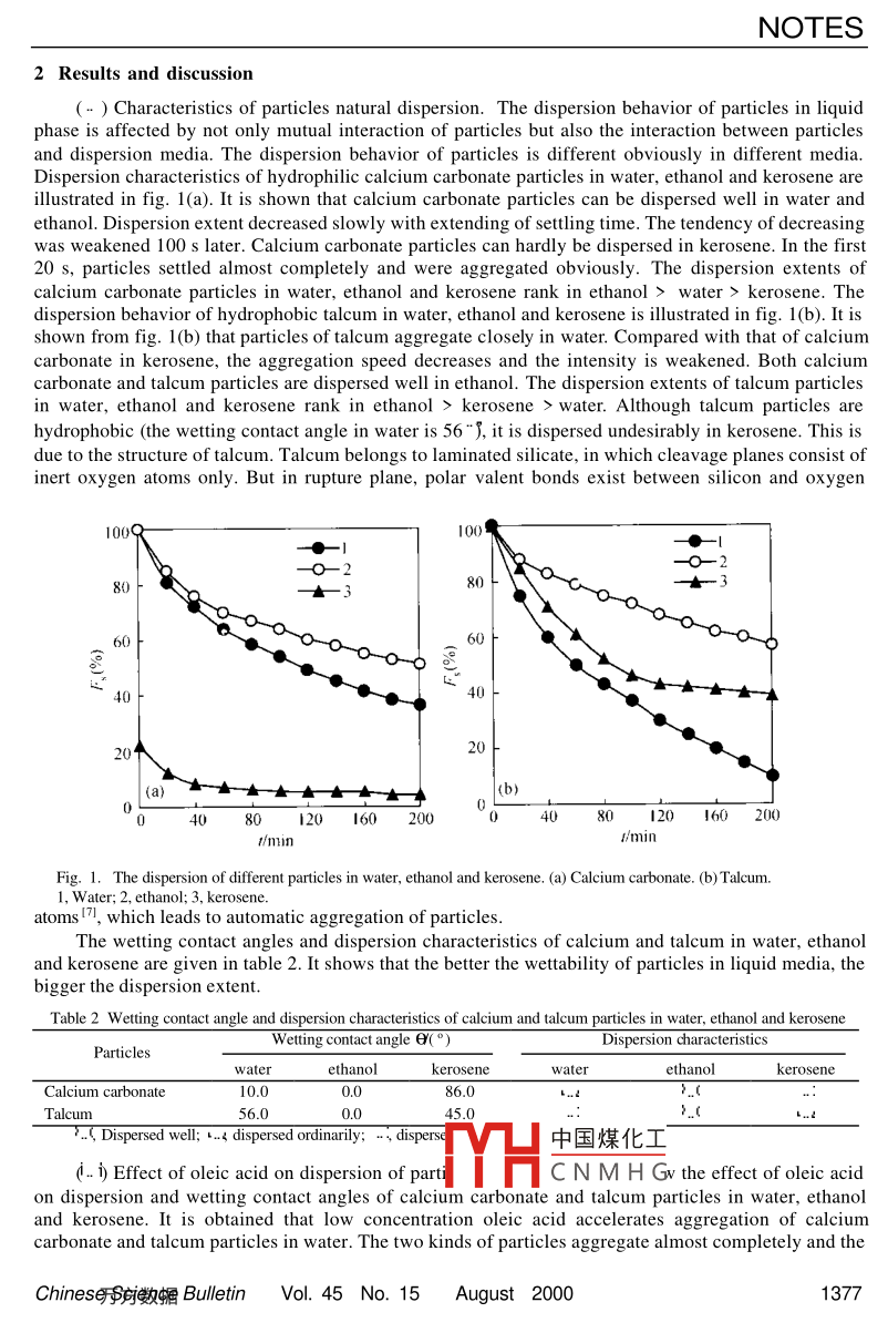 NOTES .Dispersion characteristics of fine particles in water, ethanoland keroseneREN Jun', LU Shouci?, SHEN Jian' & HU Boxing 11. Center of Research on Surface and Interface Chemical Engineering and Technology, Nanjing University, Nanjing 210093,China; .2. College of Resources Engineering, University of Science and Technology Beijig, Bejing 100083, ChinaAbstractDispersion behavior of hydrophilic calcium carbonate particles and hydrophobic talcumparticles in water, ethanol and kerosene media has been studied by sedimentation analysis. It isfound that the dispersion of fine particles complies with the principle of polarity compatibility. That isto say, the dispersion effect will be improved when surface polarity of particles is similar to that ofliquid media. The adsorption models of oleic acid on the surface of particles in water and ethanolare proposed.Keywords: fine particles, aqueous medium, dispersion behavior, adsorption model.Dispersion of fine particles in liquid phase is a common but important problem in bothfundamental research and industrial technology. Medium, the property of which affects the stability ofdispersion system to some extent, is an important part in a dispersion system. Among dispersion media,water, ethanol and kerosene are typical polar or nonpolar ones. Dispersion behavior of mineral particlesin water or organic dyes in polar or nonpolar media have been reported in literature beforell“6,, but thatof natural particles in ethanol or kerosene and dispersion characteristics of fine particles in differentmedia with different polarities have rarely been investigated.In this note, the dispersion behavior of natural hydrophilic and hydrophobic particles in differentmedia with different polarities are studied to recognize their general and individual characteristics andessence, and to supply the foundation for resolving practical problems on dispersion.1 Experimental(- ) Samples and reagents. Samples for experiment were natural hydrophilic calcium carbonate(CaCO3) taken from Lintao, Gansu Province and hydrophobic talcum from Haicheng, LiaoningProvince. The samples were purified, ground, sieved, washed and dried in the air at low temperature.The characteristics of the samples are given in table 1. Water was deionized, with pH equal to 6.5.Ethanol was absolute ethanol, a product of the Beijing Chemical Reagents Factory. Kerosene wasobtained by distilling the industrial product used in aviation at 170.. 7; oleic acid (Cc.p.) was purchasedfrom the Shanghai Chemical Reagents Factory.Table 1 Characteristics of samplesSamplesPurity (%)Density1 g“cm3P.Z.C./ pHVolume diameter /umCalcium carbonate98.572.7611.02.522Talcum91.172.611.400(. i) Experimental methods. The dispersion- aggregation of solid particle -liquid systems wasexamined using sedimentation analysis. The suspension of solid particles was agitated at 550 r/m for 5min, and then moved to a cylinder for sedimentation. A refitted electronic balance was used to measurethe change of the weight of settled particles on the balance pan with the sedimentation time. Thesediment weight at a given sedimentation duration ( W) was also obtained. From the difference betweenthe total weight Wo and W, the dispersion extent of pasticlefr hs 11*:d by the expression中國煤化工Fs =-TYHCNMHG(1)where Wo is the total weight of sample particles in the suspension, and W is the cumulative weight ofsettled particles at a given time of settling. The bigger the dispersion extent, the better the dispersioncondition of the particle suspension.1376Chinese Science BulletinVol.45 No. 15August 2000NOTES2 Results and discussion(- ) Characteristics of particles natural dispersion. The dispersion behavior of particles in liquidphase is affected by not only mutual interaction of particles but also the interaction between particlesand dispersion media. The dispersion behavior of particles is different obviously in different media.Dispersion characteristics of hydrophilic calcium carbonate particles in water, ethanol and kerosene areillustrated in fig. 1(a). It is shown that calcium carbonate particles can be dispersed well in water andethanol. Dispersion extent decreased slowly with extending of settling time. The tendency of decreasingwas weakened 100 s later. Calcium carbonate particles can hardly be dispersed in kerosene. In the first20 s, particles settled almost completely and were aggregated obviously. The dispersion extents ofcalcium carbonate particles in water, ethanol and kerosene rank in ethanol > water > kerosene. Thedispersion behavior of hydrophobic talcum in water, ethanol and kerosene is illustrated in fig.1(b). It isshown from fig. 1(b) that particles of talcum aggregate closely in water. Compared with that of calciumcarbonate in kerosene, the aggregation speed decreases and the intensity is weakened. Both calciumcarbonate and talcum particles are dispersed well in ethanol. The dispersion extents of talcum particlesin water, ethanol and kerosene rank in ethanol > kerosene > water. Although talcum particles arehydrophobic (the wetting contact angle in water is 56“), it is dispersed undesirably in kerosene. This is .due to the structure of talcum. Talcum belongs to laminated silicate, in which cleavage planes consist ofinert oxygen atoms only. But in rupture plane, polar valent bonds exist between silicon and ox ygen1005100--0-280▲360 F、600t★▲20↑20(a)一▲ ▲★★▲★▲本b)010120160 200401201602001/min/minFig. 1. The dispersion of dfferent particles in water, ethanol and kerosene. (a) Calcium carbonate. (b) Talcum.1, Water; 2, ethanol; 3, kerosene.atoms 7, which leads to automatic aggregation of particles.The wetting contact angles and dispersion characteristics of calcium and talcum in water, ethanoland kerosene are given in table 2. It shows that the better the wettability of particles in liquid media, thebigger the dispersion extent.Table 2 Wetting contact angle and dispersion characteristics of calcium and talcum pa