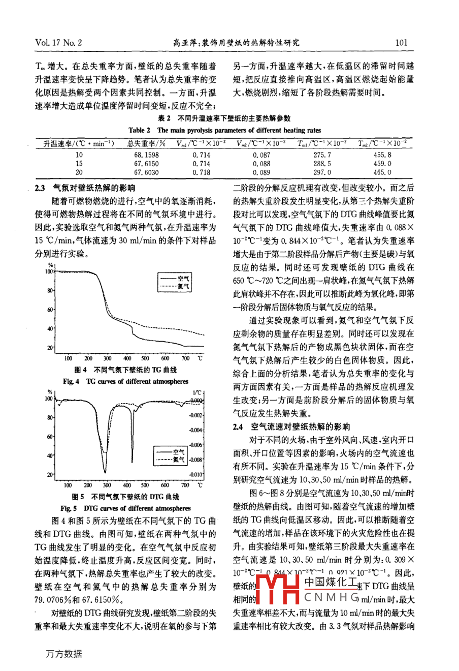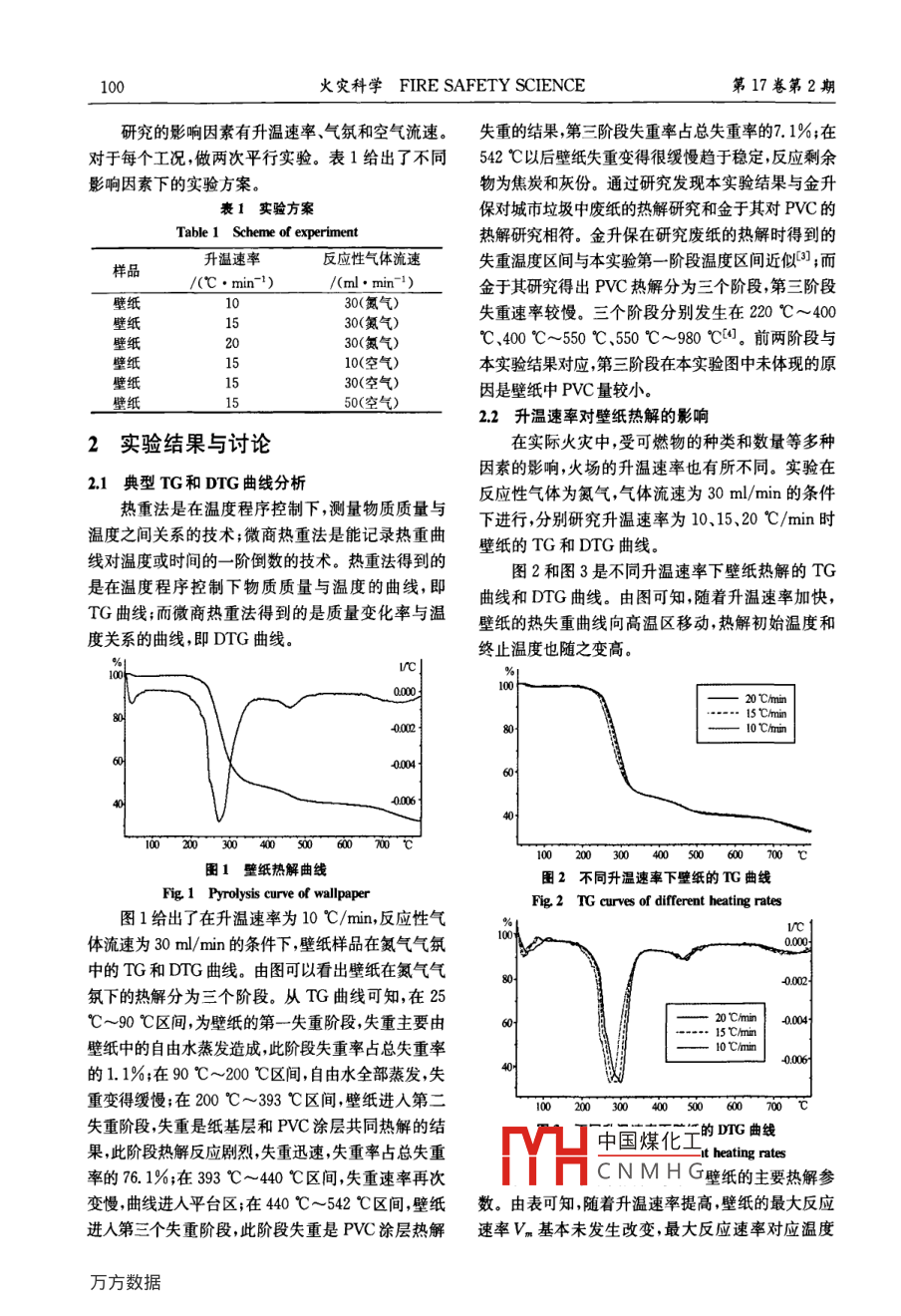 第17卷第2期火災科學VoL 17, No. 22008年4月FIRE SAFETY SCIENCE文章編號:1004-5309(2008)-009906裝飾用壁紙的熱解特性研究高亞萍(中國人民武裝警察部隊學院消防工程系,河北廊坊065000摘要:文章利用TGA851型熱重分析儀對裝飾用壁紙在不同升溫速率(10、15、20℃/min)、氣氛(氮氣、空氣)、空氣流速(10、30、50ml/min)條件下的熱解特性進行了研究。通過研究發(fā)現(xiàn),樣品的熱解失重與樣品的組成成分有關,總失重為各成分失重疊加的結果。增大升溫速率使主要熱解階段初始熱解溫度和最大失重速率對應的溫度升高,熱解反應速率增加;并且隨著升溫速率增加,TG曲線向高溫區(qū)移動。在對氣氛的比較中發(fā)現(xiàn),氧氣的參與使熱解機理發(fā)生改變,反應提前,熱解速度增快反應更徹底。而空氣流速的增加相當于氧氣的輸送量增加,新輸入的氧氣使反應后氣體被及時排出,熱失重速率提升,反應速度加快,樣品在該環(huán)境中的火災危險性增加。通過對樣品TG和DG曲線的計算,求出了各階段的活化能和頻率因子。結果表明,氯氣氣氛下隨著升溫速率加快,活化能增加。關鍵詞:壁紙;熱解特性;TGA;動力學參數(shù)中圖分類號:TU5文獻標識碼:AL1實驗樣品0引言裝飾用普通塑料壁紙,市售。以紙做基材,涂PVC糊狀樹脂,經(jīng)印花、壓花而成,是目前最普遍使在公共場所和居民住宅裝修中,壁紙使用量日用的壁紙。實驗前,將壁紙剪成小碎片備用。益增多,使得火災潛在危險性大幅度增加。但目前,1,2實驗儀器國內(nèi)外對壁紙熱解方面的研究很少,基于此原因本TGA851‘型熱重分析儀,瑞士梅特勒公司文對典型的裝飾用壁紙進行了熱解研究生產(chǎn)。熱解失重行為對著火過程是否發(fā)生,以及著火TGA851·型熱重分析儀具有溫度范圍寬、溫度發(fā)生后火蔓延過程是否能夠得以維持,均起著關鍵準確度高、可明確確定氣氛、單坩堝等特點。全程測性作用。不同的火場實際情況不同,升溫速率和量點達一百萬個,最高升溫速率可達100℃/min,空氣流速也有所不同。所以本文著重研究不同的升最高溫度為1600℃,溫度波動控制在士0.25℃,重溫速率、空氣流速、氣氛對壁紙的熱解過程的影響。量靈敏度為士0.18。它以分析速度快、樣品用量對壁紙變工況進行熱解實驗,得到TG和DTG曲少、準確、重現(xiàn)性好、分辨力高等優(yōu)點被廣泛用于火線,分析不同工況下的熱解失重規(guī)律,為室內(nèi)防火機災基礎理論研究2。理提供參考為著火機理、火災蔓延機理的研究提供13實驗方案理論依據(jù)。利用熱重分析儀研究壁紙在不同影響因素下的1實驗部分熱解特性。樣品的升溫區(qū)間設為25~800℃,天平保護收稿日期:2007-0929;修改日期:20080409H中國煤化工nCNMHG作者簡介:高亞萍(1975-),女,2001年畢業(yè)于安徽工業(yè)大學冶金工程系鋼鐵冶金專業(yè)獲工學碩士學位?,F(xiàn)為中國人民武裝警察部隊學院消防工程系力學教研室講師,主要從事力學教學與科研,材料阻燃方面的研究100火災科學 FIRE SAFETY SCIENCE第17卷第2期研究的影響因素有升溫速率、氣氛和空氣流速。失重的結果第三階段失重率占總失重率的71%;在對于每個工況,做兩次平行實驗。表1給出了不同542℃以后壁紙失重變得很緩慢趨于穩(wěn)定,反應剩余影響因素下的實驗方案。物為焦炭和灰份。通過研究發(fā)現(xiàn)本實驗結果與金升表1實驗方案保對城市垃圾中廢紙的熱解研究和金于其對PVC的Table 1 Scheme of experiment熱解研究相符。金升保在研究廢紙的熱解時得到的升溫速率反應性氣體流速樣品失重溫度區(qū)間與本實驗第一階段溫度區(qū)間近似3;而/(ml·min-1)金于其研究得出PVC熱解分為三個階段,第三階段壁紙30(氮氣)壁紙壁紙0505530(氮氣)失重速率較慢。三個階段分別發(fā)生在220℃~40030(氮氣)℃、400℃~550℃、550℃~980℃(。前兩階段與10(空氣)本實驗結果對應,第三階段在本實驗圖中未體現(xiàn)的原壁紙30(空氣)因是壁紙中PVC量較小。壁紙50(空氣22升溫速率對壁紙熱解的影響2實驗結果與討論在實際火災中,受可燃物的種類和數(shù)量等多種21典型TG和DTG曲線分析因素的影響,火場的升溫速率也有所不同。實驗在反應性氣體為氮氣,氣體流速為30ml/min的條件熱重法是在溫度程序控制下測量物質(zhì)質(zhì)量與下進行,分別研究升溫速率為10、15、20℃/min時溫度之間關系的技術;微商熱重法是能記錄熱重曲壁紙的TG和DTG曲線線對溫度或時間的一階倒數(shù)的技術。熱重法得到的圖2和圖3是不同升溫速率下壁紙熱解的TG是在溫度程序控制下物質(zhì)質(zhì)量與溫度的曲線,即曲線和DTG曲線。由圖可知,隨著升溫速率加快TG曲線;而微商熱重法得到的是質(zhì)量變化率與溫壁紙的熱失重曲線向高溫區(qū)移動,熱解初始溫度和度關系的曲線,即DTG曲線終止溫度也隨之變高。%圖1壁紙熱解曲線圖2不同升溫速率下壁紙的TG曲線Fig 1 Pyrolysis curve of wallpaperFig 2 TG curves of different heating rates圖1給出了在升溫速率為10℃/min,反應性氣體流速為30m/min的條件下,壁紙樣品在氮氣氣氛中的TG和DTG曲線。由圖可以看出壁紙在氮氣氣40002氛下的熱解分為三個階段。從TG曲線可知,在25℃~90℃區(qū)間,為壁紙的第一失重階段失重主要由0004壁紙中的自由水蒸發(fā)造成,此階段失重率占總失重率0006的1.1%;在90℃~200℃區(qū)間,自由水全部蒸發(fā),失重變得緩慢;在200℃~393℃區(qū)間,壁紙進入