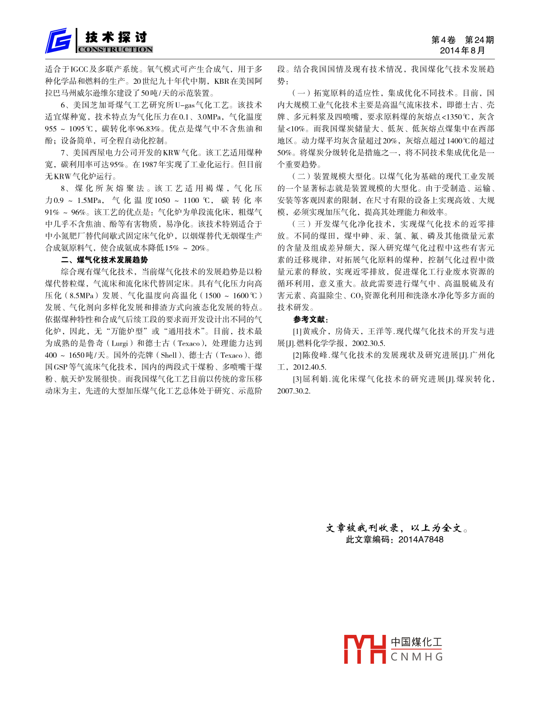 第4卷第24期技術(shù)探討2014年8月CONSTRUCTION后淺談煤氣化技術(shù)的研究與發(fā)展郝楊河南能源化工集團義煤公司安康部河南省472300摘要:簡要評述現(xiàn)代煤氣化技術(shù)中固定(移動)床、氣流床、流化床和熔融床技術(shù)開發(fā)現(xiàn)狀,在此基礎(chǔ)上,結(jié)合我國國情,煤氣化發(fā)展趨勢是拓寬原料的適應(yīng)性,集成優(yōu)化不同技術(shù)、裝置規(guī)模大型化、開發(fā)煤氣化凈化技術(shù),以及實現(xiàn)煤氣化技術(shù)的近零排放。關(guān)鍵詞:煤氣化;煤氣化技術(shù);發(fā)展趨勢中圖分類號: TF526文獻標識碼: A煤氣化是清潔、高效利用煤炭的主要途徑之- -,長期的生3、殼牌加壓氣流床煤氣化技術(shù)。該工藝氣化壓力產(chǎn)實踐表明,在各種煤炭轉(zhuǎn)化技術(shù)中,煤氣化是應(yīng)優(yōu)先考慮的2.0 ~ 4.0MPa,氣化溫度1400 ~ 1600C, 碳轉(zhuǎn)化率99%。與水-種加工方法,它是煤基化學(xué)品、煤基液體燃料、合成天然 煤漿法相比,該技術(shù)優(yōu)點是: O2和煤消耗低;負荷調(diào)解方便,氣、IGCC發(fā)電、制氫、燃料電池、多聯(lián)產(chǎn)等工藝為基礎(chǔ),因此 可根據(jù)要求關(guān)閉其中- -對, 負荷降低50%。 主要缺點是設(shè)備投發(fā)展煤炭產(chǎn)業(yè),首先要提高煤氣化技術(shù)水平。資增大,技術(shù)要求高。-、煤氣化技術(shù)開發(fā)現(xiàn)狀4、德國CSP加壓氣流床氣化技術(shù)。該工藝最大的優(yōu)勢是煤氣化技術(shù)核心是氣化爐,按煤在爐內(nèi)的流體力學(xué)行為分可氣化 工業(yè)廢棄物和生物質(zhì),把價格低廉、直接燃燒污染較大為四類,即固定(移動)床、氣流床、流化床和熔融床。的煤、石油焦、垃圾等轉(zhuǎn)化為高附加值合成氣。該工藝氣化壓(一) 固定(移動)床氣化。固定(移動)床氣化,是指力2.5 ~ 4.0MPa, 氣化溫度1400 ~ 1600C, 碳轉(zhuǎn)化率99.6%。原料煤從爐頂加人,高溫氣體不斷向上流動,整個物料自上而5、航天爐HT-L氣化技術(shù)。該工藝的煤種選擇范圍寬,碳下移動,相對固定。煤在高溫氣化劑作用下發(fā)生氣化反應(yīng),生轉(zhuǎn)化率高 于99%??刂葡到y(tǒng)自動化程度高,有完善的安保聯(lián)鎖成高溫煤氣,最后從上部煤氣出口出爐。固定(移動)床氣化系統(tǒng)。有以下四種技術(shù)路線:(三) 流化床氣化。流化床氣化,就是增大爐內(nèi)向上的氣1、單段式固定(移動)床氣化。因單段式固定(移動)流速度, 使煤粉處于沸騰懸浮狀態(tài),但又不被帶出氣化爐的操床氣化爐缺陷較多,20世紀六十年代初,國外已停止使用。目作。 因此,與固定床氣化相比,流化床氣化的優(yōu)點是氣-固和前,單段式固定(移動)床目前真正實現(xiàn)工業(yè)化的只有碎煤加固- 固接觸充分,傳熱、傳質(zhì)速率大,設(shè)備大型化。目前主要壓氣化。有以下八種技術(shù):2、兩段式固定(移動)床氣化。該工藝是上世紀四十年1、德國的溫克勒煤氣化工藝。全世界共建有70多臺溫克代開發(fā)的,到上世紀五十年代,該技術(shù)在歐洲被廣泛用于生產(chǎn)勒氣化爐。 由于存在諸多技術(shù)問題,僅在上世紀五十年代末和城市煤氣和燃料氣,氣化劑為空氣或水蒸氣。六十年代初- -度盛行,之后很少新建,運行至今的已不多見3、魯奇加壓氣化。該技術(shù)選用的煤種為長煙煤、褐煤,2、德國萊茵褐煤公司發(fā)明的高溫溫克勒氣化( HrW )。操作壓力3.0MPa,煤氣出口溫度600C,碳轉(zhuǎn)化率98%。最大該 工藝適宜煤種為褐煤,氣化壓力1 ~ 2.75MPa,氣化溫度缺點是冷凝洗滌污水含有大量焦油、苯和酚,處理難度大。目950 ~ 1000,碳轉(zhuǎn)化率96%。該工藝優(yōu)點為氧耗量低、不產(chǎn)前,魯奇氣化爐最大用戶是南非SASOL,有各種型號97臺。生液態(tài)烴。、BGL加壓氣化。以噴嘴、渣池和間歇排渣系統(tǒng)為核3、朝鮮恩德爐粉煤氣化。該技術(shù)適宜長焰煤、褐煤。碳心專有技術(shù)。該工藝選用的煤種為煙煤、次煙煤,操作壓力轉(zhuǎn)化率為91% ~ 96%。恩德爐粉煤氣化技術(shù)是- -種比較適合我2.35 ~ 3.0MPa, 煤氣出口溫度400 ~ 540C,碳轉(zhuǎn)化率99.5%。國國情的中小型潔凈煤氣化技術(shù), 可用于甲醇、氫氣、一氧化(二)氣流床氣化。在高溫高壓條件下,粉煤或水煤漿與碳等生產(chǎn),以及城市煤氣和冶金、機械、建材等行業(yè)的燃氣生氣化劑同時由噴嘴噴入氣化爐燃燒室內(nèi),迅速氣化,產(chǎn)生粗煤產(chǎn)氣和熔渣。因爐內(nèi)氣、固兩相的流速基本相同,故稱為氣流床4、魯奇公司開發(fā)的循環(huán)流化床氣化( FB)。該工藝氣化。目前,主要有以下五種技術(shù)路線:適用煤種不受限制。氣化壓力0.05 ~ 0.4MPa,氣化溫度1、德士古加壓水煤漿氣化技術(shù)。該工藝選用的煤種不限,950 ~ 11009, 碳轉(zhuǎn)化率95% ~ 98%。該工藝優(yōu)點是可以用樹氣化壓力2.7 ~ 6.5MPa, 氣化溫度1300 ~ 1500C,碳轉(zhuǎn)化率皮 、城市可燃垃圾作為氣化原料。氣化強度是移動床的2倍。95% ~ 9%。該工藝設(shè)備操作連續(xù)性強,產(chǎn)品煤氣壓力高可省該系統(tǒng)結(jié)構(gòu)簡單, 操作方便,造價較低,易國產(chǎn)化。目前, 全去后續(xù)氣體壓縮工段,廢水易處理。該技術(shù)最大的問題是因水世界已 有60多家企業(yè)采用CFB氣化技術(shù),正在設(shè)計和建設(shè)的還煤漿在噴嘴中以約30m/s的高線速度噴出,對金屬材料的沖刷有 30多家,總體水平處