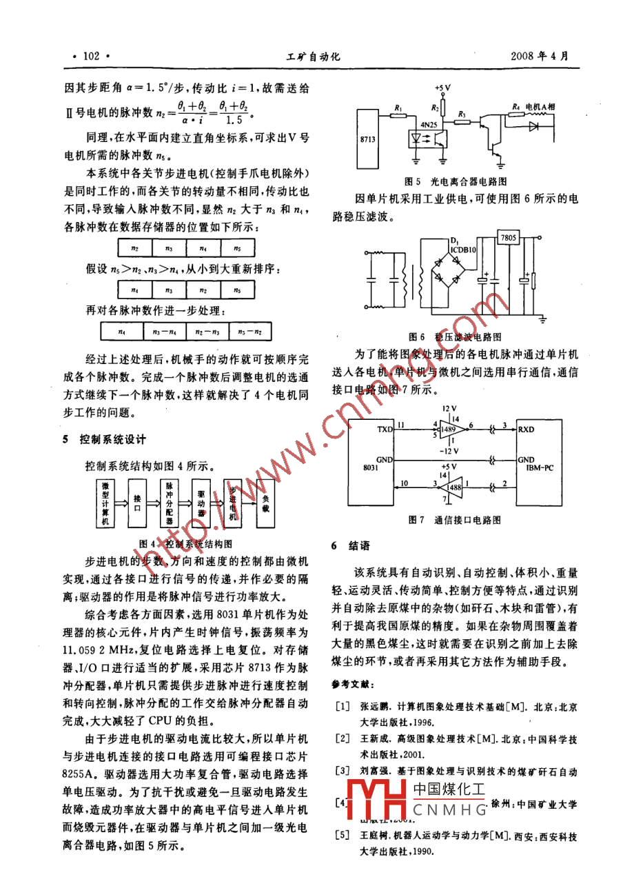 第2期工礦自動化No, 22008年4月Industry and Mine AutomationApr.2008文章編號:1671- 251X(2008)02 -0100-03煤炭除雜自動化系統(tǒng)的設(shè)計(jì)吳濤(北京神華國際技術(shù)有限責(zé)任公司,北京100011)摘要:文章介紹了煤炭除雜自動化系統(tǒng)的設(shè)計(jì),給出了系統(tǒng)的整體結(jié)構(gòu)及各組成部分的工作原理。該系統(tǒng)采用困象處理和識別技術(shù)對謀與雜物進(jìn)行識別,結(jié)合計(jì)算機(jī)技術(shù)和機(jī)械自動化技術(shù)實(shí)現(xiàn)了煤.雜物的自動關(guān)鍵詞:謀礦;除雜;自動化;計(jì)算機(jī)視覺;關(guān)節(jié)式機(jī)械手;運(yùn)動分析;控制系統(tǒng)中圖分類號:TD67文獻(xiàn)標(biāo)識碼:B2.1 硬件配置0引言考慮到現(xiàn)場的情況,選用CM0S攝像頭,像素針對目前我國煤雜分選大多采用手選,工人勞為3 000 000;采集卡選用北京中自公司的M10_ L,動強(qiáng)度大、生產(chǎn)效率低、工作環(huán)境惡劣等情況,筆者微機(jī)為586以上,內(nèi)存32MB以上,硬盤800MB以設(shè)計(jì)了煤炭除雜自動化系統(tǒng)。該系統(tǒng)將計(jì)算機(jī)視覺上,硬件必須和采集卡兼容(否則易死機(jī));考慮到環(huán)系統(tǒng)和機(jī)械手聯(lián)合起來,大大改善了工人的工作環(huán)境的影響,選用可見光作為光源(白熾燈);為使圖象境,降低了工人的勞動強(qiáng)度,提高了勞動生產(chǎn)率,具獲得高對比度,照射方法選用背向照明,即被測物放有良好的社會和經(jīng)濟(jì)效益。在光源和攝像機(jī)之間。2.2軟件設(shè)計(jì)1系統(tǒng)組成圖象的實(shí)時(shí)采集、處理、坐標(biāo)轉(zhuǎn)換程序均由VB煤炭除雜自動化系統(tǒng)包括計(jì)算機(jī)視覺系統(tǒng)、關(guān)語言編寫(程序略)。圖象處理部分包括:節(jié)機(jī)械手和控制系統(tǒng)3個(gè)部分,如圖1所示。(1)圖象的平滑處理:采用中值濾波法(較均值濾波效果好,但所需時(shí)間較長)。白熾燈(2)閾值的提取和圖象的二值化:采用大凈的尿采集控制設(shè)備攝像頭.判斷分析法,即將被分開的兩部分像素之間方差最雜物計(jì)算機(jī)通信電路輸送帶-執(zhí)行機(jī)構(gòu)大的像素作為閾值,閾值由程序自動產(chǎn)生,根據(jù)閾值二值化圖象。(3)二值化圖象的邊界跟蹤:跟蹤方法是在左圖1系統(tǒng)組成圖手法則和搜索法的基礎(chǔ)上,針對該系統(tǒng)的具體情況2計(jì)算機(jī)枧覺系統(tǒng)進(jìn)行改善。具體做法是圍繞物體中心在360°內(nèi)分成4個(gè)搜索方向,分別對應(yīng)1個(gè)搜索因子,如圖2所該系統(tǒng)的主要功能是通過對圖象的實(shí)時(shí)采集處示。找到物體的初始點(diǎn)后,先以3點(diǎn)鐘方向?yàn)槌跏祭?識別出輸送帶上產(chǎn)品中的雜物(前提:產(chǎn)品、輸方向,順時(shí)針?biāo)阉?當(dāng)相對搜索因子大于4時(shí),搜索送帶與雜物的像素值存在著較大的差別),并將需取方向改為以6點(diǎn)鐘方向?yàn)槌跏挤较蚶^續(xù)順時(shí)針?biāo)央s物的重心直角坐標(biāo)轉(zhuǎn)換成各個(gè)關(guān)節(jié)的運(yùn)動量,進(jìn)索,依次循環(huán),直至與初始點(diǎn)重合,停止搜索(稱其為而轉(zhuǎn)換各個(gè)關(guān)節(jié)電機(jī)所需的脈沖數(shù),通過I/O接口時(shí)鐘法)。送出脈沖給電機(jī)控制器,驅(qū)動電機(jī)轉(zhuǎn)動,使機(jī)械手到中國煤化工的是為了順利找達(dá)目標(biāo)點(diǎn),抓取物體,以達(dá)到除雜的效果。到下JTTHCNMH G有多個(gè)雜質(zhì)的情況,充為另一灰度值收稿日期:2007-08-24作者簡介:吳濤(1980-).男 ,江蘇常州人,碩士,助理工程師,(如200)。經(jīng)過圖象處理最后得到雜質(zhì)的面積以及現(xiàn)主要從事煤炭深加工技術(shù)和相關(guān)設(shè)備的研發(fā)工作。該物體的重心坐標(biāo)(單位像素),判斷最大雜物的面2008年第2期昊濤:煤炭除雜自動化系統(tǒng)的設(shè)計(jì)101●積是否大于一定的值,如果大于,即將其重心坐標(biāo)進(jìn)運(yùn)行時(shí)間 ,這里放棄位置求解法(因它需要進(jìn)行坐標(biāo)行單位轉(zhuǎn)化,轉(zhuǎn)化為毫米級(每像素長=0.5 mm,每系的連續(xù)變換,即變換矩陣的連乘,軟件實(shí)現(xiàn)較困難,像素寬=0.33 mm) ,再根據(jù)物體重心坐標(biāo)與各電機(jī)且所需時(shí)間較長),而推出一種求運(yùn)動方程的逆解法,所需脈沖數(shù)的關(guān)系,將坐標(biāo)數(shù)轉(zhuǎn)變成電機(jī)的脈沖數(shù),也可稱為間接位置求解法。具體實(shí)現(xiàn)方法如下:通過對VB自身的MSComm控件將脈沖數(shù)傳給單先求大.小臂的運(yùn)動參數(shù),根據(jù)大、小臂的相對片機(jī)8031。運(yùn)動情況,可將大、小臂看作為-一個(gè)伸縮機(jī)構(gòu),也就12點(diǎn)鐘方向是說大.小臂通過.一個(gè)關(guān)節(jié)相連接的目的是改變執(zhí)搜索因子kit行機(jī)構(gòu)的長度。于是角度的轉(zhuǎn)變過程便可看成是長度調(diào)整的過程,而大臂的轉(zhuǎn)動最終帶動末端執(zhí)行器9點(diǎn)鐘方向-. 3點(diǎn)鐘方向到達(dá)所指定的坐標(biāo)。小臂相對大臂轉(zhuǎn)動使AC間的搜索因子kig搜索因子kin距離調(diào)整到AC' ,使得AC的距離等于AE的距離。.大臂轉(zhuǎn)過0角,相應(yīng)的小臂運(yùn)動到E處。其運(yùn)動軌6點(diǎn)鐘方向跡如圖3所示(在大、小臂所在平面內(nèi),以大臂與底搜索因子kim座接觸中心為坐標(biāo)原點(diǎn)建立直角坐標(biāo)