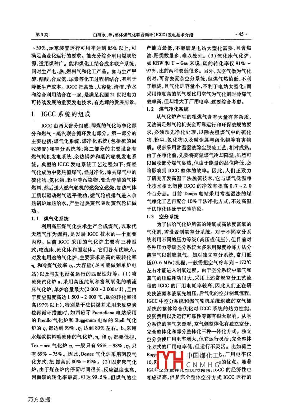第3期鍋爐制造No.32008年5月BOILER . MANUFACTURINGMay. 2008文章編號:CN23 - 1249(2008)03 -0044 -03整體煤氣化聯合循環(huán)( IGCC)發(fā)電技術介紹白海永,傅吉坤(哈爾濱鍋爐廠有限責任公司,黑龍江哈爾濱150046)摘要:整體煤氣化聯合 循環(huán)( ICCC)發(fā)電技術是煤氣化和蒸汽聯合循環(huán)的結合,是當今國際正在興起的一種先進的潔凈煤( CCT)發(fā)電技術,具有高效低污染、節(jié)水、綜合利用好等優(yōu)點。它的原理是:煤經過氣化和凈化后,除去煤氣中9%以上的硫化氫和接近100%的粉塵,將固體燃料轉化成燃氣輪機能燃用的清潔氣體燃料,以驅動燃氣輪機發(fā)電,再使燃氣發(fā)電與蒸汽發(fā)電聯合起來。關鍵詞:整體煤氣化聯合循環(huán);發(fā)電;合成氣;燃氣輪機中圖分類號:TK229文獻標識碼:BIntroduction for Electricity or Power Generation Technologyfor Integrated Coal Gasification Combined CycleBai Haiyong ,Fu Jjikun(Harbin Boiler Co. Itd. , Harbin 150046, China)Abstract: The electricity or power generation technology for Integrated Coal Gasification CombinedCycle is combined cycle for coal gasifcation and steam, and it is a kind of clean coal power genera-tion technology in world these days, and its advantage is high efciency , low pollution, sparing wa-ter and integrated using etc. The theory: after coal is gasified and cleaned, 99% H2S and near100% dust in syngas is removed, and solid fuel is changed into clean syngas for gas turbine, andthe gas turbine is drove to generate electricity, and at last gas and steam electricity generation iscombined.Key words :ntegrated coal gaifcation combined cycle; ericity or power generation; syngas, gasturbine燃氣初溫的進一步提高和有關的技術進步,IGCC)引言的凈效率能達到52%或更高。易大型化,單機功整體煤氣化聯合循環(huán)( IGCC)發(fā)電技術是將率可達到300MW ~600MW以上。煤的潔凈轉化煤氣化技術和高效的聯合循環(huán)相結合的先進動力與非直接燃煤技術使它有極好的環(huán)保性能,其系統。IGCC被稱作“世界上最潔凈燃煤電站”。NOx和SO2的排放遠低于環(huán)境污染排放標準,脫ICCC具有以下優(yōu)點:高效率,且具有提高效率的硫率≥98%,除氨率可達90%,燃煤后的廢物處潛力,目前ICCC供電效率可達42% ~46% ,隨著理量最少。耗水量少,比常規(guī)汽輪機電站少30%中國煤化工收稿日期:2007-03-15.MYHCNMHG作者簡介:白海永(1978-),男,助理工程師,學士學位2002年畢業(yè)于遼寧石油化工大學,主要從事壓力容器設計工作。第3期白海永,等:整體煤氣化聯合循環(huán)( ICCC)發(fā)電技術介紹●45●~ 50% ,示范裝置運行可用率達到85%以上,可產能力最低,不能滿足電站大型化需要,且含焦?jié)M足商業(yè)化運行的要求。能充分綜合利用煤炭資油、酚類數量多,難以處理。(3) 流化床氣化爐,源,適用煤種廣。能和煤化工結合成多聯產系統,如KRW和∪-Gas來說,碳的轉化率僅91%~同時生產電、熱、燃料氣和化工產品。如與生產甲97% ,比前兩種要低很多。另外,以空氣做為氣化醇、醋酸合成氨、尿素等化工過程相結合,有利于劑時,可省去復雜空分系統,但煤氣熱值低,不利降低生產成本。IGCC把高效、大容量、清潔、節(jié)水于燃燒,且氣化爐容量小,不利于電站大型化;而和綜合利用結合在- -起,是滿足我國21世紀電力采用純度高的氧氣要比用空氣為氣化劑時冷煤氣可持續(xù)發(fā)展的重要發(fā)電技術,有光輝的發(fā)展前景。效率高,但卻增大了廠用電率,這要綜合考慮。1.2 煤氣凈化系統1IGCC系統的組成從氣化爐產生的粗煤氣含有大量有害雜質,IGCC由兩大部分組成,即煤的氣化與凈化部無法滿足燃氣輪機安全可靠運行和環(huán)保法規(guī)的要分和燃氣-蒸汽聯合循環(huán)發(fā)電部分。第- -部分的求,必須預先凈化處理,以除去粗煤氣中的硫化主要包括:煤氣化系統煤凈化系統(包括硫的回物粉塵、氮化物以及堿金屬與鹵化物等有害物收裝置)和空分系統等;第二部分的主要設備有質?,F多采用常溫濕法除塵脫硫工藝,相對成熟。燃氣輪機發(fā)電系統、余熱鍋爐和蒸汽輪機發(fā)電系由于在凈化前,先要將高溫煤氣冷卻降溫,雖然可統。典型的IGCC發(fā)電系統工藝過程如下:煤經以回收部分煤氣顯熱,但由于能量的品位降低,必氣化成為中低熱值煤氣,經過凈化,除去煤氣中的將影響到IGCC整體的效率。因此,人們正致力硫化物、氮化物、粉塵等污染物,變?yōu)榍鍧嵉臍怏w于研究開發(fā)高溫干法脫硫技術,它與煤氣低溫凈燃料,然后送入燃氣輪機的燃燒室燃燒,加熱氣體化技術相比能使ICCC的凈效率提高0.7 ~2.0工質以驅動燃氣透平做功,燃氣輪機排氣進入余個百分點。目前Tampa電站采用常溫濕法的煤熱鍋爐加熱給水,產生過熱蒸汽驅動蒸汽輪機做氣凈化工藝再配合10%干法凈化方式,不過高溫功。干法凈化還處于試驗階段。1.1 煤氣化系統1.3 空分系統利用高壓煤氣化技術生產合成煤氣,以取代為了供給氣化爐所需的純氧或高濃度富氧的天然氣作為燃料,是發(fā)展ICCC技術的一個重要氣化劑,需設置制氧空分系統。對于不同空分系內容。目前IGCC采用的氣化爐主要有三種型統利用不同的壓力等級(高壓或低壓) ,但目前對式:噴流床、流化床和固定床。它們各有優(yōu)缺點。各種壓力等級空分系統大多采用深度冷凍方法分對發(fā)電用途的氣化爐,主要要求是高的碳轉化率離空氣以制取氧氣。如對獨立空分系統,常用低η。和冷煤氣效率η、大容量(盡可能做到單爐電壓(0.6 MPa)
