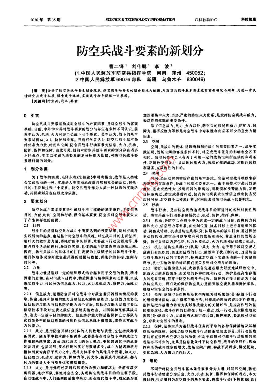 2010年第35期SCIENCE TECHNOLOGY INFORMATIoNO科教前沿O科技信息防空兵戰(zhàn)斗要素的新劃分曹二鋒1劉偉鵬'李波2(1.中國人民解放軍防空兵指揮學(xué)院河南鄭州450052;2中國人民解放軍69076部隊新疆烏魯木齊830049)【摘要】分析了防空兵戰(zhàn)斗要素劃分現(xiàn)狀,以實踐活動要素的劃分標(biāo)準(zhǔn)為依據(jù),對防空兵戰(zhàn)斗基本要素進行重新確定與劃分,為進一步認清防空兵戰(zhàn)斗本質(zhì),棵索戰(zhàn)斗規(guī)律,實施戰(zhàn)斗指導(dǎo)提供一定參考?!娟P(guān)鍵詞】防空兵;戰(zhàn)術(shù);要素0引言加注重集中火力。組織嚴密的防空火力配系,是發(fā)揮防空兵戰(zhàn)斗威力,防空兵戰(zhàn)斗要素是構(gòu)成對空戰(zhàn)斗的必要因素,是對空戰(zhàn)斗的客觀提高作戰(zhàn)效能的重要條件除∫信息戰(zhàn)力兵力、火力以外,防空兵的戰(zhàn)場機動力、防護力、?;A(chǔ)。目前中外學(xué)術(shù)界對戰(zhàn)斗要素的劃分與界定有多種不同認識。前力、指揮控制力等都是對空戰(zhàn)斗中奪取勝利而必不可少的重要力量蘇不認為機動、火力和突擊是戰(zhàn)斗三個要素。美軍認為戰(zhàn)斗的基本因素要稱是機動火力防護和指揮。當(dāng)前有學(xué)者認為:防空兵戰(zhàn)斗基本條23空間件要素為力量時間和空間,防空兵戰(zhàn)斗行動要寒為信息、火力機動空間,是戰(zhàn)斗的載體,是影響和制約戰(zhàn)斗的重要因家之一。戰(zhàn)爭實防護指揮和保障由此可見,日前對防空兵戰(zhàn)斗要素的劃分存在諸多踐證明,戰(zhàn)場空間的客觀條件不同,對完成戰(zhàn)斗任務(wù)的影響也會各不不同觀點本文以實踐活動要素的劃分標(biāo)準(zhǔn)為依據(jù),對防空兵戰(zhàn)斗要相同。防空兵指揮員只有于利用一定的戰(zhàn)場空間所提供的客觀條素進行新的劃分件,正確地使用兵力,靈活地運用火力,采取有效的戰(zhàn)法,才能達到趨1劃分依據(jù)利避害、克敵制勝的目的24時間關(guān)于戰(zhàn)爭的實質(zhì)毛澤東在《實踐論》中明確指出戰(zhàn)爭是人類社時間,是運動著的物質(zhì)存在的基本形式。它是對空戰(zhàn)斗賴以生有會實賤活動的一種。實踐是人類能動地改造自然和社會的活動包括:和發(fā)展的客觀條件,是戰(zhàn)斗的基本要素之一。由于高技術(shù)空襲兵器速目的、F段和過程三個要素。防空兵戰(zhàn)斗作為人類一種特殊的實踐活度快、進攻突然性大、投射武器的距離遠,而我偵察預(yù)警能力低發(fā)現(xiàn)動,其要素劃分也應(yīng)以此為依據(jù)。目標(biāo)距離近,防空武器射程近,使我防空兵獲取空情信息做出抗擊反2要素劃分應(yīng)時間短,對空戰(zhàn)斗以秒來計算,時閫因素對防空兵戰(zhàn)斗的影響25行動防空兵戰(zhàn)斗基本要家是生成戰(zhàn)斗不可或缺的基本條件,主要包括戰(zhàn)斗行動,是指防空兵為達成戰(zhàn)斗目的而進行的各種對抗性活目的、力瞰、時間、空間和行動,沒有基本要絮,防空兵對空戰(zhàn)斗就失去動。防空兵戰(zhàn)斗行動要素包括抗擊、機動、防護指揮、保障。了產(chǎn)生和仔在的前提251機動,是防空兵在戰(zhàn)斗中為達成一定的戰(zhàn)斗日的,而將兵力兵2.1目的器和火力信息戰(zhàn)力等要素,在空間位置抗擊日標(biāo)上進行有組織的移戰(zhàn)斗日的是指防空兵在戰(zhàn)斗中所要達到的預(yù)期結(jié)果,是對空戰(zhàn)斗動調(diào)或轉(zhuǎn)移。機動是防空兵部(分)隊最基本的戰(zhàn)斗行動通過積極實踐活動的起點,也是整個對空戰(zhàn)斗的靈魂。對空戰(zhàn)斗目的主要包括:主動的機動,防空兵可以爭取有利的戰(zhàn)場主動權(quán),營造良好的戰(zhàn)場態(tài)要殲火的敵空襲力量要掩護的軍隊部署、重要戰(zhàn)斗行動及要地等井勢。防空兵機動內(nèi)容包括:兵力兵器機動、火力機動和信息戰(zhàn)力機動。隨著戰(zhàn)斗活動的進行,最終以客觀、具體的戰(zhàn)斗結(jié)果態(tài)勢而表現(xiàn)出來。252抗擊是防空兵部(分)隊集中兵力火力電子等手段對空襲之因而,防空兵戰(zhàn)斗的具體目的往往表現(xiàn)為上級賦予的具體戰(zhàn)斗任務(wù),敵進行有組織的、急速而猛烈的打擊摧毀和干擾壓制行動。這是防空更具體地體現(xiàn)為殲敵空襲兵器的規(guī)模與數(shù)鱸、要掩護的目標(biāo)、空間與兵戰(zhàn)斗基本行動的主要內(nèi)容,是構(gòu)成對空戰(zhàn)斗實踐活動的一個關(guān)鍵性時間等環(huán)節(jié),抗擊實施效果的好壞將直接關(guān)系到對空戰(zhàn)斗的勝負。2.2力量253防護,是指為使人員、武器裝備免遭或最大限度地減輕敵空中戰(zhàn)斗力是指以一定的組織形式結(jié)合起來用于交戰(zhàn)的物質(zhì)精神地面火力的殺傷破壞,而采取的各種措施和行動。防護是提高生存能因素的總和。在對窄戰(zhàn)斗過程中物質(zhì)因素與精神因素相互作用,生成力的重要措施貫穿于防空兵戰(zhàn)斗全過程。防護的直接H的是為了?,F(xiàn)實戰(zhàn)斗力,可區(qū)分為信息戰(zhàn)力、兵力、火力及機動力、防護力保障力存防空兵力,而有效的保存防空兵力是消滅敵空襲兵器和掩護軍隊、等要地對空安全的必要條件。221信息戰(zhàn)力是指防空兵對空戰(zhàn)斗中對敵空襲兵器活動情報的獲254指揮,是防空兵指揮員及其指揮機關(guān)對所屬部(分)隊?wèi)?zhàn)斗行動取、傳輸處理和