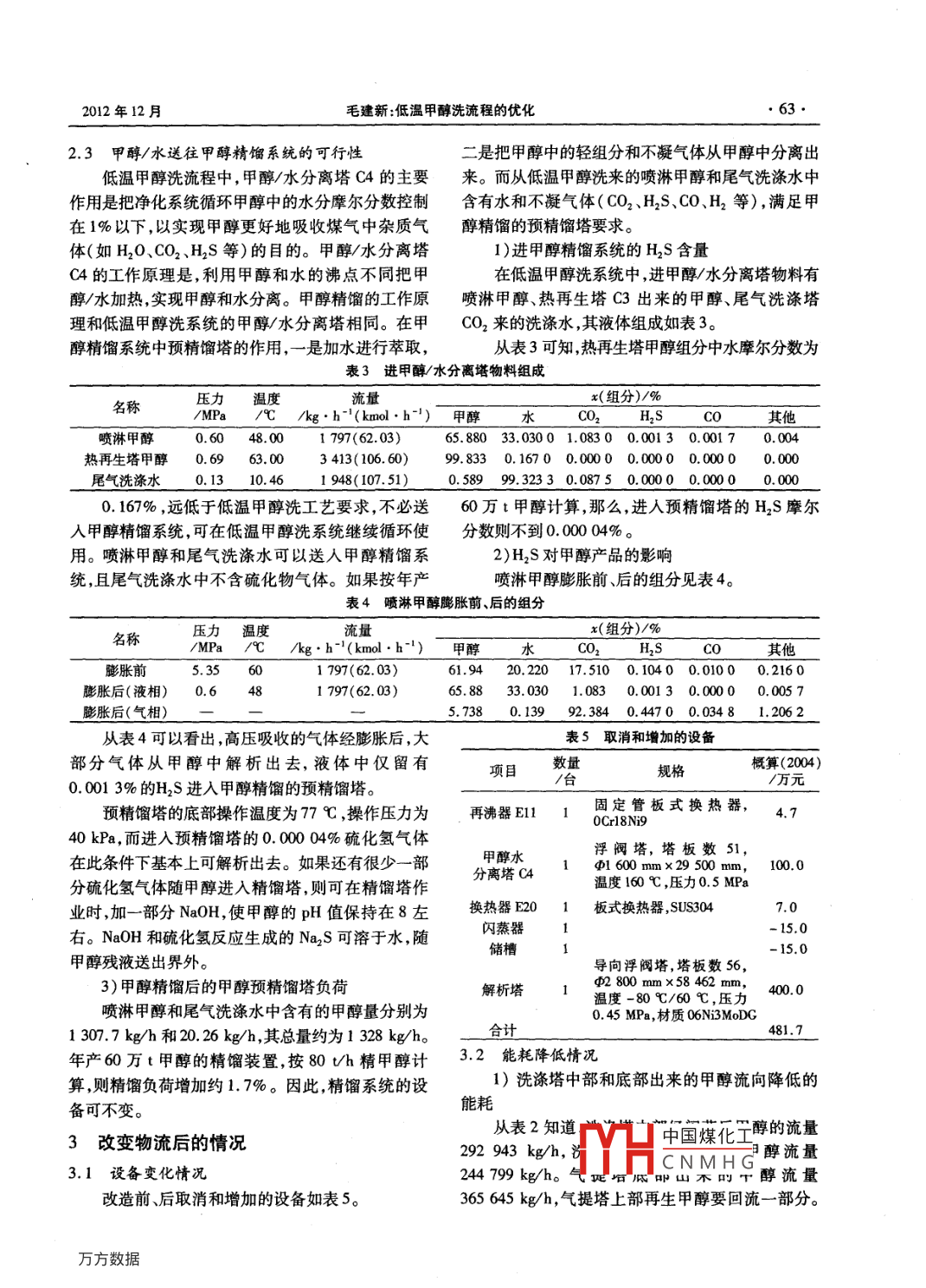 第32卷第6期山西化工Vol 32 No 62012年12月SHANXI CHEMICAL INDUSTRYDec.2012生產(chǎn)與應(yīng)用低溫甲醇洗流程的優(yōu)化毛建新山西原平化學(xué)工業(yè)集團(tuán)有服責(zé)任公司,山西原平034100)摘要:介紹了低溫甲醇洗工藝流程,提出了改變物料甲醇流向的優(yōu)化改造,并對(duì)改造前、后進(jìn)行了分析比較。改造后凈化度不變,能耗降低,投資減少,經(jīng)濟(jì)效益提高關(guān)鍵詞:低溫甲醇洗工藝;甲醇;能耗;凈化度中圖分類號(hào):TQ522.6文獻(xiàn)標(biāo)識(shí)碼:A文章編號(hào):1004-7050(2012)06-0061-04引言程因CO2氣體作為原料氣而使用六塔流程;煤制甲煤制甲醇技術(shù)一般包括煤清潔氣化技術(shù)(水煤醇一般可以取消解析塔使用五塔流程。本文以五漿、CSP和謝爾粉煤氣化技術(shù))、低溫分餾空分技塔流程為例,其工作原理是,利用煤氣中各種氣體術(shù)、寬溫耐硫變換技術(shù)、低溫甲醇洗脫硫脫碳技術(shù)、(相同條件下)在低溫、高壓甲醇中的溶解度不同除恒溫甲醇合成技術(shù)、三塔甲醇精餾技術(shù)等。這些技去二氧化碳和硫化物氣體,把煤氣中一氧化碳和氫術(shù)都是專利技術(shù)需要獨(dú)立購(gòu)買又各自獨(dú)成一套系氣含量調(diào)整到合成甲醇的適合比例。統(tǒng),不能從整體煤制甲醇工藝出發(fā)進(jìn)行整體流程優(yōu)工藝中洗滌塔和氣提塔的規(guī)格見(jiàn)表1化。本文從整體流程考慮,著重優(yōu)化60萬(wàn)t/a煤制表1洗滌塔和氣提塔的規(guī)格甲醇的低溫甲醇洗流程,以降低投資,提高效益。名稱規(guī)格材質(zhì)溫度/℃壓力MPa1流程簡(jiǎn)述洗滌塔導(dǎo)向浮閥塔塔板數(shù)79,CI 200 mm/p3 800 mm, 06NI3MoDG-80760 6.81.1低溫甲醇洗工藝(見(jiàn)圖1)氣提塔導(dǎo)向浮閥塔塔板數(shù)75,64 200 mm06N3MoDC-80600.5氧氣少收高50266mm氮?dú)舛?.2冷凍站工藝氣化低溫甲醇洗醇合成由于低溫甲醇洗是物理吸收法,溫度越低,吸收效果越好,且一般在-40℃下操作,因此,運(yùn)用低溫冷凍站甲酬甲精餾甲醇洗技術(shù)必須有合適的冷量提供。冷凍站的設(shè)置渣水處理是為了給低溫甲醇洗工序提供必需的冷量,一般生圖1低溫甲醇洗工藝產(chǎn)廠家使用氨作為制冷劑。而氨冷器設(shè)置主要考慮低溫甲醇洗流程有六塔和五塔流程。氨加工過(guò)的問(wèn)題是,在系統(tǒng)提供冷量的同時(shí)盡可能減少氣體中的甲醇量。收稿日期:201209-10冷凍站為低溫甲醇洗系統(tǒng)提供-40℃的冷量,學(xué)工程與工藝專業(yè),主要從事合放復(fù).尿素焦護(hù)氣甲靜工藝生產(chǎn)冷凍介質(zhì)為刻中國(guó)煤化工要的冷量為管理工作。5000kW。低CNMHG器后進(jìn)入壓山西化工2012年12月縮機(jī)進(jìn)行增壓,增壓后的氣氨經(jīng)過(guò)冷卻、膨脹使氣氨活性下降甚至失活而無(wú)法生產(chǎn)。甲醇合成過(guò)程要變成液氨,送往低溫甲醇洗對(duì)甲醇降溫,保證低溫甲求原料氣中w(硫化物)≤1.0×10,即進(jìn)洗滌塔的醇洗工藝的正常運(yùn)行。其設(shè)備有汽輪機(jī)、冰機(jī)、一段甲醇中硫化物含量甚微,或者測(cè)不到。表2為原流出口冷卻器、二段出口冷卻器、防喘振冷卻器、氨冷程的物流分析。從表2可知,洗滌塔中部經(jīng)閃蒸后卻器、凝汽器、一段進(jìn)口分離器、二段進(jìn)口分離器液甲醇中硫化物含量測(cè)不到,符合洗滌塔的要求。洗氨儲(chǔ)罐、中間氨罐、省功器、惰氣分離器、高位油箱、滌塔底部經(jīng)閃蒸后的富含硫化物的甲醇占總循環(huán)量蓄能器、潤(rùn)滑油站、消音器、氨泵凝結(jié)水泵。的45%。在氣提塔中,只有不將硫化物帶入富含3空分工藝CO2氣體的甲醇中,才能實(shí)現(xiàn)洗滌塔中部經(jīng)閃蒸后空分的原理為,利用空氣中各種成分的沸點(diǎn)不甲醇的循環(huán)使用。冋,同一種氣體的沸點(diǎn)隨壓力的升髙而升髙,通過(guò)加2.2改變洗滌塔中部和底部甲醇流向壓降溫、膨脹節(jié)流等措施把空氣變?yōu)橐后w,再通過(guò)精洗滌塔中部富含CO2氣體的甲醇經(jīng)閃蒸進(jìn)入餾的方法把氧氣、氨氮?dú)鈿鍤夥蛛x出來(lái)。氣提塔上部解析CO2氣體后從氣提塔中部出來(lái),2改變物流流程一部分返回下塔吸收硫化物,另一部分經(jīng)換熱循環(huán)使用。洗滌塔底部富含H2S氣體的甲醇經(jīng)閃蒸進(jìn)2.1物流分析入氣提塔下部解析CO2氣體,濃縮H2S氣體后送入低溫甲醇洗技術(shù)主要是脫除原料氣中的CO2熱再生塔解析H2S氣體。熱再生的甲醇經(jīng)換熱后和H2S氣體。硫化物會(huì)造成催化劑中毒,使催化劑循環(huán)使用。流程如圖2表2原流程的物流分析名稱壓力溫度流量x(組分)/%/MPa℃/kg:h-( kmol . h)甲醇水其他洗滌塔中部閃蒸后甲醇1.8533.0292943(8347.7)73.7750.12325.8540.0000.1780.070洗滌塔底部閃蒸后甲醇1.85-33.0244799(6947.8)72.4610.12227.0210.1380.1850.073氣提塔底部甲醇0.23-43.5365645(11384.5)98.52101650.7580.5070.0000.049凈化氣送往甲醇1目液氮脫鹽水放空尾氣洗滌水中國(guó)煤化工CNMHG圖2物流改變后的流程2012年12月毛建新:低溫甲醇洗流程的優(yōu)化63·2.3甲醇/水送往甲醇精餾系統(tǒng)的可行性二是把甲醇中的輕組分和不凝氣體從甲醇中分離出低溫甲醇洗流程中,甲醇/水分離塔C4的主要來(lái)。而從低溫甲醇洗來(lái)的噴淋甲醇和尾氣洗滌水中作用是把凈化系統(tǒng)循環(huán)甲醇中的水分摩爾分?jǐn)?shù)控制含有水和不凝氣體(CO2、H