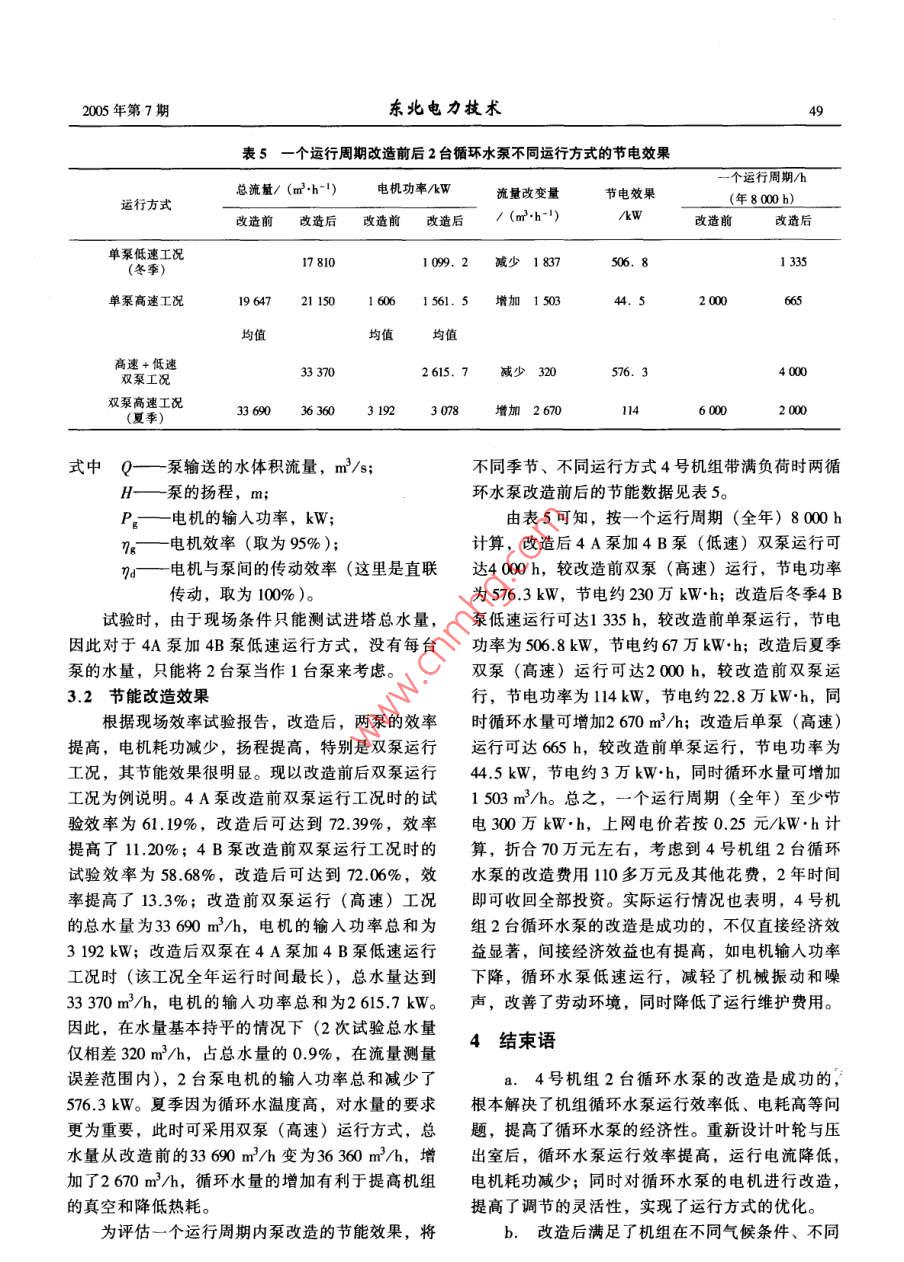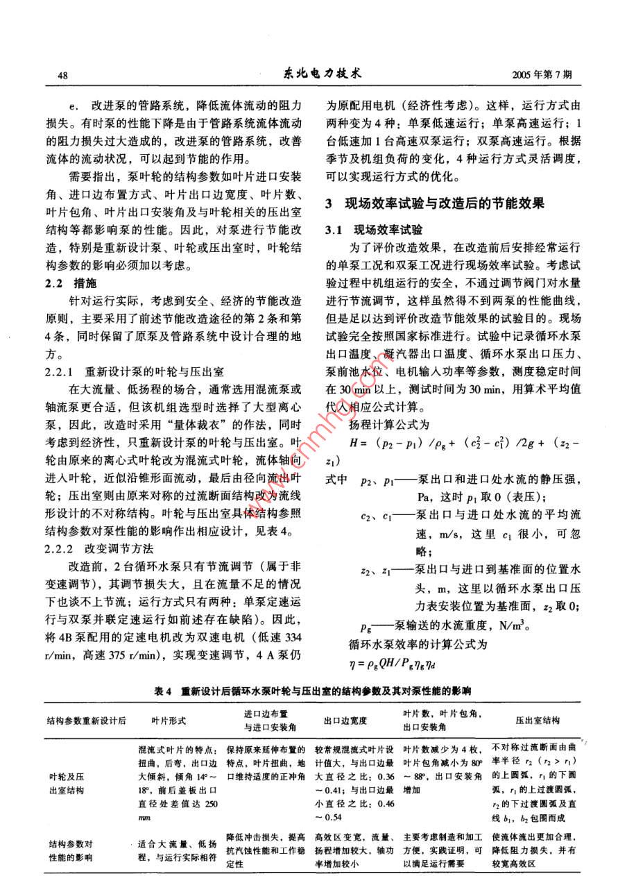 2005年第7期東北電力披術(shù)47循環(huán)水泵的節(jié)能改造理論與應(yīng)用The Therorg and Application of Energy-saving Retrofitting to Circulating Pumps李敬,魏運(yùn)剛(沈陽(yáng)工程學(xué)院,遼寧沈陽(yáng)10136)摘要:以泵節(jié)能技術(shù)為理論基礎(chǔ),分析了華能上安電廠4號(hào)機(jī)組2臺(tái)循環(huán)水泵的節(jié)能改造措施。通過(guò)重新設(shè)計(jì)葉輪,提高循環(huán)水泵的效率,降低功率損耗;同時(shí)通過(guò)改定速電機(jī)為雙速電機(jī),實(shí)現(xiàn)運(yùn)行方式的優(yōu)化,達(dá)到了節(jié)能增效的目的關(guān)鍵詞:循環(huán)水泵;節(jié)能改造;混流式葉輪;雙速電機(jī);優(yōu)化運(yùn)行方式[中圖分類(lèi)號(hào)]TK23.5+2[文獻(xiàn)標(biāo)識(shí)碼]B[文章編號(hào)]1004-7913(2005)07-0047-021存在的問(wèn)題表3給出了循環(huán)水泵及電機(jī)額定工況與實(shí)際運(yùn)行工況的性能參數(shù)對(duì)比,可以看出4號(hào)機(jī)組2臺(tái)循環(huán)水華能上安電廠4號(hào)機(jī)組為東方汽輪機(jī)廠生產(chǎn)的泵有很大的節(jié)能改造空間。N300-16.7/537/5374型凝汽式汽輪發(fā)電機(jī)組,機(jī)表3循環(huán)水泵及電機(jī)額定工況與實(shí)際運(yùn)行組配備2臺(tái)循環(huán)水泵(以下稱(chēng)4A泵與4B泵)。2臺(tái)工況的性能參數(shù)對(duì)比循環(huán)水泵及配用電機(jī)的主要技術(shù)參數(shù)見(jiàn)表1、表2。流量揚(yáng)程軸功率泵效率電機(jī)輸入項(xiàng)目表1循環(huán)水泵的主要技術(shù)參數(shù)kW/%功率kW額定額定額定額定軸定工況2018.21240.380,51600型號(hào)形式流量/揚(yáng)程轉(zhuǎn)速/功率效率單泵運(yùn)行工況1939013.191492.046.381570.7(m-h")/m (rmin")/kw/%雙泵運(yùn)行工況1684519.831477.061.191554.8立式,單注:數(shù)據(jù)以4A泵為例,4B泵與其相近48P35ⅡA級(jí),單吸2016018.23701240.380.524號(hào)機(jī)組循環(huán)水泵節(jié)能改造的途徑與措施表2配用電機(jī)的主要技術(shù)參數(shù)2.1途徑額定額定額定額定輸重新選型。通常很難保證標(biāo)準(zhǔn)泵與需求泵型號(hào)電壓電流轉(zhuǎn)速/人功率效率/a (rmin")/kw /的性能完全符合。b.對(duì)泵整體重新設(shè)計(jì)或重新設(shè)計(jì)泵的葉輪YKs60-16173016002053711095(或壓出室)。做到“量體裁衣”,效果好,但對(duì)泵整體重新設(shè)計(jì),投資大,耗時(shí)長(zhǎng);相對(duì)而言,只對(duì)2臺(tái)循環(huán)水泵的運(yùn)行方式有兩種:單泵定速運(yùn)泵的葉輪或壓出室重新設(shè)計(jì),投資較少,見(jiàn)效較行與雙泵并聯(lián)定速運(yùn)行。但實(shí)際運(yùn)行發(fā)現(xiàn),無(wú)論哪快。種運(yùn)行方式,4A泵與4B泵的性能參數(shù)與其額定c.對(duì)泵的葉輪葉片進(jìn)行切割或加長(zhǎng)。當(dāng)泵的工況相比都有較大的差距,不能保證兩泵在高效區(qū)實(shí)際工況長(zhǎng)期偏離其額定工況,且偏離量不是特別工作。究其原因一是泵選型不當(dāng)。在大流量、低揚(yáng)大的情況下,可以考慮切割或加長(zhǎng)葉輪葉片,但要程的場(chǎng)合,通常選用混流泵或軸流泵更合適;若選注意切割或加長(zhǎng)量對(duì)葉輪葉片性能的影響。用離心泵,為提高流量,相應(yīng)地提高揚(yáng)程,選型時(shí)d.改變調(diào)節(jié)方法,優(yōu)化運(yùn)行方式。調(diào)節(jié)方法易出現(xiàn)安全裕量過(guò)大的問(wèn)題。另一方面是運(yùn)行方式通??煞譃榉亲兯僬{(diào)節(jié)和變速調(diào)節(jié)兩大類(lèi)。目前不靈活,沒(méi)有實(shí)現(xiàn)運(yùn)行方式的優(yōu)化,不能根據(jù)季節(jié)應(yīng)用較多的高效調(diào)節(jié)方法是變速調(diào)節(jié),如雙速電機(jī)及機(jī)組負(fù)荷變化在較大范圍內(nèi)進(jìn)行流量調(diào)節(jié),使水調(diào)節(jié),變頻調(diào)節(jié)等,根據(jù)實(shí)際需要,通過(guò)改變轉(zhuǎn)泵始終在高效區(qū)工作。循環(huán)水泵存在這方面的缺速,使泵在流量范圍內(nèi)進(jìn)行調(diào)節(jié),從而保證其始終陷,不僅浪費(fèi)電能,而且增加設(shè)備不必要的磨損。在高效區(qū)工作東地電力技求2005年第7e.改進(jìn)泵的管路系統(tǒng),降低流體流動(dòng)的阻力為原配用電機(jī)(經(jīng)濟(jì)性考慮)。這樣,運(yùn)行方式由損失。有時(shí)泵的性能下降是由于管路系統(tǒng)流體流動(dòng)兩種變?yōu)?種:單泵低速運(yùn)行;單泵高速運(yùn)行;1的阻力損失過(guò)大造成的,改進(jìn)泵的管路系統(tǒng),改善臺(tái)低速加1臺(tái)高速雙泵運(yùn)行;雙泵高速運(yùn)行。根據(jù)流體的流動(dòng)狀況,可以起到節(jié)能的作用季節(jié)及機(jī)組負(fù)荷的變化,4種運(yùn)行方式靈活調(diào)度,需要指出,泵葉輪的結(jié)構(gòu)參數(shù)如葉片進(jìn)口安裝可以實(shí)現(xiàn)運(yùn)行方式的優(yōu)化。角、進(jìn)口邊布置方式、葉片出口邊寬度、葉片數(shù)、葉片包角、葉片出口安裝角及與葉輪相關(guān)的壓出室現(xiàn)場(chǎng)效率試驗(yàn)與改造后的節(jié)能效果結(jié)構(gòu)等都影響泵的性能。因此,對(duì)泵進(jìn)行節(jié)能改3.1現(xiàn)場(chǎng)效率試驗(yàn)造,特別是重新設(shè)計(jì)泵、葉輪或壓出室時(shí),葉輪結(jié)為了評(píng)價(jià)改造效果,在改造前后安排經(jīng)常運(yùn)行構(gòu)參數(shù)的影響必須加以考慮的單泵工況和雙泵工況進(j