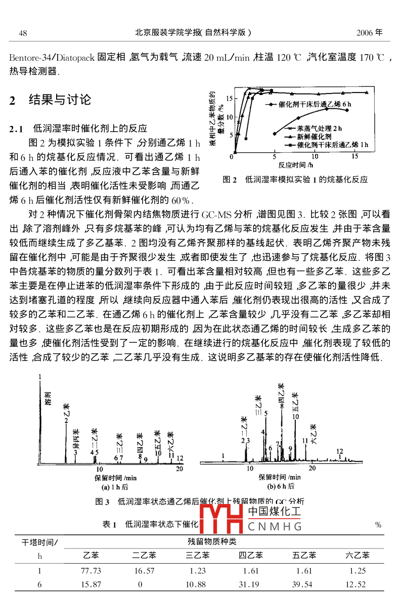 26卷第4期北京服裝學(xué)院學(xué)報(bào)Vol 26 No 4006年12月Journal of Beijing Institute of Clothing TechnologyDec.2006沸石催化劑上苯與乙烯烷基化反應(yīng)的催化劑失活原因茹進(jìn)勇,杜迎春北京服裝學(xué)院材料科學(xué)與工程學(xué)院,北京100029)摘要∶針對(duì)催化精餾法煉廠干氣制乙恭模試試驗(yàn)中存在的沸石催化劑緩慢失活現(xiàn)象在固定床反應(yīng)器上考察了低潤(rùn)濕率時(shí)催化劑失活情況對(duì)失活催化劑進(jìn)行了GCMS分析.研究了原料即煉廠干氣和苯中的主要雜質(zhì)—(OCO水對(duì)催化劑壽命的影響.結(jié)果表明:1)低潤(rùn)濕率時(shí)導(dǎo)致催化劑失活的物質(zhì)主要是苯的深度烷基化產(chǎn)物,雖然也發(fā)生了乙烯的齊聚反應(yīng)但生成的小分子物質(zhì)隨即參加烷基化反應(yīng)最終生成多烷基苯;2)CO和(O對(duì)催化劑無(wú)不良影響氣相中的水含量在400×10-6以上或液相中水含量在70×10-6以上時(shí)催化劑活性暫時(shí)有所降低關(guān)鍵詞:催化劑失活;乙苯;沸石催化劑;深度烷基化;齊聚中圖分類(lèi)號(hào):TQ225.24文獻(xiàn)標(biāo)識(shí)碼:A文章編號(hào):1001-05642006)4-0046-07乙苯經(jīng)過(guò)脫氫處理制得的苯乙烯單體是石油化工的主要基礎(chǔ)產(chǎn)品之一.90%的乙苯由苯與乙烯烷基化反應(yīng)制得.催化裂化是煉油廠重油深度轉(zhuǎn)化和提高經(jīng)濟(jì)效益旳重要加工過(guò)程也是煉油廠石油化工綜合利用的重要原料來(lái)源之一.我國(guó)現(xiàn)有催化裂化裝置數(shù)十套年產(chǎn)含有10%~20%乙烯的干氣近200萬(wàn)噸若將其回收用來(lái)制取乙苯不僅能擴(kuò)大乙苯原料來(lái)源從而部分緩解我國(guó)長(zhǎng)期以來(lái)乙烯供不應(yīng)求旳矛盾還可為煉油廠干氣的綜合利用開(kāi)辟新的途徑明顯增加企業(yè)的經(jīng)濟(jì)效益北京服裝學(xué)院與有關(guān)單位合作采用β沸石催化劑在催化精餾塔內(nèi)進(jìn)行了煉廠干氣制乙苯的模試研究,模試實(shí)驗(yàn)中發(fā)現(xiàn)在除去了水、HS噻吩等有害物質(zhì)的前提下催化劑隨反應(yīng)時(shí)間延長(zhǎng)仍會(huì)發(fā)生緩慢失活.催化劑操作壽命遠(yuǎn)低于其在高濃度乙烯與苯在固定床反應(yīng)器中進(jìn)行烷基化反應(yīng)的壽命11主要原因可能是1開(kāi)氣中乙烯含量低僅有10%~20%體積分?jǐn)?shù))伴隨有大量氣體進(jìn)入催化劑床層2)催化劑構(gòu)件以填料形式裝填在催化精餾塔中液體為分散相催化劑未完全浸泡在液相中并且精餾過(guò)程中必然發(fā)生液體混合物的部分汽化而固定床鼓泡反應(yīng)器中液相為連續(xù)相.這2個(gè)因素均會(huì)造成催化劑上潤(rùn)濕率降低導(dǎo)致催化劑緩慢失活.因此本文采用固定床反應(yīng)器模擬了2種低潤(rùn)濕率和低乙烯濃度條件下的烷基化反應(yīng)考察了催化劑失活情況分析了失活原因YHa中國(guó)煤化工CNMHG枚稿日期:2005-12-20作者簡(jiǎn)介:菇進(jìn)敷1974-)男1999級(jí)碩士研究生通訊聯(lián)系人電話:010-64288291第4期茹進(jìn)勇等:沸石催化劑上苯與乙烯烷基化反應(yīng)的催化劑失活原因47實(shí)驗(yàn)1.1實(shí)驗(yàn)原料與流程FX01催化劑北京東大化工實(shí)驗(yàn)廠高純氫氣、空氣、氮?dú)?、氦氣、一氧化碳?xì)怏w、二氧化碳?xì)怏w北京普萊克斯氣體公司苯、乙爔純度234均大于99.5%)燕山石化公司實(shí)驗(yàn)裝置及流程如圖1所示.反應(yīng)器由12-氣體質(zhì)量流量計(jì)汁一微量計(jì)量泵5一熱電偶12mm不銹鋼管制成內(nèi)裝0.5~2gFX017=電x一反應(yīng)器備壓間:0-氣液分離罐圖1實(shí)驗(yàn)流程簡(jiǎn)圖催化劑1.2烷基化反應(yīng)以下實(shí)驗(yàn)均在圖1所示的裝置上進(jìn)行苯與乙烯的烷基化反應(yīng)條件為:140℃.8MPa,乙烯空速0.6hˉn(苯y(tǒng)n(乙烯)1-6n(N2yn(乙烯)=1~61.3低潤(rùn)濕率時(shí)催化劑上的反應(yīng)1)模擬實(shí)驗(yàn)1首先用苯充分潤(rùn)濕催化劑之后將苯從反應(yīng)器中排出用氮?dú)獯祾咭欢〞r(shí)間待催化劑外表面上非結(jié)合苯被帶走后向反應(yīng)器中通入體積比為1:1的乙烯和氮?dú)饣旌蠚?在通乙烯1h和6h后分別進(jìn)行苯與乙烯的烷基化反應(yīng)記錄氣液相組成觀察催化劑活性降低的程度.反應(yīng)結(jié)束后對(duì)催化劑上的殘留物質(zhì)進(jìn)行GCMS分析2)模擬實(shí)驗(yàn)2為了更接近實(shí)際操作中的低潤(rùn)濕率狀況改用含一定濃度乙烯的反應(yīng)氣體吹掃催化劑即首先在催化劑上進(jìn)行苯與乙烯的烷基化反應(yīng)待反應(yīng)達(dá)到穩(wěn)定狀態(tài)后停止進(jìn)苯繼續(xù)通入反應(yīng)氣體逐漸形成低潤(rùn)濕率狀態(tài).一段時(shí)間后再向反應(yīng)器中通入苯記錄氣液相組成的變化,分析催化劑活性降低的程度分析催化劑上的殘留物質(zhì)1.4雜質(zhì)對(duì)實(shí)驗(yàn)的影響為了研究實(shí)際干氣中存在的雜質(zhì)對(duì)烷基化反應(yīng)中催化劑活性的影響在原料氣中配入一定量的雜質(zhì)氣體大于等于其在干氣中的含量),包括一氧化碳?xì)怏w、二氧化碳?xì)怏w和水蒸汽,并采用不同含水量的苯為原料進(jìn)行烷基化反應(yīng)通過(guò)記錄乙烯轉(zhuǎn)化率和乙苯選擇性的變化逐檢測(cè)這些雜質(zhì)對(duì)催化劑活性的影響.1.5分析方法采用(C102G;型氣相色譜儀分析尾氣中d中國(guó)煤化工摶化率校正因
