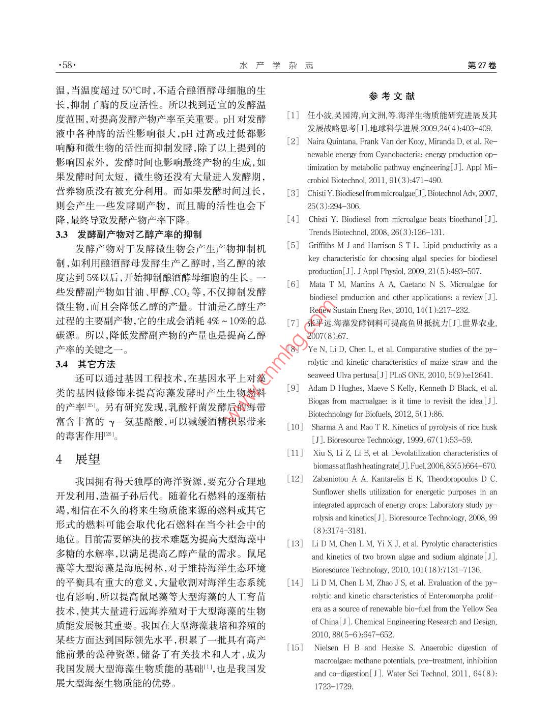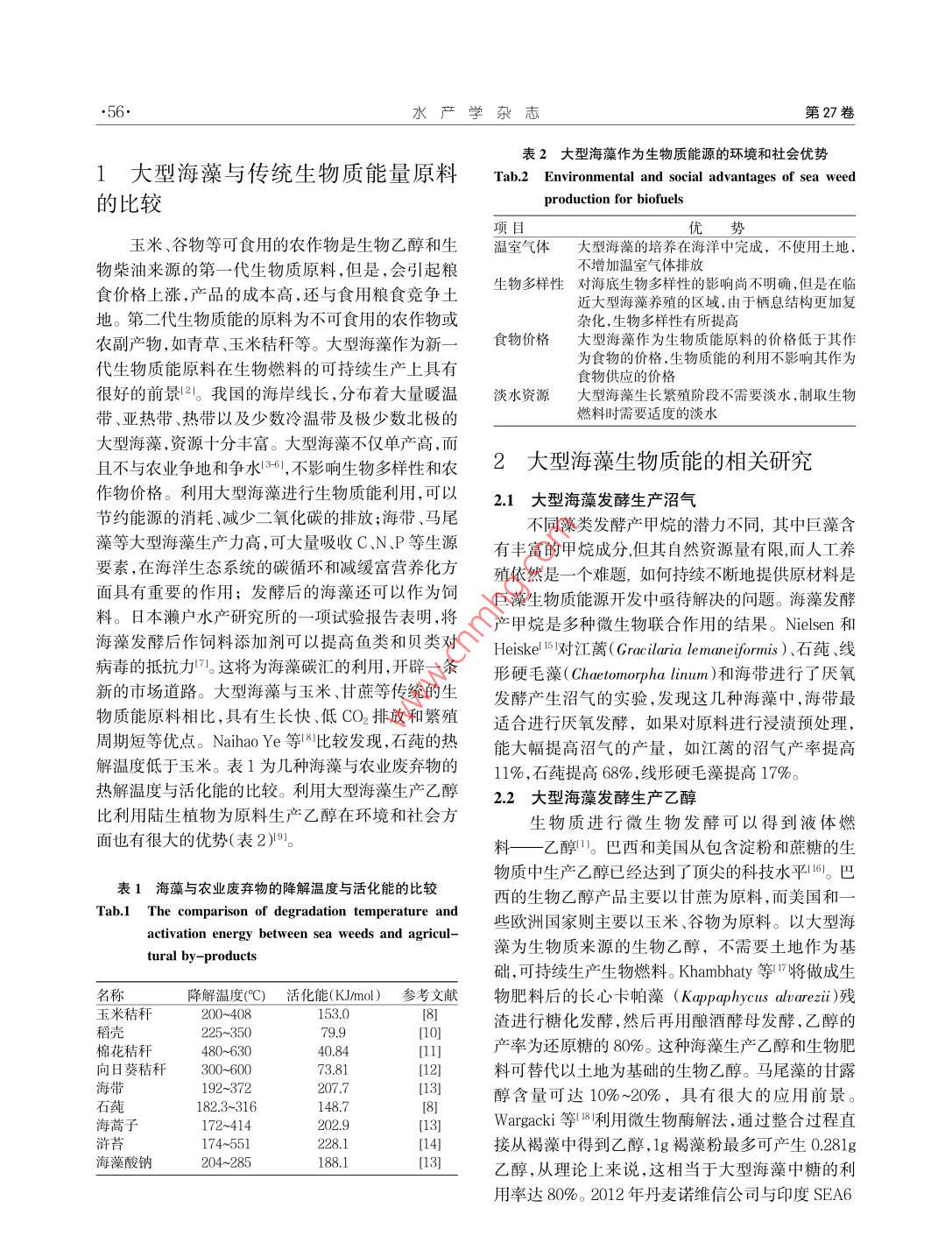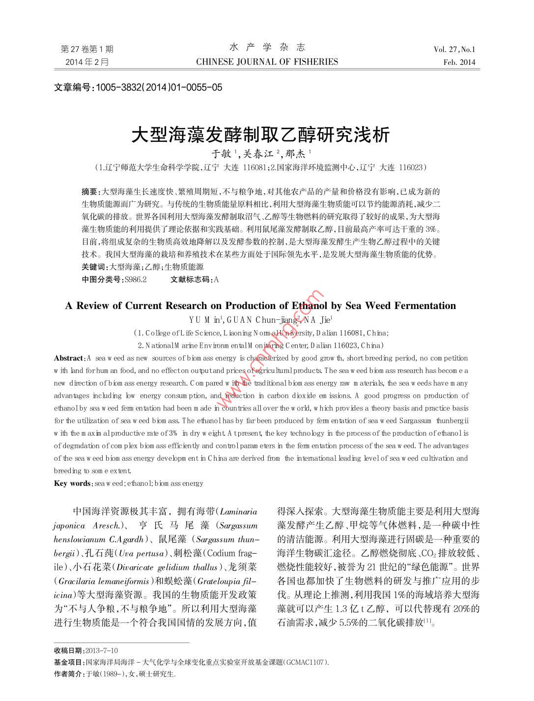 第27卷第1期水產(chǎn)學(xué)雜志Ⅴol.27,No.12014年2月CHINESE JOURNAL OF FISHERIESFeb.2014文章編號(hào):1005-3832(2014)01-0055-05大型海藻發(fā)酵制取乙醇研究淺析于敏',關(guān)春江2,那杰(1.遼寧師范大學(xué)生命科學(xué)學(xué)院,遼寧大連1160831;2國家海洋環(huán)境監(jiān)測(cè)中心,遼寧大連116023)摘要:大型海藻生長速度快、繁殖周期短,不與糧爭地,對(duì)其他農(nóng)產(chǎn)品的產(chǎn)量和價(jià)格沒有影響,已成為新的生物質(zhì)能源而廣為研究。與傳統(tǒng)的生物質(zhì)能量原料相比,利用大型海藻生物質(zhì)能可以節(jié)約能源消耗,減少氧化碳的排放。世界各國利用大型海藻發(fā)酵制取沼氣、乙醇等生物燃料的硏究取得了較好的成果,為大型海藻生物質(zhì)能的利用提供了理論依據(jù)和實(shí)踐基礎(chǔ)。利用鼠尾藻發(fā)酵制取乙醇,目前最高產(chǎn)率可達(dá)干重的3%。目前,將組成復(fù)雜的生物質(zhì)高效地降解以及發(fā)酵參數(shù)的控制,是大型海藻發(fā)酵生產(chǎn)生物乙醇過程中的關(guān)鍵技術(shù)。我國大型海藻的栽培和養(yǎng)殖技術(shù)在某些方面處于國際領(lǐng)先水平,是發(fā)展大型海藻生物質(zhì)能的優(yōu)勢(shì)關(guān)鍵詞:大型海藻;乙醇;生物質(zhì)能源中圖分類號(hào):S986.2文獻(xiàn)標(biāo)志碼:AA Review of Current Research on Production of Ethanol by Sea Weed FermentationYU M in, G AN Chun-jiang, N a Jie(1. College ofL ife Science, L iaon ing N om alu niversity D alian 116081, China2. n ational arine E nv ionm ental on itoring C enter, d alian 116023, C hina)Abstract: A sea w eed as new sources of biom ass energy is characterized by good grow th, short breed ing period, no com petitionith and forhum an food, and no effecton outputand prices of agricu ltural products. The sea w eed biom ass research has becomnew direction ofb iom ass energy research c om pared w ith the traditional b iom ass energy raw m aterials, the sea w eeds have m anyadvantages includ ing bw energy consum ption, and reduction in carbon d iox ide em issions. a good progress on production ofethanol by sea w eed ferm en tation had been m ade in coun tries all over the w orld, w hich prov ides a theory basis and practice basisfor the utilization of sea w eed b iom ass. the ethanol has by far been produced by ferm en tation of sea w eed Sargassum thunberg iiw ith the m ax in al productive rate of 3% in dry w eight a present, the key techno lgy in the process of the production of ethanol isof degradation of com p lex biom ass effic ien tly and conto l param eters in the fem entation process of the sea w eed. The advan tagesof the sea w eed biom ass energy developm ent in C hina are derived from the in temational lead ing level of sea w eed cultivation andbreed ing to som e extent.Key words: sea w eed; ethanol; b iom ass energy中國海洋資源極其豐富,擁有海帶( laminaria得深入探索。大型海藻生物質(zhì)能主要是利用大型海jqφ onica Aresch)、亨氏馬尾藻( Sargassum藻發(fā)酵產(chǎn)生乙醇、甲烷等氣體燃料,是一種碳中性enslowianum. a garch)、鼠尾藻( Sargas sum thun-的清潔能源。利用大型海藻進(jìn)行固碳是一種重要的bergii)、孔石莼( Uva pertusa)、剌松藻( Codium frag-海洋生物碳匯途徑。乙醇燃燒徹底、CO2排放較低、ile)小石花菜(υ divaricateε gelidium thallus)、龍須菜燃燒性能較好,被譽(yù)為21世紀(jì)的¨綠色能源”。世界im)等大型ms)和蜈蚣藻( Grateloupia-各國也都加快了生物燃料的研發(fā)與推廣應(yīng)用的步Gracilaria leaner資源。我國的生物質(zhì)能開發(fā)政策伐。從理論上推測(cè),利用我國1%的海域培養(yǎng)大型海為“不與人爭糧,不與糧爭地”。所以利用大型海藻藻就可以產(chǎn)生13億t乙醇,可以代替現(xiàn)有20%的進(jìn)行生物質(zhì)能是一個(gè)符合我國國情的發(fā)展方向,值石油需求,減少5.5%的二氧化碳排放收稿日期:2013-7-10基金項(xiàng)目:國家海洋局海洋-大氣化學(xué)與全球變化重點(diǎn)實(shí)驗(yàn)室開放基金課題( GCMAC1107)乍者簡介:于敏(1989-),女,碩士研究生水產(chǎn)學(xué)雜志第27卷表2大型海藻作為生物質(zhì)能源的環(huán)境和社會(huì)優(yōu)勢(shì)大型海藻與傳統(tǒng)生物質(zhì)能量原料Tab,2 Environmental and social advantages of sea weed的比較duction for biofuels玉米、谷物等可食用的農(nóng)作物是生物乙醇和生溫室氣體大型海藻的培養(yǎng)在海洋中完成,不使用土地,物柴油來源的第一代生物質(zhì)原料,但是,會(huì)引起糧不增加溫室氣體排放食價(jià)格上漲,產(chǎn)品的成本高,還與食用糧食競(jìng)爭土物多樣性對(duì)海底生物多樣性的影響尚不明確,但是在臨近大型海藻養(yǎng)殖的區(qū)域,由于棲息結(jié)構(gòu)更加復(fù)地。第二代生物質(zhì)能的原料為不可食用的農(nóng)作物或雜化,生物多樣性有所提高農(nóng)副產(chǎn)物,如青草、玉米秸稈等。大型海藻作為新食物價(jià)格大型海藻作為生物質(zhì)能原料的價(jià)格低于其作代生物質(zhì)能原料在生物燃料的可持續(xù)生產(chǎn)上具有為食物的價(jià)格,生物質(zhì)能的利用不影響其作為食物供應(yīng)的價(jià)格很好的前景2。我國的海岸線長,分布著大量暖溫淡水資源大型海藻生長繁殖階段不需要淡水,制取生物帶、亞熱帶、熱帶以及少數(shù)冷溫帶及極少數(shù)北極的燃料時(shí)需要適度的淡水大型海藻,資源十分豐富。大型海藻不僅單產(chǎn)高,而且不與農(nóng)業(yè)爭地和爭水叫不影響生物纟樣性和