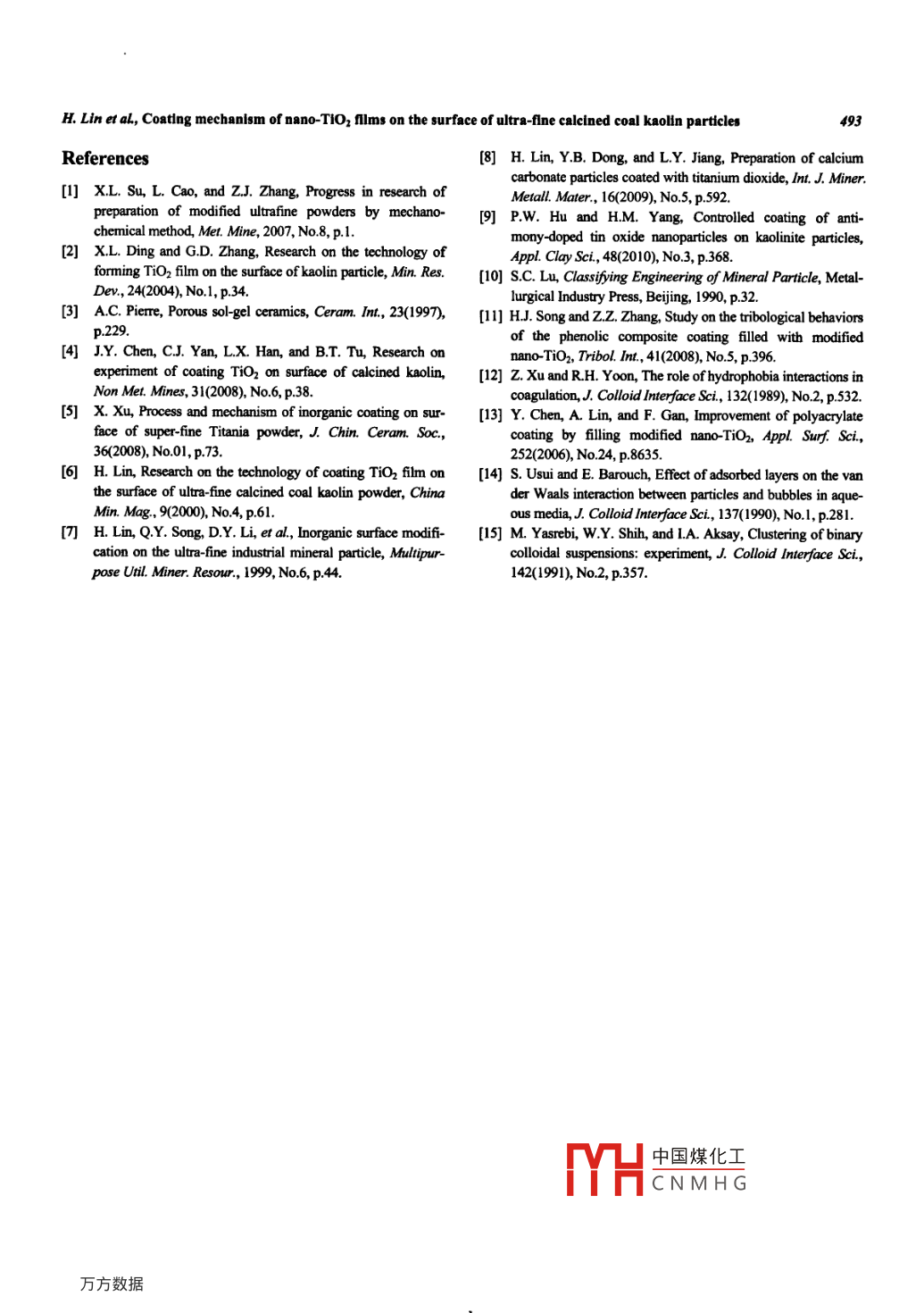 International Journal of Minerals, Metallurgy and MaterialsVolume 18, Number 4, August 2011, Page 487Do:10.1007/8126130110467-0Coating mechanism of nano-TiO2 films on the surface of ultra-finecalcined coal kaolin particlesHai Lin and ying-bo DongSchool of Civil and Environmental Engineering, University of Science and Technology Beijing, Beijing 100083, China(Received: 19 July 2010; revised: 5 August 2010; accepted: 23 August 2010)Abstract: a new type of mineral composite was made by calcined coal kaolin. The interaction mechanism of an inorganic modification reagent TiOSO with the surface of ultra-fine calcined coal kaolin particles(substrate)was studied by X-ray photoelectron spectroscopy. Theresults show that chemisorption exists in the phase boundary between the modification agent and the substrate surface while physical ad-sorption occurs on the modification layers of hydrate titanium dioxide. The interaction force was calculated and analyzed according toDLvO theory between ultra-fine calcined coal kaolin particles and hydrate titanium dioxide nano-particles in the modification system. It isshown that the both electrostatic force and van der Waals force are attractive and the coacervation between ultra-fine calcined coal kaolinparticles and hydrate titanium dioxide nano-particles leads to the coating of hydrate titanium dioxide on the surface of ultra-fine calcined coalkaolin particles.Keywords: calcined coal kaolin; titanium dioxide; coatings; modification; mechanist1 IntroductionOn the basis of the above results, this paper has studiedthe interaction mechanism between ultra-fine calcined coalIndustrial mineral resources are abundant in China, the kaolin and titanium dioxide films by means of moden testvalue of which will be greatly increased by the processes of methods and theoretical analysis. The research providesultra-fine grinding and surface modification. a lot of func- measures and theoretical basis to reveal the mechanism oftional mineral materials and fillers have appeared; however inorganic coatings on the surface of ultra-fine industrialmost of the studies are still focused on the development and mineral particles, which is very important to the preparationapplication of industrial minerals, ignoring the study on theof new types of mineral composites with industrial mineralmechanism[1]. On the contrary, there are a large number of particles and the guidance for modification methodsreports about organic modification on the surface of mineral2. Experimental procedureparticles, such as calcium carbonate, kaolin, and quartz,while there are few reports on the inorganic modification 2. 1. Materials and apparatusmechanism [2-5]The sample was coal kaolin made in the laboratory [7], ofCoal kaolin is a kind of important industrial mineral re which the main component is 2SiO2 Al2O3 2H2O. Thesource. A new type of mineral composite, substituting for whiteness of the sample is 88.50%(blue-ray brightness), thetitanium dioxide, has been made successfully with ultra-fine particle size of-2 um is 91.88%, dso is 0.95 um, the specificcalcined coal kaolin as a substrate and TiOSO4 as a modifi- surface area is 3. 35 m/g, the oil absorption value is 35. 20 gcation reagent. The results of transmission electron micros- per 100 g, and the hiding power is 146. g/m. The appa-copy show that an even and compact nano-TiO2 film has ratuses of surface analysis were TEM and an XSAM800been coated on the surface of kaolin particles [6]multifunctional surface analysis system produced by中國(guó)煤化工Correspondingauthor:HaiLinE-mail:linhai@cesustb.odu.cnSpringerc Univerity of Science and Technology Beijing and Springer-Verlag Berlin Heidelberg 2011CNMHGInt J. Miner. Metall. Mater., VoL 18, No 4, Aug 2011KRATOS Co in England; the test condition is Al Ka(12 kv15mA)2. 2. MethodsThe test was operated in a self-modified reactor withonstant temperature control. A certain amount of coal kao-lin(substrate)and water were added in the reactor; the substrate was made fully dispersed in water. After heating thereaction mixture to the required modified temperature in arater-bath. some titanium salt solution was added as amodification reagent. The final modified products were obtained by centrifugation, filtration, and drying [8Fig 1. TEM image of the modified product.The technology of coating a TiO2 film on the surface ofultra-fine calcined coal kaolin particles was studied. It wasshown that temperature, time, amount of surface modifica-tion agent, pulp density, and stirring velocity were importantfactors influencing the effect of the coating. The optimumcondition determined by experiments were the temperatureof 85%C. the time of 3 h. the amount of surface modificationagent of 0. 75 g/g, the pulp density of 5 g/L, the modificationH value of 8.0, and the stirring velocity of 375 r/min. Thefinal coating product, which was acquired using the opti-mum condition, was tested and analyzed by SEM and TEMThe coating mechanism of the modification reagent and Fig. 2. Enlarge drawing of the substrate and film at the in-substrate was studied by X-ray photoelectron spectroscopy terface.(XPS). By XPS, not only surface information but also deepdistribution data can be obtained. therefore it is a useful energy produced by an ion gun to bombard the samplesmethod in sorption study. Accurate detection information surface, then surface atoms absorbing enough energy canalso can be obtained on the electron binding energy of escape from the samples surface because of energy transferatomic orbitals by XPS, so that whether the change of After that, the escaped ions are examined by mass spectro-chemical environment occurs can be judged by the shift of graphy, and then the secondary ion mass spectrum will bebinding energy. Therefore, we can get the information about obtained. If the spattered surface is examined by XPs,themodification particles from both the surface and interiorep anatoly result will be observed. The main function of3. Result