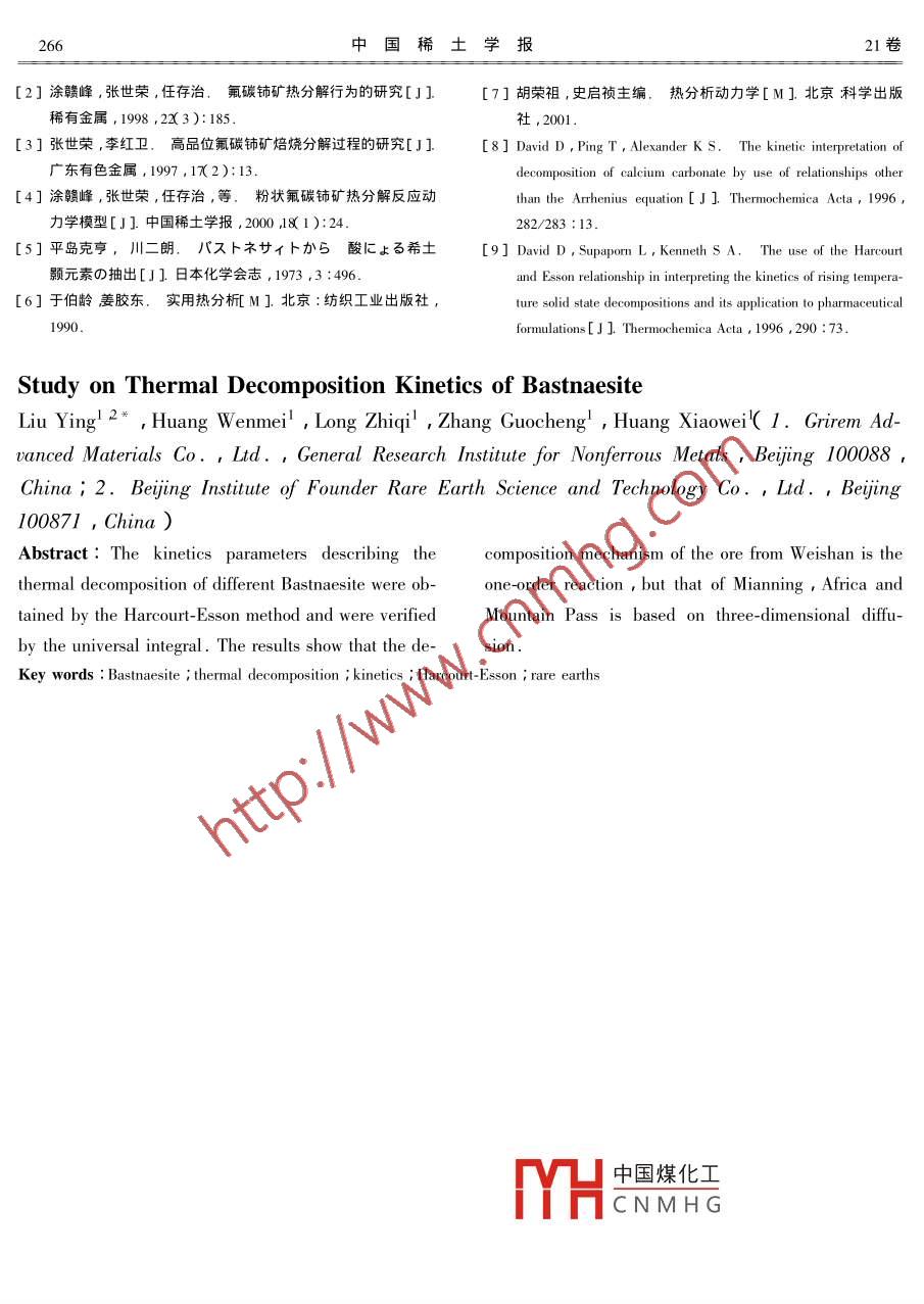 21卷第3期中國稀土學(xué)報(bào)203年6月Vol 21 No. 3JOURNAL OF THE CHINESE RARE EARTH SOCIETYJun.2003氟碳鈰礦熱分解動(dòng)力學(xué)研究劉營12*,黃文梅,龍志奇1,張國成1,黃小衛(wèi)(1.北京有色金屬研究總院有研稀士新材料有限公司,北京10008;2.北京方正稀土科技研究所有限公司,北京100871)摘要:采用 Harcourt-Eson方法對不同來源的氟碳鈰礦晶體熱分解動(dòng)力學(xué)進(jìn)行了系統(tǒng)研究,得到的反應(yīng)機(jī)制方程用普適積分法進(jìn)一步驗(yàn)證結(jié)果顯示微山礦熱分解為一級反應(yīng),不同品位的冕寧、非洲、芒廷帕斯氟碳鈰礦熱分解反應(yīng)都是按照三維擴(kuò)散機(jī)制進(jìn)行的。關(guān)鍵詞:氟碳鈰礦;熱分解;動(dòng)力學(xué); Harcourt-Eson;稀土中圖分類號:TG111.3文獻(xiàn)標(biāo)識碼:A文章編號:1000-434x2003)3-0263-04氟碳鈰礦廣泛地分布在中國內(nèi)蒙古、四川、微T=T;+β山湖流域以及美國芒廷帕斯 Mountain pass)非洲T為反應(yīng)初始溫度;β為升溫速度;t為升溫時(shí)扎伊爾等地區(qū),是輕稀土的重要資源。氧化焙燒過間;T為t時(shí)刻的溫度。將(5代入(1),兩邊分程對于濕法和火法處理工藝都是必不可少的。早別取自然對數(shù)得到在上世紀(jì)60~70年代開始就有人進(jìn)行了這方面的k=[da/dt](a)=(da/dT)dT/dt/a)工作,但是到目前為止,所得到的結(jié)果有所不同=( da/dT )3涂贛峰等1-4認(rèn)為氟碳鈰礦晶體熱分解過程是Irt( Bda/d a)]=InA-E/RT(6)級成核生長反應(yīng)機(jī)制,而平島克亨5等則認(rèn)為分對H(da/dT)fa)]~T-作圖可以從斜率得解反應(yīng)是按照冪函數(shù)法則 Manpol Power)機(jī)制進(jìn)到反應(yīng)活化能E和指前因子A。從而獲得反應(yīng)的反應(yīng)級數(shù)為一級。不同來源和不同品位的氟碳動(dòng)力學(xué)數(shù)據(jù)。鈰礦中存在很多不可知的因素影響分解反應(yīng)的機(jī)由于活化能也可能是溫度的函數(shù),本文采用制。因此,對不同來源,不同品位氟碳鈰礦熱分解 Harcourt-Eson方法描述反應(yīng)速率常數(shù)動(dòng)力學(xué)研究有著十分重要的意義。1反應(yīng)機(jī)制分析其中,C為常數(shù),m為相對常數(shù),對(7澉對數(shù)得到對于固體熱分解過程動(dòng)力學(xué)計(jì)算過程通常采gk=lgC+mlgT(8)用 Arrhenius方程6進(jìn)行,即:即Ink=- ert+Ina(1) da/dt=k a)(9)或k=Ae-E/RT)(2)da/d7/(a)=C7m(10)質(zhì)量作用定律描述了反應(yīng)物濃度與反應(yīng)速率之間分離變量積分,并引入函數(shù)((a)代表反應(yīng)模型,的關(guān)系,由于在固體反應(yīng)中,如果采用濃度的概得到念,數(shù)學(xué)處理過程將非常復(fù)雜,本文引入反應(yīng)深度aa)=10a)≈kd的概念α(0~1)示反應(yīng)進(jìn)行的程度da/dt=kf( a)(3)由于存在如下關(guān)系YH中國煤化工+1+DCNMHG,m值相對較大,所收稿日期:2002-04-04;修訂日期:2002-06-20基金項(xiàng)目:國家自然科學(xué)基金資助項(xiàng)目(59774030)國家重點(diǎn)基礎(chǔ)研究發(fā)展規(guī)劃項(xiàng)目(G1998061301)作者簡通訊聯(lián)裂描m山什單人,生264中國稀土學(xué)報(bào)以,可以將D忽略不計(jì)??梢哉J(rèn)為不同來源氟碳鈰礦熱分解過程最概然機(jī)制函數(shù)列(a)=Bm+1,式中B=CTm+改m+1)],兩于表1中。同時(shí),獲得在最概然機(jī)制情況下的動(dòng)力邊取對數(shù)得到學(xué)參數(shù),如圖3與表2所示。IgG( a)=lgB+(m+1)gT(13)按照上述方法所獲得的最概然機(jī)制函數(shù)范圍固體熱分解過程所涉及的機(jī)制有很多,如何比較大,究竟哪種機(jī)制能夠代表實(shí)際情況還有待獲取一個(gè)合適的機(jī)制函數(shù)對研究熱分解反應(yīng)動(dòng)力于進(jìn)一步驗(yàn)證和篩選。普適積分法在處理固體熱學(xué)是至關(guān)重要的,也是十分困難的,目前存在上百分解過程時(shí)簡便易行,但是同樣存在對各種機(jī)制種方法7本文針對十幾種常見的反應(yīng)機(jī)制方程,函數(shù)估計(jì)的過程,本文采這種方法對上述機(jī)制函按照文獻(xiàn)89的方法荻得TG-DIG曲線的特征值數(shù)進(jìn)行進(jìn)一步篩選。對數(shù)據(jù)進(jìn)行處理后的結(jié)果列包括DrG峰頂處的反應(yīng)深度α灬、半峰寬以及高于圖4中,對反應(yīng)動(dòng)力學(xué)模型和參數(shù)處理后,獲得低溫端DTG曲線形狀等),來推斷最概然機(jī)制函Africa Ore-DTAth low RE contemM-DTA數(shù),然后根據(jù)13武可以得到C,m值,獲得熱分ountaon Pass OreDTA解反應(yīng)速率方程式。然而,由于分析誤差的存在Mianning Ore with high RE eontent- TG..Mianning Ore with high RE contemM-DTA所推斷的機(jī)制函數(shù)會(huì)有些偏差,可以進(jìn)一步采用比較合理的方法進(jìn)行篩選,從而獲得最合適的機(jī)制函數(shù)。本文采用普適積分方法對機(jī)理函數(shù)做進(jìn)步篩選核實(shí)由(2)-(4武以及(a肭定義式可以得到下1400式Ga)=A/KT-Tibe-?(14)圖1不同礦種的TG-DTA曲線兩邊取自然對數(shù)得到IrtdaT-Ti)]=InA/B-E/RT(15)把估計(jì)的概然函數(shù)代入方程(15),線性最小二乘法處理,由斜率求活化能E,截距求指前因子A。再按照邏輯分析進(jìn)一步篩選,獲得最合適的機(jī)Africa Ore制函數(shù)Mianning Ore with high RE contents Mountain Pass Ore2實(shí)驗(yàn)氟碳鈰礦分別為微山礦(REO55%),非洲礦REO61.25%),低品位冕寧礦(REO57%),高品圖2不同礦種的反應(yīng)深度與溫度的關(guān)系曲線位冕寧礦(REO71.35%),芒廷帕斯礦(REO60%),研磨至-200目。在wCT-2A型熱分析儀(
