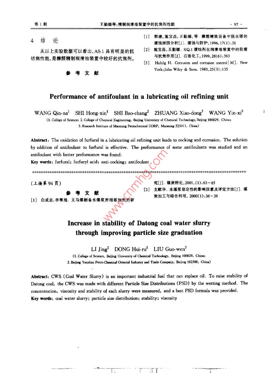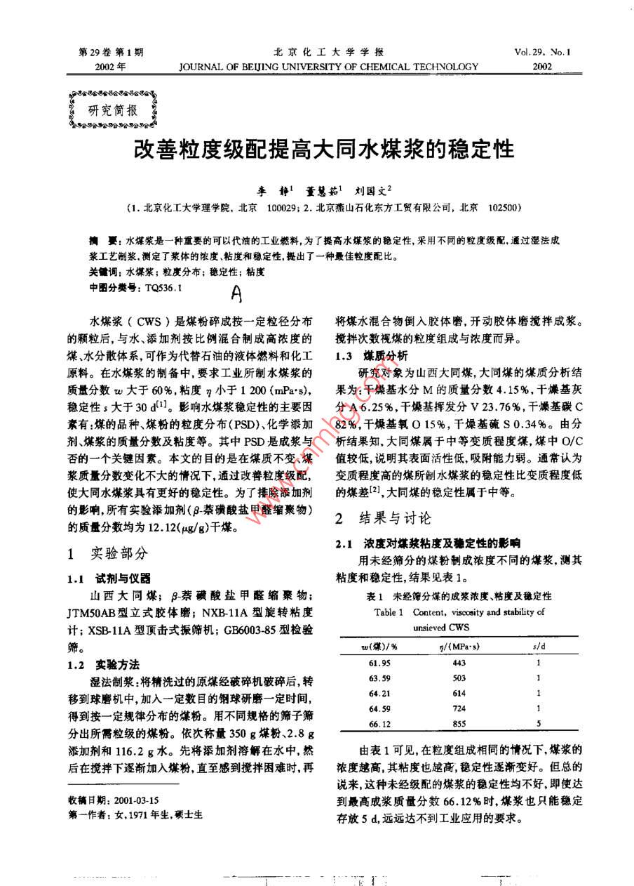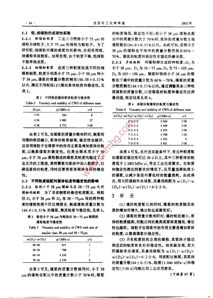 第29卷第1期北京化工大學(xué)學(xué)報(bào)o. 29. No I2002年JOURNAL OF BEUING UNIVERSITY OF CHEMICAL TECHNOLOGY2002研究簡(jiǎn)報(bào)改善粒度級(jí)配提高大同水煤漿的穩(wěn)定性李靜董懸茹1劉國(guó)文2(1.北京化工大學(xué)理學(xué)院,北京100029;2.北京燕山石化東方工貿(mào)有限公司,北京102500)摘罷:水煤漿是一種重要的可以代油的工業(yè)燃料,為了提高水煤漿的穩(wěn)定性,采用不同的粒度級(jí)配,通過(guò)濕法成漿工藝制漿,測(cè)定了漿體的濃度粘度和穩(wěn)定性提出了一種最佳粒度配比。關(guān)健詢(xún):水煤漿;粒度分布;穩(wěn)定性;粘度中圖分樊號(hào):TQ536.1A水煤漿(CwS)是煤粉碎成按一定粒徑分布將煤水混合物倒入膠體磨,開(kāi)動(dòng)膠體磨攪拌成漿。的顆粒后,與水、添加劑按比例混合制成高濃度的攪拌次數(shù)視煤的粒度組成與濃度而異煤、水分散體系,可作為代替石油的液體燃料和化工1.3煤質(zhì)分析原料。在水煤漿的制備中,要求工業(yè)所制水煤漿的研究對(duì)象為山西大同煤,大同煤的煤質(zhì)分析結(jié)質(zhì)量分?jǐn)?shù)w大于60%,粘度?小于1200(mPas),果為:干燥基水分M的質(zhì)量分?jǐn)?shù)415%,干燥基灰穩(wěn)定性s大于3041]。影響水煤漿穩(wěn)定性的主要因分A6.25%,干燥基揮發(fā)分V23.76%,干燥基碳C素有:煤的品種、煤粉的粒度分布(PSD)、化學(xué)添加82%,干燥基氧O15%,千燥基硫S034%由分劑、煤漿的質(zhì)量分?jǐn)?shù)及粘度等。其中PSD是成漿與析結(jié)果知,大同煤屬于中等變質(zhì)程度煤,煤中O/C否的一個(gè)關(guān)鍵因素。本文的目的是在煤質(zhì)不變、煤值較低,說(shuō)明其表面活性低,吸附能力弱。通常認(rèn)為漿質(zhì)量分?jǐn)?shù)變化不大的情況下,通過(guò)改善粒度級(jí)配,變質(zhì)程度高的煤所制水煤漿的穩(wěn)定性比變質(zhì)程度低使大同水煤漿具有更好的穩(wěn)定性。為了排除添加劑的煤差2,大同煤的穩(wěn)定性屬于中等的影響,所有實(shí)驗(yàn)添加劑(B-萘磺酸鹽甲醛縮聚物)的質(zhì)量分?jǐn)?shù)均為12.12(μg/g)干煤結(jié)果與討論1實(shí)驗(yàn)部分2.1濃度對(duì)煤漿粘度及穩(wěn)定性的影響用未經(jīng)篩分的煤粉制成濃度不同的煤漿,測(cè)其11試劑與儀圖粘度和穩(wěn)定性,結(jié)果見(jiàn)表1。山西大同煤;β萘磺酸鹽甲醛縮聚物;表1未經(jīng)篩分煤的成漿濃度、粘度及穩(wěn)定性JTM50AB型立式膠體磨;NXB11A型旋轉(zhuǎn)粘度Table 1 Content, viscosity and stability of計(jì);XSB1A型頂擊式振篩機(jī);GB6003-85型檢驗(yàn)unsieved CwS篩v(煤)/%7/(MPas)12實(shí)驗(yàn)方法濕法制漿:將精洗過(guò)的原煤經(jīng)破碎機(jī)破碎后,轉(zhuǎn)移到球磨機(jī)中,加入一定數(shù)目的鋼球研磨一定時(shí)間得到按一定規(guī)律分布的煤粉。用不同規(guī)格的篩子篩分出所需粒級(jí)的媒粉。依次稱(chēng)量350g煤教、2.8g—612添加劑和116.2g水。先將添加劑溶解在水中然由表1可見(jiàn),在粒度組成相同的情況下,煤漿的后在攪拌下逐漸加入煤粉,直至感到攪拌困難時(shí),再濃度越高其粘度也越高穩(wěn)定性逐漸變好。但總的說(shuō)來(lái),這種未經(jīng)級(jí)配的煤漿的穩(wěn)定性均不好,即使達(dá)收稿日期:200103-15到最高成漿質(zhì)量分?jǐn)?shù)66.12%時(shí),煤漿也只能穩(wěn)定一作者:女,1971年生,碩士生存放5d,遠(yuǎn)遠(yuǎn)達(dá)不到工業(yè)應(yīng)用的要求。北京化工大學(xué)學(xué)報(bào)2002年22粗、細(xì)煤粉的成漿性實(shí)的粘度偏低,穩(wěn)定性不好;而小于38pm煤粉在配2.2.1粗煤粉制漿工業(yè)上習(xí)慣稱(chēng)小于75m的比中的質(zhì)量分?jǐn)?shù)大于70%時(shí),漿體的質(zhì)量分?jǐn)?shù)又很煤粉為細(xì)粒子,大于75μm的煤粉為粗粒子。為了難控制在(64.0±0.5)%以?xún)?nèi)。由此可知,若將小于研究粗、細(xì)煤粉對(duì)煤的成漿性的影響分別采用粗、38pm的煤粉在干煤中的質(zhì)量分?jǐn)?shù)控制在60%~細(xì)煤粉單獨(dú)制漿。結(jié)果發(fā)現(xiàn),由于粘度不夠,粗煤粉70%,煤漿的粘度和穩(wěn)定性有望達(dá)到最佳值。不能單獨(dú)成漿。232多氦氦配將煤粉篩分成四種粒度:D1為222細(xì)媒粉制漿選用三種粒度組成不同的細(xì)小于38m,D2為38~75m,D3為75~105m煤粉制漿粒度分別是小于75m、小于50m和小D4為105-150m。制漿時(shí)保持小于38μm的煤于38pm,煤漿的質(zhì)量分?jǐn)?shù)控制在(6050±05)%粉在干煤中的質(zhì)量分?jǐn)?shù)為60%~70%煤漿的質(zhì)量以?xún)?nèi),測(cè)定不同粒徑(D)煤的漿體粘度和穩(wěn)定性,見(jiàn)分?jǐn)?shù)控制在(64±0.5)%以?xún)?nèi),通過(guò)調(diào)盛其余三表2。度煤粉的質(zhì)量分?jǐn)?shù),以使煤漿的粘度和穩(wěn)定性表2不同粒徑煤的漿體粘度與穩(wěn)定性最佳值,測(cè)定結(jié)果見(jiàn)表4。Table 2 Visoosity and stability of CwS of different sizes表4多級(jí)級(jí)配煤漿的粘度與穩(wěn)定性D/um9/(MPa's)Table 4 Viscosity and stability of CwS of different sizes(D1):m(D2):w(D3)t(D4)/(MPas)19838706:2:2:027736:2:1:1199>30由表2可見(jiàn),當(dāng)煤漿的質(zhì)量分?jǐn)?shù)相同時(shí)制漿所7:1:1:130用煤的粒徑越小,漿體的粘度越高,穩(wěn)定性也越好7:0:2:11252這說(shuō)明細(xì)粒子在煤漿中的作用主要是增加漿體的粘7:0:3:0度,以提高煤漿的穩(wěn)定性。但是全部采用小于50由表4可見(jiàn),在所述實(shí)驗(yàn)條件下,有五種粒度配μm、小