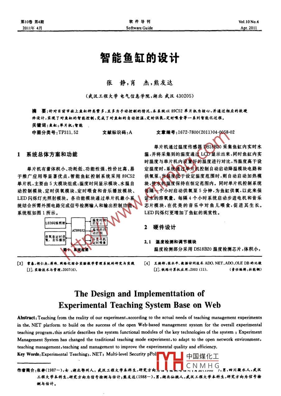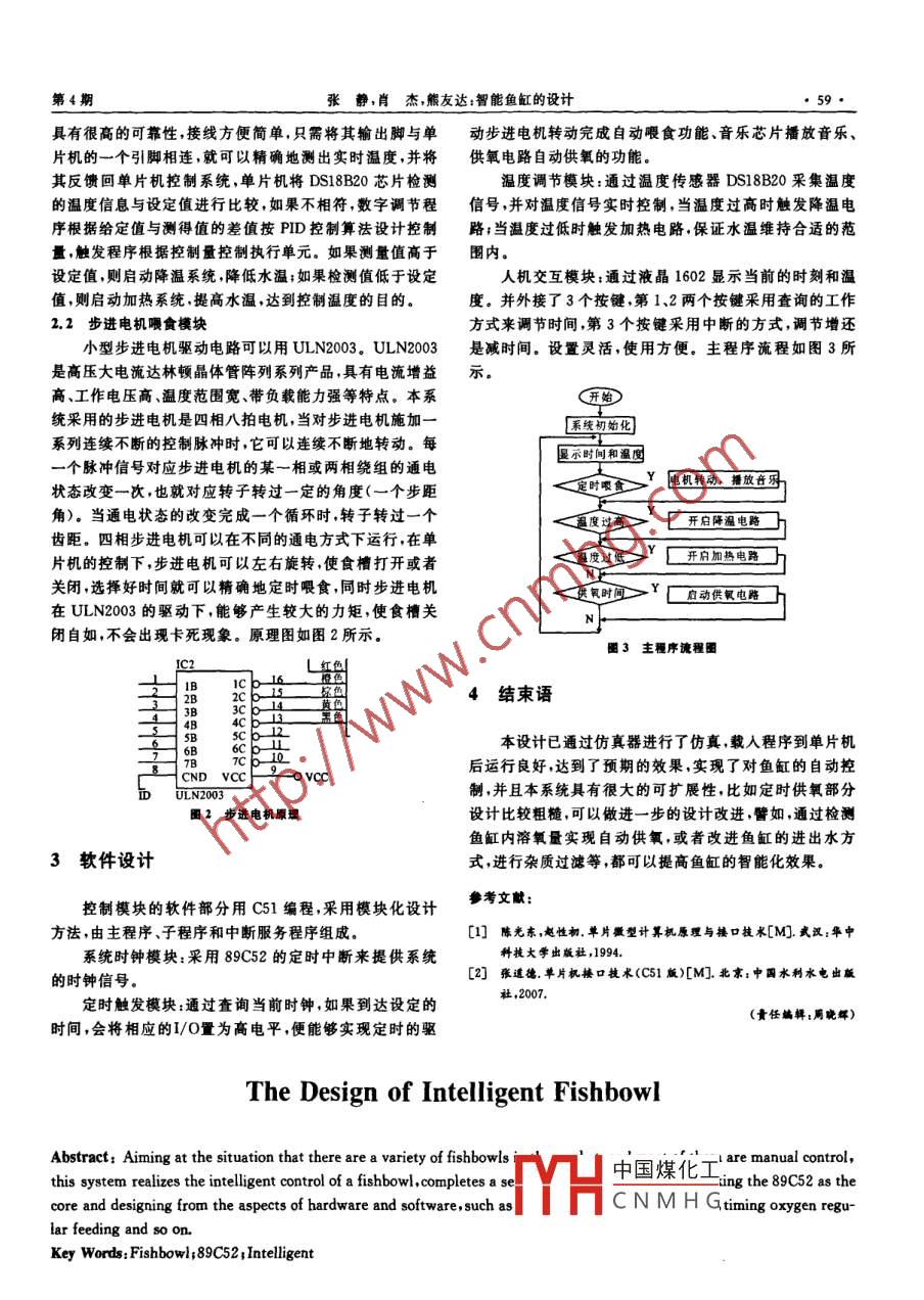 第10卷第4期軟件導(dǎo)刊Vol. 10 No.42011年 4月Software GuideApr. 2011智能魚(yú)缸的設(shè)計(jì)張靜,肖杰,熊友達(dá)(武漢工程大學(xué)電氣信息學(xué)院,湖北武汊430205)摘要:針對(duì)目前市面上魚(yú)缸種類(lèi)繁多,且多 為手動(dòng)控制的情況,本系統(tǒng)以89C52單片機(jī)為核心,并通過(guò)相應(yīng)的軟硬件設(shè)計(jì),實(shí)現(xiàn)了對(duì)魚(yú)缸的智能控制,完成了對(duì)魚(yú)缸的自動(dòng)控溫,定時(shí)供氧,定時(shí)喂食等一系列智能化過(guò)程。關(guān)鍵詞:魚(yú)缸;單片機(jī);智能中圈分類(lèi)號(hào):TP311. 52文獻(xiàn)標(biāo)識(shí)碼:A文章編號(hào):1672-7800(2011)04-0058-02單片機(jī)通過(guò)溫度傳感器DS18B20采集魚(yú)缸內(nèi)實(shí)時(shí)水1系統(tǒng)總體方案和功能溫,并將采集到的溫度通過(guò)LCD顯示出來(lái),同時(shí)魚(yú)缸內(nèi)實(shí)時(shí)溫度與單片機(jī)內(nèi)設(shè)置好的溫度進(jìn)行對(duì)比,當(dāng)溫度高于設(shè)單片機(jī)有著體積小、功耗低、功能性強(qiáng)、性?xún)r(jià)比高、易定溫度時(shí),系統(tǒng)通過(guò)單片機(jī)控制自動(dòng)啟動(dòng)降溫模塊電路和于推廣應(yīng)用等顯薯優(yōu)點(diǎn),智能魚(yú)缸控制系統(tǒng)采用89C52供氧泵,當(dāng)溫度低于設(shè)定溫度范圍時(shí),則自動(dòng)啟動(dòng)加熱模單片機(jī),主要由5大模塊組成:溫度時(shí)間顯示模塊、水溫自塊,使水的溫度保持在恒定范圍內(nèi)。同時(shí)單片機(jī)控制系統(tǒng)動(dòng)控制模塊、定時(shí)供氧模塊、定時(shí)喂食和音樂(lè)播放模塊、每隔一個(gè)小時(shí)啟動(dòng) 供氧泵5分鐘,為魚(yú)缸供氧,以此來(lái)保LED閃爍燈光照射模塊。各功能模塊通過(guò)單片機(jī)最小系證水的溶氧量。每隔4個(gè)小時(shí)系統(tǒng)啟動(dòng)步進(jìn)電機(jī)和音樂(lè)統(tǒng)結(jié)合所需外圍電路完成信號(hào)檢測(cè)輸人和輸出控制功能,芯片模塊,在優(yōu)美的音樂(lè)中對(duì)魚(yú)兒喂食,促進(jìn)其生長(zhǎng)。系統(tǒng)框如圖1所示。LED內(nèi)爍燈更增加了魚(yú)缸的觀賞性。|LED網(wǎng)爍照射2硬件設(shè)計(jì)2.1溫度檢測(cè)和調(diào)節(jié)模塊圈1系統(tǒng)框圈溫度檢測(cè)部分采用DS18B20溫度檢測(cè)芯片,體積小,[3] 常春,胡仁杰,蔣瑋.網(wǎng)絡(luò)化綜合實(shí)驗(yàn)教學(xué)管理系鯇的研究與實(shí)疏[4] 王煥彬,張水平.數(shù)據(jù)訪問(wèn)技術(shù)ADO. NET ADO.OLE DB的比較[].實(shí)驗(yàn)技術(shù)與管理,2007(6).[J].鐵路計(jì)算機(jī)應(yīng)用,2003 (11).(責(zé)任編輯;杜能鋼)The Design and Implementtation ofExperimental Teaching System Base on WebAbstract: Teaching from the reality of our experiment, according to the actual needs of teaching management experimentsin the, NET platform to build on the success of the open Web-based management system for the overall experimentalteaching program, this article describes the system functional modules of the key technologies of the system ; ExperimentManagement System has changed the traditional teaching mode experiment, to adapt to the open network environment,teaching management, teaching and management to improve the experimental quality and efficiency.Key Words:Experimental Teaching;. NET; Multi-level Security pPolI中國(guó)煤化工CNM H G.作者簡(jiǎn)介:張靜(1987-),女,湖北鄂州人,武漢工程大學(xué)本科生,研究方向ha但mhnin兩100),男,四川凝水人,武漢工程大學(xué)本科生,研究方向?yàn)樾盘?hào)檢測(cè)與估計(jì);熊友達(dá)(1988- ),男 ,湖北仙桃人,武漢工程大學(xué)本科生,研究方向?yàn)樾盘?hào)檢測(cè)與估計(jì)。第4期張靜,肖杰,熊友達(dá):智 能魚(yú)缸的設(shè)計(jì)具有很高的可靠性,接線(xiàn)方便簡(jiǎn)單,只需將其輸出腳與單動(dòng)步進(jìn)電機(jī)轉(zhuǎn)動(dòng)完成自動(dòng)喂食功能、音樂(lè)芯片播放音樂(lè)、片機(jī)的一個(gè)引腳相連,就可以精確地測(cè)出實(shí)時(shí)溫度,并將供氧電路自動(dòng)供氧的功能。其反饋回單片機(jī)控制系統(tǒng),單片機(jī)將DS18B20芯片檢測(cè)溫度調(diào)節(jié)模塊:通過(guò)溫度傳感器DS18B20采集溫度的溫度信息與設(shè)定值進(jìn)行比較,如果不相符,數(shù)字調(diào)節(jié)程信號(hào),并對(duì)溫度信號(hào)實(shí)時(shí)控制,當(dāng)溫度過(guò)高時(shí)觸發(fā)降溫電序根據(jù)給定值與測(cè)得值的差值按PID控制算法設(shè)計(jì)控制路;當(dāng)溫度過(guò)低時(shí)觸發(fā)加熱電路.保證水溫維持合適的范量,觸發(fā)程序根據(jù)控制量控制執(zhí)行單元。如果測(cè)量值高于圍內(nèi)。設(shè)定值,則啟動(dòng)降溫系統(tǒng),降低水溫;如果檢測(cè)值低于設(shè)定人機(jī)交互模塊:通過(guò)液晶1602顯示當(dāng)前的時(shí)刻和溫值,則啟動(dòng)加熱系統(tǒng).提高水溫,達(dá)到控制溫度的目的。度。并外接了3個(gè)按鍵,第1、2兩個(gè)按鍵采用查詢(xún)的工作2.2步進(jìn)電機(jī)喂貪模塊方式來(lái)調(diào)節(jié)時(shí)間,第3個(gè)按鍵采用中斷的方式,調(diào)節(jié)增還小型步進(jìn)電機(jī)驅(qū)動(dòng)電路可以用ULN2003. ULN2003是減時(shí)間。設(shè)置靈活,使用方便。主程序流程如圖3所是高壓大電流達(dá)林頓晶體管陣列系列產(chǎn)品,具有電流增益示。高、工作電壓高、溫度范圍寬、帶負(fù)載能力強(qiáng)等特點(diǎn)。本系開(k