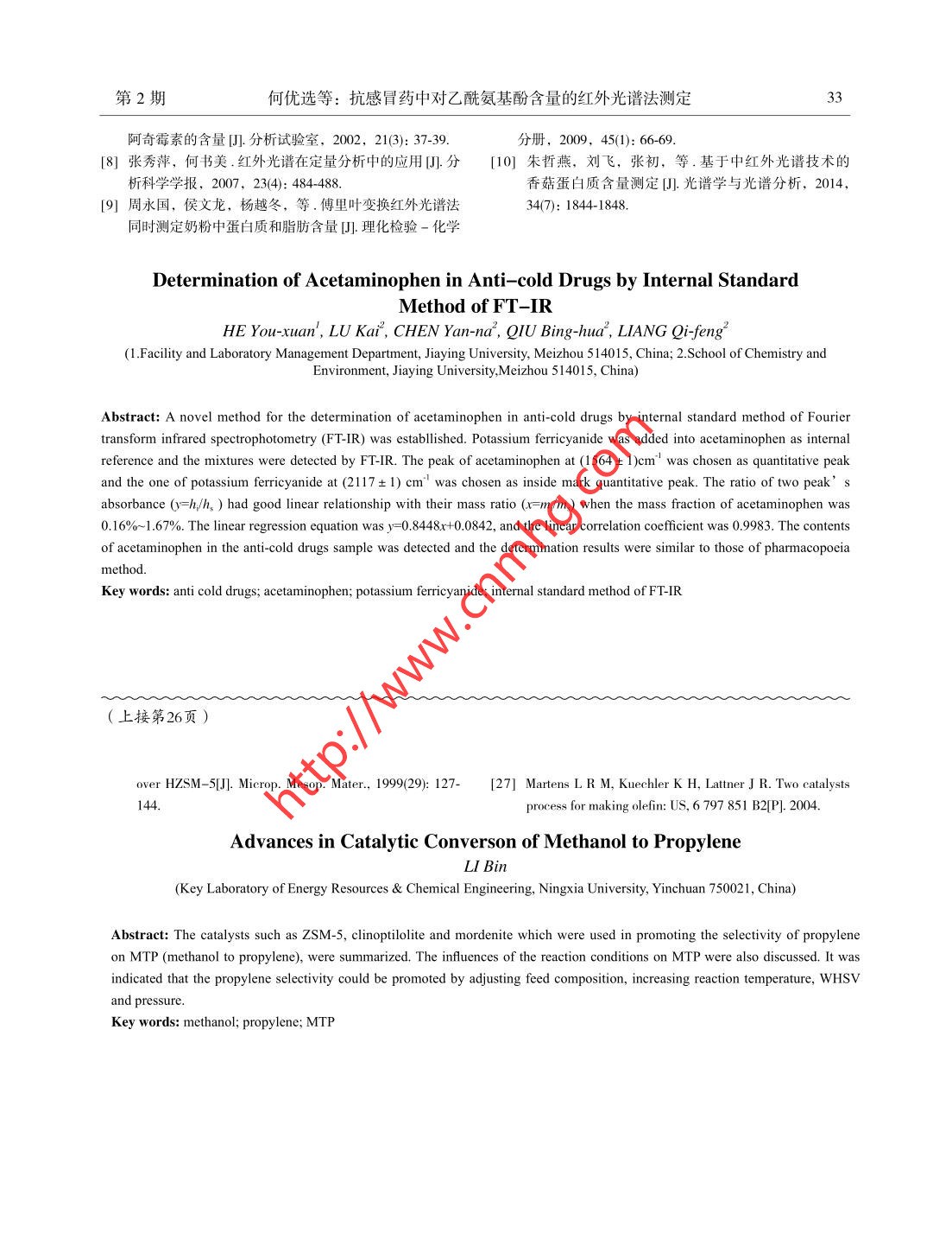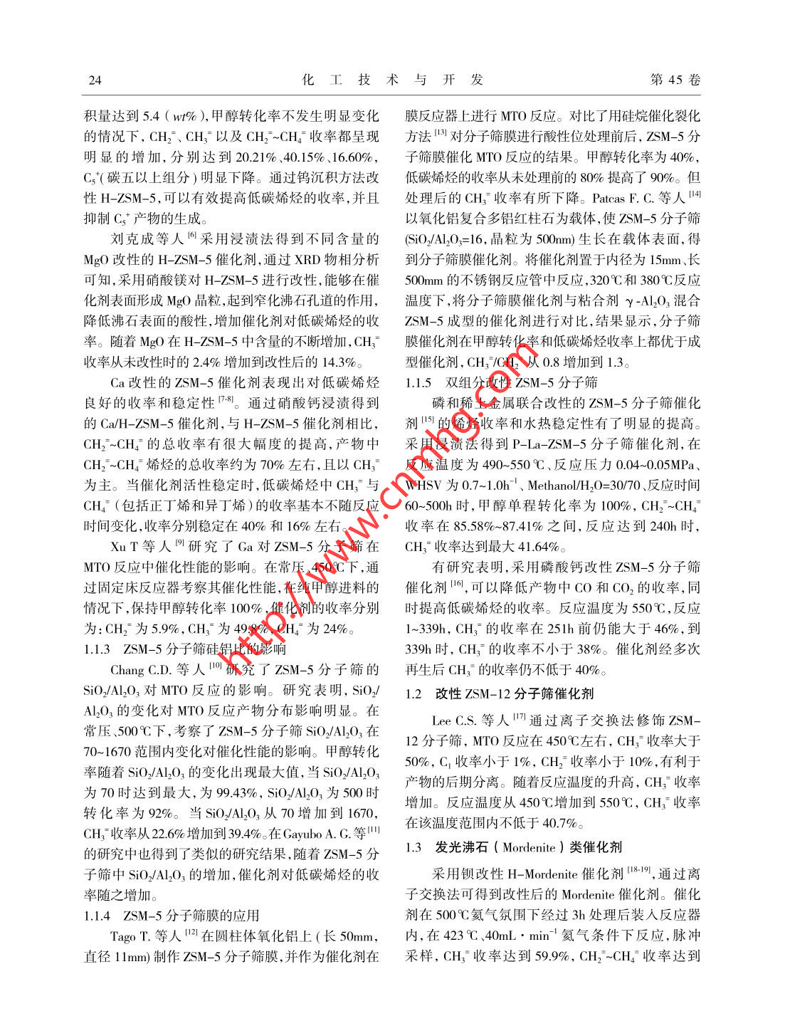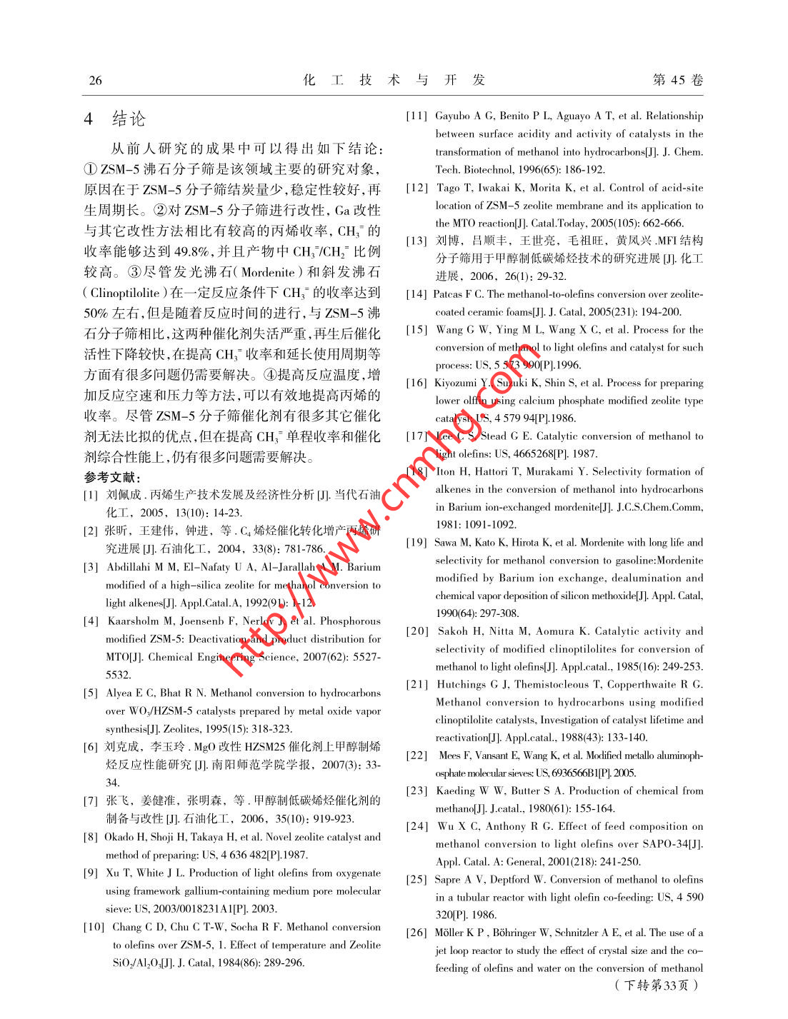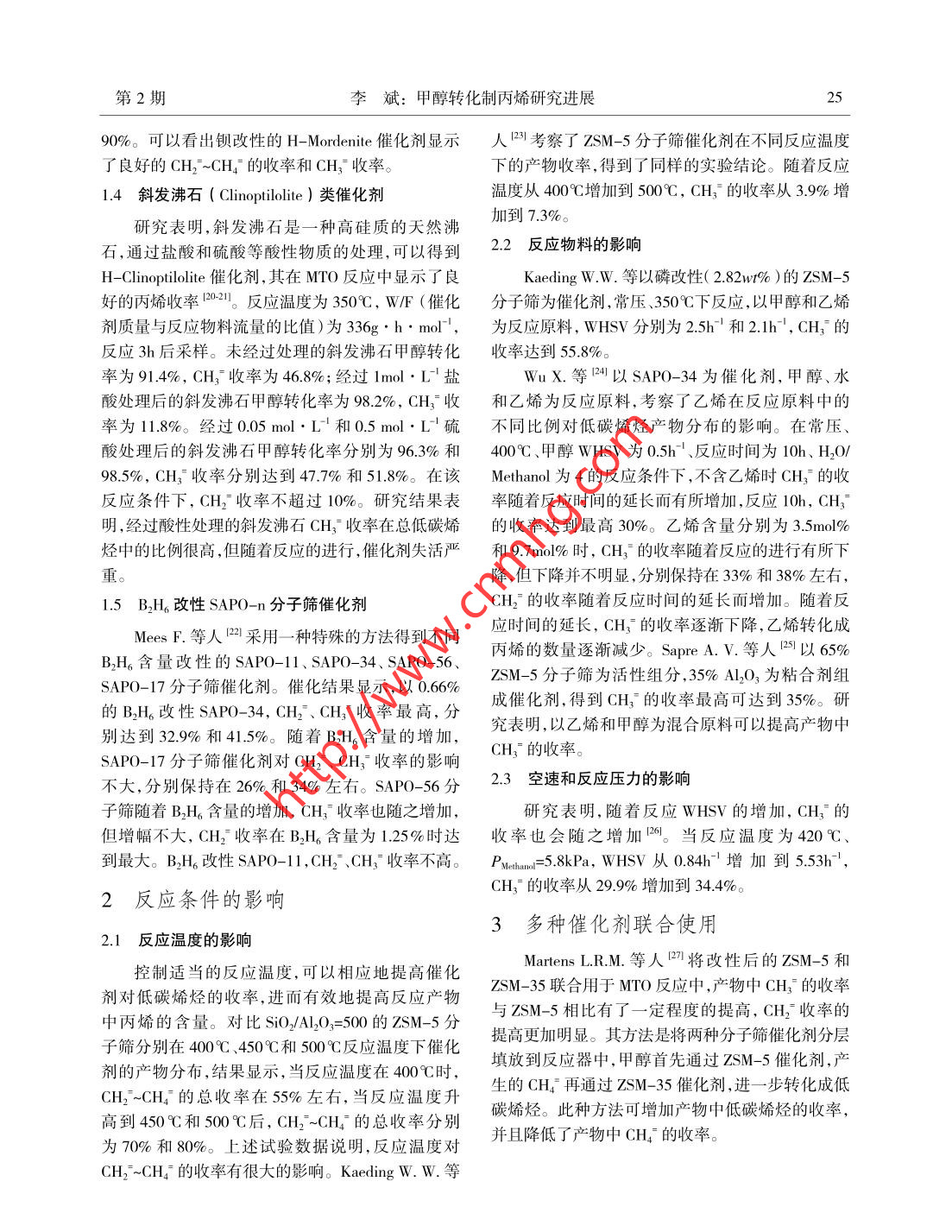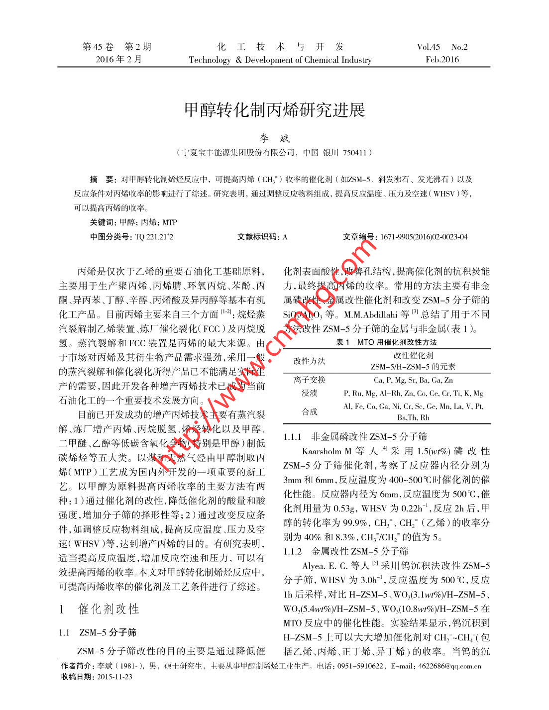 第45卷第2期比工技術(shù)與開發(fā)Vol.45 No.22016年2月Technology & Development of Chemical IndustryFeb.2016甲醇轉(zhuǎn)化制丙烯研究進展李斌(寧夏寶豐能源集團股份有限公司,中國銀川750411)摘要:對甲醇轉(zhuǎn)化制烯烴反應(yīng)中, 可提高丙烯(CH; )收率的催化劑(如ZSM- -5、斜發(fā)沸石、發(fā)光沸石)以及反應(yīng)條件對丙烯收率的影響進行了綜述。研究表明,通過調(diào)整反應(yīng)物料組成,提高反應(yīng)溫度、壓力及空速( WHSV )等,可以提高丙烯的收率。關(guān)鍵詞:甲醇;丙烯; MTP中圖分類號: TQ221.21*2文獻標識碼: A .文章編號: 1671-9905(2016)02-0023-04丙烯是僅次于乙烯的重要石油化工基礎(chǔ)原料,化劑表面酸性,改善孔結(jié)構(gòu),提高催化劑的抗積炭能:主要用于生產(chǎn)聚丙烯、丙烯腈、環(huán)氧丙烷、苯酚、丙力,最終提高丙烯的收率。常用的方法主要有非金酮、異丙苯、丁醇、辛醇、丙烯酸及異丙醇等基本有機屬磷改性、金屬改性催化劑和改變ZSM-5分子篩的化工產(chǎn)品。目前丙烯主要來自三個方面0121:烷烴蒸Si0/AL2O3等。M.M.Abillahi 等B總結(jié)了用于不同汽裂解制乙烯裝置煉廠催化裂化(FCC)及丙烷脫方法改性ZSM- -5分子篩的金屬與非金屬(表1 )。氫。蒸汽裂解和FCC裝置是丙烯的最大來源。由表1 MTO用催化劑改性方法于市場對丙烯及其衍生物產(chǎn)品需求強勁,采用一般改性方法改性催化劑ZSM- -5/H-ZSM-5的元素的蒸汽裂解和催化裂化所得產(chǎn)品已不能滿足實際生離子交換.Ca, P, Mg. Sr, Ba, Ga, Zn產(chǎn)的需要,因此開發(fā)各種增產(chǎn)丙烯技術(shù)已成為當前浸漬P, Ru, Mg, Al-Rh, Zn, Co, Ce, Cr, Ti, K, Mg石油化工的一個重要技術(shù)發(fā)展方向。Al, Fe, Co, Ga, Ni, Cr, Sc, Ge, Mn, La, V, Pt,目前已開發(fā)成功的增產(chǎn)丙烯技術(shù)主要有蒸汽裂合成Ba,Th, Rh解煉廠增產(chǎn)丙烯、丙烷脫氫、烯烴轉(zhuǎn)化以及甲醇、1.1.1 非金屬磷改性ZSM- 5分子篩二甲醚、乙醇等低碳含氧化合物(特別是甲醇)制低KaarsholmM等人4采用1.5(wt%)磷改性碳烯烴等五大類。以煤和天然氣經(jīng)由甲醇制取丙ZSM-5分子篩催化劑,考察了反應(yīng)器內(nèi)徑分別為烯( MTP )工藝成為國內(nèi)外開發(fā)的一-項重要的新工3mm和6mm,反應(yīng)溫度為400~500C時催化劑的催藝。以甲醇為原料提高丙烯收率的主要方法有兩化性能。反應(yīng)器內(nèi)徑為6mm,反應(yīng)溫度為500C,催種:1)通過催化劑的改性,降低催化劑的酸量和酸化劑用量為0.53g, WHSV為0.22h-' ,反應(yīng)2h后,甲強度,增加分子篩的擇形性等;2 )通過改變反應(yīng)條醇的轉(zhuǎn)化率為99.9%, CHj、CH2" (乙烯)的收率分件,如調(diào)整反應(yīng)物料組成,提高反應(yīng)溫度、壓力及空別為40%和8.3%, CH,7/CH2"的值為5。速( WHSV )等,達到增產(chǎn)丙烯的目的。有研究表明,1.1.2 金屬改性ZSM-5分子篩適當提高反應(yīng)溫度,增加反應(yīng)空速和壓力,可以有Alyea. E. C.等人(5]采用鎢沉積法改性ZSM-5效提高丙烯的收率。本文對甲醇轉(zhuǎn)化制烯烴反應(yīng)中,分子篩,WHSV為3.0h-',反應(yīng)溫度為500C,反應(yīng)可提i高丙烯收率的催化劑及工藝條件進行了綜述。1h后采樣,對比H- -ZSM-5、WO,(3.1wt%)/H-ZSM-5、1催化劑改性WO(5.4wt%)/H- ZSM- -5、WO3(10.8wt%)/H-ZSM-5在MTO反應(yīng)中的催化性能。實驗結(jié)果顯示,鎢沉積到1.1 ZSM-5分子篩H- ZSM-5上可以大大增加催化劑對CH2~CH4(包ZSM-5分子篩改性的目的主要是通過降低催括乙烯.丙烯、正丁烯、異丁烯)的收率。當鎢的沉作者簡介:李斌(1981-),男,碩士研究生,主要從事甲醇制烯烴工業(yè)生產(chǎn)。電話: 0951- -5910622, E-mail: 4622686@qq.com.cn收稿日期: 2015-11-2324化工技術(shù)與開發(fā)第45卷積量達到5.4 ( wt% ),甲醇轉(zhuǎn)化率不發(fā)生明顯變化膜反應(yīng)器 上進行MTO反應(yīng)。對比了用硅烷催化裂化的情況下,CH2、CH5以及CH2~CH2收率都呈現(xiàn)方法[31對分子篩膜進行酸性位處理前后, ZSM- -5分明顯的增加,分別達到20.21%、40.15%、16.60%,子篩膜催化MTO反應(yīng)的結(jié)果。甲醇轉(zhuǎn)化率為40%,C5+(碳五以上組分)明顯下降。通過鎢沉積方法改低碳烯烴的收率從未處理前的80%提高了90%。但性H--ZSM--5,可以有效提高低碳烯烴的收率,并且處理后的CH;”收率有所下降。PatcasF. C.等人41抑制Cs5產(chǎn)物的生成。以氧化鋁復(fù)合多鋁紅柱石為載體,使ZSM-5分子篩劉克成等人向采用浸漬法得到不同含量的(SiO2/A12O;=16,晶粒為500nm)生長在載體表面,得MgO改性的H- ZSM- -5催化劑,通過XRD物相分析到分 子篩膜催化劑。將催化劑置于內(nèi)徑為15mm、長可知,采用硝酸鎂對H--ZSM-5進行改性,能夠在催500mm的不銹鋼反應(yīng)管中反應(yīng),320°和380C反應(yīng)化劑表面形成Mg0晶粒,起到窄化沸石孔道的作用,溫度下,將分子篩膜催化劑與粘合劑γ-Al2O3 混合降低沸石表面的酸性,增加催化劑對低碳烯烴的收ZSM-5成型的催化劑進行對比,結(jié)果顯示,分子篩率。隨著MgO在H-ZSM-5中含量的不斷增加, CH;"膜催化劑在甲醇轉(zhuǎn)化率和低碳烯烴收率上都優(yōu)于成收率從未改性時的2.4%增加到改性后的14.3%。型催化劑, CH:7/CH2從0.8增加到1.3。Ca改性的ZSM-5催化劑表現(xiàn)出對低碳烯烴1.1.5 雙組分改性 ZSM-5分子篩良好的收率和穩(wěn)定性178]。通過硝酸鈣浸漬得到磷和稀土金屬聯(lián)合改性的ZSM-5分子篩催化的Ca/H-ZSM- -5催化劑,與H-ZSM- -5催化劑相比,劑015的烯烴收率和水熱穩(wěn)定