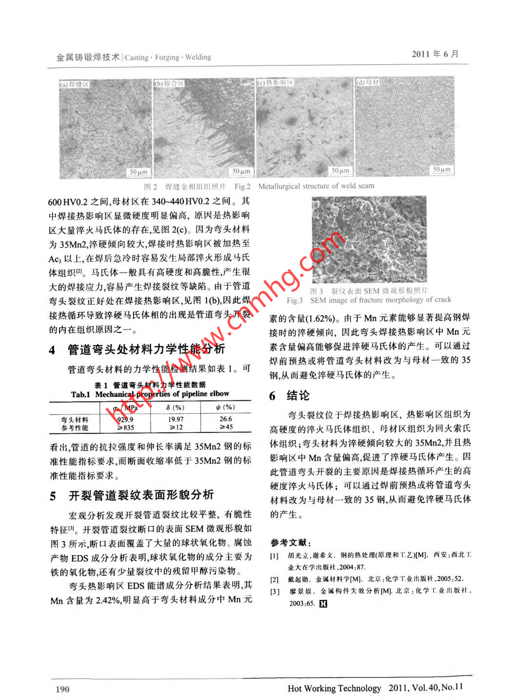 上半月出版Casting . Forging. WeldingN金屬鑄鍛焊技術●失效分析●甲醇輸送管道開裂失效分析許萬劍,丁毅,師紅旗,馬立群(南京工業(yè)大學材料科學與工程學院,江蘇南京210009)摘要:采用宏觀形貌分析、化學成分分析、金相顯微組織分析.SEM微觀形貌分析等手段,對某公司的甲醇輸送管道開裂進行了分析。結果表明,甲醇輸送管道開裂為脆性開裂,焊接熱循環(huán)產生的淬火馬氏體導致了該管道的開裂。關鍵詞:甲醇輸送管道;淬火馬氏體;脆性開裂.中圖分類號:TG40文獻標識碼:A文章編號:1001-3814(2011)11-0189-02Failure Analysis on Crack of Methanol Transmission PipelineXU Wanjian, DING Yi, SHI Hongi, MA Liqun(College of Material Science and Engineering, Nanjing Univrsity of Technology, Nanjing 210009, China)Abstract: The crack of methanol transmission pipeline was analyzed based on macroscopic, chemical composition,microstructure, SEM fracture surface and EDS chemical composition. The results show that the methanol transmissionpipeline is brittle crack. The pipeline crack is caused by quenching marensite, which is produced by welding thermal cycle.Key words: methanol transmission pipeline ; quenching martensite ;britle crack某公司甲醇輸送管道使用一個月后發(fā)生開裂。著平行 于焊縫的方向(周向)發(fā)展。其中1" 標記處為該管道為地面管道,直管段材料為35鋼,彎頭材料為金相試樣的取樣位置,對2*樣斷裂表面進行掃描電35Mn2。管道設計采用套管技術,甲醇在內管,外套管鏡(SEM)微觀形貌分析,并對斷裂表面腐蝕產物進行用氮保壓,氮氣設計壓力報警。使用一個月后,氮氣EDS成分分析。4"為拉伸試樣取樣位置,5*為光譜成壓力報警發(fā)現該管道漏氣,檢查發(fā)現漏氣位置在彎分分析試樣取樣位置。圖1(b)為1" 試樣低倍酸浸后頭附近。為了分析管道泄漏的原因,對開裂管道進行宏觀照片,圖中黑色區(qū)域內灰色條紋為裂紋,黑色區(qū)了失效分析。域經金相檢驗為淬火馬氏體區(qū)。1管道宏觀分析2管道彎頭處化學成分分析圖1(a)是甲醇輸送管道彎頭裂紋處著色探傷后直讀光譜成分檢測結果表明,管道彎頭含碳量的宏觀照片。從照片中可以看出,裂紋位于管道彎頭為0.36%,并含有1.62%的Mn元素。根據光譜成分部緊靠熔合線的焊接熱影響區(qū),長度約110mm,并沿檢測結果并與相關國家標準對比,.可以判斷管道彎頭材料為35Mn2鋼,與設計材料一致。管道彎頭材馬氏體區(qū)料中硫、磷含量均符合高級優(yōu)質鋼標準。3管道彎頭處 顯微組織分析管道焊縫金相顯微組織照片見圖2。從圖2(a)裂紋可看出,管道焊縫區(qū)組織為鑄態(tài)組織,未見明顯焊接缺陷;從圖2(b)可看出,管道焊縫與母材熔合正常;圖1失效管道彎頭宏觀照片Fig.1 Macrograph of failure pipeline elbow從圖2(c)可看出,管道熱影響區(qū)組織為淬火馬氏體凹,可以看到板條狀馬氏體和細針狀馬氏體存在;從圖2(d)可看出,管道彎頭母材組織為回火索氏體收稿日期:2011-01-06作者簡介:許萬創(chuàng)(1987- ),男,江蘇鹽城人,碩士研究生,主要研究方向組織,表明管道彎頭經過調質處理。為耐蝕金屬材料;電話:15195860752;管道焊縫顯微硬度測試結果表明,焊縫區(qū)顯微E-mail:xuwanjian2008@126.com硬度在200- -300HV0.2之間,熱影響區(qū)在500~《熱加工工藝》2011年第40卷第11期189.金屬鑄鍛焊技術Casting. Forging . Welding2011年6月石)翠縫區(qū)b)路合區(qū)[9)熱影響區(qū)50umS50um50μm. S50μm J圖2焊縫 金相組織照片Fig.2 Meallurgical structure of weld sceam600HV0.2之間,母材區(qū)在340- 440HV0.2之間。其中焊接熱影響區(qū)顯微硬度明顯偏高,原因是熱影響區(qū)大量淬火馬氏體的存在,見圖2(c)。因為彎頭材料為35Mn2,淬硬傾向較大,焊接時熱影響區(qū)被加熱至Ac以上,在焊后急冷時容易發(fā)生局部淬火形成馬氏體組織叫。馬氏體一般具有高硬度和高脆性,產生很大的焊接應力,容易產生焊接裂紋等缺陷。由于管道圖3裂紋表面 SEM微觀形貌照片彎頭裂紋正好處在焊接熱影響區(qū),見圖1(b),因此焊Fig.3 SEM image of fracture morphology of crack接熱循環(huán)導致淬硬馬氏體相的出現是管道彎頭開裂素的含量(1.62%)。由于Mn元素能夠顯著提高鋼焊的內在組織原因之一。接時的淬硬傾向,因此彎頭焊接熱影響區(qū)中Mn元4管道彎頭處材料力學性能分析素含量偏高能夠促進淬硬馬氏體的產生??梢酝ㄟ^管道彎頭材料的力學性能檢測結果如表1??珊盖邦A熱或將管道彎頭材料改為與母材一致的35鋼,從而避免淬硬馬氏體的產生。表1管道彎頭材料力學性能數據Tab.1 Mechanical properties of pipeline elbow6結論o。/ MPaδ (%)ψ (%)彎頭材料929.919.9726.6彎頭裂紋位于焊接熱影響區(qū),熱影響區(qū)組織為參考性能≥835≥12≥45高硬度的淬火馬氏體組織、母材區(qū)組織為回火索氏看出,管道的抗拉強度和伸長率滿足3SMn2鋼的標體組織;彎頭材料為淬硬傾向較大的35Mn2,并且熱準性能指標要求,而斷面收縮率低于35Mn2鋼的標影響區(qū)中Mn含量偏高,促進了淬硬馬氏體產生。因準性能指標要求。此管道彎頭開裂的主要原因是焊接熱循環(huán)產生的高硬度淬火馬氏體;可以通過焊前預熱或將管道彎頭5開裂管道裂紋表面形貌分析材料改為與母材一致的35鋼,從而避免淬硬馬氏體宏觀分析發(fā)現開裂管道裂紋比較平整,有脆性的產生。特征P。開裂管道裂紋斷口的表面SEM微觀形貌如圖3所示,斷口表面覆蓋了大量的球狀氧化物。腐蝕參考文獻:產物EDS成分分析表明,球狀氧化物的成分主