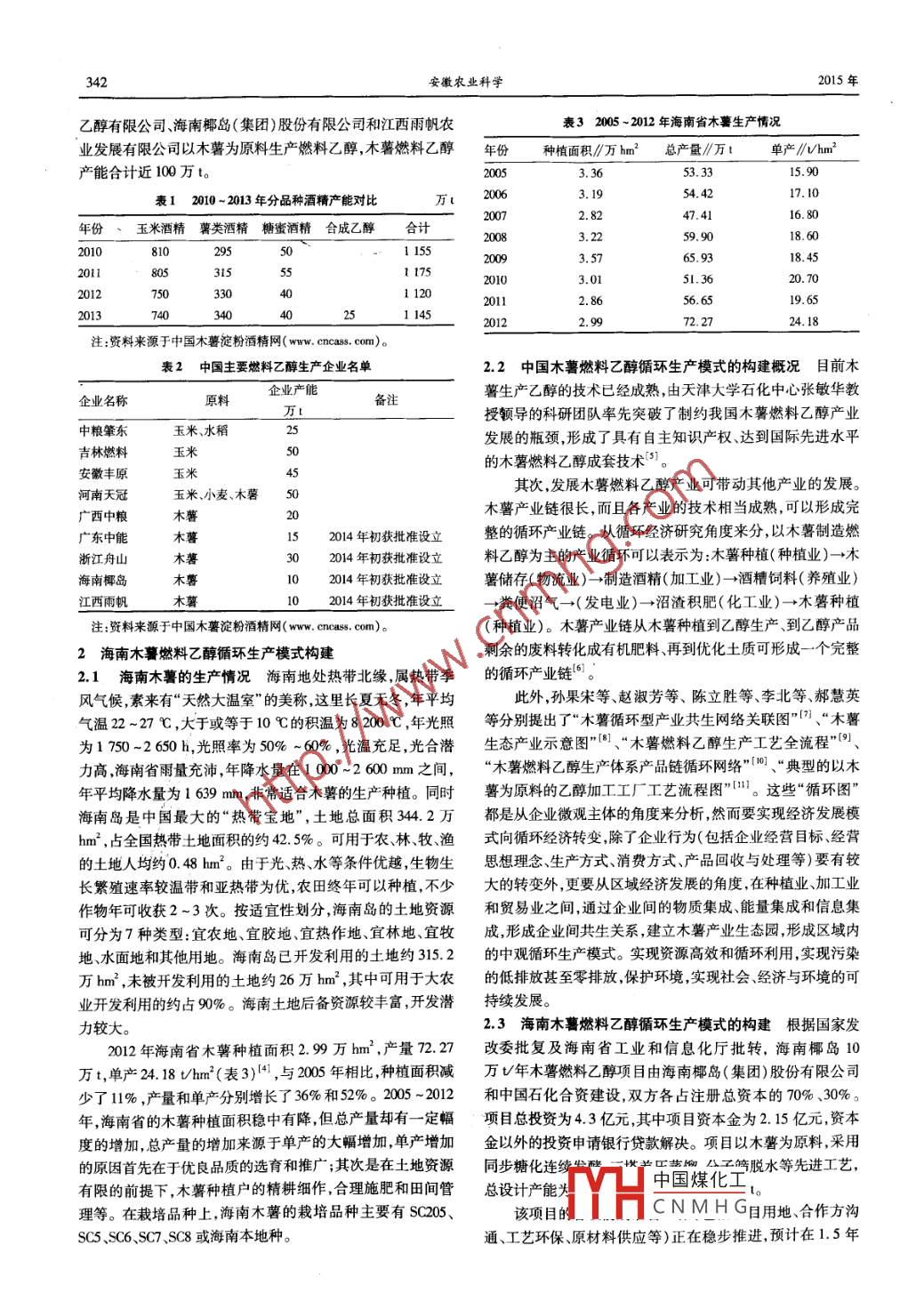 安徽農(nóng)業(yè)科學(xué), Journal of Anhui Agri..Si.2015,43(10):341-343,350責(zé)任編輯徐麗華責(zé)任校對李巖海南木薯燃料乙醇循環(huán)生產(chǎn)模式的構(gòu)建及經(jīng)濟(jì)評價(jià)姬卿’,傅國華2,閔義(.海南大學(xué)農(nóng)學(xué)院,海南???m2;2海南大學(xué)校長辦公室,海南???7028)摘要木薯燃料乙醇因非糧特性和質(zhì)量高、戍本低而受到青睞。2014年初海南榔島等4家企業(yè)獲國家發(fā)改委批準(zhǔn)生產(chǎn)木薯燃料乙醇再一次掀起了木薯燃料乙醇生產(chǎn)的高潮。該研究就我國目前木薯燃料乙醇生產(chǎn)現(xiàn)狀和海南木薯燃料乙醇循環(huán)生產(chǎn)模式枸建情況進(jìn)行分析,對木薯燃料乙醇的生產(chǎn)進(jìn)行經(jīng)濟(jì)評價(jià),在此基礎(chǔ)上提出科學(xué)規(guī)劃種植區(qū)域,保障燃料乙醇原料供應(yīng);繼續(xù)推廣“公司+基地+農(nóng)戶"的產(chǎn)業(yè)模式,提高種植戶和企業(yè)的經(jīng)濟(jì)效益;引導(dǎo)企業(yè)重組,實(shí)現(xiàn)規(guī)模效益;加大實(shí)施循環(huán)經(jīng)濟(jì)力度,實(shí)現(xiàn)木薯燃料乙醇清潔生產(chǎn)等政策建議。關(guān)鍵詞木薯;燃料乙醇;經(jīng)濟(jì)評價(jià)中圖分類號S-9文獻(xiàn)標(biāo)識(shí)碼A文章編號0517-6611(0015)10-341-03The Construction of Circulation Mode of production and Economic Evaluation about Cassava Fuel Ethanol in HainanJI Qing, FU Guo-hua, MIN Yi.(1. College of Agronomy, Hainan university, Haikou, Hainan 570228; 2. Headmaster'sOfficeHainan University, Haikou, Hainan 570228)Abstract Cassava fuel ethanol is favor for non-staple features, high quality and low cost. At the beginning of 2014, four companies includingHainan coco island incorporated company by the national development and reform commission approved the production of cassava fuel ethanolonce again set off the climax of the cassava fuel ethanol production. This paper analyzed the present situation of cassava fuel ethanol productionin China and the build situation of hainan cassava fuel ethanol cycle production mode, and carried on the economic evaluation to the productionof cassava fuel ethanol. Finally put forward some political suggestions such as planning planting area scientifically, ensure the supply of rawaterials of fuel ethanol production; Continue to promote the"company base farmers"model, to improve the economic benefits of farm-ers and enterprises; Guide the enterprise restructuring achieve economies of scale; Strengthen the implementation of circular economy, theealization cleaner production of cassava ethanolKey words Cassava; Fuel ethanol; Economic evaluation木薯除作為糧食來源外,還被公認(rèn)為綜合利用價(jià)值極高國。在國內(nèi)大約30%的鮮木薯被用作飼料,70%被用來加工的經(jīng)濟(jì)作物和重要的工業(yè)原料。燃料乙醇作為成功的生物淀粉和酒精2),而酒精深加工產(chǎn)品則有生物能源和生物化工質(zhì)能源替代品,具有巨大的經(jīng)濟(jì)價(jià)值、環(huán)保價(jià)值和可再生等產(chǎn)品等。特點(diǎn)。以木薯為原料生產(chǎn)的乙醇質(zhì)量高、成本低,且木薯能我國以鮮木薯和木薯干片為原料生產(chǎn)食用酒精和工業(yè)在劣質(zhì)土地上種植、不與糧食作物爭地的特點(diǎn)成為生產(chǎn)燃料酒精是從20世紀(jì)90年代前后開始的,目前國內(nèi)有木薯酒精乙醇汽油最合理原料。企業(yè)30多家,日產(chǎn)能力約2000t,年產(chǎn)木薯酒精70多萬t,2014年2月10日,海南椰島(集團(tuán))股份有限公司收到其中,廣西有木薯酒精廠12家,年生產(chǎn)木薯酒精約50萬t左海南省工業(yè)和信息化廳批轉(zhuǎn)的《國家發(fā)展改革委關(guān)于海南椰右。2013年全國酒精產(chǎn)量1145萬t(表1),其中玉米酒精島(集團(tuán))股份有限公司年產(chǎn)10萬t木薯燃料乙醇項(xiàng)目核準(zhǔn)占64.63%,薯類酒精約占29.69%,薯類酒精中木薯酒精占的批復(fù)》(發(fā)改能源(2014128號),至此我國木薯燃料乙醇全國酒精產(chǎn)量比例近10%。從表1可以看出,近年來,玉米生產(chǎn)企業(yè)又多了一個(gè)新成員。該項(xiàng)目旨在為海南調(diào)整能源酒精產(chǎn)量在逐年遞減而全國酒精產(chǎn)量卻在逐年增加原因是消費(fèi)結(jié)構(gòu),開發(fā)石油替代資源,提高清潔燃料比重;發(fā)展低碳薯類酒精產(chǎn)量在不斷增加。經(jīng)濟(jì),減排溫室氣體,改善生態(tài)環(huán)境;促進(jìn)農(nóng)業(yè)生產(chǎn)、消費(fèi)的近年來由于原油價(jià)格高漲和日益嚴(yán)重的環(huán)境污染問良性循環(huán),實(shí)現(xiàn)農(nóng)業(yè)增效、農(nóng)民增收和可持續(xù)發(fā)展。筆者對題,使得人們越來越關(guān)注燃料乙醇等清潔環(huán)保的可再生能海南木薯燃料乙醇循環(huán)生產(chǎn)模式的構(gòu)建進(jìn)行初步探索,并對源。但以玉米和小麥等糧食為原料生產(chǎn)燃料乙醇成本較高其經(jīng)濟(jì)效果進(jìn)行評價(jià)。且影響國家糧食安全。而以非糧作物木薯原料生產(chǎn)燃料乙1木薯燃料乙醇生產(chǎn)現(xiàn)狀醇是一條較好的途徑,具有原料生物特性好、種植面積廣闊世界木薯的主要加工產(chǎn)品是淀粉和酒精,大約有6%的單產(chǎn)增長潛力大、酒精生產(chǎn)率較高和生產(chǎn)成本較低等優(yōu)勢。鮮薯被用來加工淀粉,木薯淀粉的主要生產(chǎn)國是泰國、印度我國木薯燃料乙醇產(chǎn)業(yè)興起于21世紀(jì)初,自200年《生物尼西亞和中國。但是利用大量木薯來加工酒精的國