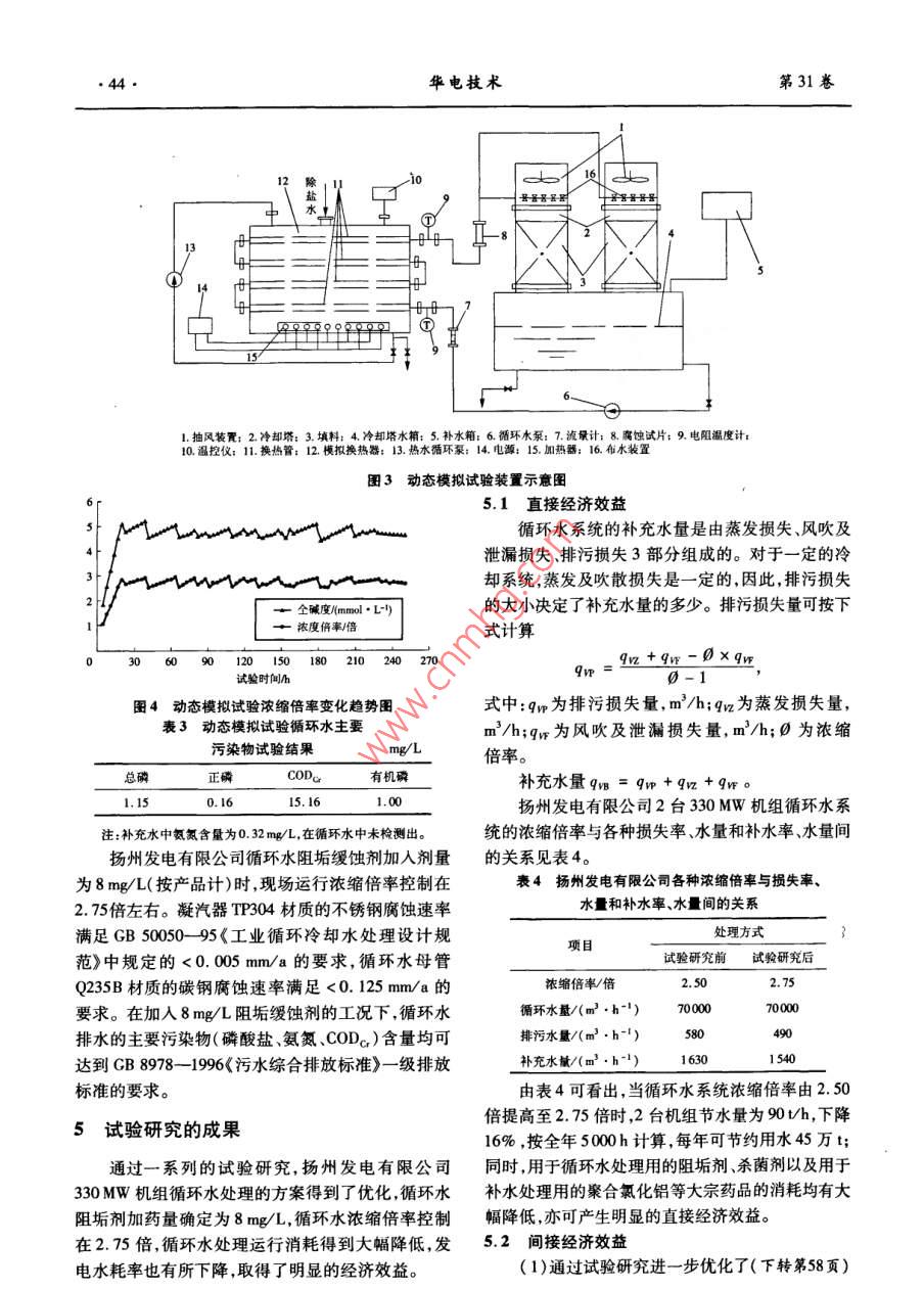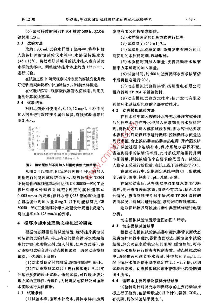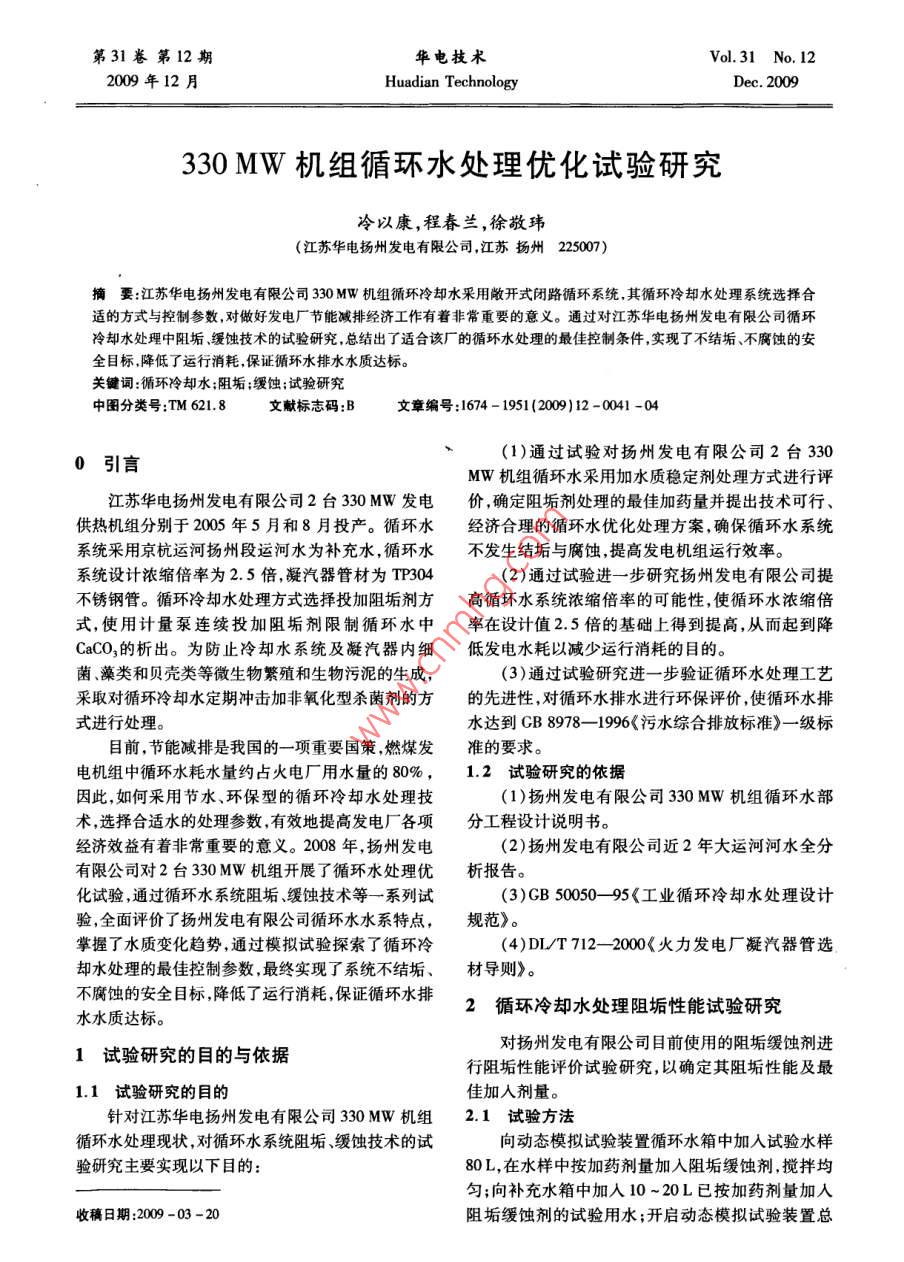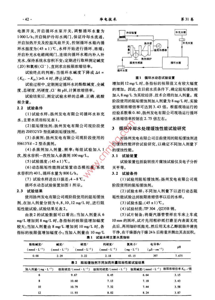 第31卷第12期華電技術(shù)Vol 31 No 122009年12月Huadian TechnologyDec.2009330MW機(jī)組循環(huán)水處理優(yōu)化試驗(yàn)研究冷以康,程春蘭,徐敬瑋(江蘇華電揚(yáng)州發(fā)電有限公司,江蘇揚(yáng)州225007)摘要:江蘇華電揚(yáng)州發(fā)電有限公司330MW機(jī)組循環(huán)冷卻水釆用敞開式閉路循環(huán)系統(tǒng),其循環(huán)冷卻水處理系統(tǒng)選擇合適的方式與控制參數(shù),對(duì)做好發(fā)電廠節(jié)能減排經(jīng)濟(jì)工作有著非常重要的意義。通過對(duì)江蘇華電揚(yáng)州發(fā)電有限公司循環(huán)冷卻水處理中阻垢緩蝕技術(shù)的試驗(yàn)研究,總結(jié)出了適合該廠的循環(huán)水處理的最佳控制條件,實(shí)現(xiàn)了不結(jié)垢、不腐蝕的安全目標(biāo)降低了運(yùn)行消耗保證循環(huán)水排水水質(zhì)達(dá)標(biāo)關(guān)鍵詞:循環(huán)冷卻水;阻垢;緩蝕;試驗(yàn)研究中圖分類號(hào):TM6218文獻(xiàn)標(biāo)志碼:B文章編號(hào):1674-1951(2009)12-0041-04引言(1)通過試驗(yàn)對(duì)揚(yáng)州發(fā)電有限公司2臺(tái)330MW機(jī)組循環(huán)水采用加水質(zhì)穩(wěn)定劑處理方式進(jìn)行評(píng)江蘇華電揚(yáng)州發(fā)電有限公司2臺(tái)330MW發(fā)電價(jià),確定阻垢劑處理的最佳加藥量并提出技術(shù)可行供熱機(jī)組分別于2005年5月和8月投產(chǎn)。循環(huán)水經(jīng)濟(jì)合理的循環(huán)水優(yōu)化處理方案,確保循環(huán)水系統(tǒng)系統(tǒng)采用京杭運(yùn)河揚(yáng)州段運(yùn)河水為補(bǔ)充水,循環(huán)水不發(fā)生結(jié)垢與腐蝕提高發(fā)電機(jī)組運(yùn)行效率。系統(tǒng)設(shè)計(jì)濃縮倍率為2.5倍,凝汽器管材為TP04(2)通過試驗(yàn)進(jìn)一步研究揚(yáng)州發(fā)電有限公司提不銹鋼管。循環(huán)冷卻水處理方式選擇投加阻垢劑方高循環(huán)水系統(tǒng)濃縮倍率的可能性,使循環(huán)水濃縮倍式,使用計(jì)量泵連續(xù)投加阻垢劑限制循環(huán)水中率在設(shè)計(jì)值2.5倍的基礎(chǔ)上得到提高,從而起到降CaCO3的析出。為防止冷卻水系統(tǒng)及凝汽器內(nèi)細(xì)低發(fā)電水耗以減少運(yùn)行消耗的目的菌、藻類和貝殼類等微生物繁殖和生物污泥的生成,(3)通過試驗(yàn)研究進(jìn)一步驗(yàn)證循環(huán)水處理工藝采取對(duì)循環(huán)冷卻水定期沖擊加非氧化型殺菌劑的方的先進(jìn)性,對(duì)循環(huán)水排水進(jìn)行環(huán)保評(píng)價(jià),使循環(huán)水排式進(jìn)行處理。水達(dá)到GB8978-1996《污水綜合排放標(biāo)準(zhǔn)》一級(jí)標(biāo)目前,節(jié)能減排是我國的一項(xiàng)重要國策,燃煤發(fā)準(zhǔn)的要求。電機(jī)組中循環(huán)水耗水量約占火電廠用水量的80%,1.2試驗(yàn)研究的依據(jù)因此,如何采用節(jié)水、環(huán)保型的循環(huán)冷卻水處理技(1)揚(yáng)州發(fā)電有限公司330MW機(jī)組循環(huán)水部術(shù),選擇合適水的處理參數(shù),有效地提高發(fā)電廠各項(xiàng)分工程設(shè)計(jì)說明書。經(jīng)濟(jì)效益有著非常重要的意義。2008年,揚(yáng)州發(fā)電(2)揚(yáng)州發(fā)電有限公司近2年大運(yùn)河河水全分有限公司對(duì)2臺(tái)330MW機(jī)組開展了循環(huán)水處理優(yōu)析報(bào)告。化試驗(yàn),通過循環(huán)水系統(tǒng)阻垢、緩蝕技術(shù)等一系列試(3)GB5005095《工業(yè)循環(huán)冷卻水處理設(shè)計(jì)驗(yàn),全面評(píng)價(jià)了揚(yáng)州發(fā)電有限公司循環(huán)水水系特點(diǎn),規(guī)范》。掌握了水質(zhì)變化趨勢(shì),通過模擬試驗(yàn)探索了循環(huán)冷(4)D/T712-2000《火力發(fā)電廠凝汽器管選卻水處理的最佳控制參數(shù),最終實(shí)現(xiàn)了系統(tǒng)不結(jié)垢、材導(dǎo)則》。不腐蝕的安全目標(biāo),降低了運(yùn)行消耗,保證循環(huán)水排水水質(zhì)達(dá)標(biāo)。循環(huán)冷卻水處理阻垢性能試驗(yàn)研究1試驗(yàn)研究的目的與依據(jù)對(duì)揚(yáng)州發(fā)電有限公司目前使用的阻垢緩蝕劑進(jìn)行阻垢性能評(píng)價(jià)試驗(yàn)研究,以確定其阻垢性能及最1.1試驗(yàn)研究的目的佳加入劑量。針對(duì)江蘇華電揚(yáng)州發(fā)電有限公司330MW機(jī)組2.1試驗(yàn)方法循環(huán)水處理現(xiàn)狀,對(duì)循環(huán)水系統(tǒng)阻垢、緩蝕技術(shù)的試向動(dòng)態(tài)模擬試驗(yàn)裝置循環(huán)水箱中加入試驗(yàn)水樣驗(yàn)研究主要實(shí)現(xiàn)以下目的:L,在水樣中按加藥劑量加入阻垢緩蝕劑,攪拌均勻;向補(bǔ)充水箱中加入10~20L已按加藥劑量加入收稿日期:2009-03-20阻垢緩蝕劑的試驗(yàn)用水;開啟動(dòng)態(tài)模擬試驗(yàn)裝置總42華電技術(shù)第31卷電源開關(guān),開啟循環(huán)水泵開關(guān),調(diào)整循環(huán)水量為補(bǔ)充水箱1000Lh;開啟鍋爐冷卻水閥門,保證冷卻水流通開啟加熱開關(guān)及控溫風(fēng)扇開關(guān),控制循環(huán)水箱內(nèi)循環(huán)水溫度為(45±1)℃,水樣開始進(jìn)行循環(huán)、濃縮;溫度傳感器開啟補(bǔ)充水電磁閥閥門,連續(xù)向循環(huán)水箱內(nèi)補(bǔ)入補(bǔ)充水,保持系統(tǒng)水容積不變;定期進(jìn)行取樣測(cè)定堿度換熱鍋爐溫度傳感器循環(huán)水箱(JD)和氯根(Cl-),直到求出極限濃縮倍率。試驗(yàn)終點(diǎn)的判斷:當(dāng)循環(huán)水堿度下降或△A循環(huán)水泵(Ka--K1)≥0.