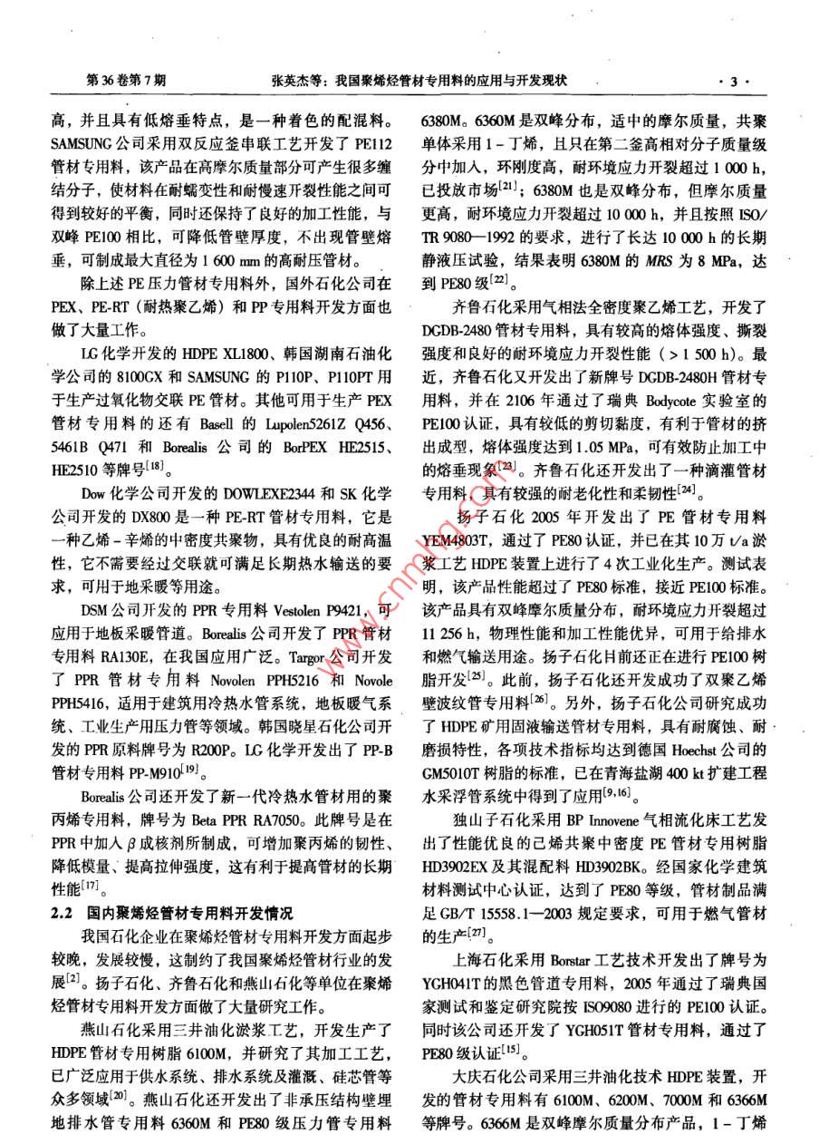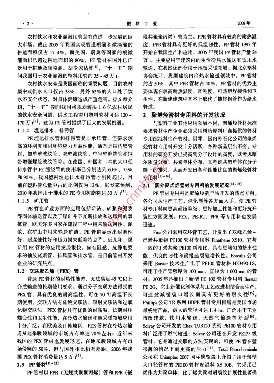 第36卷第7期塑料工業(yè)2008年7月CHINA PLASTICS INDUSTRY工業(yè)評述我國聚烯烴管材專用料的應(yīng)用與開發(fā)現(xiàn)狀張英杰,李玉松,馬國玉(中國石油化工股份有限公司天津分公司研究院,天津300270)摘要:介紹了聚烯烴管材的特點、應(yīng)用領(lǐng)域和發(fā)展趨勢,分析了國內(nèi)外聚烯烴管材專用料的開發(fā)狀況和國內(nèi)聚烯烴管材專用料的市場狀況,提出了我國聚烯烴管材專用料開發(fā)領(lǐng)城存在的問題和建議。關(guān)鍵詞:聚烯烴;管材專用料;開發(fā);應(yīng)用中圖分類號: TQ325.1; TQ320.72*4文獻標識碼: A文章編號: 1005- 5770 (2008) 07-0001 -05Review on Application and Development of Polyolefin SpecialCompound for Pipes in ChinaZHANG Ying-jie,U Yu-song,MA Guo-yu(Research Intitute of Tanjin Branch, SINOPEC Co., Tianjin 300270, China)Abstract: The characteristics, application and developing trends of polyolefin pipes are introduced. The de-velopment of the polyolefin special compound for the pipes both at home and abroad, as well as the markets of thecompound at home, was analyzed . The problems existed in the development of the compound at home were pointedout, and some suggestions on the development were made based on fomer analysis.Keywords: Polyolefin; Special Compound for Pipe; Development; Application塑料管材與傳統(tǒng)材料管材相比具有耐腐蝕性好、1.1.1 燃氣輸送管壽命長等優(yōu)點,在工業(yè)、農(nóng)業(yè)、建筑、市政工程等領(lǐng)燃氣輸送是PE管材的傳統(tǒng)優(yōu)勢應(yīng)用領(lǐng)域,這得域得到了廣泛的應(yīng)用。塑料管材行業(yè)已經(jīng)成為我國塑益于它良好的韌性、耐開裂性和可靠的連接技術(shù),以料工業(yè)的重要組成部分。2006年我國塑料管材總產(chǎn)及對地震破壞的抵御能力。日前,PE 燃氣管在西方量達到2 900 kVa,自2001年以來,年均增長率達到國家已經(jīng)十分普及。日本PE燃氣管的使用量已超過19%[1-2]。聚氯乙烯(PVC) 管材是我國塑料管材的全部鋪設(shè)管網(wǎng)的90%。我國的PE燃氣管應(yīng)用仍然比最大品種,但因VCM (氯乙烯單體)殘留和鉛鹽穩(wěn)較落后,2005年我國用于燃氣輸送的PE管材僅10定劑析出等原因,增長速度相對較低(3-4)。萬t,而且僅限于中小口徑的燃氣管。隨著我國能源1聚烯烴管材的特點與應(yīng)用結(jié)構(gòu)向天然氣轉(zhuǎn)變,PE 燃氣管的用量將快速增長。聚烯烴管材主要包括聚乙烯(PE) 和聚丙烯據(jù)有關(guān)專家預(yù)測,2010年有望達到30萬0]。(PP)管材,與其他塑料管材相比具有環(huán)保衛(wèi)生、耐1.1.2市政給水管腐蝕、耐磨性好、使用壽命長和易于施工等特點,廣PE管具有衛(wèi)生性好、利于環(huán)境保護、柔韌、可泛應(yīng)用于國民經(jīng)濟各領(lǐng)域,是近年來發(fā)展最快的塑料熔接,鋪設(shè)方便經(jīng)濟,使用安全可靠等優(yōu)點,在室外管材品種,產(chǎn)量僅次于PVC管材。給水領(lǐng)域發(fā)展迅速。尤其是直徑1 m以下的給水管用1.1 PE 管材的應(yīng)用領(lǐng)域PE管材比其他管道系統(tǒng)有較明顯的優(yōu)勢,將逐步替PE承壓管材主要用于飲用水輸送、燃氣輸送等代其他管道系統(tǒng)成為主流。2005 年我國室外給水領(lǐng)用途。它是根據(jù)管材的長期靜液壓試驗推算得到20域使用PE管材約20萬t。一些新的施工技術(shù),如非C, 50 a壽命的最小要求強度(MRS) 來分級的。我開挖鋪設(shè)技術(shù),水底沉管鋪設(shè)技術(shù),襯管修復(fù)技術(shù)等國標準規(guī)定給水和燃氣輸送PE管材應(yīng)為PE80和極大地推動了PE管道系統(tǒng)的發(fā)展。目前塑料管僅占PE100管材l5-6]。非承壓管主要用于大口徑市政排我國供水管網(wǎng)的5.2%,發(fā)展空間巨大。水、農(nóng)村飲水、灌溉和礦用等領(lǐng)域。1.1.3 農(nóng)村飲水和農(nóng)業(yè)灌溉用管作者簡介:張英杰,男,1980年生,碩士,工程師,從事聚烯烴生產(chǎn)技術(shù)及新產(chǎn)品開發(fā)。022 - 63804047, zhnd651@ 163.com●2塑料工業(yè)2008年農(nóng)村飲水和農(nóng)業(yè)灌溉用管是有待進一步 發(fā)展的巨段共聚聚丙烯)管為主。PPR 管材具有較高的耐熱溫大市場。截止2005年我國實現(xiàn)管道噴灌和微滴灌的度,PPB管材具有更好的低溫制性。PP管材1997年耕地面積僅占17.4%。而美國、瑞典等國家的噴微開始在我國生產(chǎn)和應(yīng)用,2005 年我國PP管材產(chǎn)量24灌面積已超過耕地面積的80%,PE 管材在國外已廣萬t,主要應(yīng)用于建筑內(nèi)的生活冷熱水輸送和飲用水泛用于耕地微滴噴灌。據(jù)專家估算[8],“十一五”期輸送,在我國還部分用于地板采暖領(lǐng)域。據(jù)北京塑料間我國用于農(nóng)業(yè)灌溉的塑料用管約35~45萬t。.協(xié)會統(tǒng)計,我國建筑內(nèi)冷熱水輸送領(lǐng)域中,PP管材農(nóng)村飲水安全是我國面臨的重要問題,目前農(nóng)村約占50%,其中PPR管材占40%。PP 管材的優(yōu)勢主集中式供水人口僅占38%,另外62%的人口處于飲要體現(xiàn)在較高耐熱溫度、 環(huán)剛度、可熱熔焊接性和衛(wèi)水不安全狀態(tài),對身體健康造成嚴重危害。據(jù)文獻介生性,在新建建筑中基本上取代了鍍鋅鋼管作為給水紹,“十一五”期間我國將規(guī)劃解決1.6億農(nóng)村居民管道。的飲水安全問題,供水工程需用塑料管材可達120 ~2聚烯烴管材專 用料的開發(fā)狀況170萬t8]。這為PE管材提供了巨大的發(fā)展機遇。與塑料工業(yè)其他應(yīng)用領(lǐng)