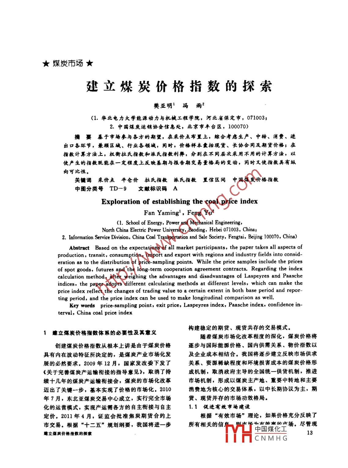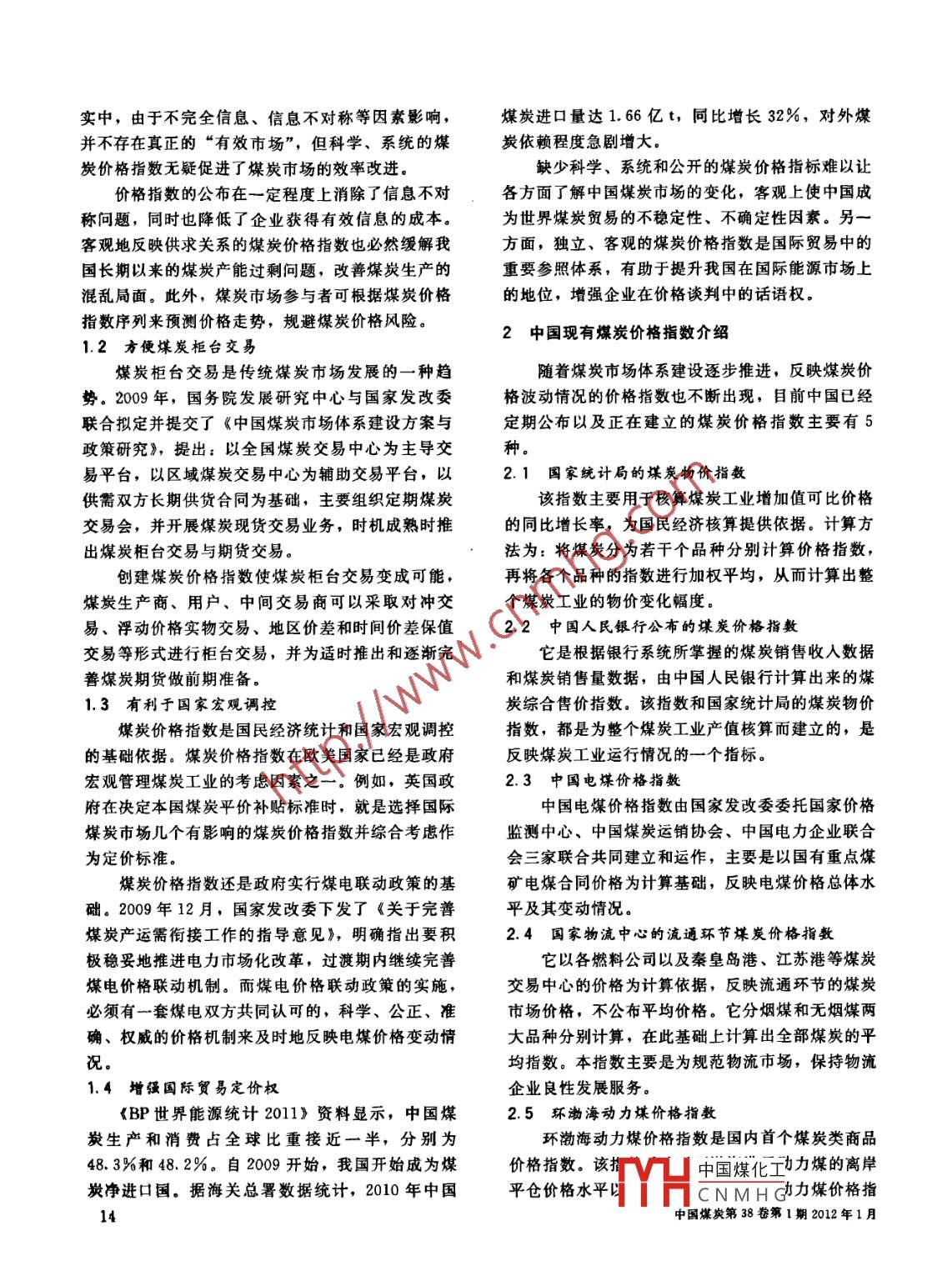 ★煤炭市場(chǎng)★建立煤炭?jī)r(jià)格指數(shù)的探索.樊亞明'馮雨°(1. 華北電力大學(xué)能源動(dòng)力與機(jī)械工程學(xué)院,河北省保定市,071003;2.中國(guó)煤炭運(yùn)銷(xiāo)協(xié)會(huì)信息處,北京市豐臺(tái)區(qū),100070)摘要基于市場(chǎng)參與各方的期望,在采價(jià)點(diǎn)布置上,綜合考慮生產(chǎn)、中轉(zhuǎn)、消費(fèi)、進(jìn)出口各環(huán)節(jié),兼顧區(qū)域、行業(yè)各領(lǐng)城,同時(shí),價(jià)袼樣本囊括現(xiàn)貨、長(zhǎng)協(xié)合同及期貨價(jià)格;在指數(shù)計(jì)算方法上,權(quán)衡拉氏指數(shù)和派氏指敷利弊,分別在不同層次采用不用的計(jì)算方法,以使產(chǎn)生的指數(shù)既能在一定程度上反映基期與報(bào)告期交易量格局的變動(dòng),同時(shí)又使指數(shù)具有縱向可比性。關(guān)鍵詞采價(jià)點(diǎn)平倉(cāng)價(jià)拉氏指數(shù)派氏指敷置信區(qū)間中 國(guó)煤炭?jī)r(jià)格指敏中圖分類(lèi)號(hào)TD-9文獻(xiàn)標(biāo)識(shí)碼AExploration of establishing the coal price indexFan Yaming', Feng Yu2(1. School of Energy, Power and Mechanical Engineering,North China Electric Power University, Baoding, Hebei 071003, China;2. Information Service Division, China Coal Transportation and Sale Society, Fengtai, Beijing 100070, China)Abstract Based on the expectations of all market participants ,production, transit, consumption, import and export with regions and industry fields into consid-eration as to the distribution of price sampling points. While the price samples include the pricesof spot goods, futures and the long term cooperation agreement contracts. Regarding the indexcalculation method, after weighing the advantages and disadvantages of Laspeyres and Paascheindices, the paper adopts different calculating methods at different levels, which can make theprice index reflect the changes of trading value to a certain extent in both base period and repor-ting period, and the price index can be used to make longitudinal comparison as well.Key words price -sampling point, exit price, Laspeyres index, Paasche index, confidence in-terval, China coal price index構(gòu)建穩(wěn)定的期貨、現(xiàn)貨共存的交易模式。1建立煤炭?jī)r(jià)格指數(shù)體系的必要性及其意義隨著煤炭市場(chǎng)化改革程度的深化,煤炭?jī)r(jià)格將創(chuàng)建煤炭?jī)r(jià)格指數(shù)從根本.上講是由于煤炭?jī)r(jià)格逐步與國(guó)際能源價(jià)格、國(guó)內(nèi)供需關(guān)系、物價(jià)指數(shù)以具有內(nèi)在波動(dòng)特征所決定的,是煤炭產(chǎn)業(yè)市場(chǎng)化發(fā)及企業(yè)成本相結(jié)合。我國(guó)將逐步建立反映市場(chǎng)供求展的必然要求。2009 年12月,國(guó)家發(fā)改委下發(fā)了關(guān)系、資源稀缺程度和環(huán)境損害成本的煤炭?jī)r(jià)格形《關(guān)于完善煤炭產(chǎn)運(yùn)輸銜接的指導(dǎo)意見(jiàn)》,取消了持成機(jī)制,取消政府主導(dǎo)的全國(guó)統(tǒng)一供貨機(jī)制, 推進(jìn)續(xù)十幾年的煤炭產(chǎn)運(yùn)輸銜接會(huì),煤炭的市場(chǎng)化改革市場(chǎng)機(jī)制,形成以煤炭主產(chǎn)地、重要中轉(zhuǎn)地和主要邁出了關(guān)鍵一步,基本實(shí)現(xiàn)了價(jià)格的市場(chǎng)化。2010消費(fèi)地為核心的交易體系,以中長(zhǎng)期協(xié)議為主,期年7月,東北亞煤炭交易中心成立,實(shí)行完全市場(chǎng)貨、現(xiàn)貨并存的市場(chǎng)功效格局?;倪\(yùn)營(yíng)模式,實(shí)現(xiàn)產(chǎn)運(yùn)需各方的自主銜接與自主1.1 促進(jìn)有效市場(chǎng)建設(shè)定價(jià)。2011年4月,證監(jiān)會(huì)批準(zhǔn)焦炭期貨合約上根據(jù)“有效市場(chǎng)”理論,如果價(jià)格充分反映了市交易。根據(jù)“十二五”規(guī)劃綱要,我國(guó)將進(jìn)- -步.所有相關(guān)的信息則市場(chǎng)為有的率的市場(chǎng)。盡管現(xiàn)建立煤炭?jī)r(jià)格指敷的探索中國(guó)煤化工1'fYHCNMHG實(shí)中,由于不完全信息、信息不對(duì)稱(chēng)等因素影響,煤炭進(jìn)口量達(dá)1.66億t,同比增長(zhǎng)32%,對(duì)外煤并不存在真正的“有效市場(chǎng)”, 但科學(xué)、系統(tǒng)的煤炭依賴(lài)程度急劇增大。.炭?jī)r(jià)格指數(shù)無(wú)疑促進(jìn)了煤炭市場(chǎng)的效率改進(jìn)。缺少科學(xué)、系統(tǒng)和公開(kāi)的煤炭?jī)r(jià)格指標(biāo)難以讓價(jià)格指數(shù)的公布在一定程度上消除了信息不對(duì)各方面了解中國(guó)煤炭市場(chǎng)的變化,客觀上使中國(guó)成稱(chēng)問(wèn)題,同時(shí)也降低了企業(yè)獲得有效信息的成本。.為世界煤炭貿(mào)易的不穩(wěn)定性、不確定性因素。另一客觀地反映供求關(guān)系的煤炭?jī)r(jià)格指數(shù)也必然緩解我方面,獨(dú)立、客觀的煤炭?jī)r(jià)格指數(shù)是國(guó)際貿(mào)易中的國(guó)長(zhǎng)期以來(lái)的煤炭產(chǎn)能過(guò)剩問(wèn)題,改善煤炭生產(chǎn)的重要參照體系,有助于提升我國(guó)在國(guó)際能源市場(chǎng)上混亂局面。此外,煤炭市場(chǎng)參與者可根據(jù)煤炭?jī)r(jià)格的地位,增強(qiáng)企業(yè)在價(jià)格談判中的話(huà)語(yǔ)權(quán)。指數(shù)序列來(lái)預(yù)測(cè)價(jià)格走勢(shì),規(guī)避煤炭?jī)r(jià)格風(fēng)險(xiǎn)。2中國(guó)現(xiàn)有煤炭?jī)r(jià)格指數(shù)介紹1.2 方便煤炭柜臺(tái)交易煤炭柜臺(tái)交易是傳統(tǒng)煤炭市場(chǎng)發(fā)展的