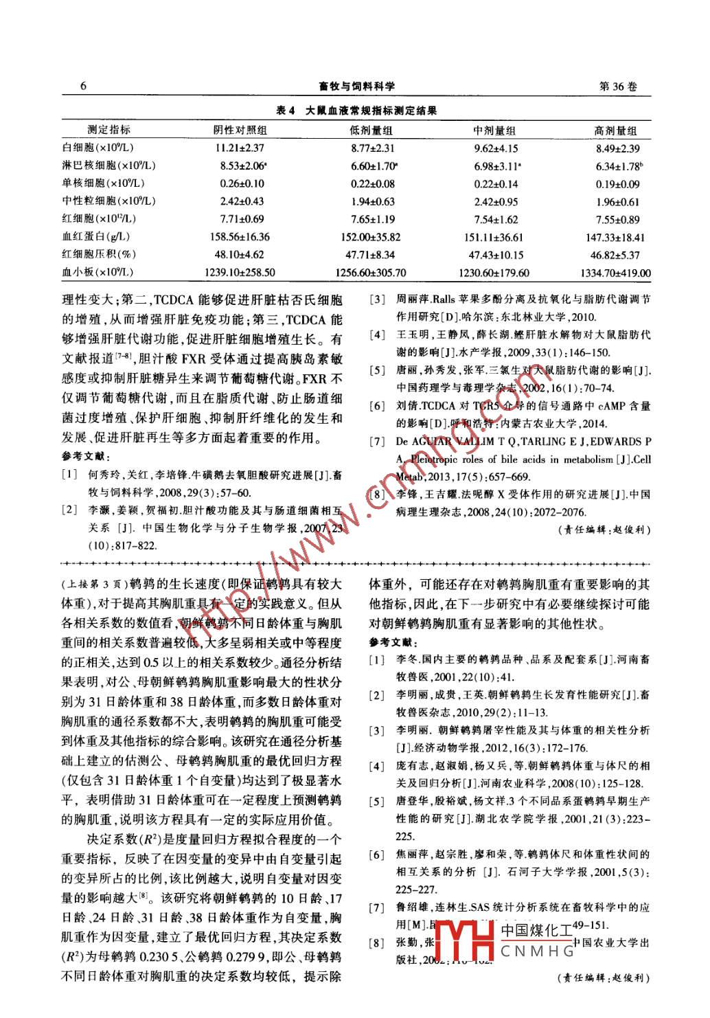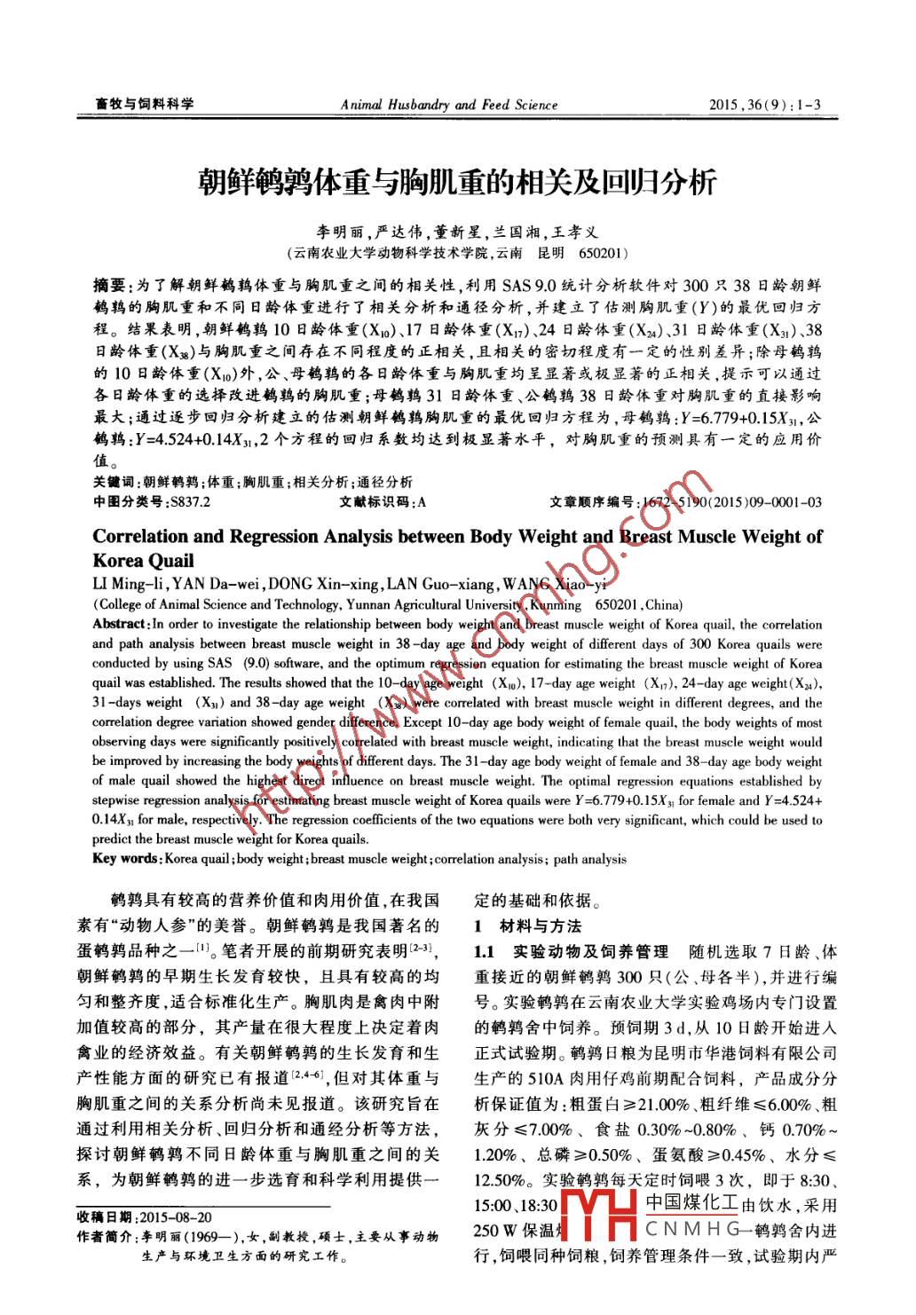 畜牧與飼料科學(xué)A nimal Husbandry and Feed Science2015,36(9):1-3朝鮮鵪鶉體重與胸肌重的相關(guān)及回歸分析李明麗,嚴(yán)達(dá)偉,董新星,蘭國湘,王孝義(云南農(nóng)業(yè)大學(xué)動物科學(xué)技術(shù)學(xué)院,云南昆明650201)摘要:為了解朝鮮鵪鶉體重與胸肌重之間的相關(guān)性,利用SAS9.0統(tǒng)計分析軟件對300只38日齡朝鮮鵪鶉的胸肌重和不同日齡體重進(jìn)行了相關(guān)分析和通徑分析,并建立了估測胸肌重(Y)的最優(yōu)回歸方程。結(jié)果表明,朝鮮鵪鶉10日齡體重(X)、17日齡體重(X1)、24日齡體重(Xs)、31日齡體重(X3)、38齡體重(X)與胸肌重之間存在不同程度的正相關(guān),且相關(guān)的密切程度有一定的性別差異;除母鵪鶉的10日齡體重(X)外,公、母鵪鶉的各日齡體重與胸肌重均呈顯著或極顯著的正相關(guān),提示可以通過各日齡體重的選擇改進(jìn)鵪鶉的胸肌重;母鵪鶉31日齡體重、公鵪鶉38日齡體重對胸肌重的直接影響最大;通過逐步回歸分析建立的估測朝鮮鵪鶉胸肌重的最優(yōu)回歸方程為,母鵪鶉:¥=6.779+0.15Ⅺ3,公鵪鶉:¥=4.524+0.14Ⅺ3,2個方程的回歸系數(shù)均達(dá)到極顯著水平,對胸肌重的預(yù)測具有一定的應(yīng)用價值關(guān)鍵詞:朝鮮鵪鶉;體重;胸肌重;相關(guān)分析;通徑分析中圖分類號:S8372文獻(xiàn)標(biāo)識碼:A文章順序編號:1672-5190(2015)09-0001-03Correlation and Regression Analysis between Body Weight and Breast Muscle Weight ofKorea QuailLI Ming-li,YAN Da-wei, DONG Xin-xing, LAN Guo-xiang, WANG Xiao-yiCollege of Animal Science and Technology, Yunnan Agricultural University, Kunming 650201, China)Abstract: In order to investigate the relationship between body weight and breast muscle weight of Korea quail, the correlationand path analysis between breast muscle weight in 38-day age and body weight of different days of 300 Korea quails wereconducted by using SAS(9.0)software, and the optimum regression equation for estimating the breast muscle weight of Koquail was established. The results showed that the 10-day age weight (X o), 17-day age weight (X), 24-day age weight(X 4),31-days weight (Xu)and 38-day age weight (Xx)were correlated with breast muscle weight in different degrees, and thecorrelation degree variation showed gender difference. Except 10-day age body weight of female quail, the body weights of mostobserving days were significantly positively correlated with breast muscle weight, indicating that the breast muscle weight wouldbe improved by increasing the body weights of different days. The 31-day age body weight of female and 38-day age body weightof male quail showed the highest direct influence on breast muscle weight. The optimal regression equations established bystepwise regression analysis for estimating breast muscle weight of Korea quails were Y=6.779+0.15X, for female and Y=4. 524+0. 14X3 for male, respectively. The regression coefficients of the two equations were both very significant, which could be used topredict the breast muscle weight for Korea quailsKey words: Korea quail; body weight; breast muscle weight; correlation analysis; path analysis鵪鶉具有較高的營養(yǎng)價值和肉用價值,在我國定的基礎(chǔ)和依據(jù)。素有“動物人參”的美譽(yù)。朝鮮鵪鶉是我國著名的1材料與方法蛋鵪鶉品種之一。筆者開展的前期研究表明2-3),1.1實驗動物及飼養(yǎng)管理隨機(jī)選取7日齡、體朝鮮鵪鶉的早期生長發(fā)育較快,且具有較高的均重接近的朝鮮鵪鶉300只(公、母各半),并進(jìn)行編勻和整齊度,適合標(biāo)準(zhǔn)化生產(chǎn)。胸肌肉是禽肉中附號。實驗鵪鶉在云南農(nóng)業(yè)大學(xué)實驗雞場內(nèi)專門設(shè)置加值較高的部分,其產(chǎn)量在很大程度上決定著肉的鵪鶉舍中飼養(yǎng)。預(yù)飼期3d,從10日齡開始進(jìn)入禽業(yè)的經(jīng)濟(jì)效益。有關(guān)朝鮮鵪鶉的生長發(fā)育和生正式試驗期。鵪鶉日糧為昆明市華港飼料有限公司產(chǎn)性能方面的研究已有報道246,但對其體重與生產(chǎn)的510A肉用仔雞前期配合飼料,產(chǎn)品成分分胸肌重之間的關(guān)系分析尚未見報道。該研究旨在析保證值為:粗蛋白≥21.00%、粗纖維≤600%、粗通過利用相關(guān)分析、回歸分析和通經(jīng)分析等方法,灰分≤7.00%、食鹽0.30%~0.80%、鈣0.70%探討朝鮮鵪鶉不同日齡體重與胸肌重之間的關(guān)1.20%、總磷≥0.50%、蛋氨酸≥0.45%、水分≤系,為朝鮮鵪鶉的進(jìn)一步選育和科學(xué)利用提供一12.50%。實驗鵪鶉每天定時飼喂3次,即于8:30、15:00、18:30中國煤化工由飲水,采用收稿日期:2015-08-20作者簡介:李明麗(1969—),女,副教授,碩士,主要從事動物250W保溫CNMHG一鵪鶉舍內(nèi)進(jìn)生產(chǎn)與環(huán)境衛(wèi)生方面的研究工作。行,飼喂同種飼糧,飼養(yǎng)管理條件一致,試驗期內(nèi)嚴(yán)畜牧與飼料科學(xué)第36卷表1朝鮮鵪鶉胸肌重與不同日齡體重的表型參數(shù)性別項目平均值28.83524878.16°101941179222.83°標(biāo)準(zhǔn)差3.465.357.187469.09CH12.0010.199.19732771946平均值28.06°公標(biāo)準(zhǔn)差6478428.5775612.85957注:同列平均值數(shù)據(jù)肩標(biāo)小寫字母相同表示差異不顯著(P0.05),肩標(biāo)小寫字母不同表示差異極顯著(P<001)格按照鵪鶉的飼養(yǎng)管理規(guī)程進(jìn)行飼養(yǎng)。正式試驗期及胸肌重的變異系數(shù)在10%以內(nèi),表明隨著日齡的為4周,至38日齡結(jié)束。增長,朝鮮鵪鶉群體的整齊度有所提高。12測定指標(biāo)從正式試驗(10日齡)開始,每周22鵪鶉胸肌重對體重的相關(guān)分析